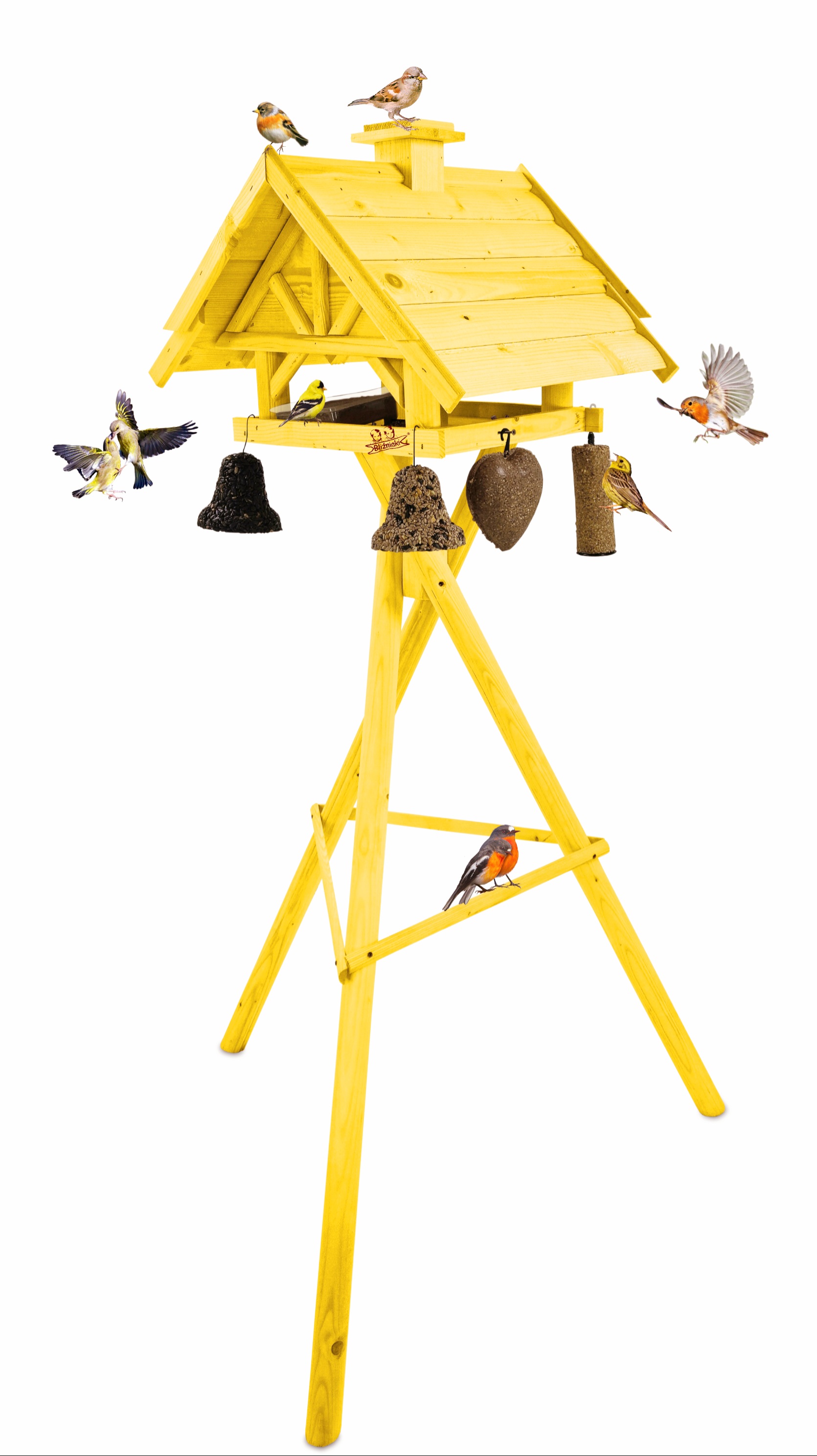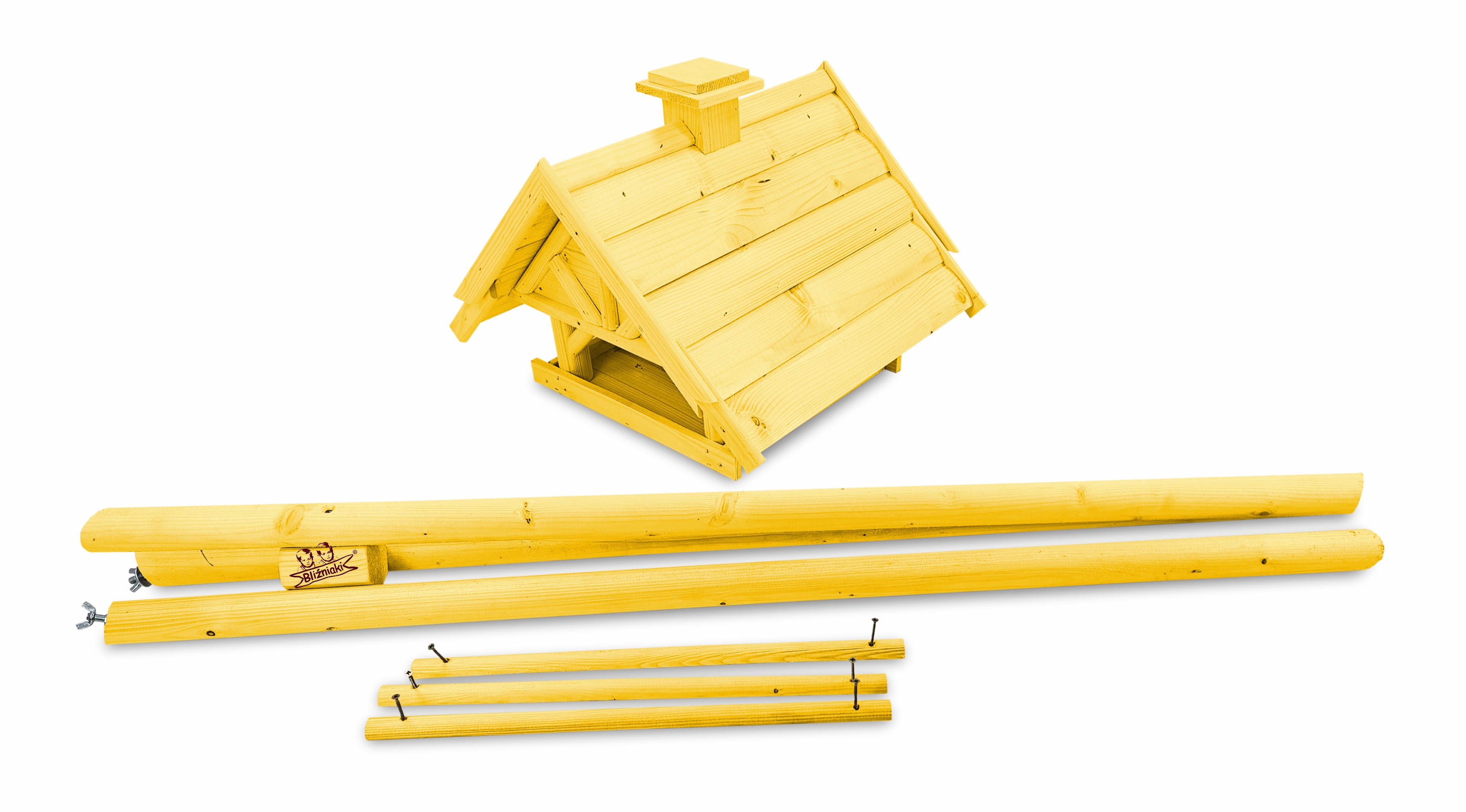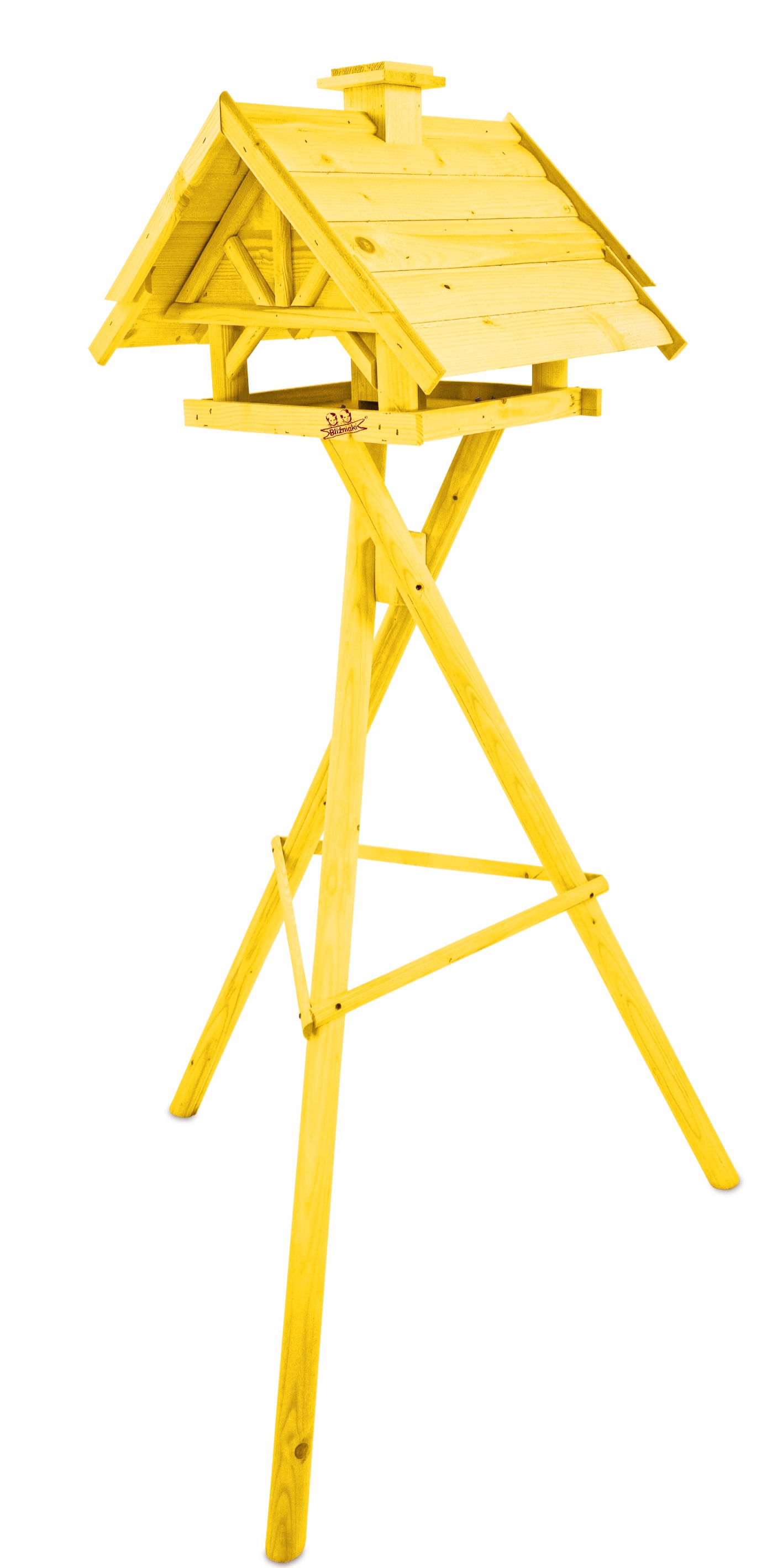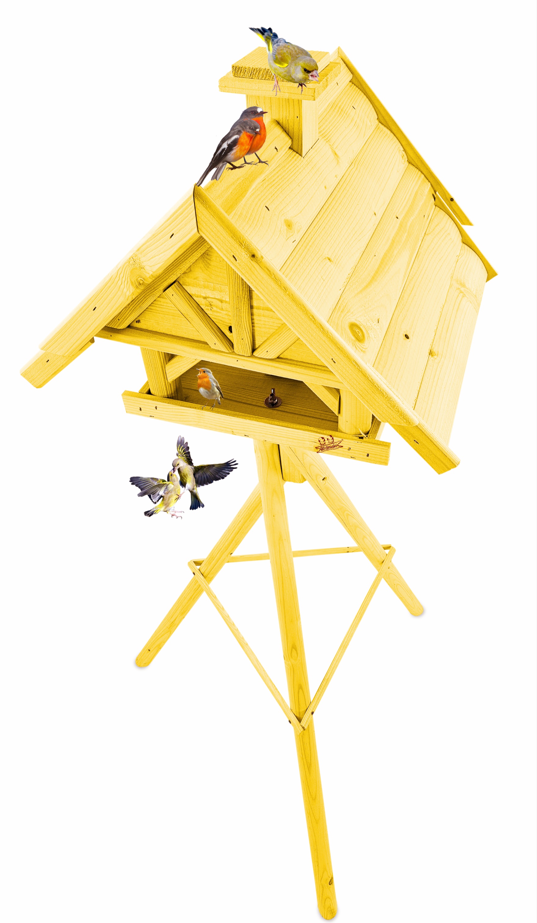 Produkt jest w całości wykonany z wytrzymałego, suszonego drewna sosnowego. Został pokryty impregnatem, który jest wykonany na bazie barwników roślinnych, co czyni go ekologicznym i przyjaznym dla ludzi i zwierząt. Karmnik wykończony jest kolorem ŻÓŁTYM.