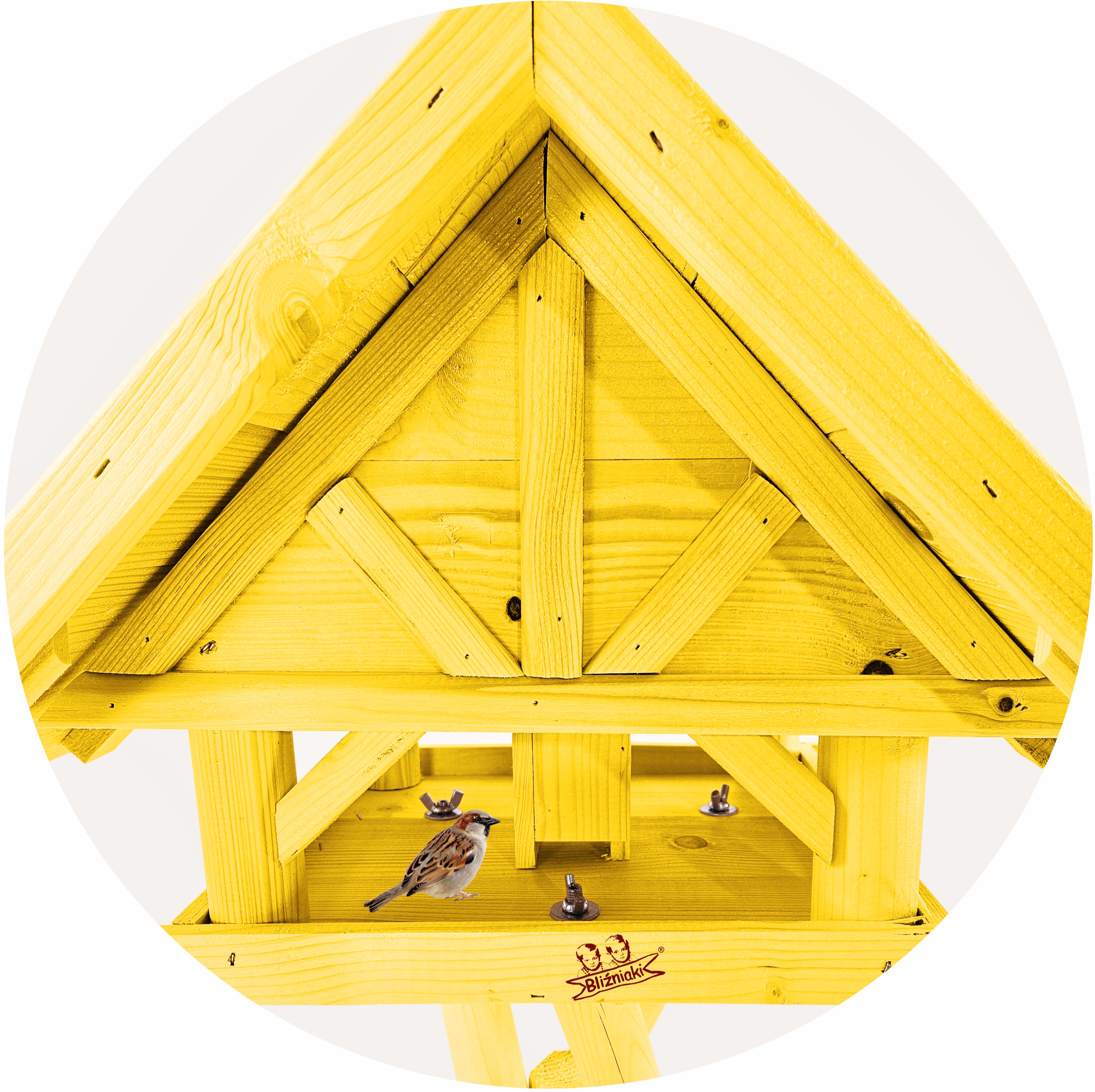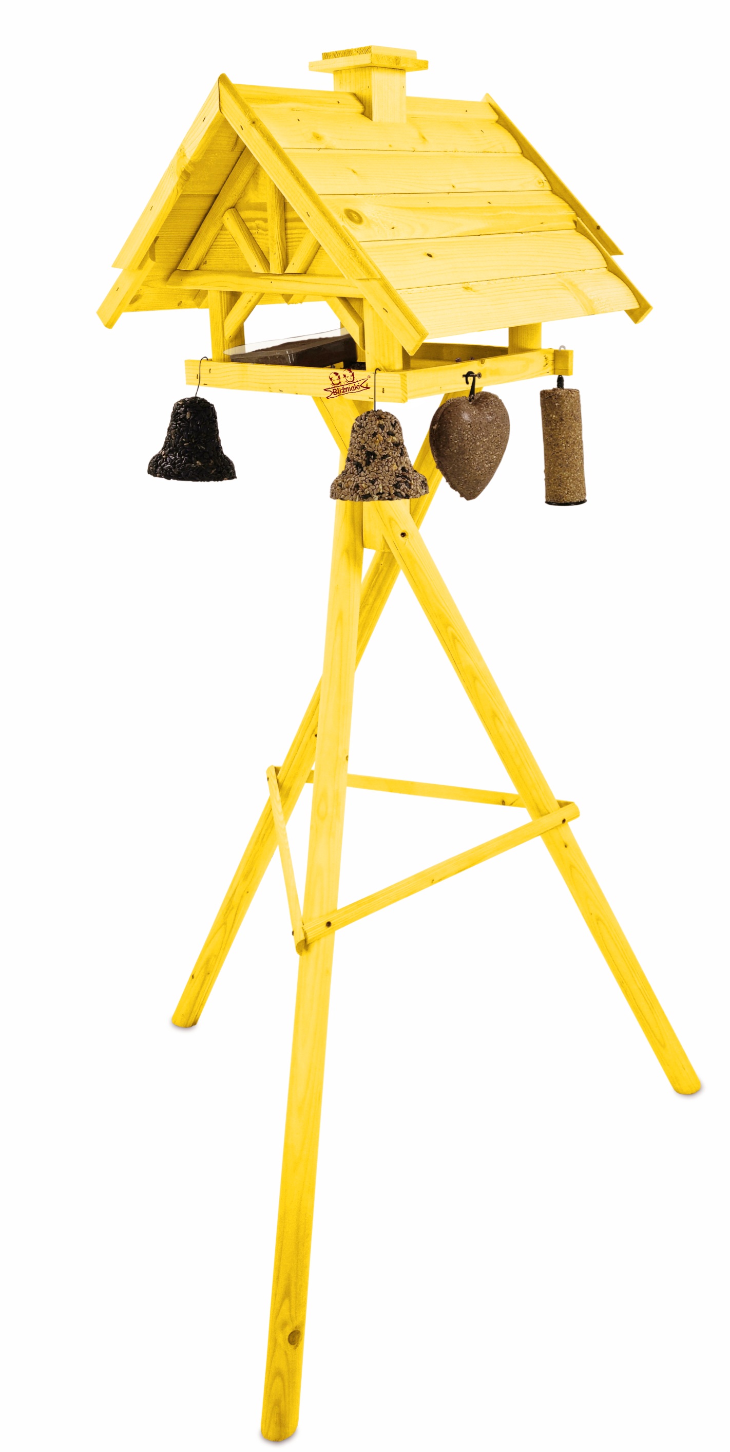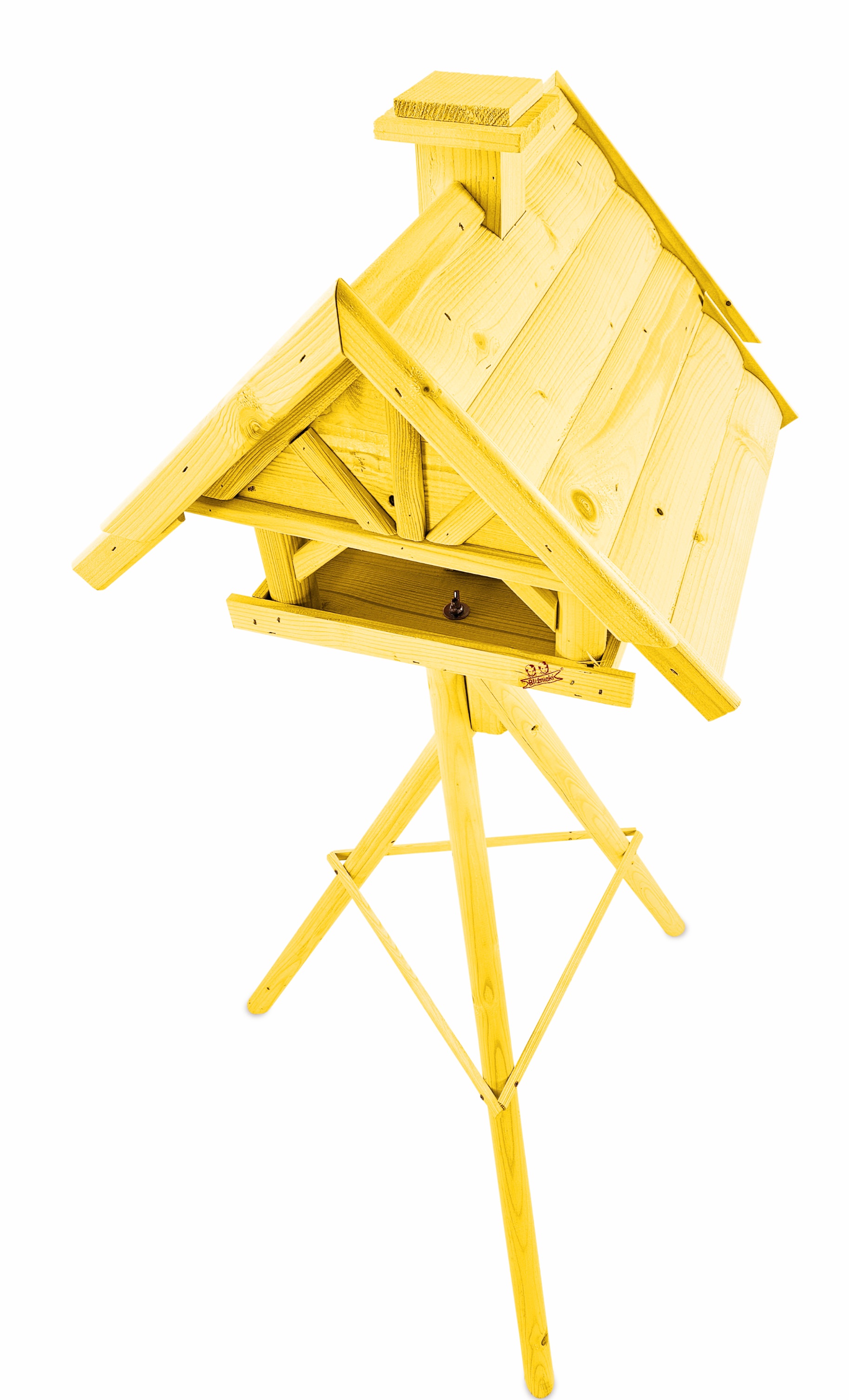 Produkt jest w całości wykonany z wytrzymałego, suszonego drewna sosnowego. Został pokryty impregnatem, który jest wykonany na bazie barwników roślinnych, co czyni go ekologicznym i przyjaznym dla ludzi i zwierząt. Karmnik wykończony jest kolorem ŻÓŁTYM.