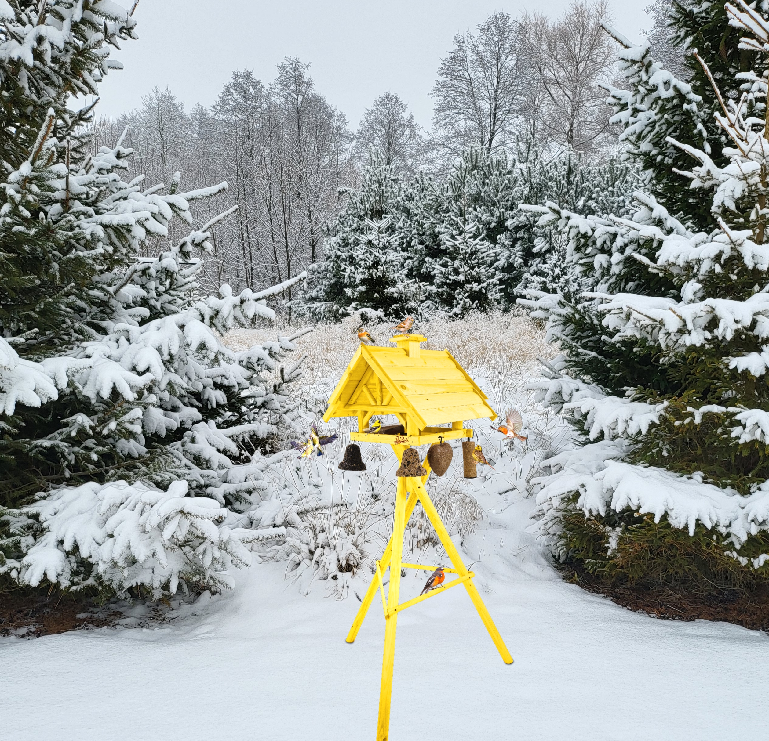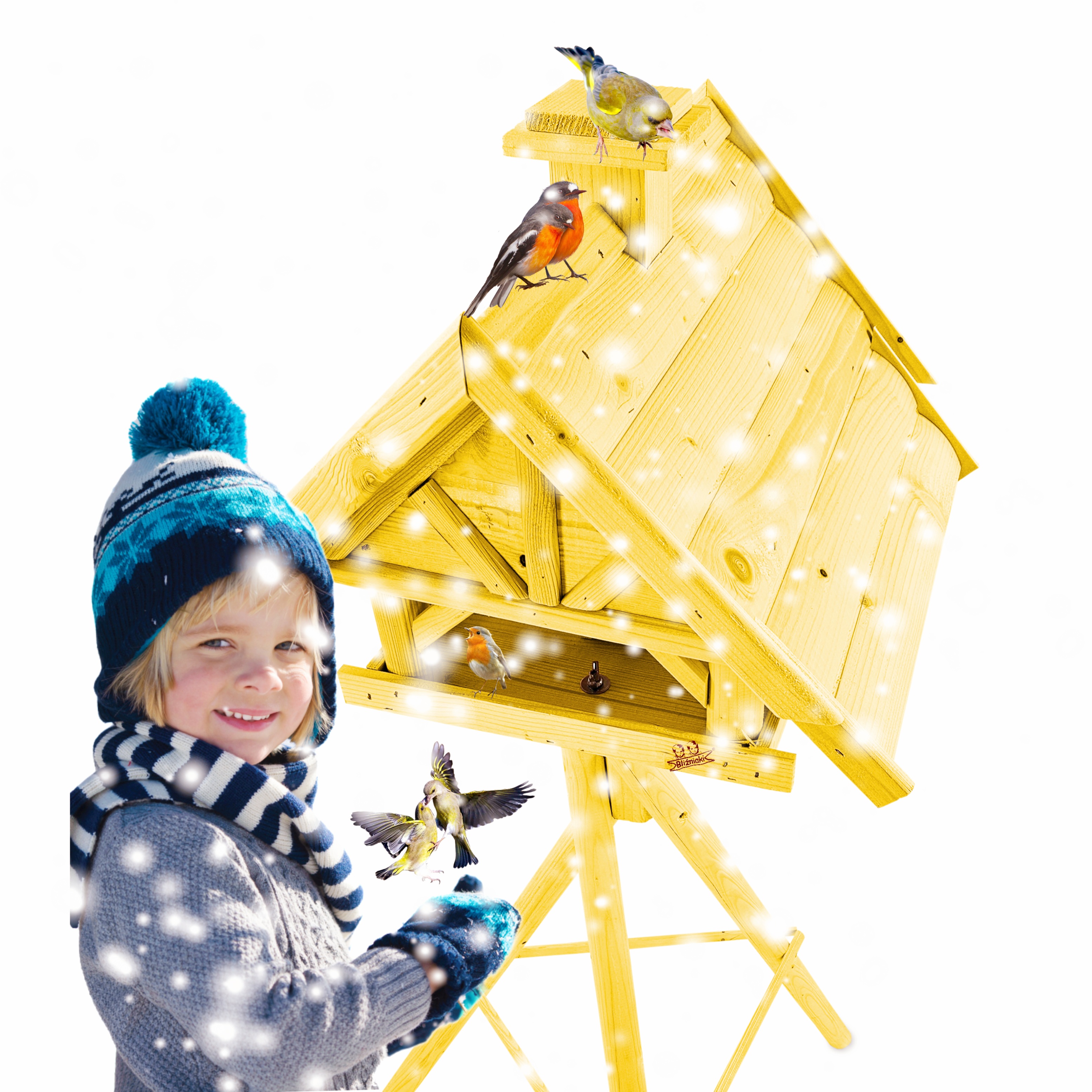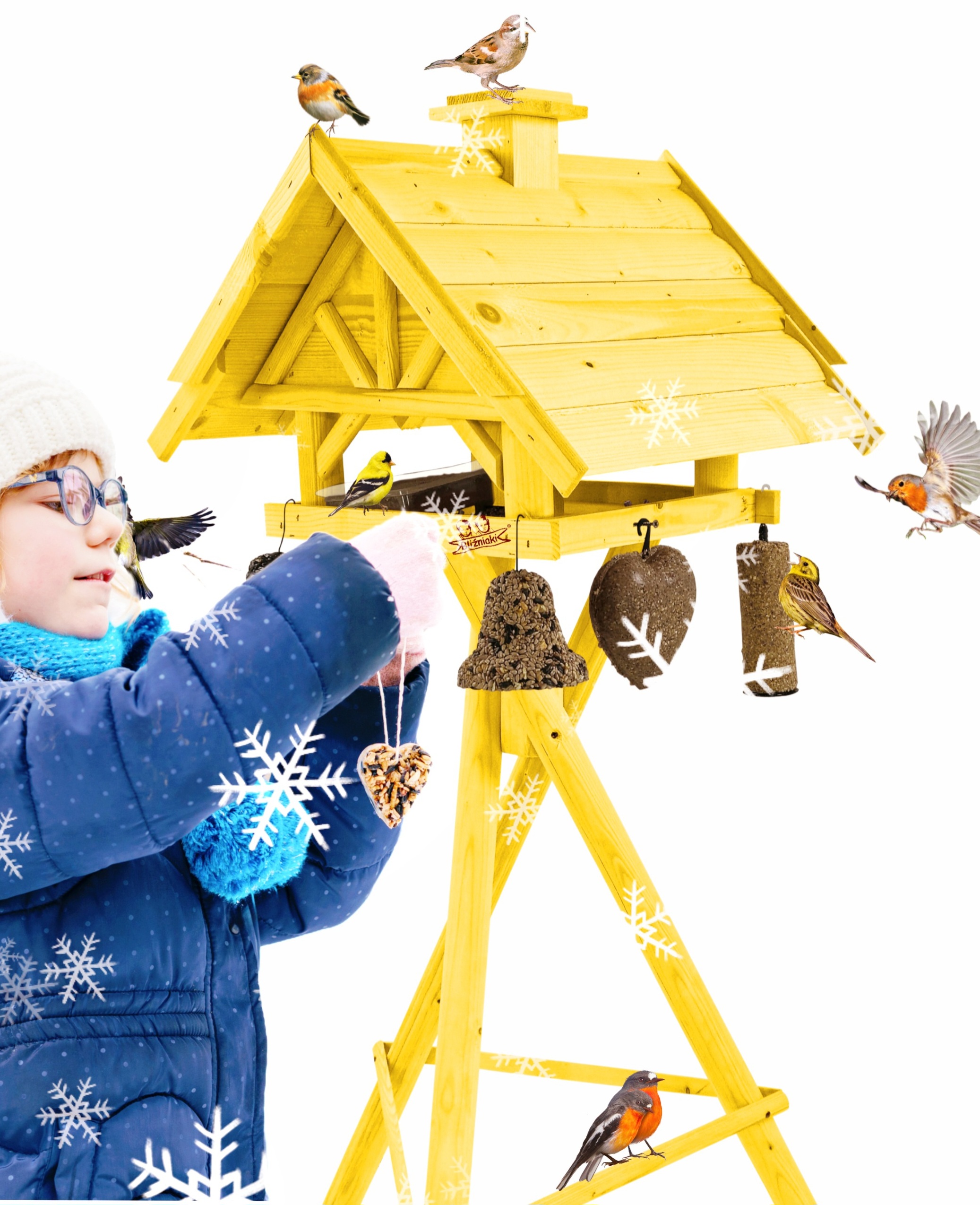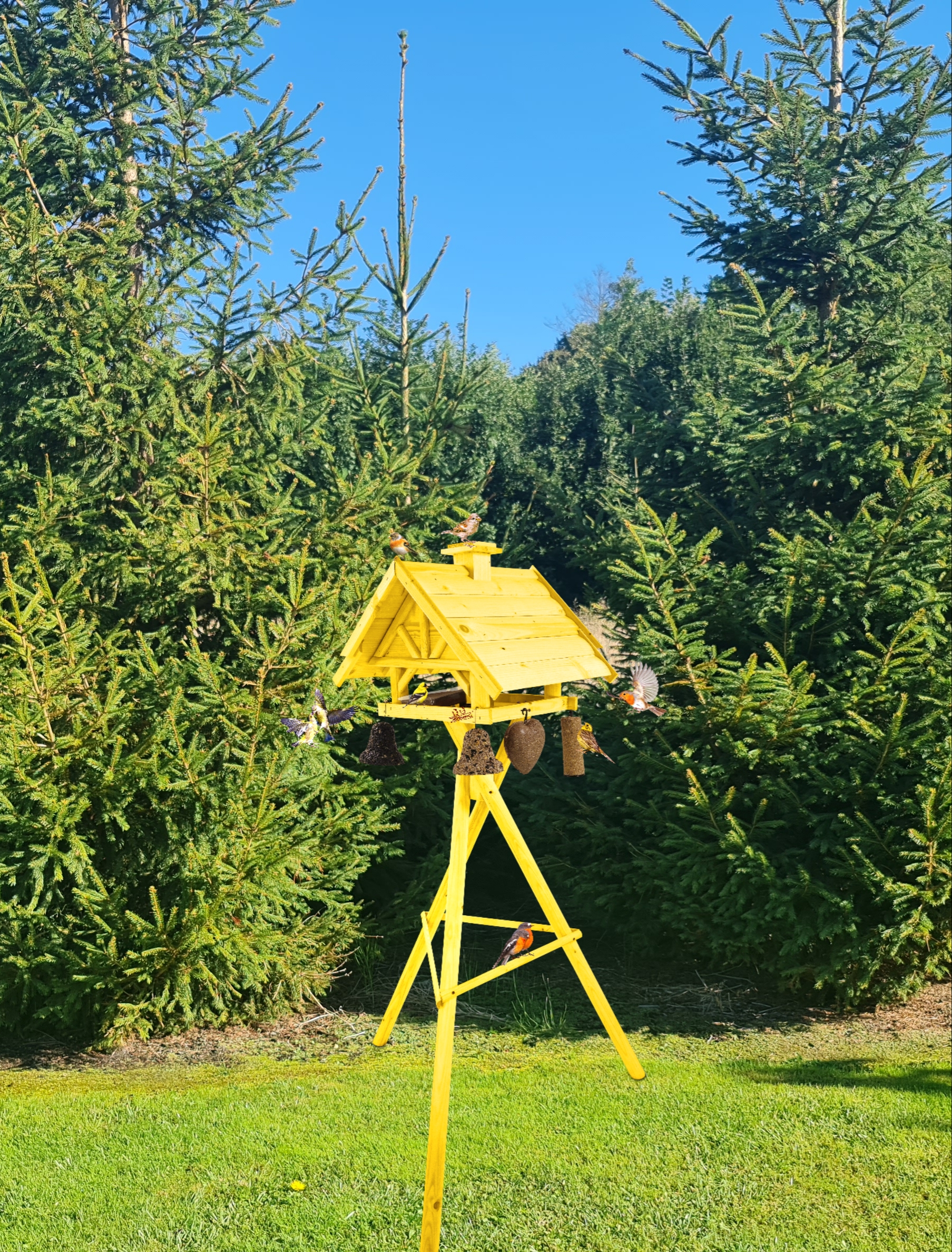 Produkt jest w całości wykonany z wytrzymałego, suszonego drewna sosnowego. Został pokryty impregnatem, który jest wykonany na bazie barwników roślinnych, co czyni go ekologicznym i przyjaznym dla ludzi i zwierząt. Karmnik wykończony jest kolorem ŻÓŁTYM.