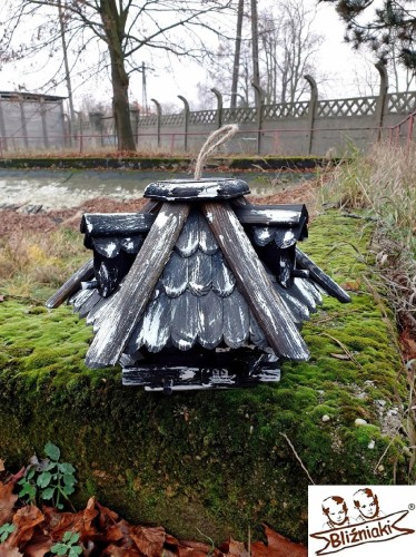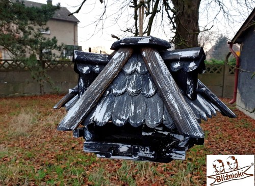 Przedmiotem sprzedaży jest ozdobny drewniany Karmnik dla ptaków model K5A ze stojakiem.