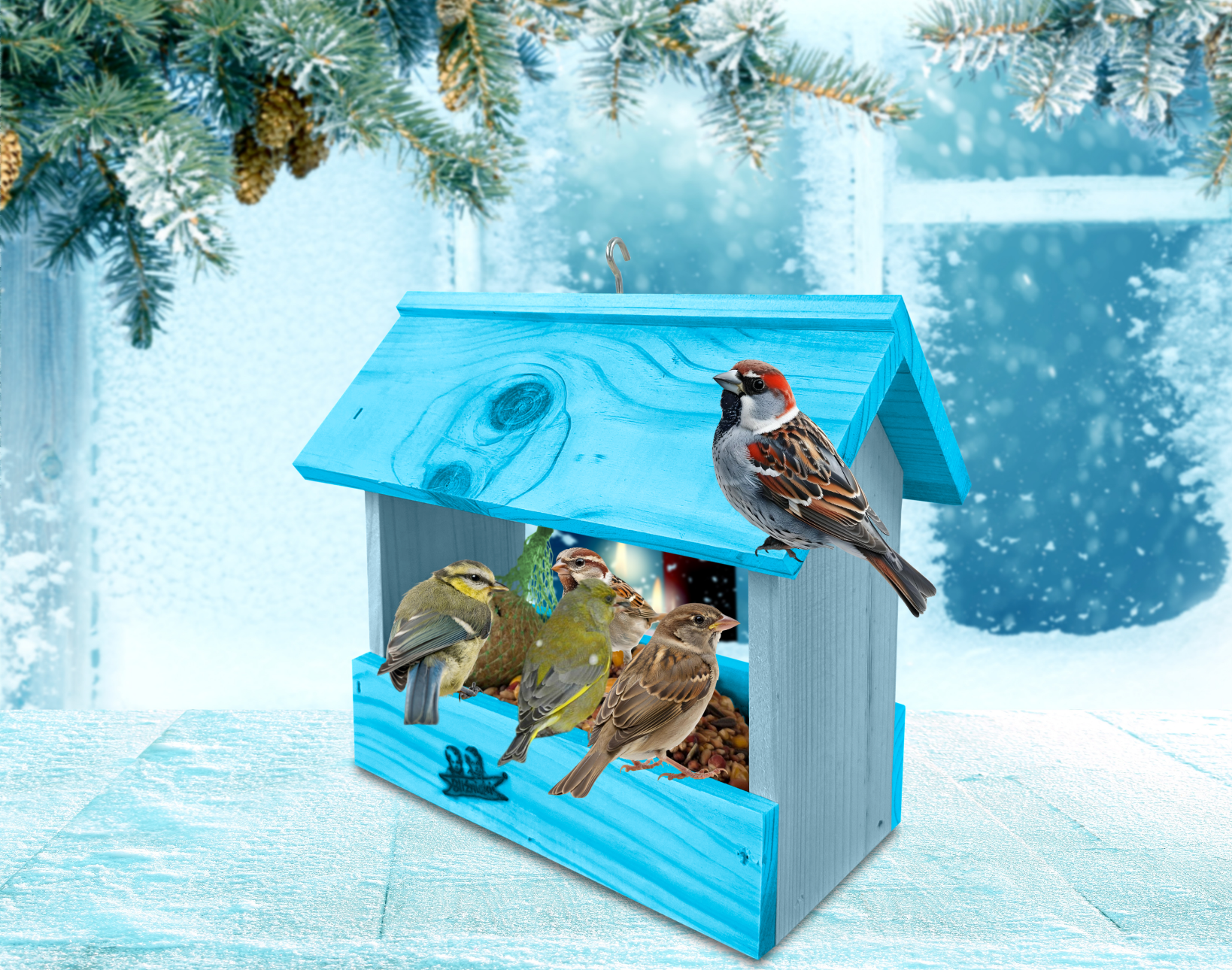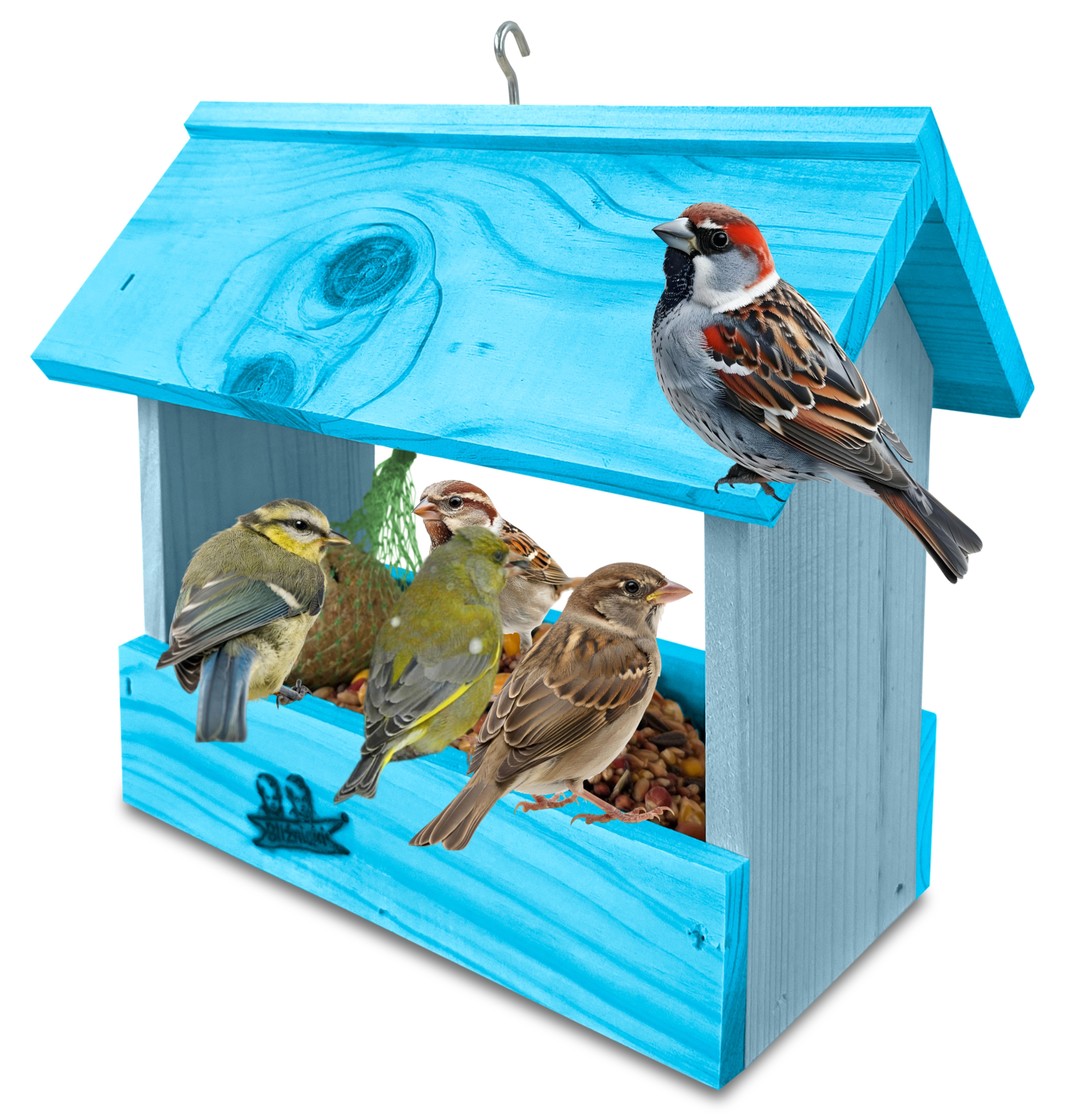 - U góry widoczny jest haczyk umożliwiający zawieszenie karmnika w dowolnym miejscu, możliwe jest również jego postawienie