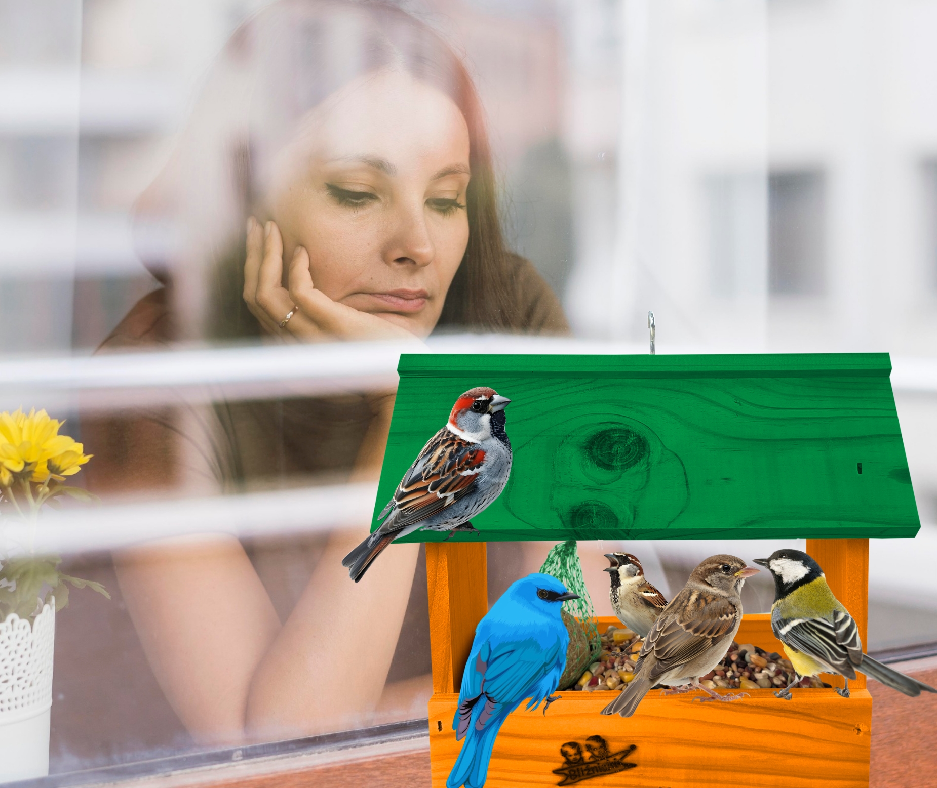 Przedmiotem sprzedaży jest ozdobny drewniany karmnik dla ptaków budka domek na balkon K204 B K kolor pomarańczowy z zielonym dachem