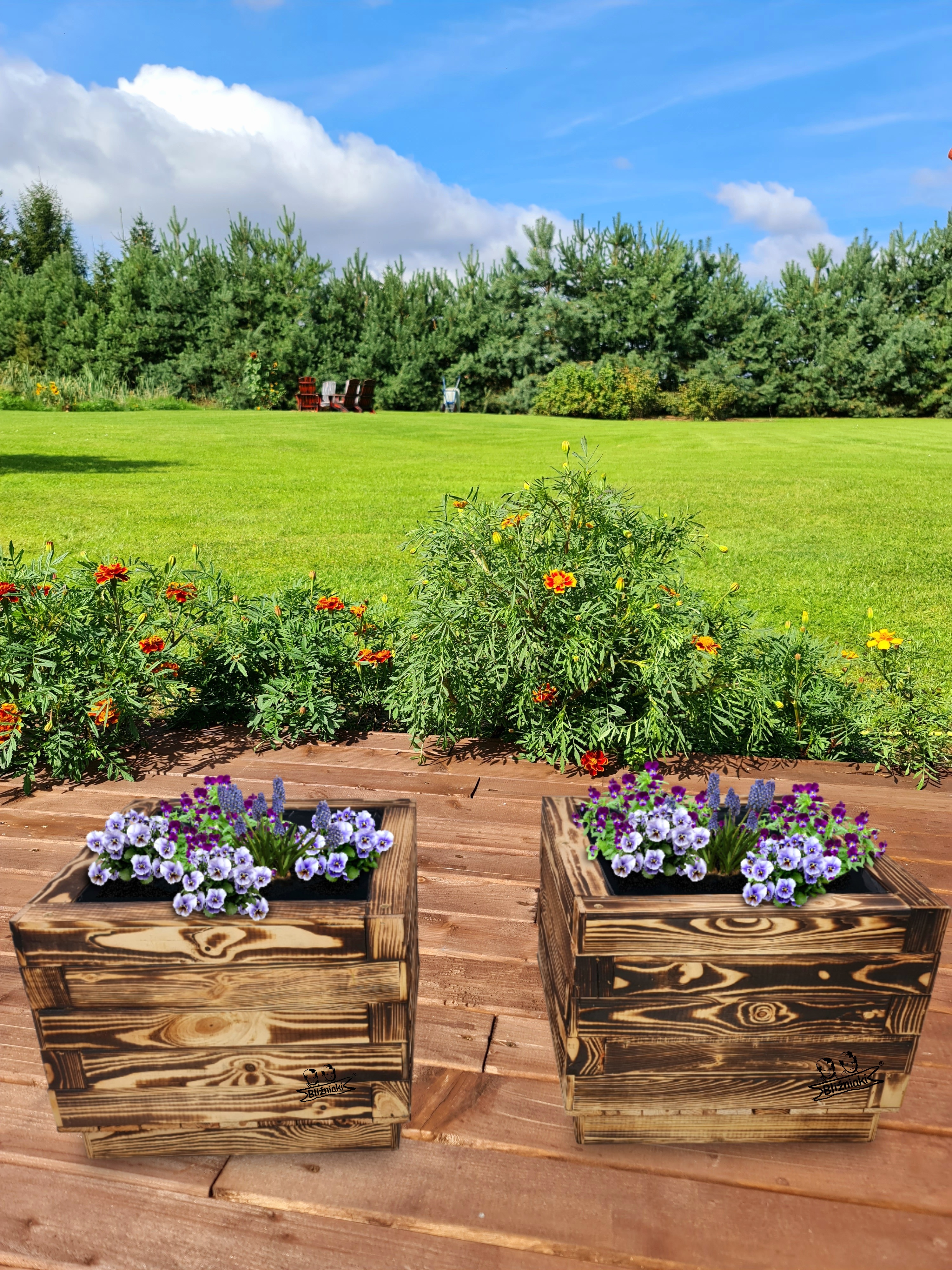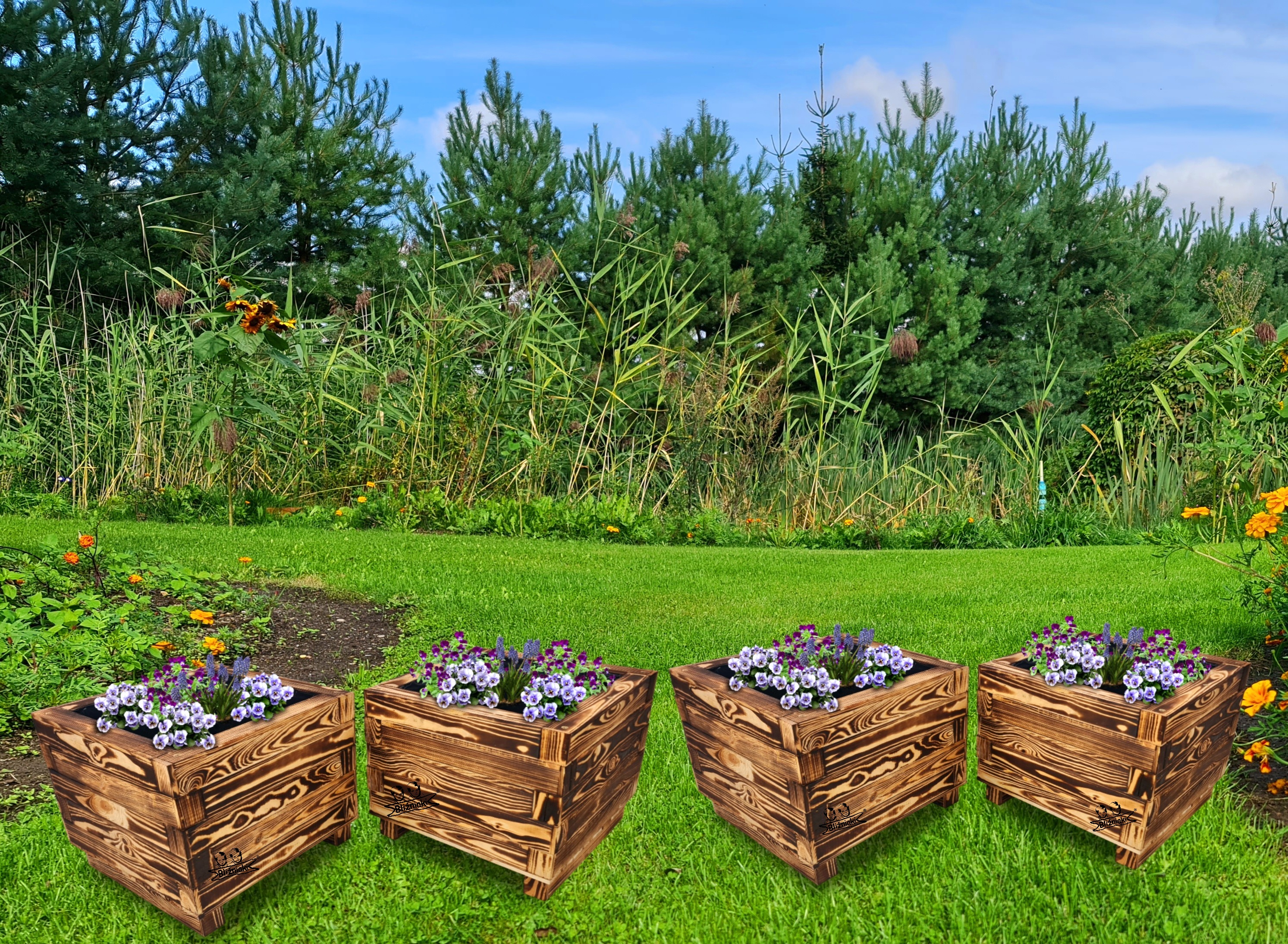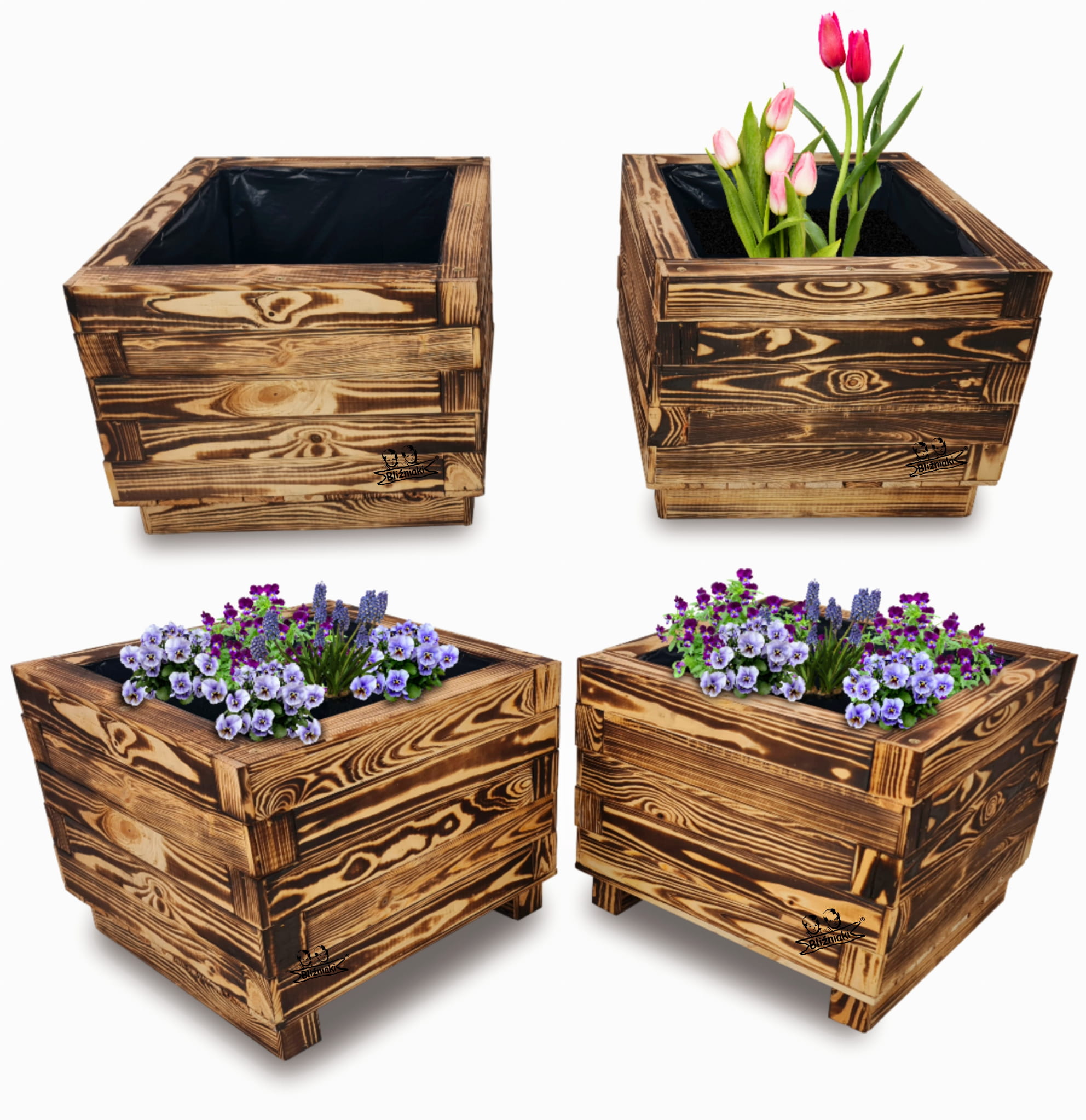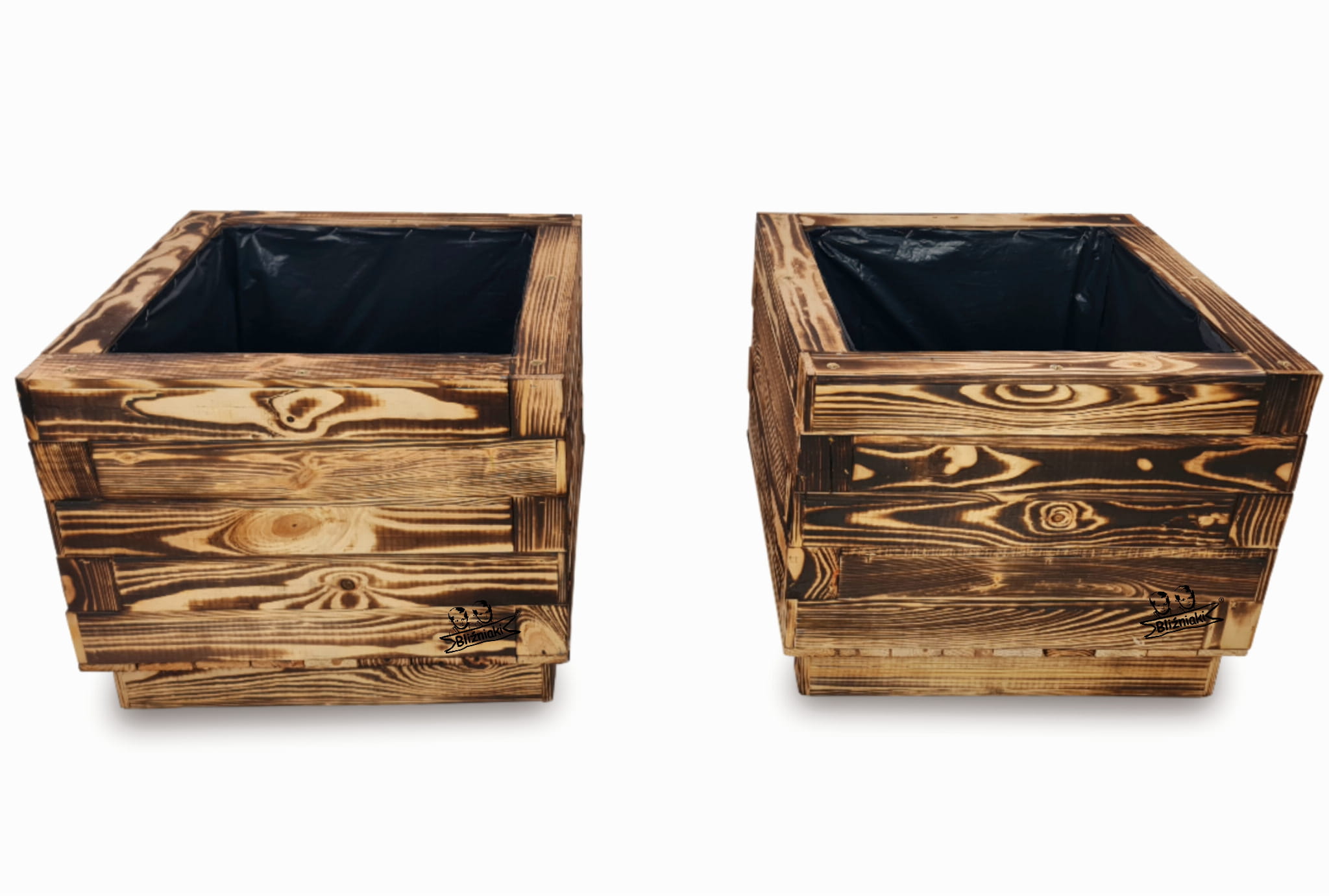 Nasze donice o wymiarach 47x47x37,5cm pomieszczą Twoje ulubione kwiaty. Drewno poddane procesowi opalania ogniem sprawia, że donica jest odporna na szkodliwe działanie wody oraz wilgoci, może być więc przechowywana cały rok na zewnątrz domu, na tarasie, w ogrodzie.