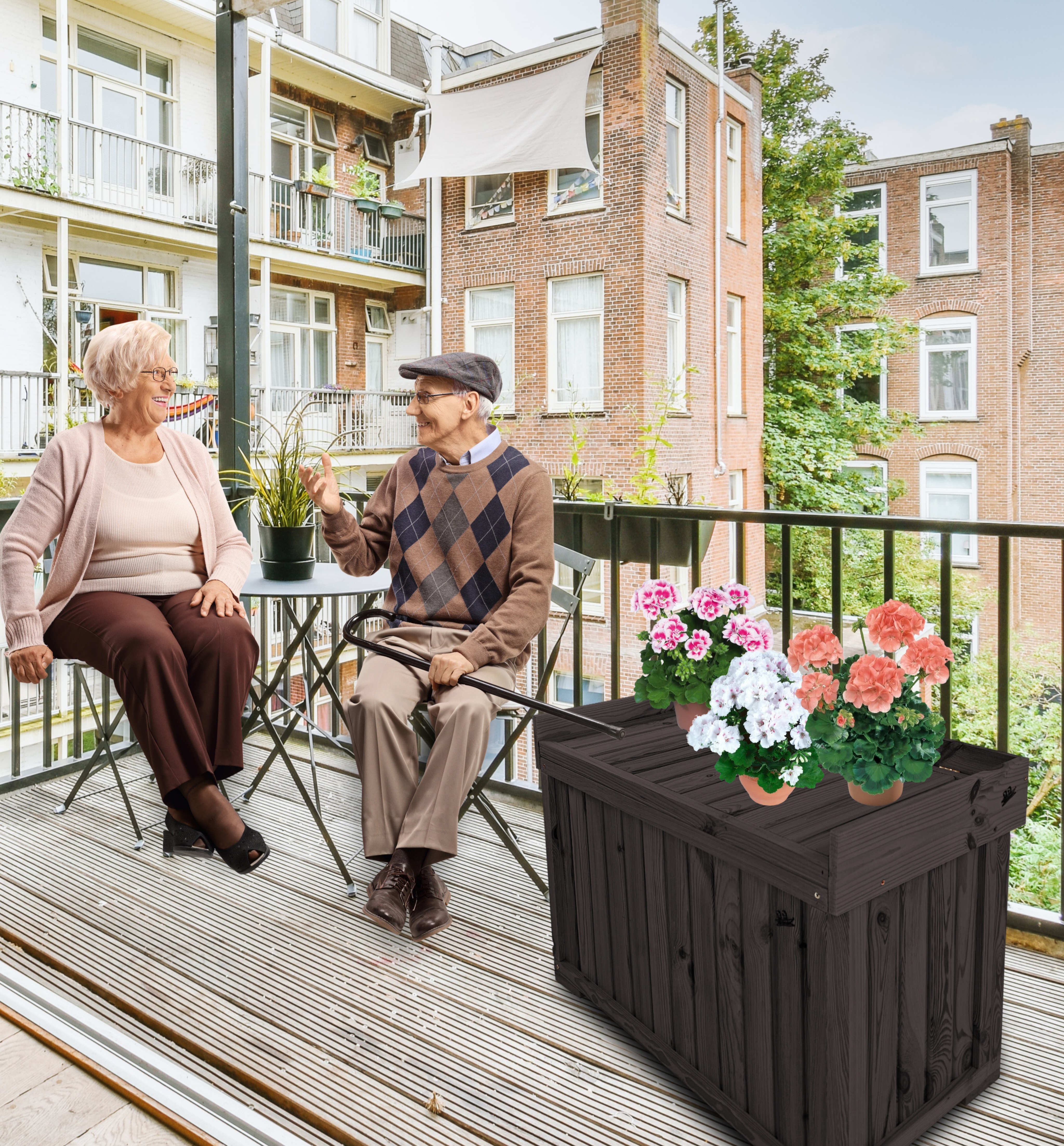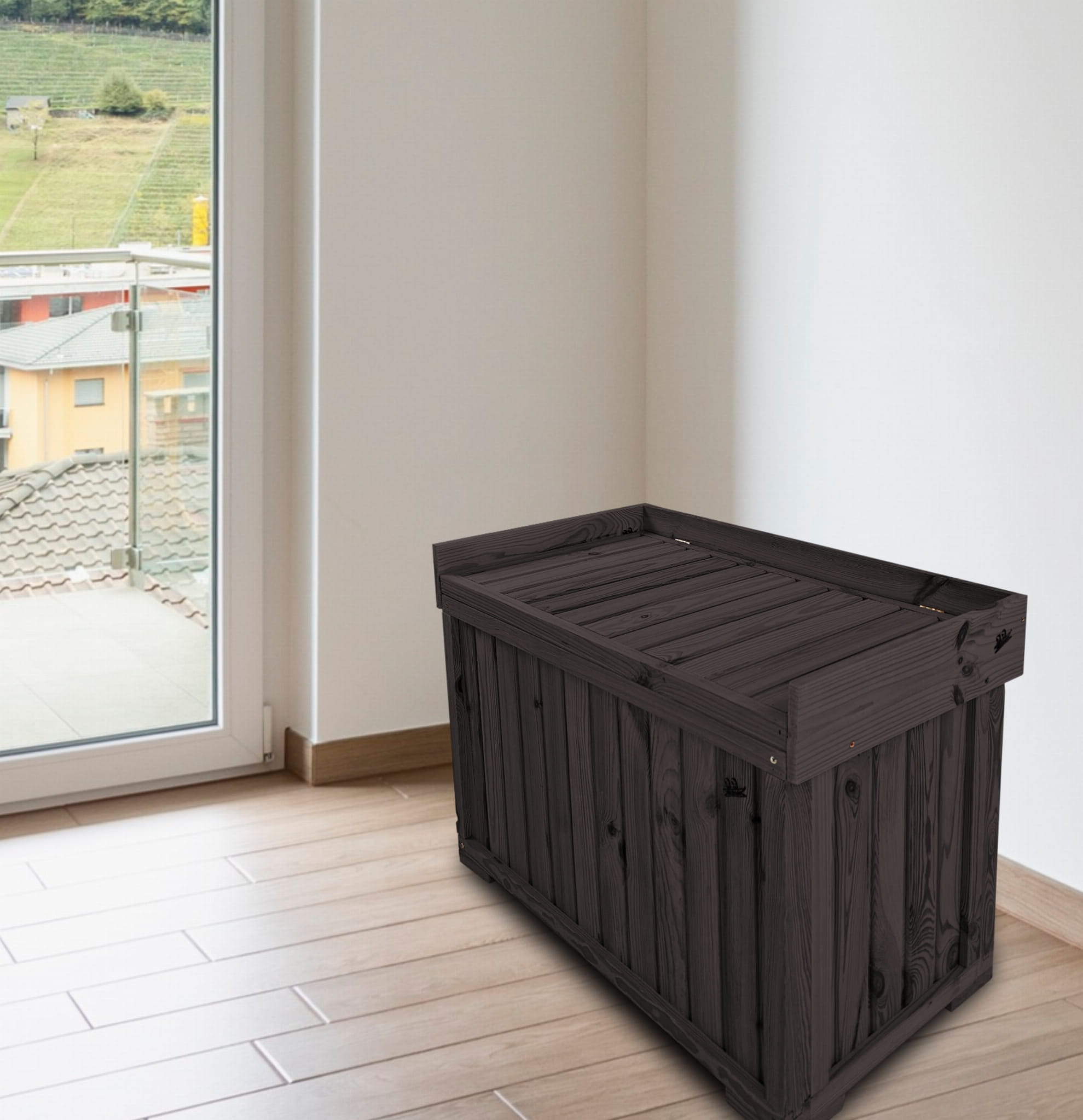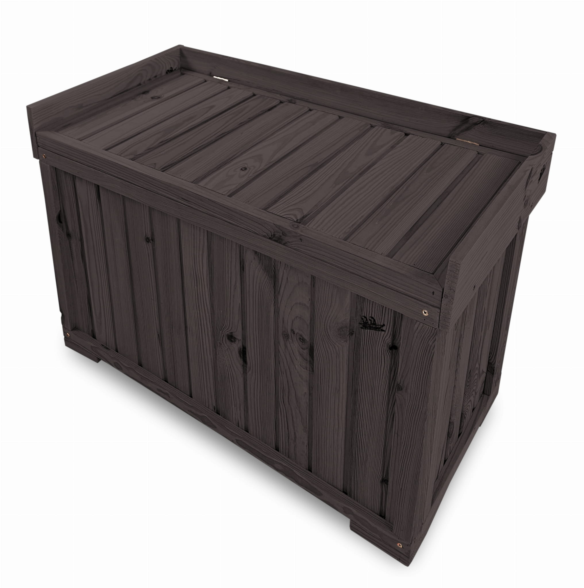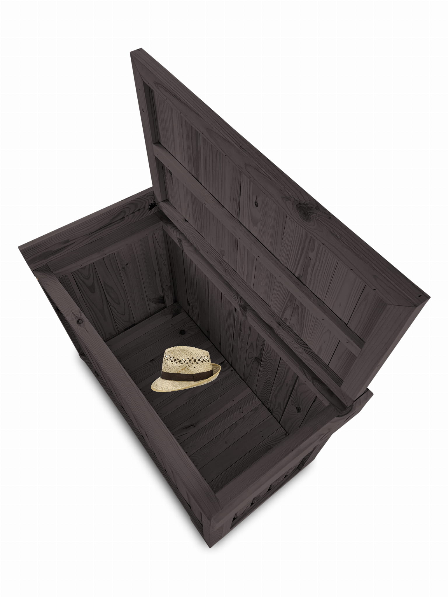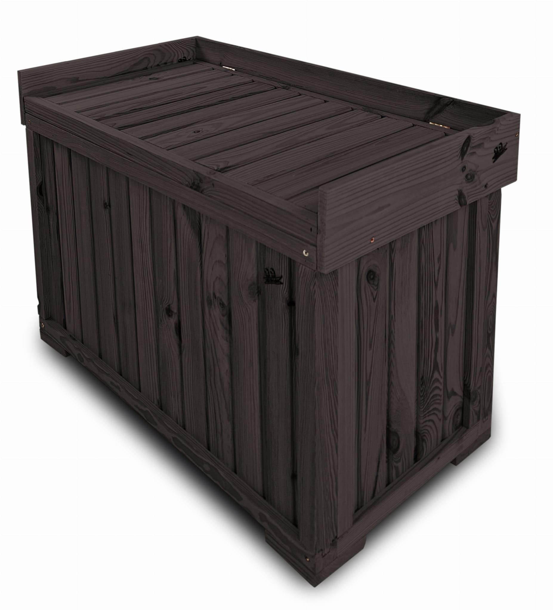 Kufer wykonany jest z solidnego drewna, co zapewnia trwałość oraz wyjątkowy wygląd. Produkt został pomalowany na elegancki kolor czarny, który wspaniale komponuje się z wnętrzami domów, tarasami oraz ogrodami.