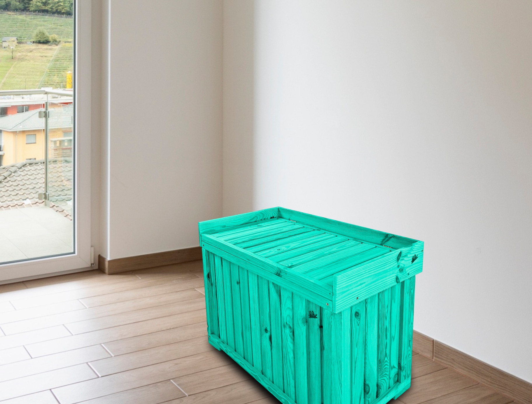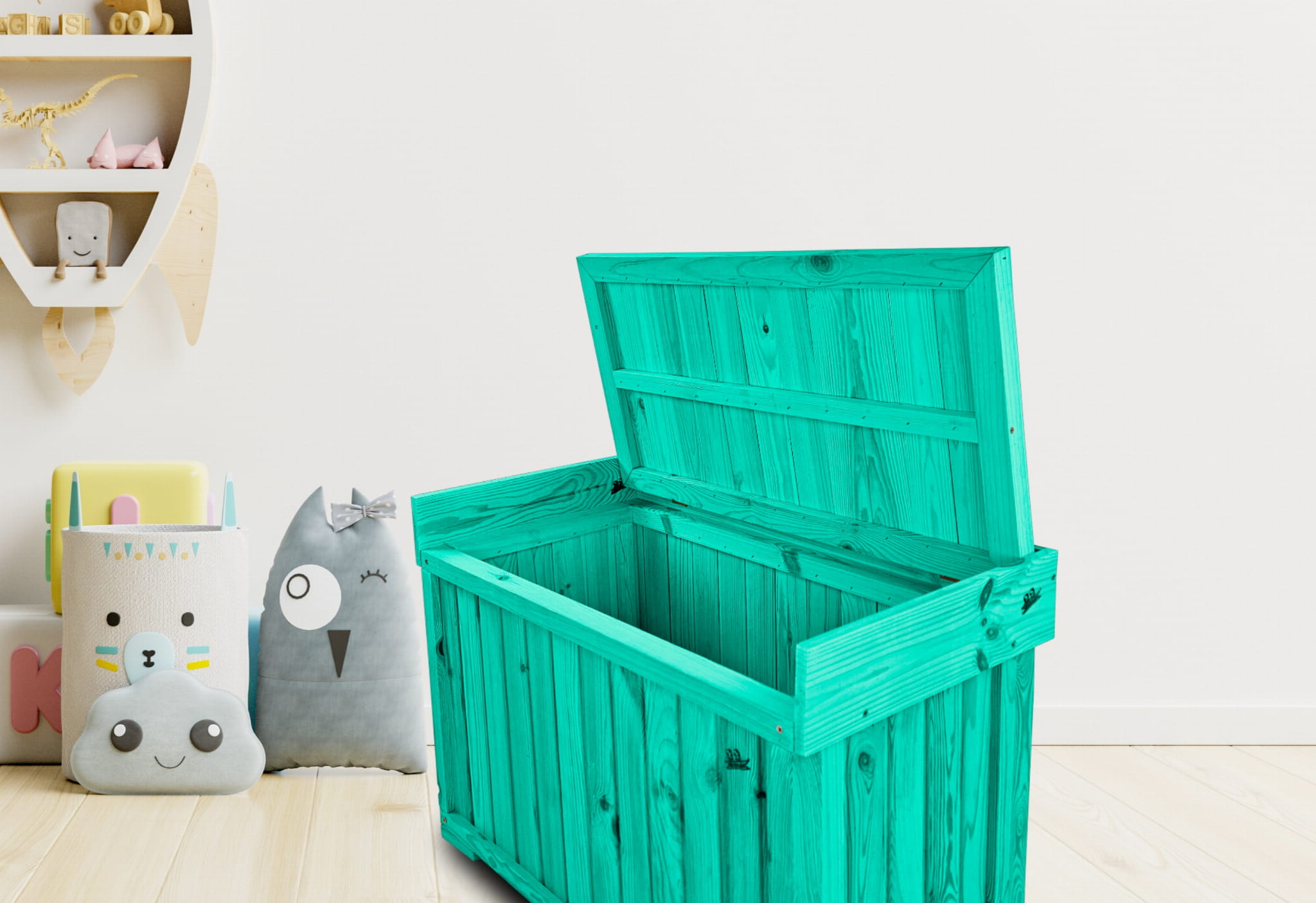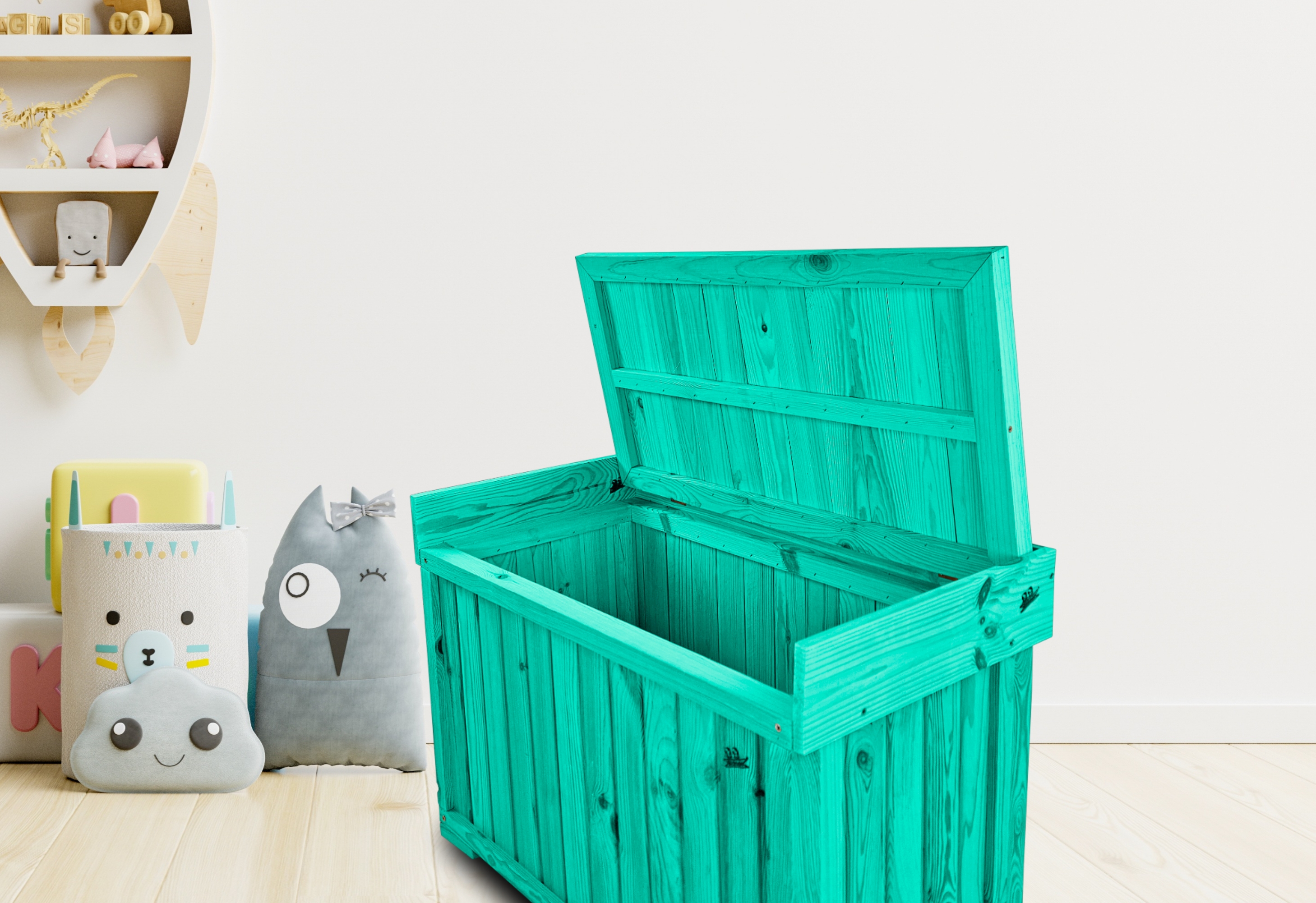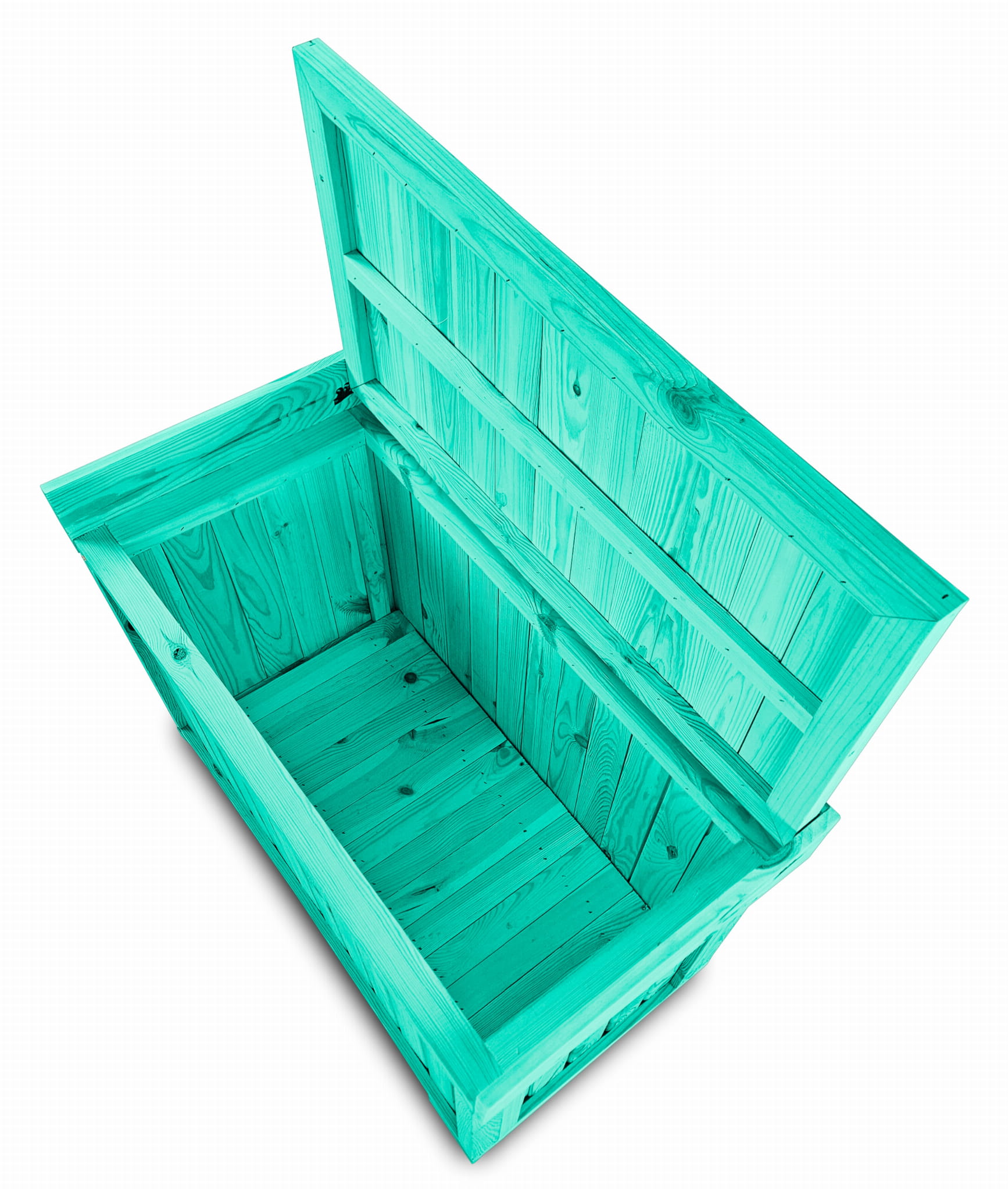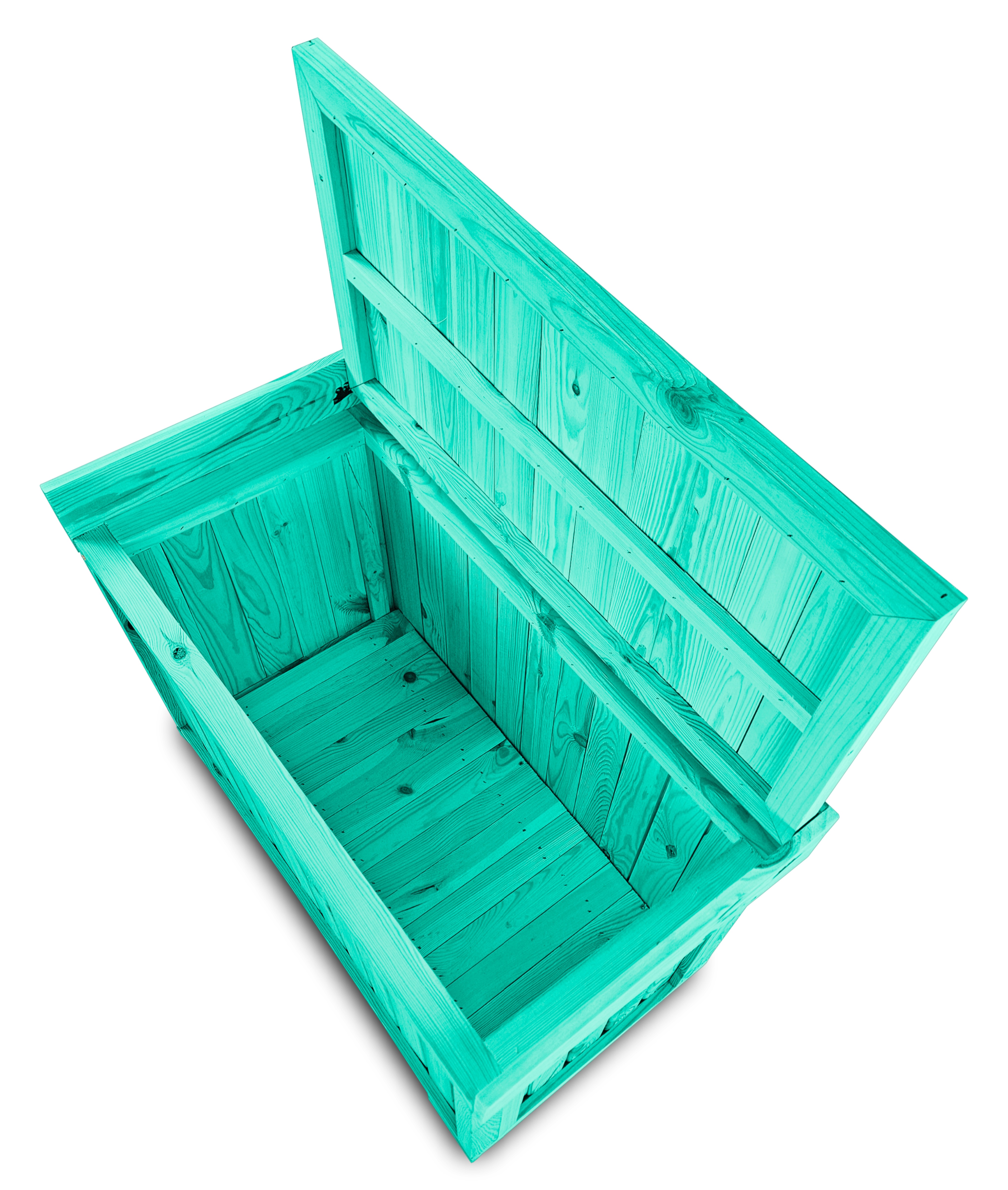 Kufer wykonany jest z solidnego drewna, co zapewnia trwałość oraz wyjątkowy wygląd. Produkt został pomalowany na elegancki kolor morski, który wspaniale komponuje się z wnętrzami domów, tarasami oraz ogrodami.