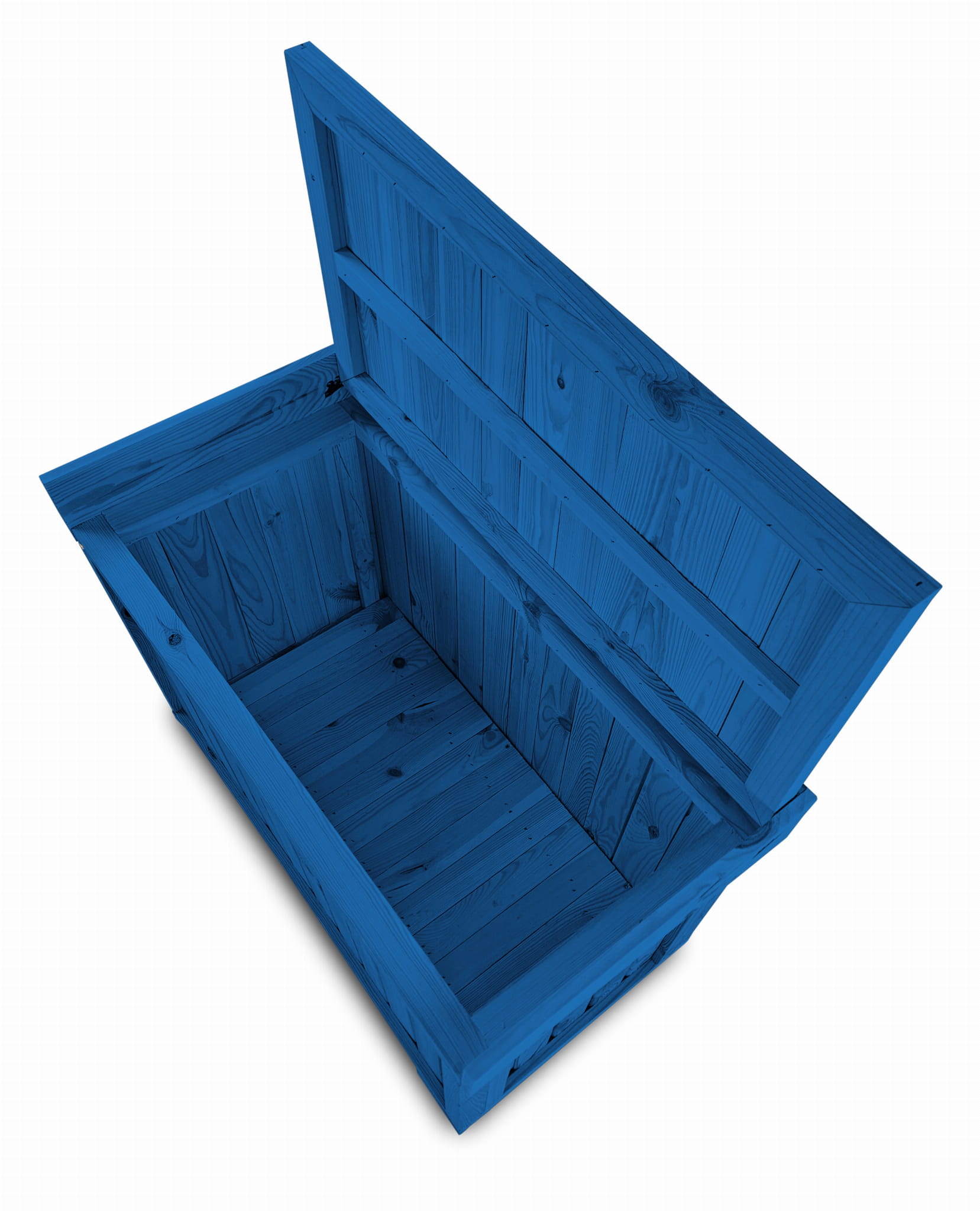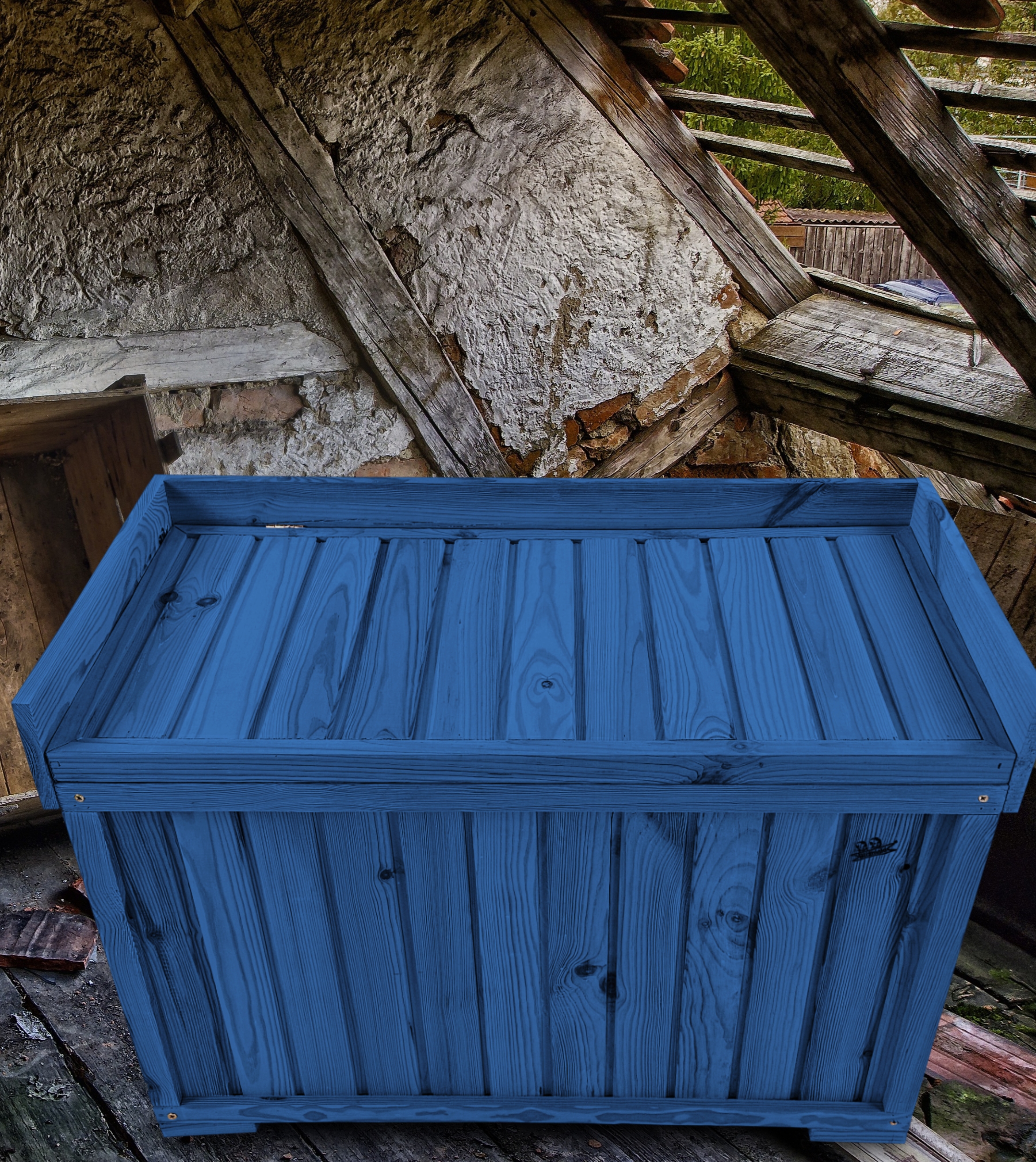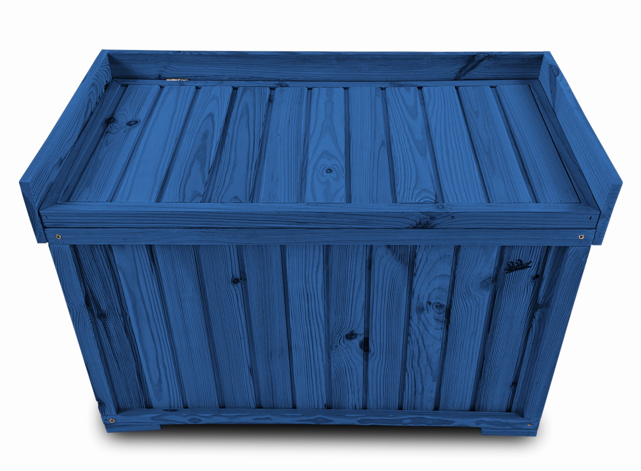 Kufer wykonany jest z solidnego drewna, co zapewnia trwałość oraz wyjątkowy wygląd. Produkt został pomalowany na elegancki kolor ciemny niebieski [granatowy], który wspaniale komponuje się z wnętrzami domów, tarasami oraz ogrodami.