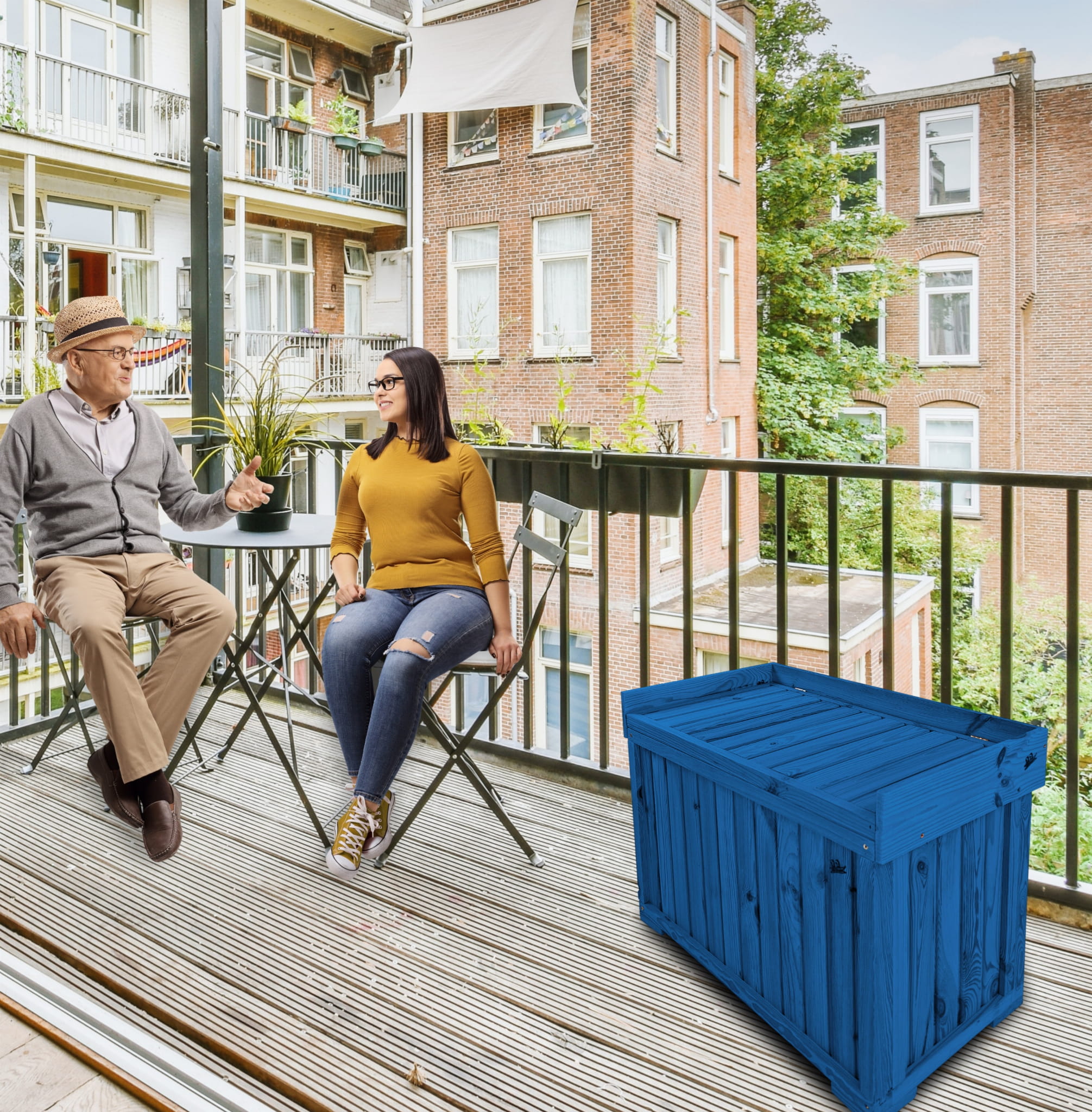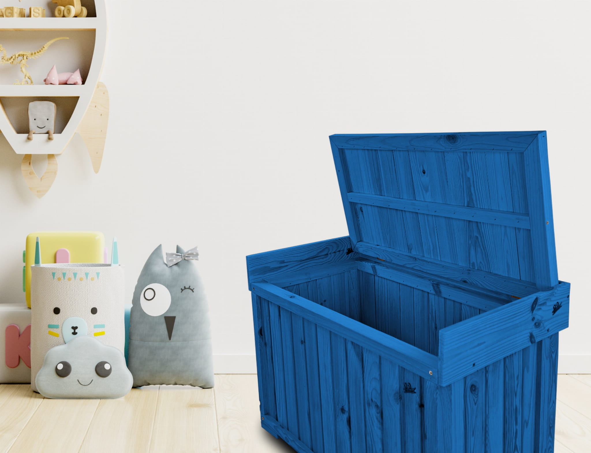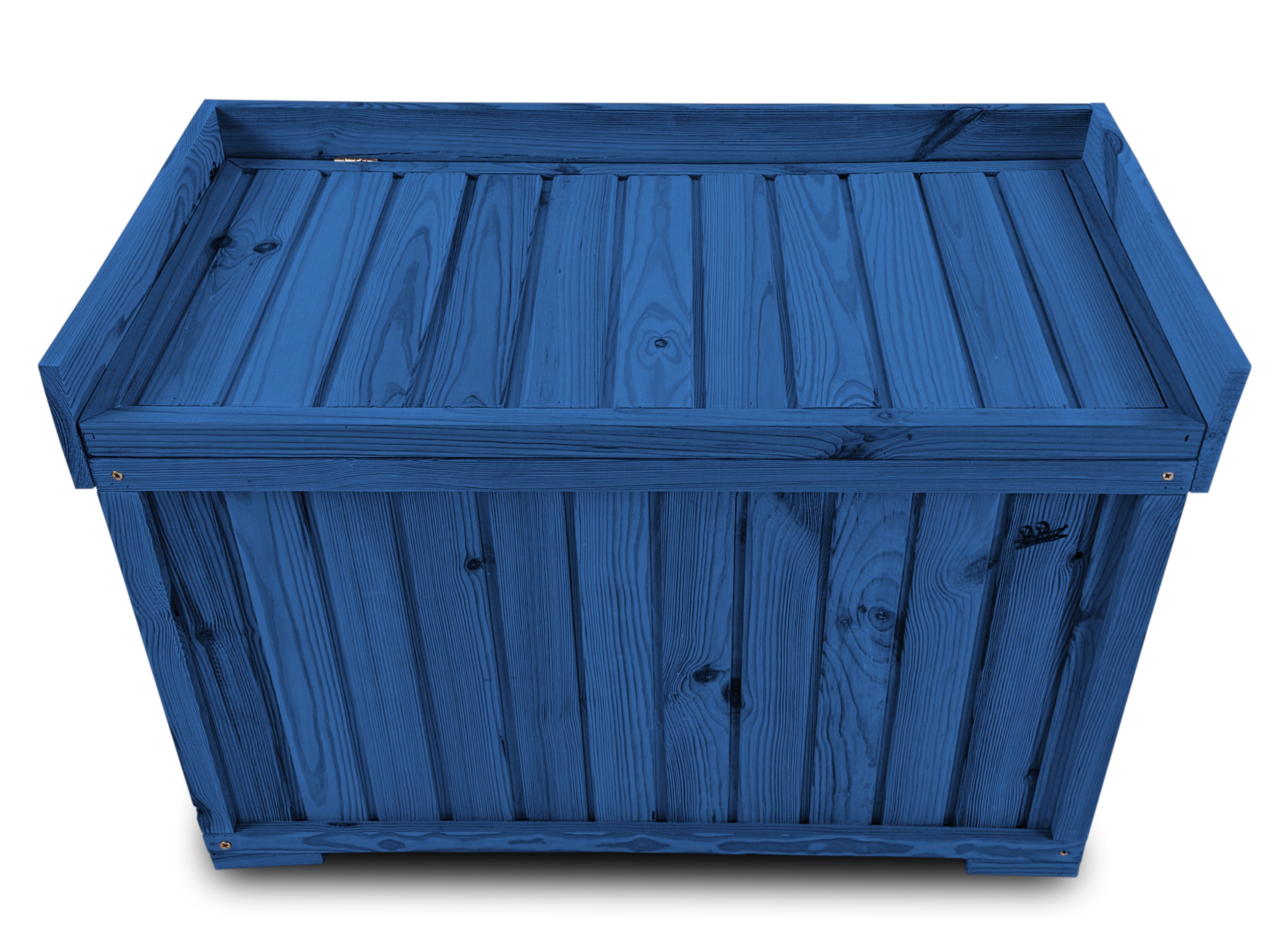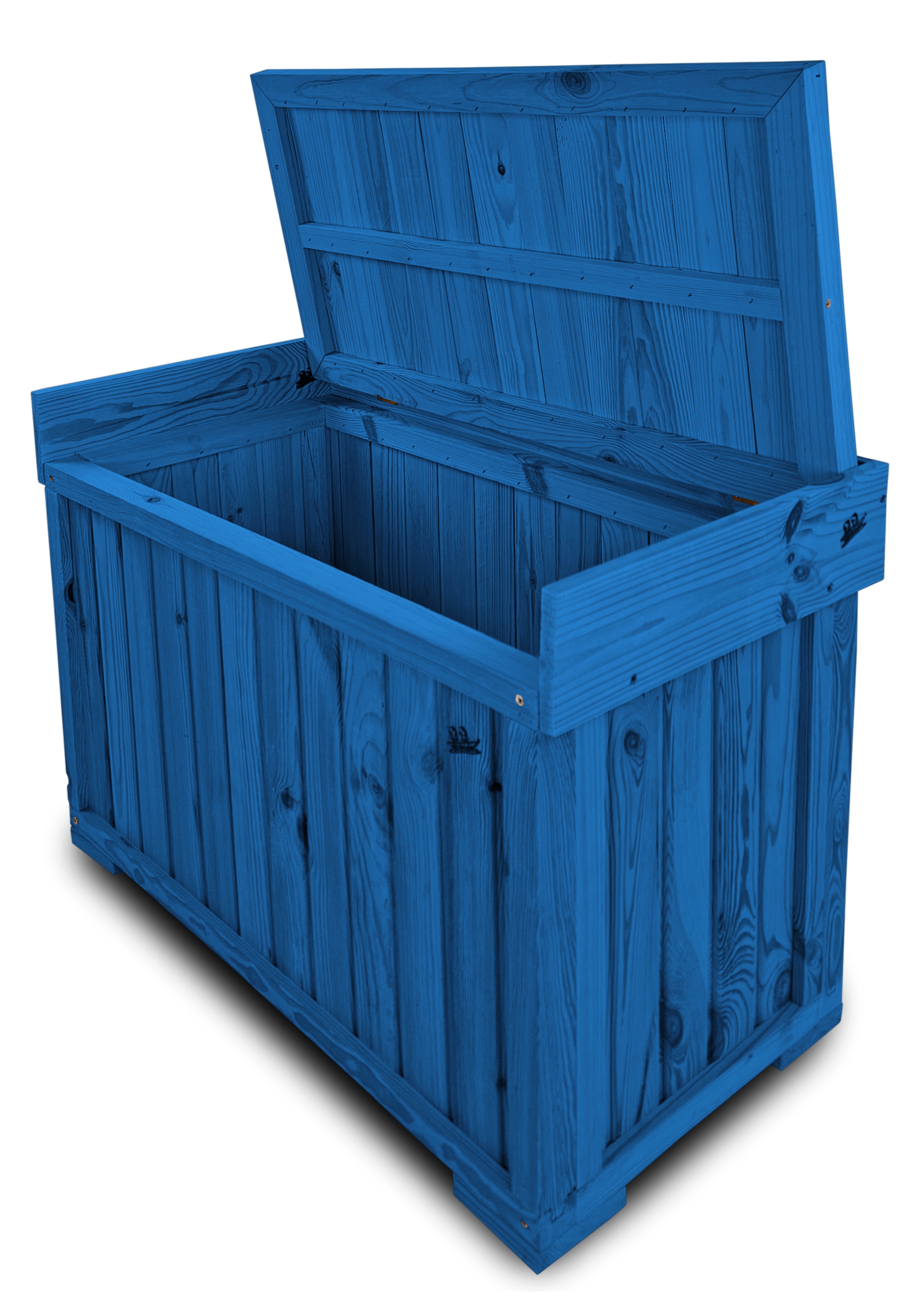 Kufer wykonany jest z solidnego drewna, co zapewnia trwałość oraz wyjątkowy wygląd. Produkt został pomalowany na elegancki kolor ciemny niebieski [granatowy], który wspaniale komponuje się z wnętrzami domów, tarasami oraz ogrodami.