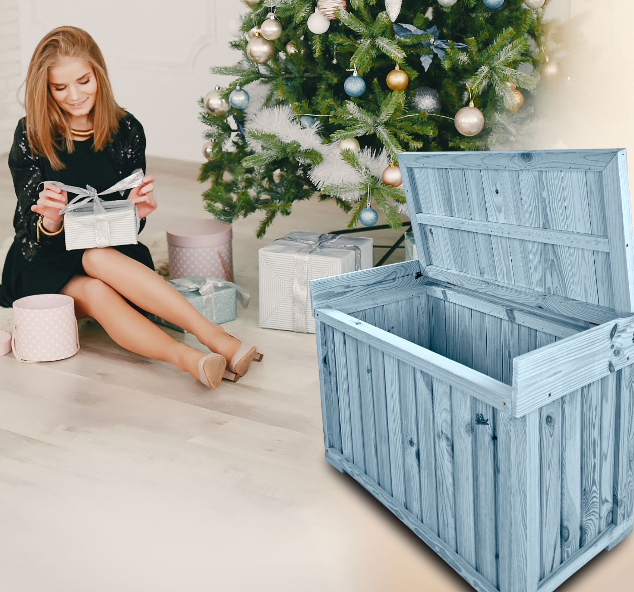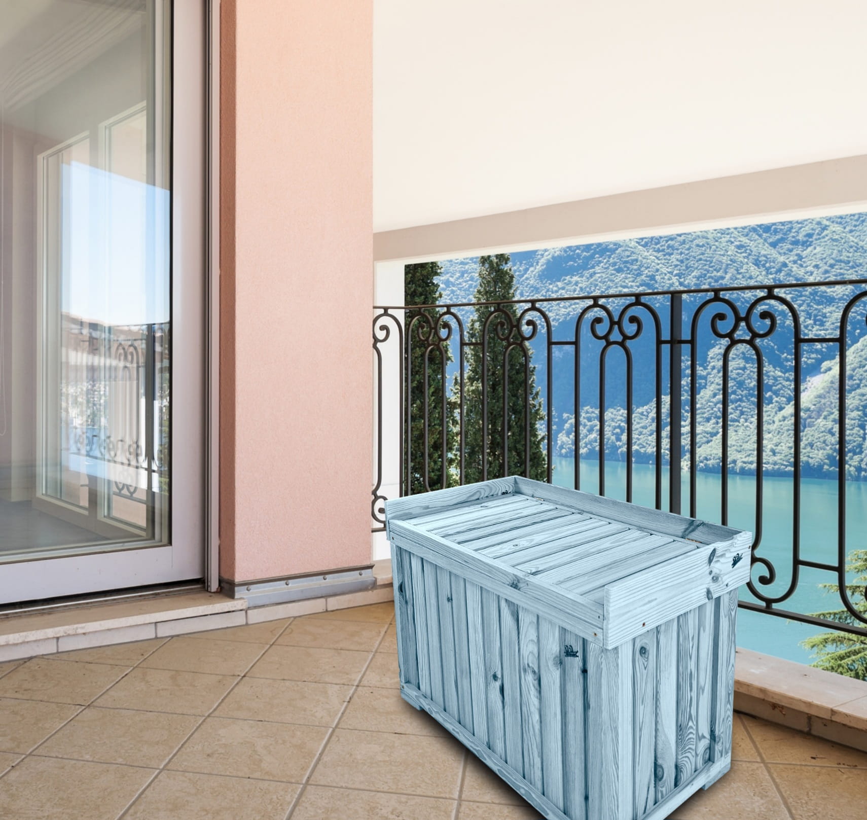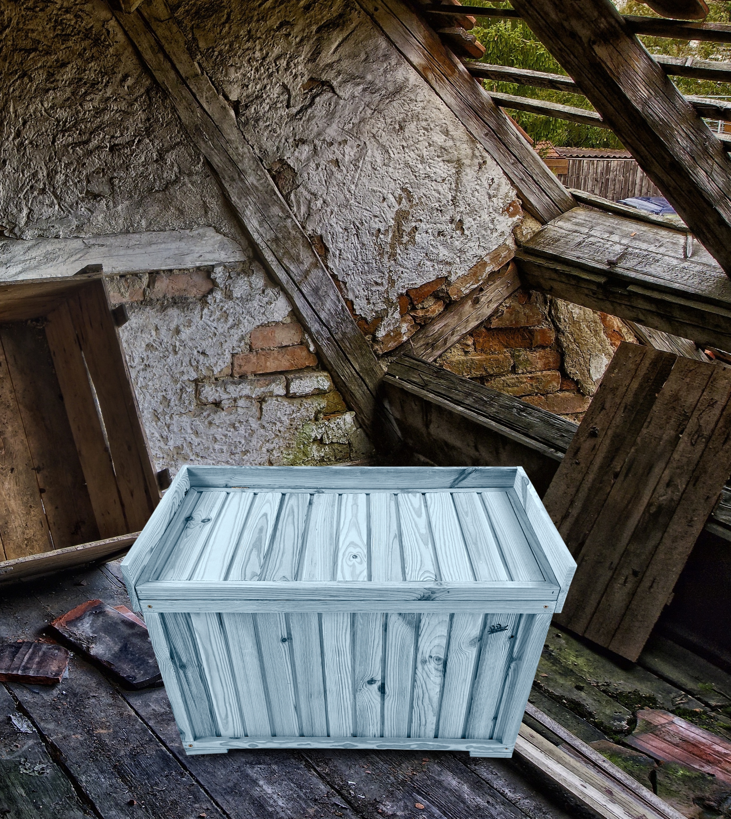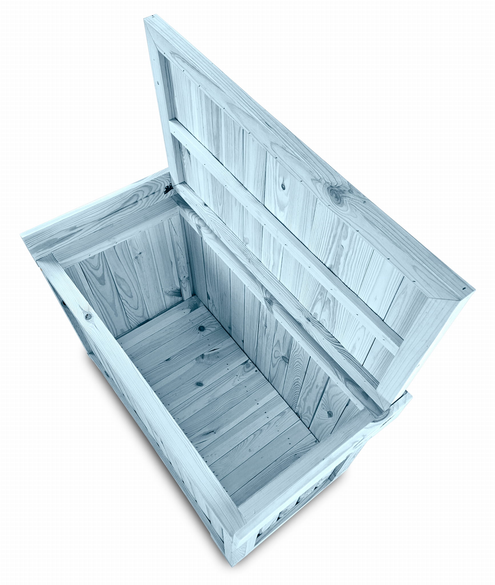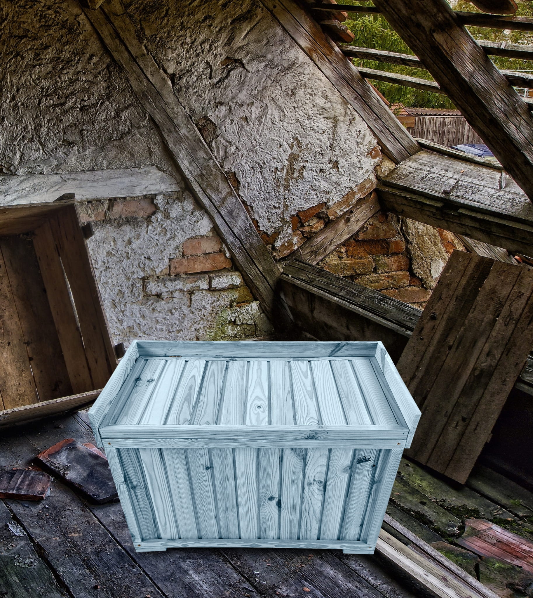Kufer wykonany jest z solidnego drewna, co zapewnia trwałość oraz wyjątkowy wygląd. Produkt został pomalowany na elegancki kolor pastelowy niebieski, który wspaniale komponuje się z wnętrzami domów, tarasami oraz ogrodami.