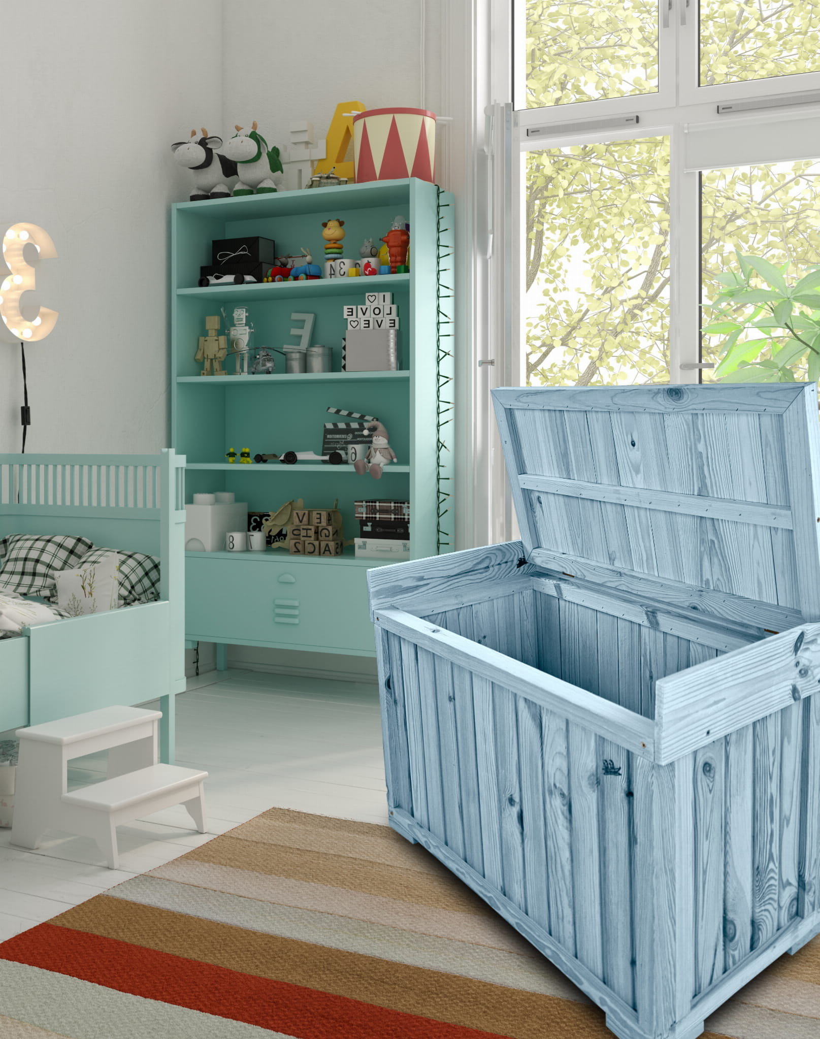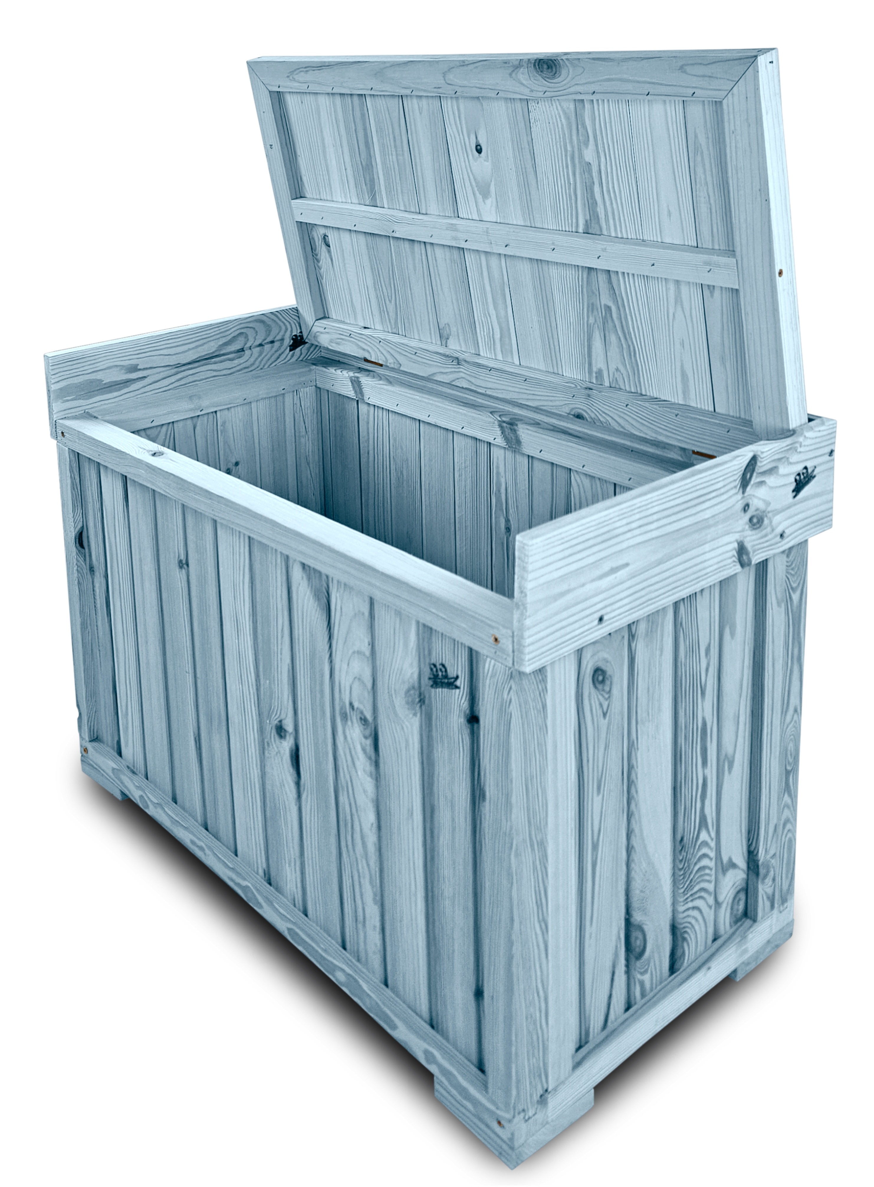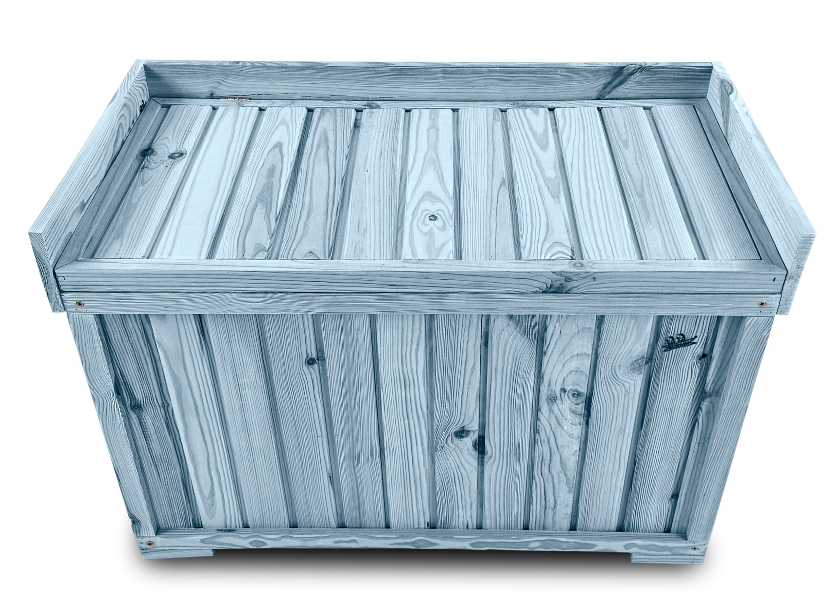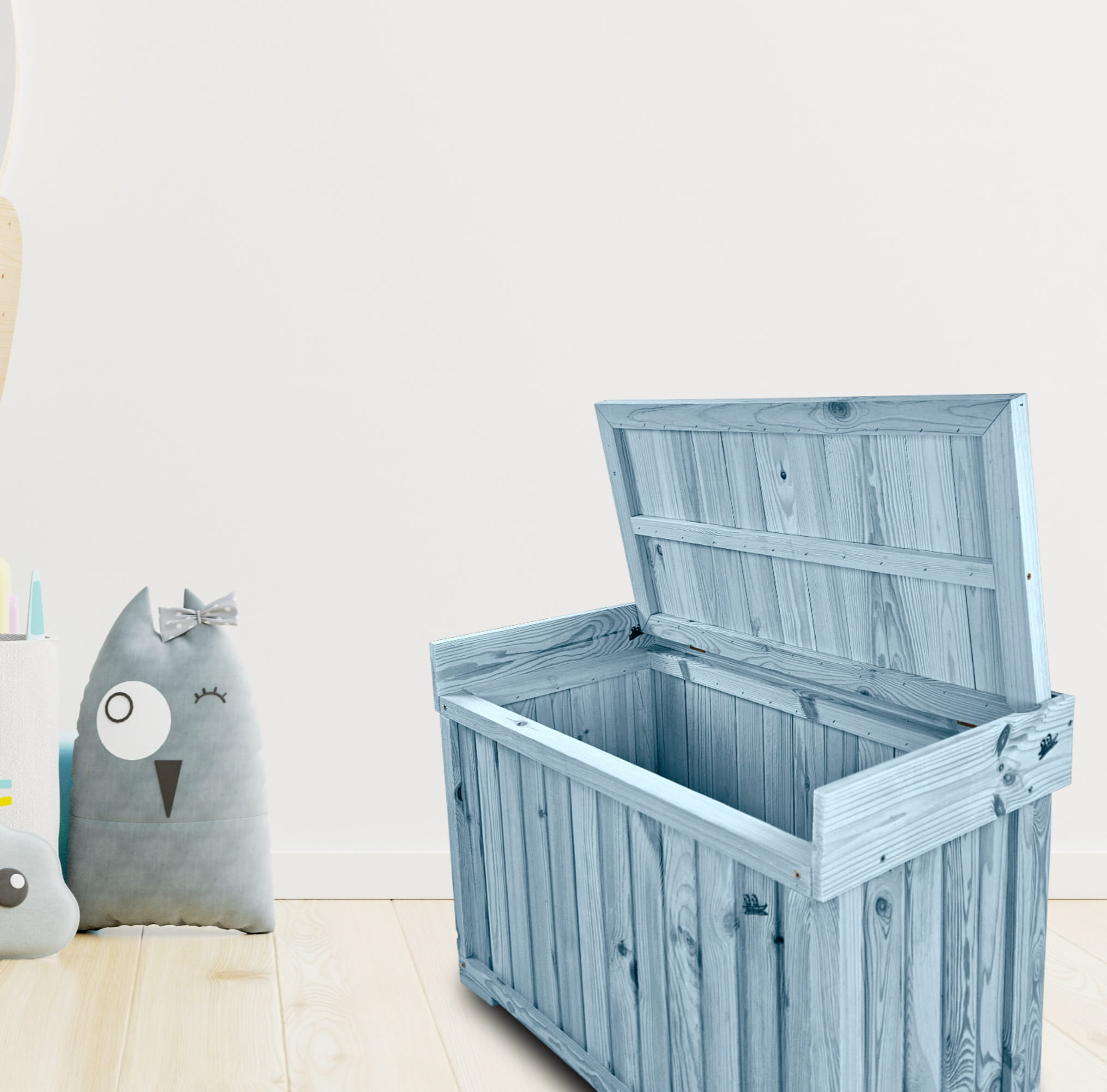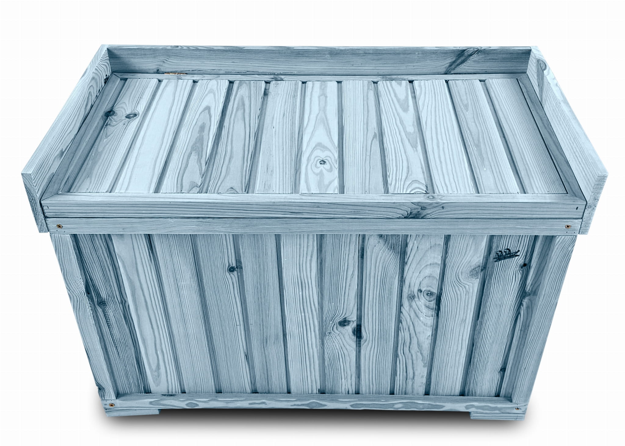 Kufer wykonany jest z solidnego drewna, co zapewnia trwałość oraz wyjątkowy wygląd. Produkt został pomalowany na elegancki kolor pastelowy niebieski, który wspaniale komponuje się z wnętrzami domów, tarasami oraz ogrodami.