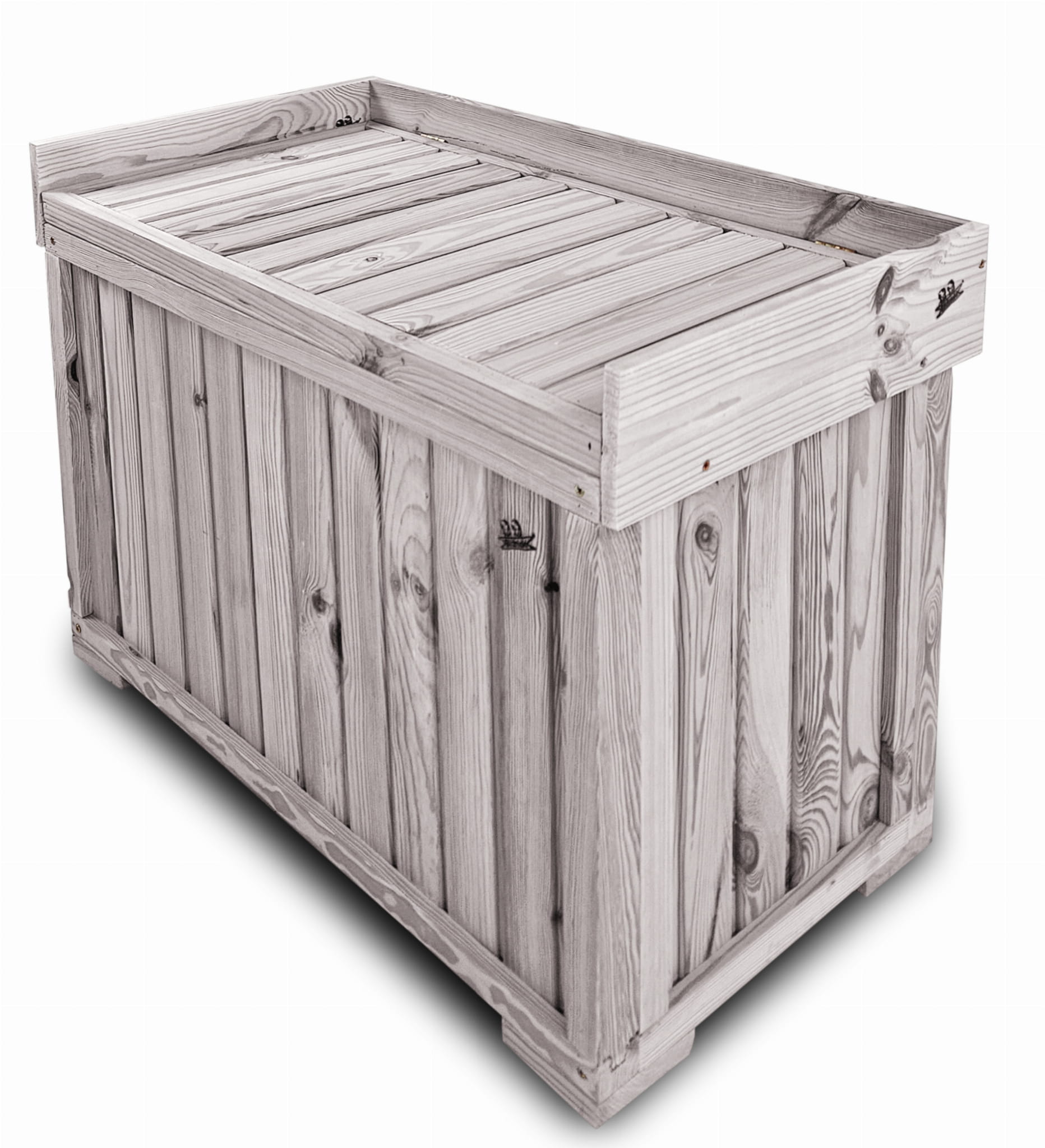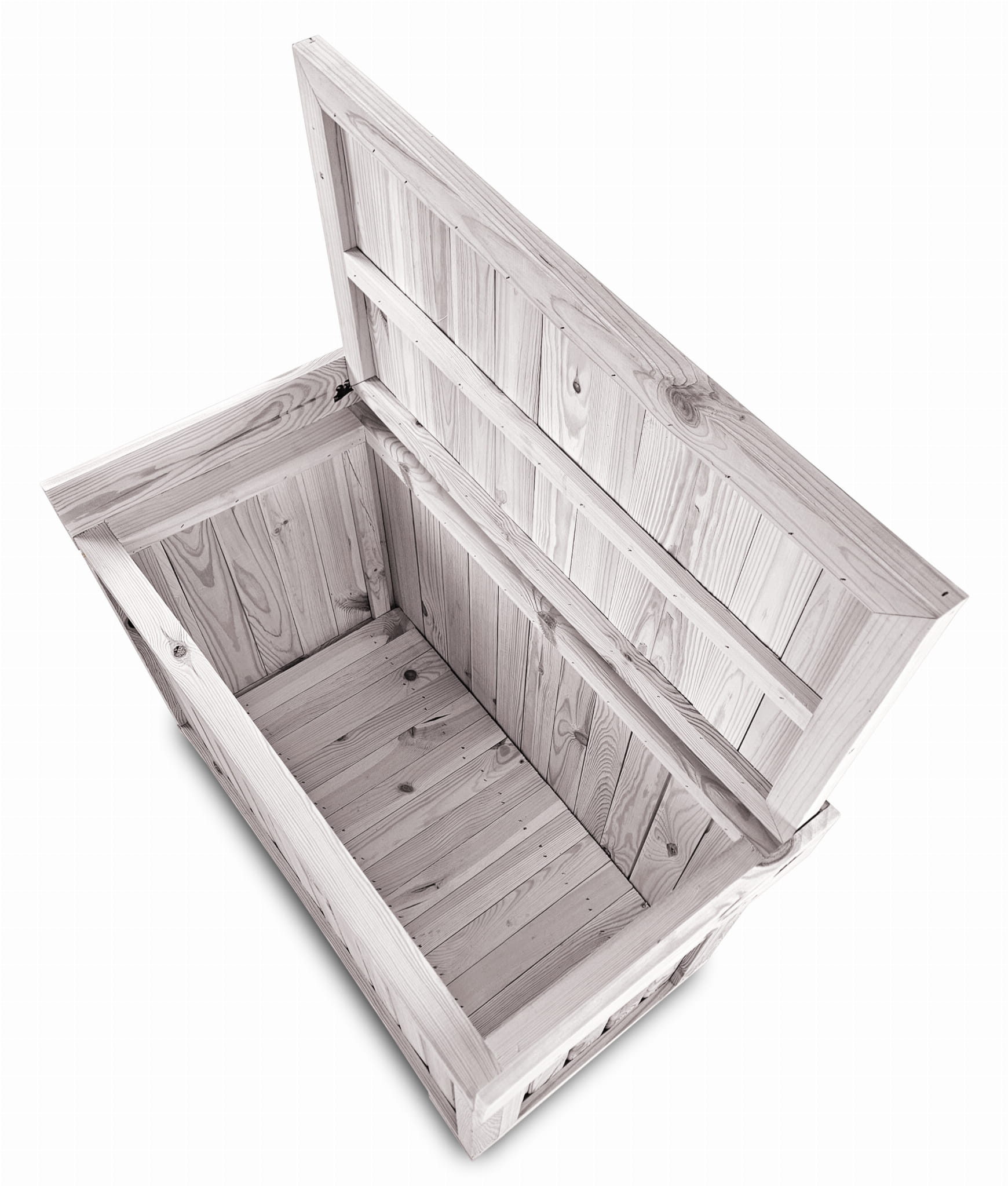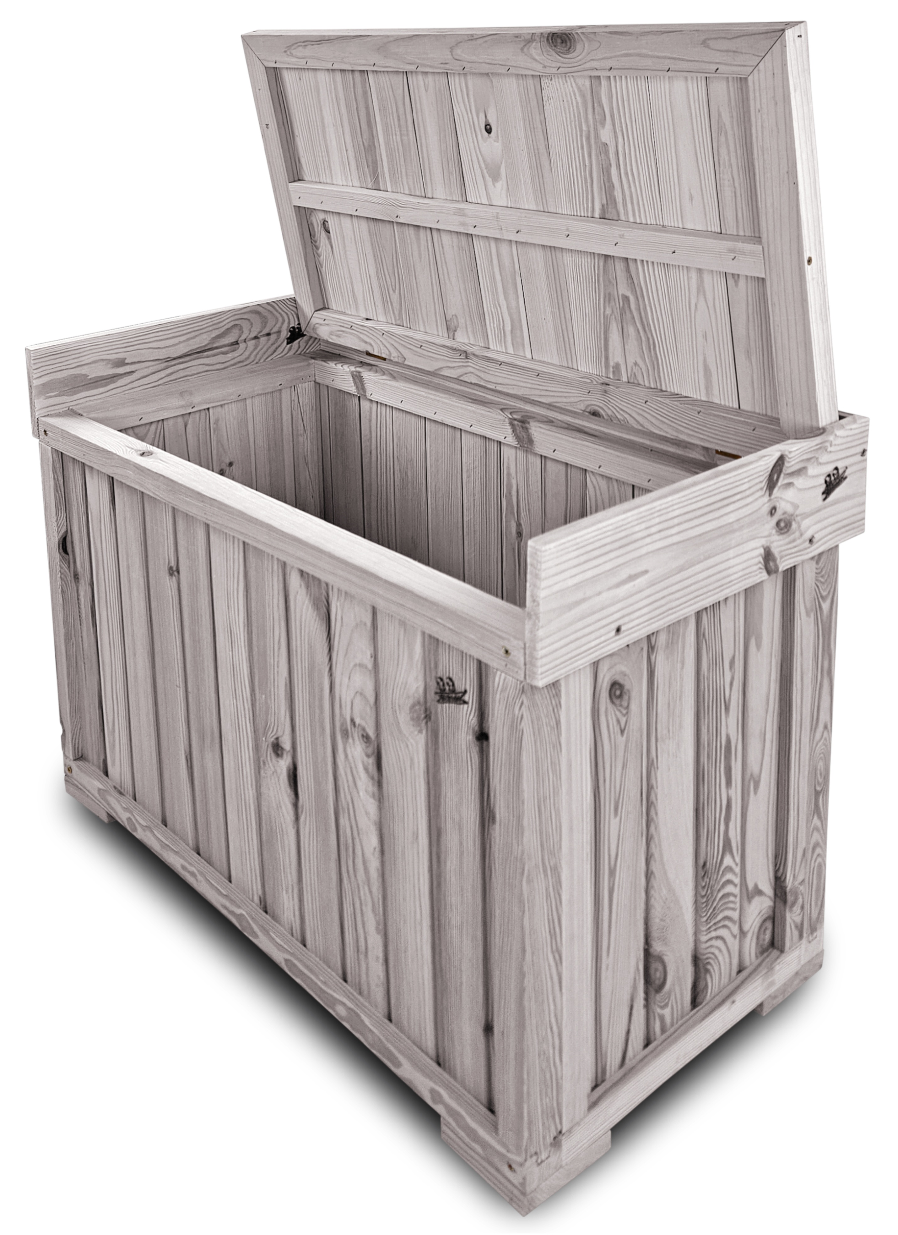 Kufer wykonany jest z solidnego drewna, co zapewnia trwałość oraz wyjątkowy wygląd. Produkt został pomalowany na elegancki kolor pastelowy szary, który wspaniale komponuje się z wnętrzami domów, tarasami oraz ogrodami.