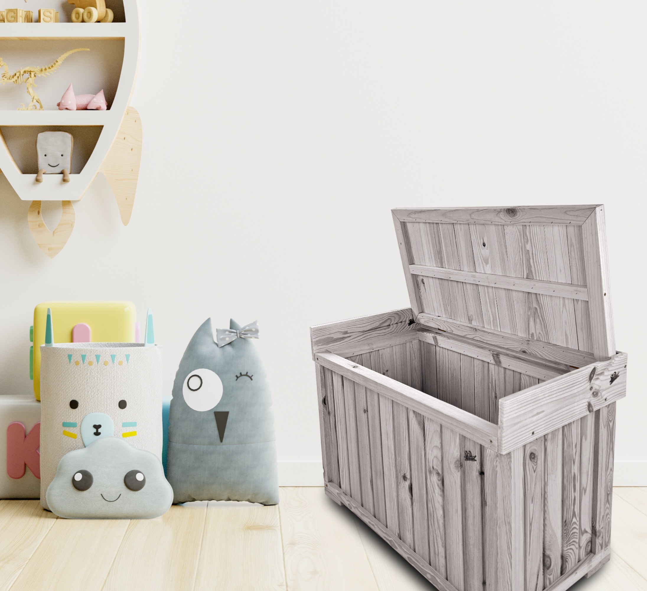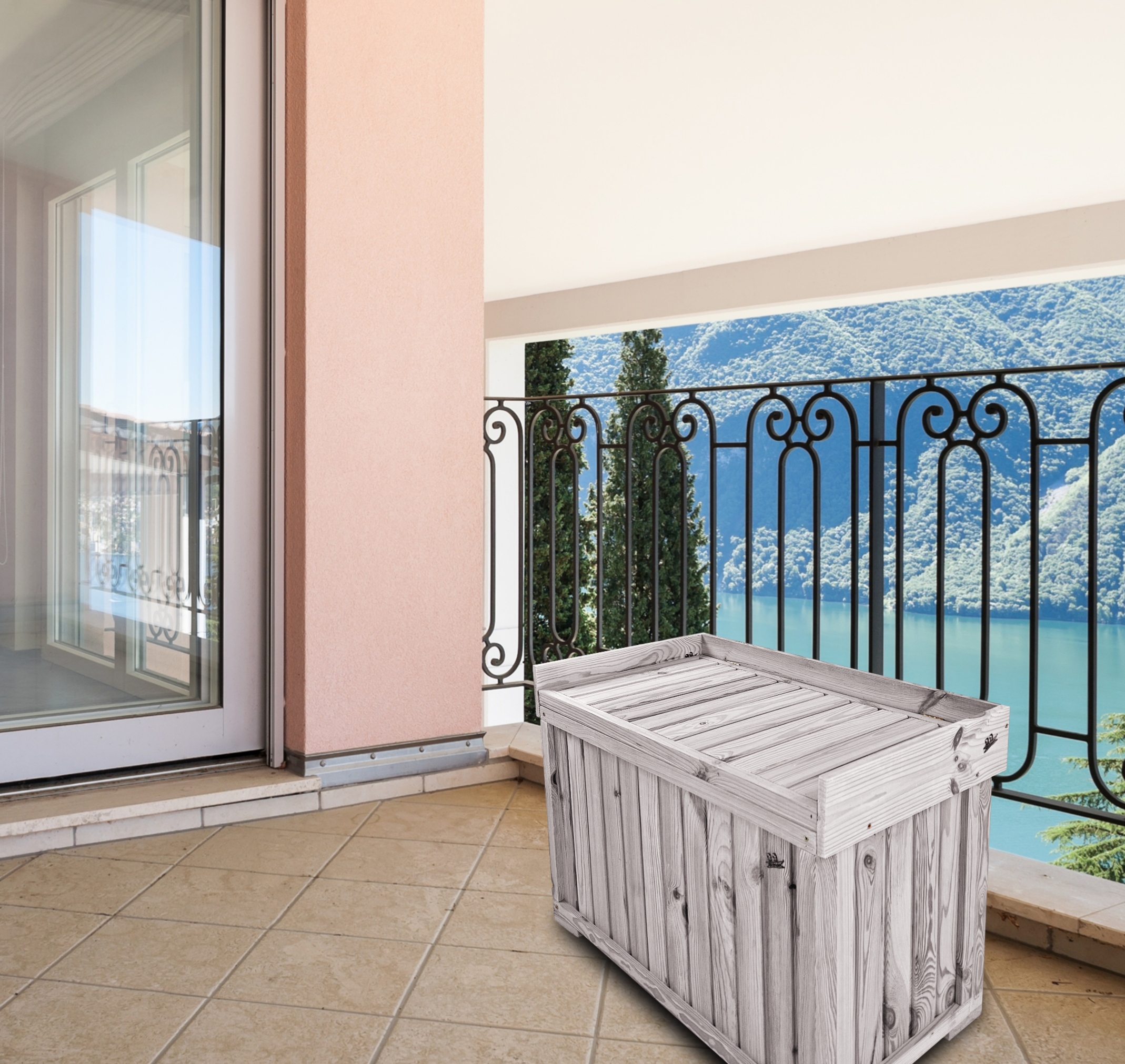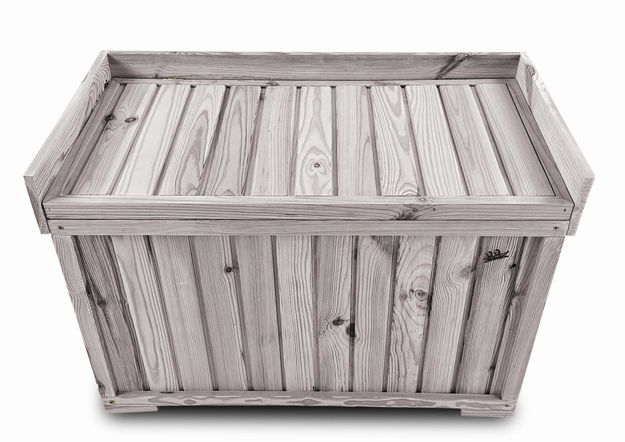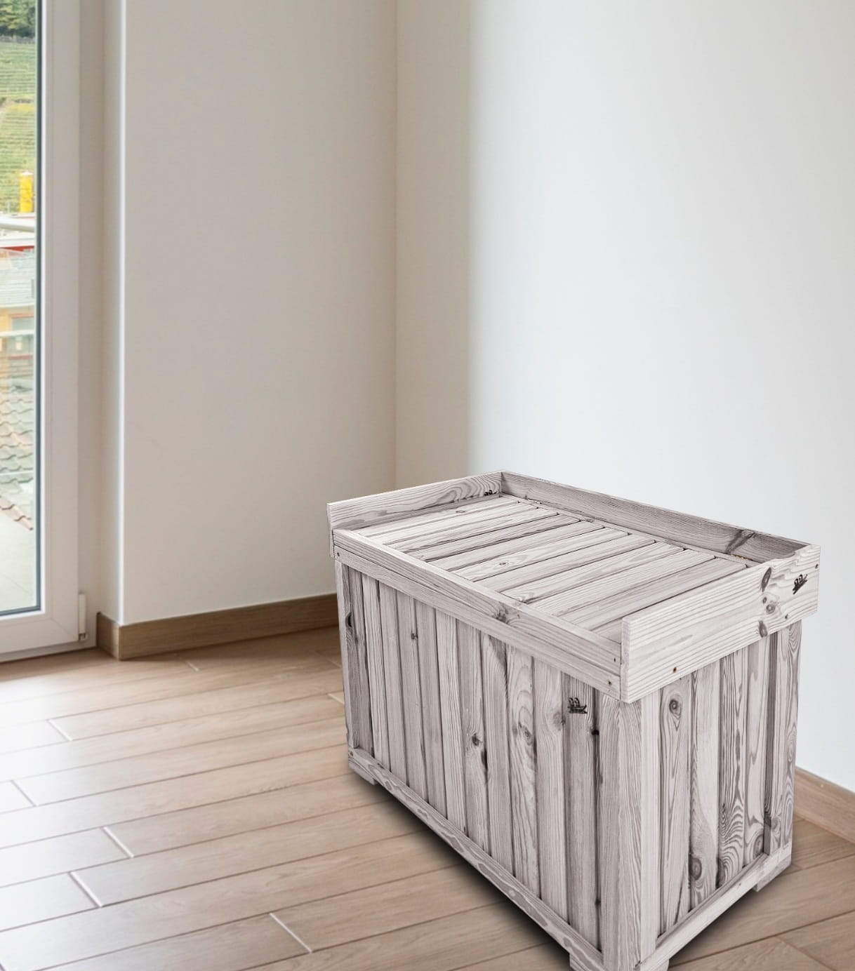 Kufer wykonany jest z solidnego drewna, co zapewnia trwałość oraz wyjątkowy wygląd. Produkt został pomalowany na elegancki kolor pastelowy szary, który wspaniale komponuje się z wnętrzami domów, tarasami oraz ogrodami.