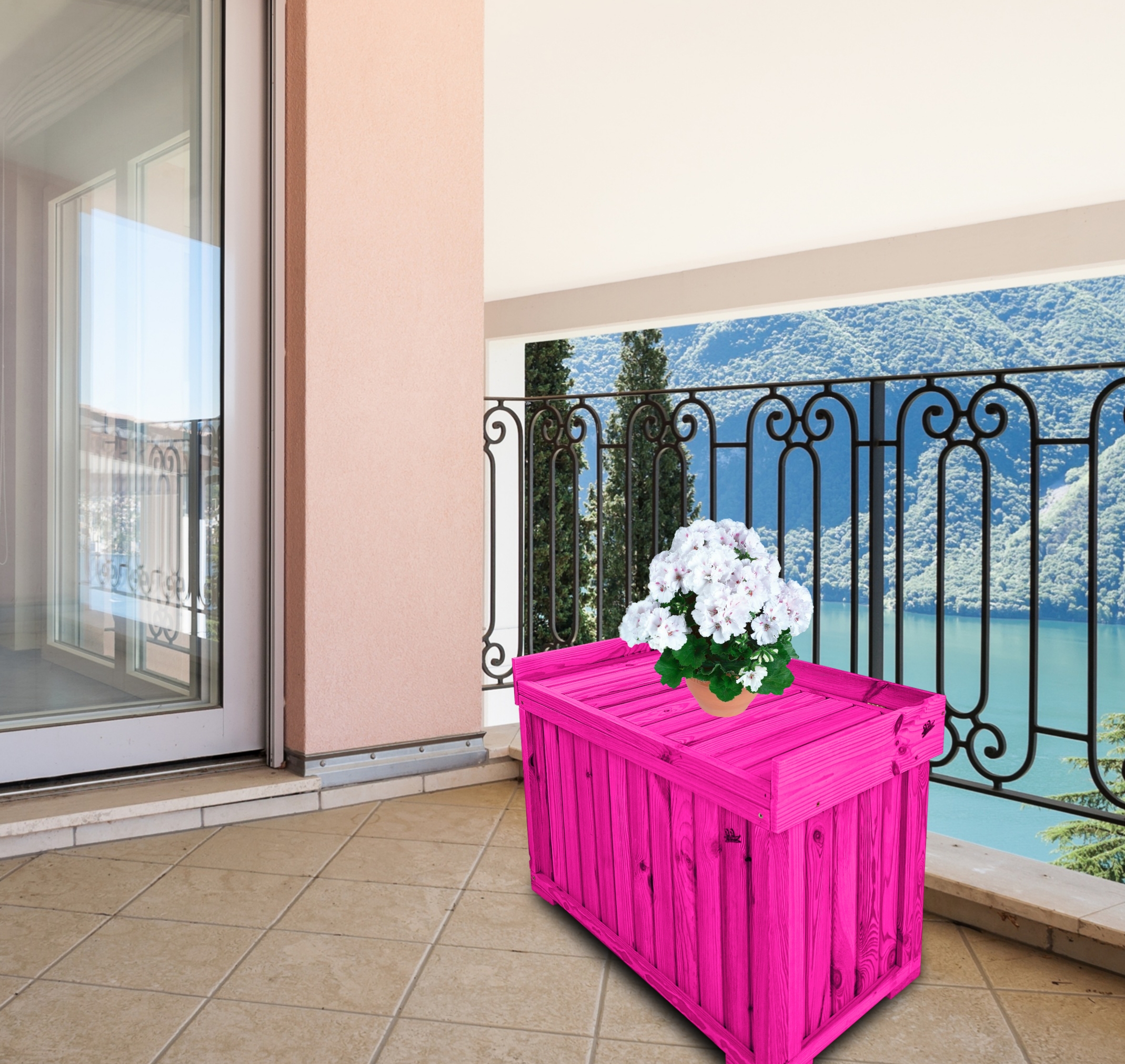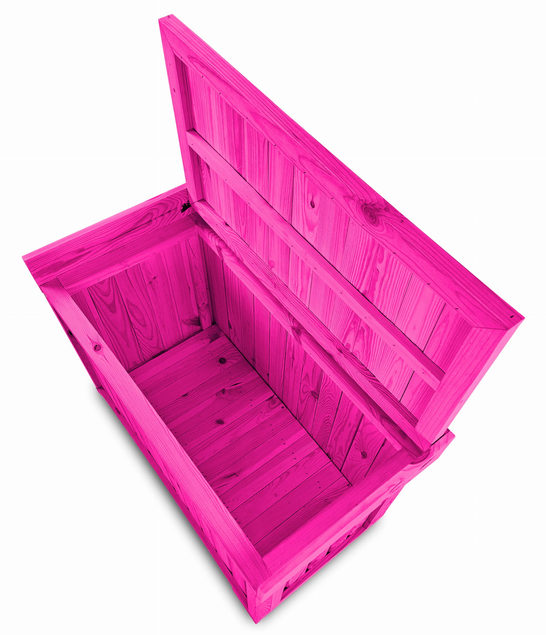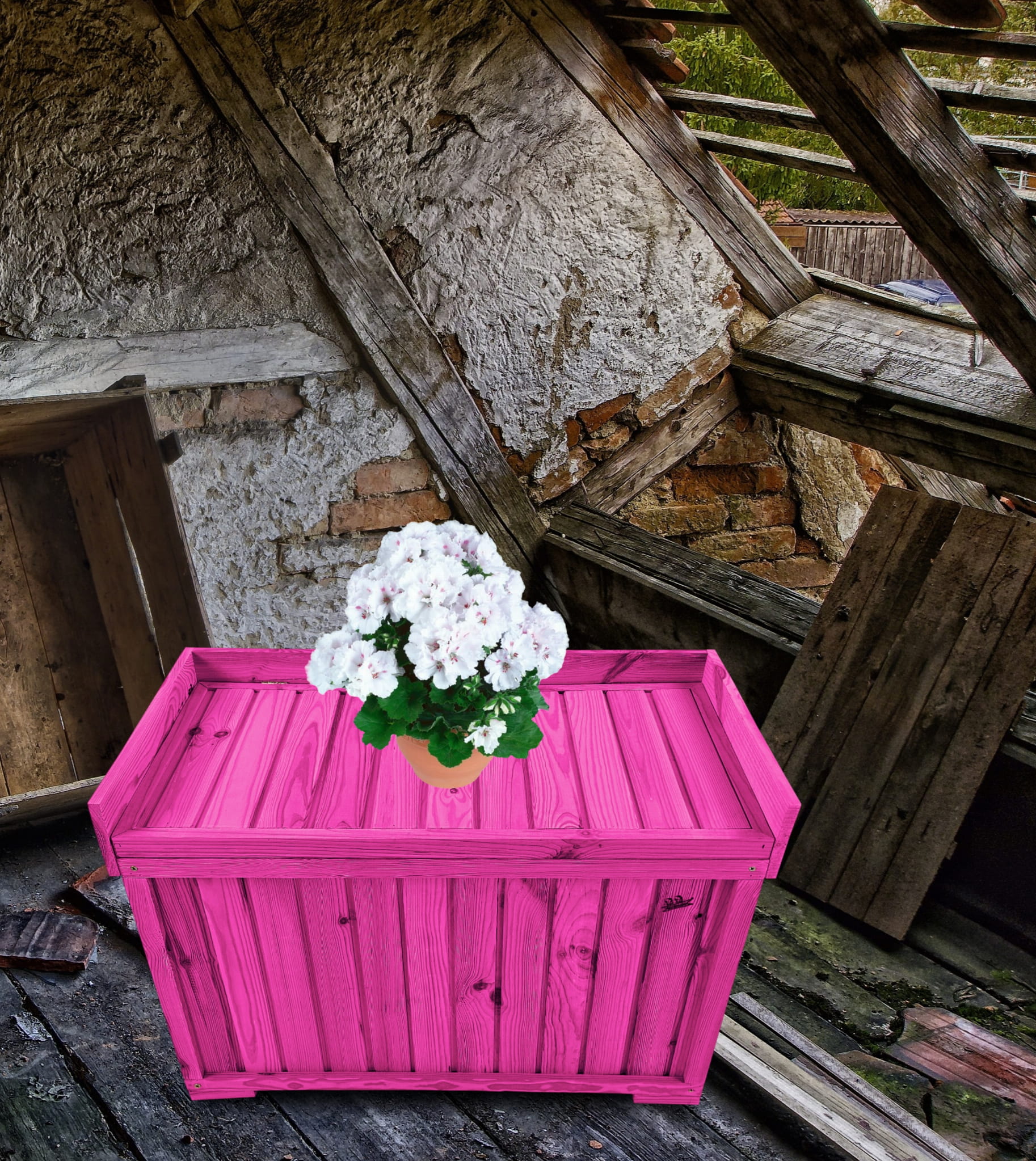 Kufer wykonany jest z solidnego drewna, co zapewnia trwałość oraz wyjątkowy wygląd. Produkt został pomalowany na elegancki kolor różowy, który wspaniale komponuje się z wnętrzami domów, tarasami oraz ogrodami.