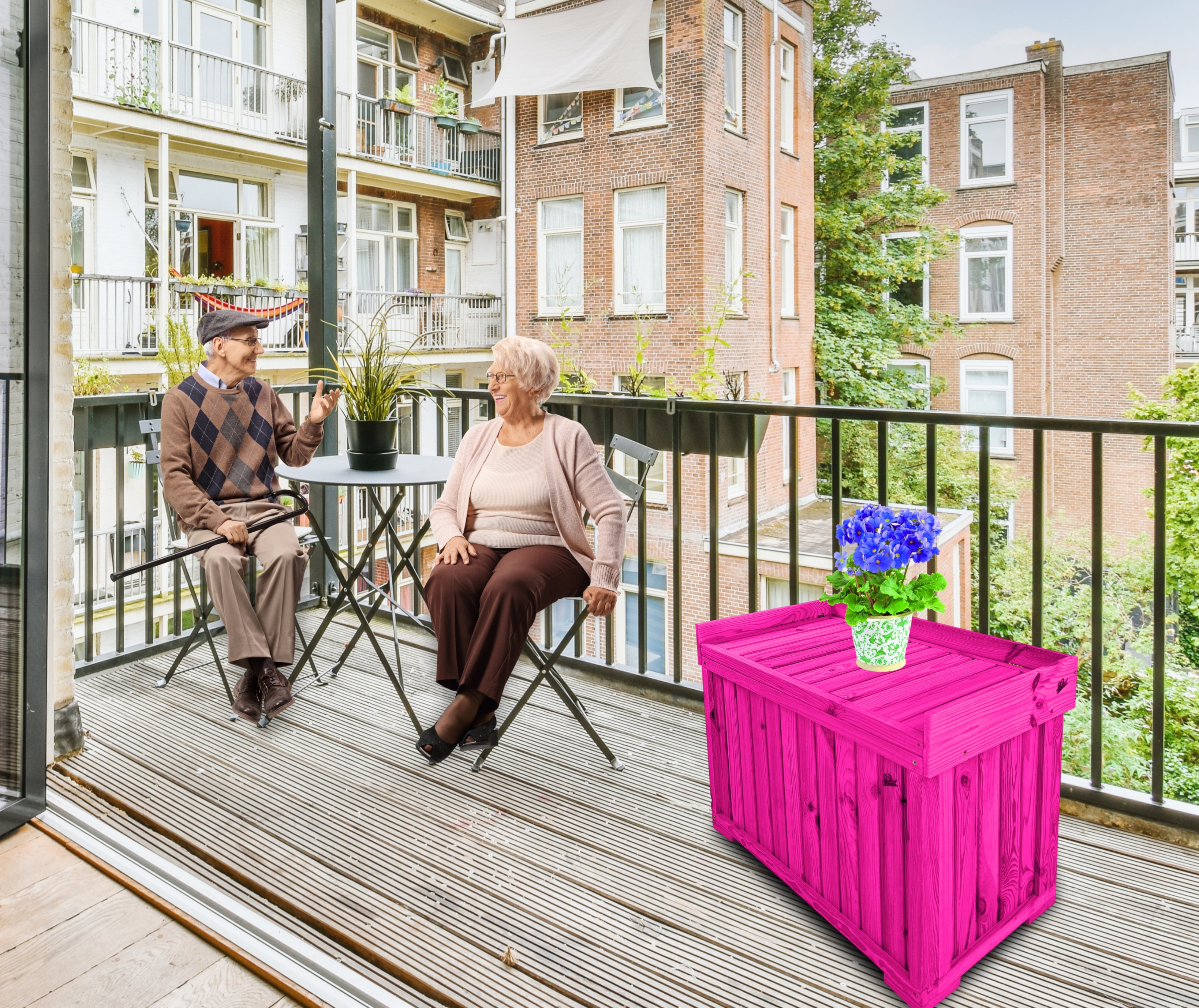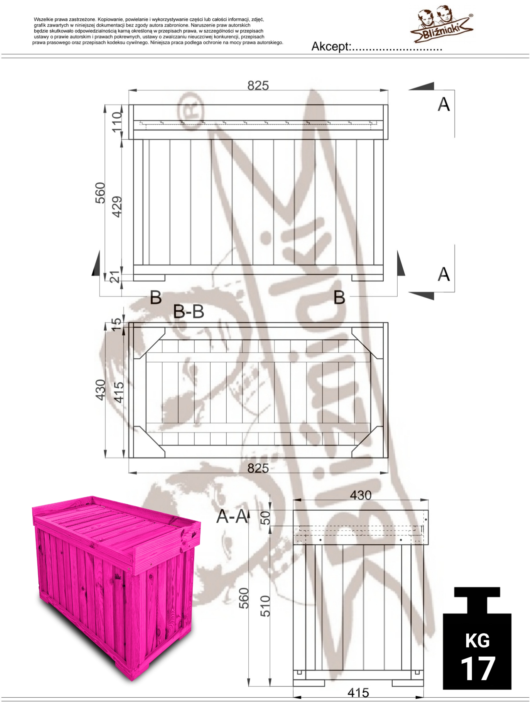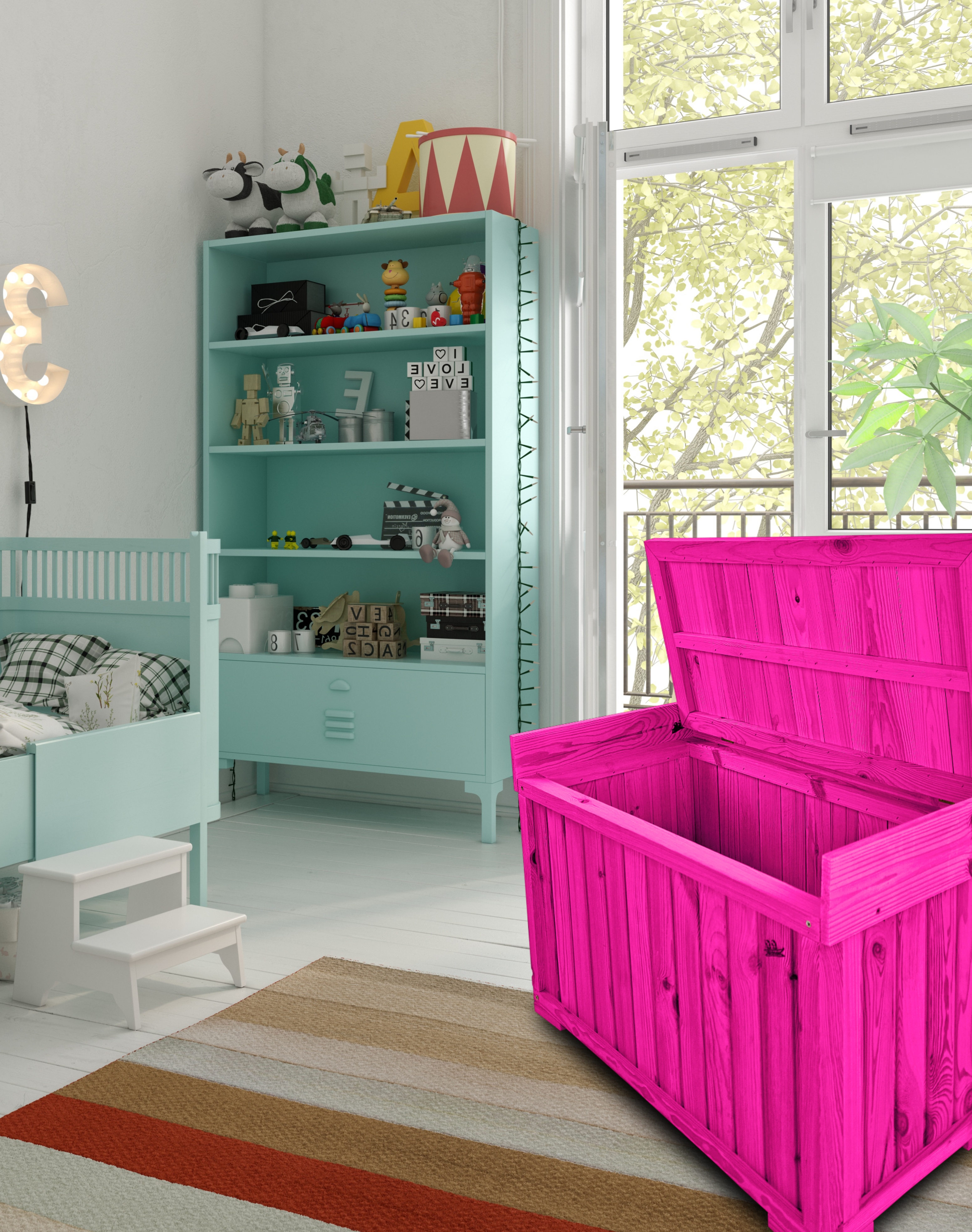 Kufer wykonany jest z solidnego drewna, co zapewnia trwałość oraz wyjątkowy wygląd. Produkt został pomalowany na elegancki kolor różowy, który wspaniale komponuje się z wnętrzami domów, tarasami oraz ogrodami.