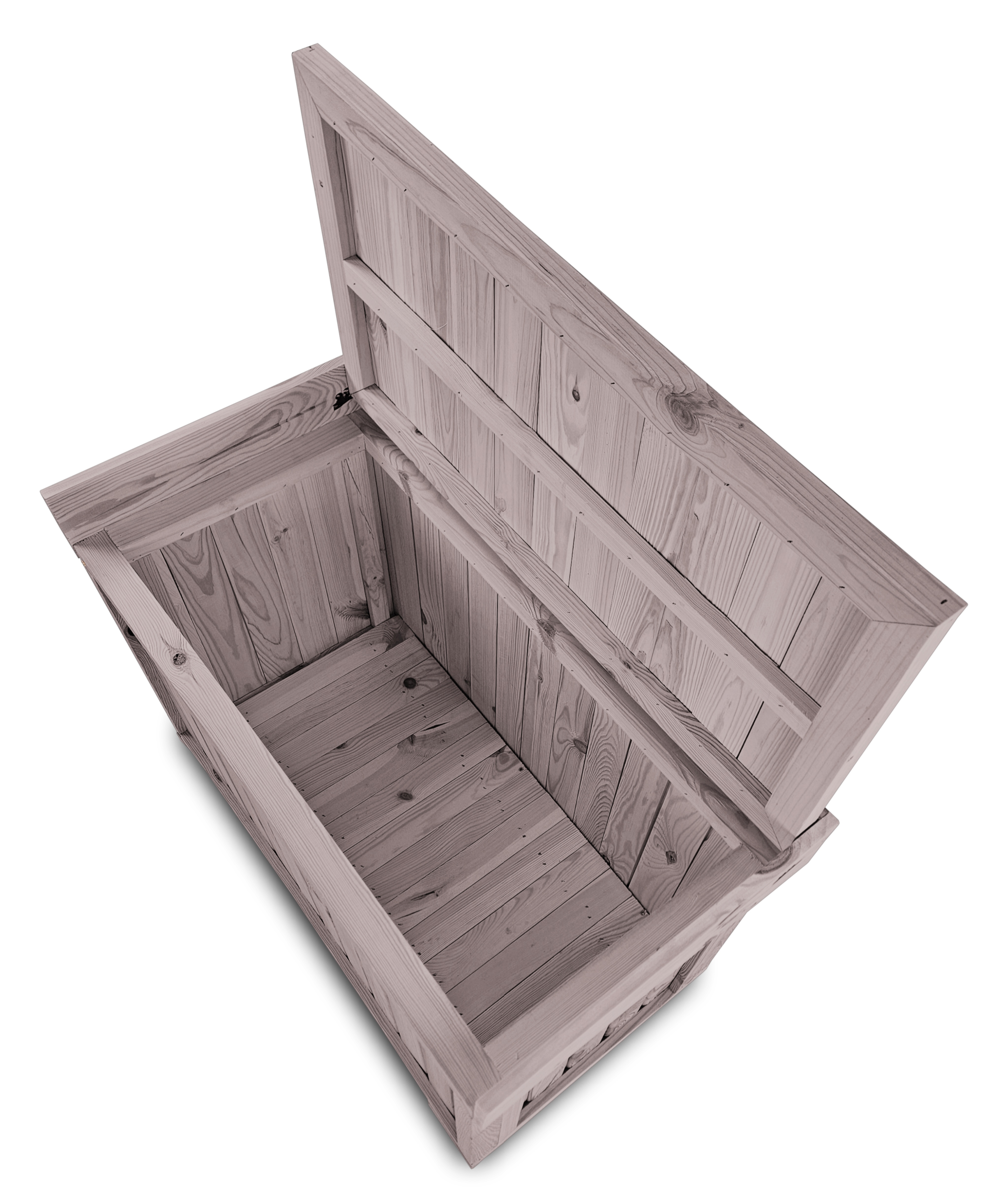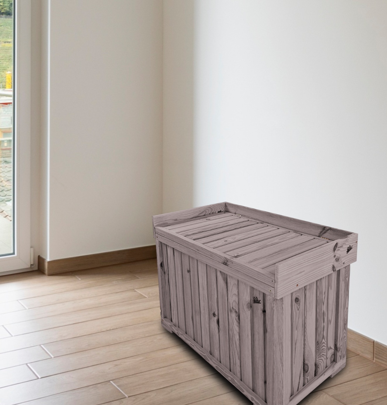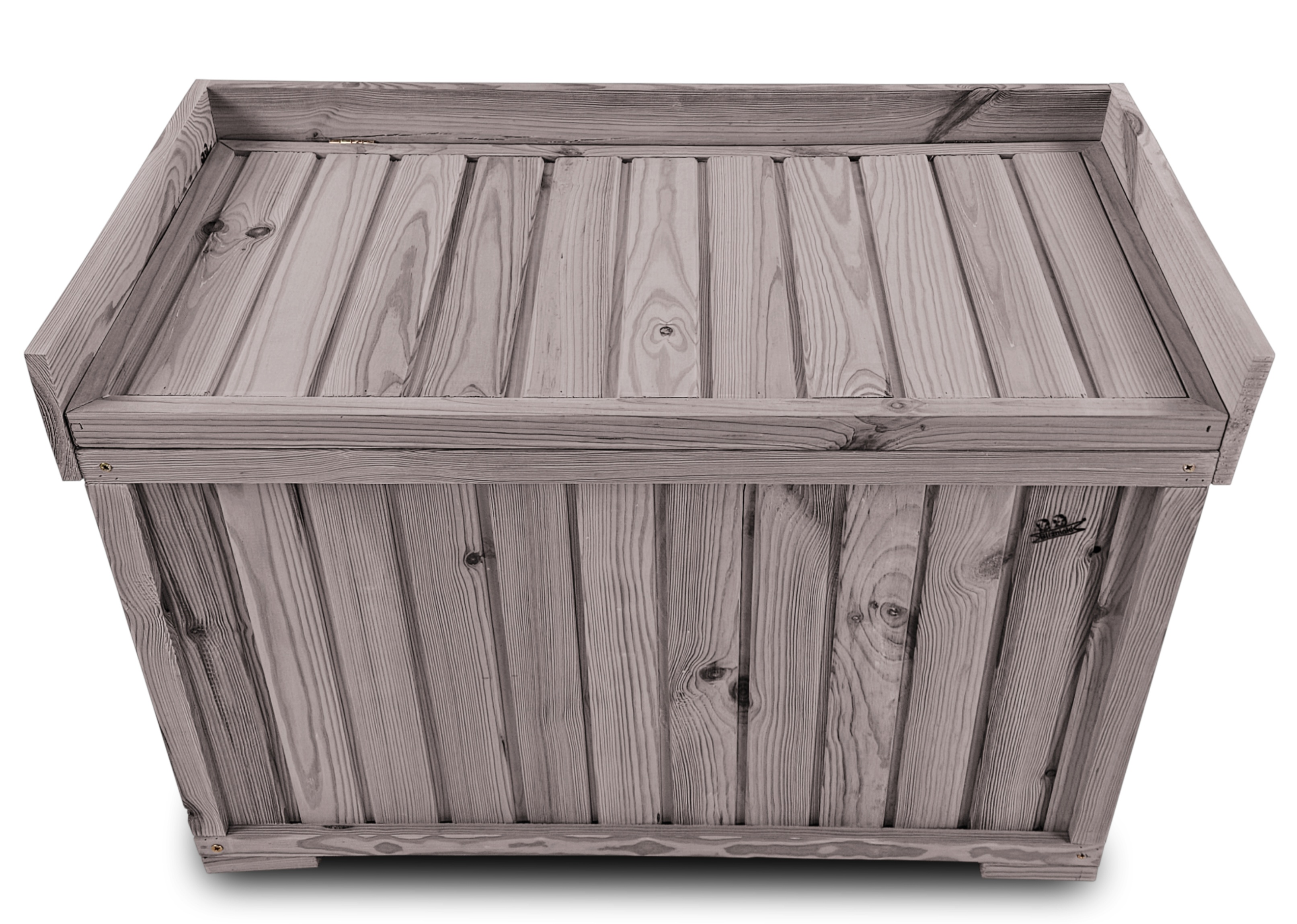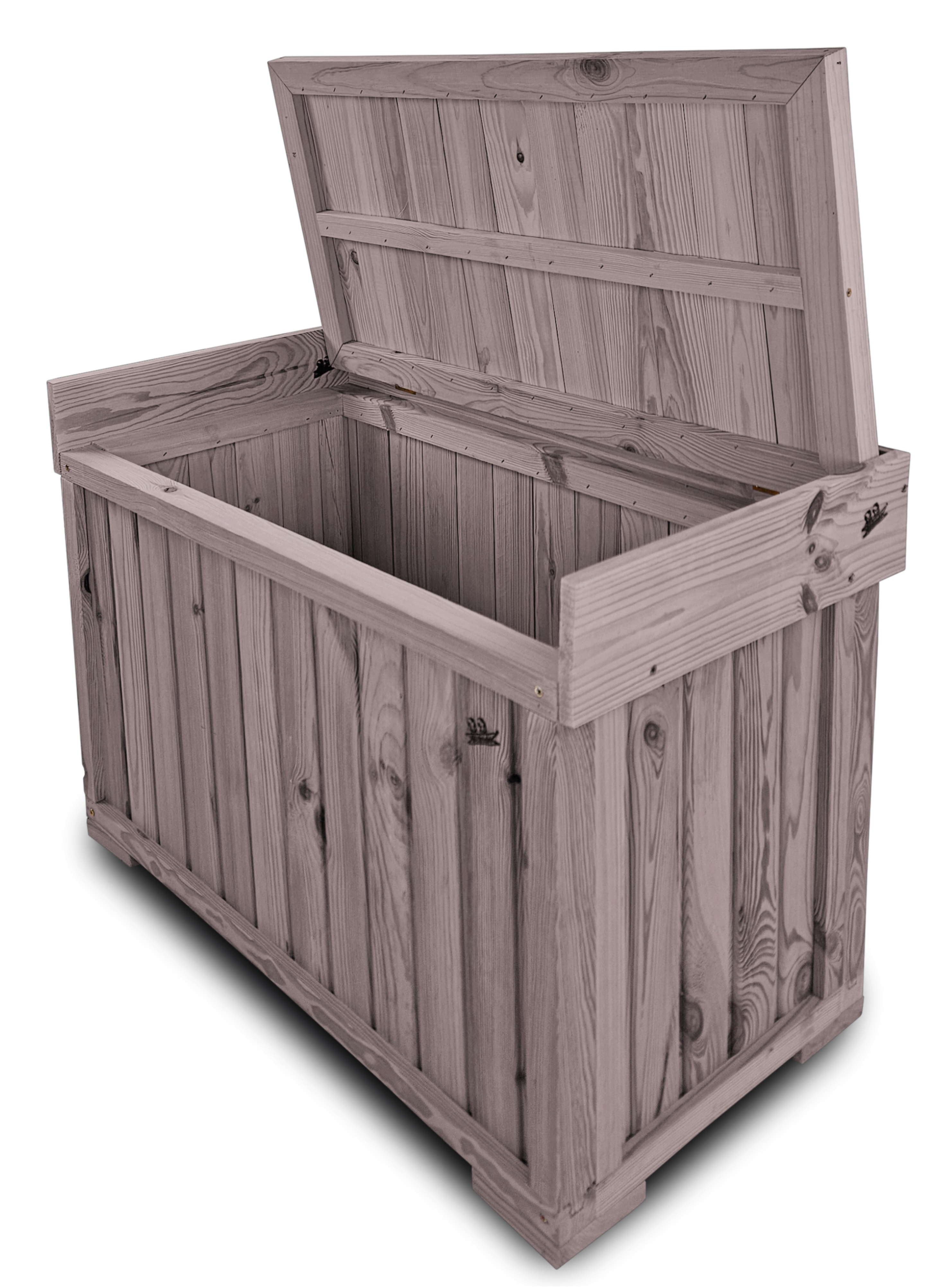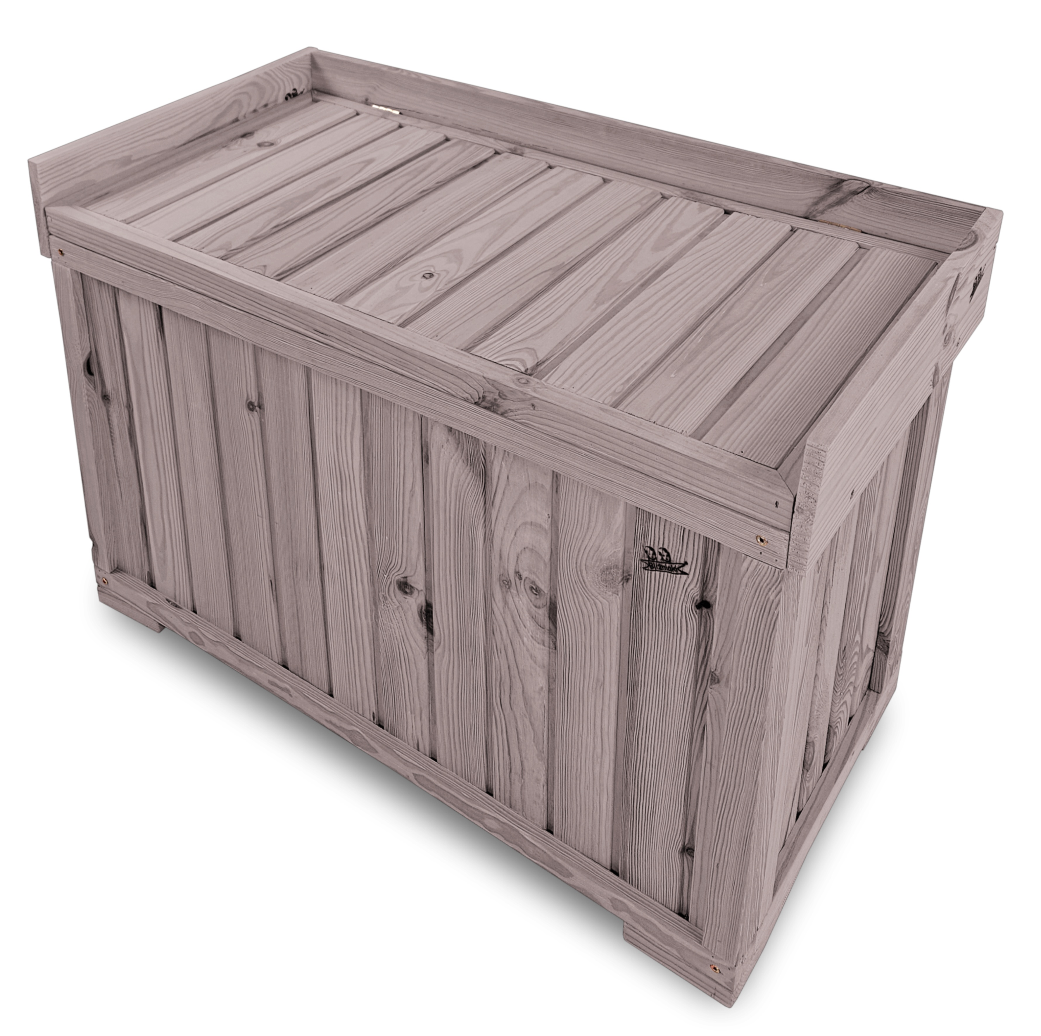 Kufer wykonany jest z solidnego drewna, co zapewnia trwałość oraz wyjątkowy wygląd. Produkt został pomalowany na elegancki kolor szary, który wspaniale komponuje się z wnętrzami domów, tarasami oraz ogrodami.