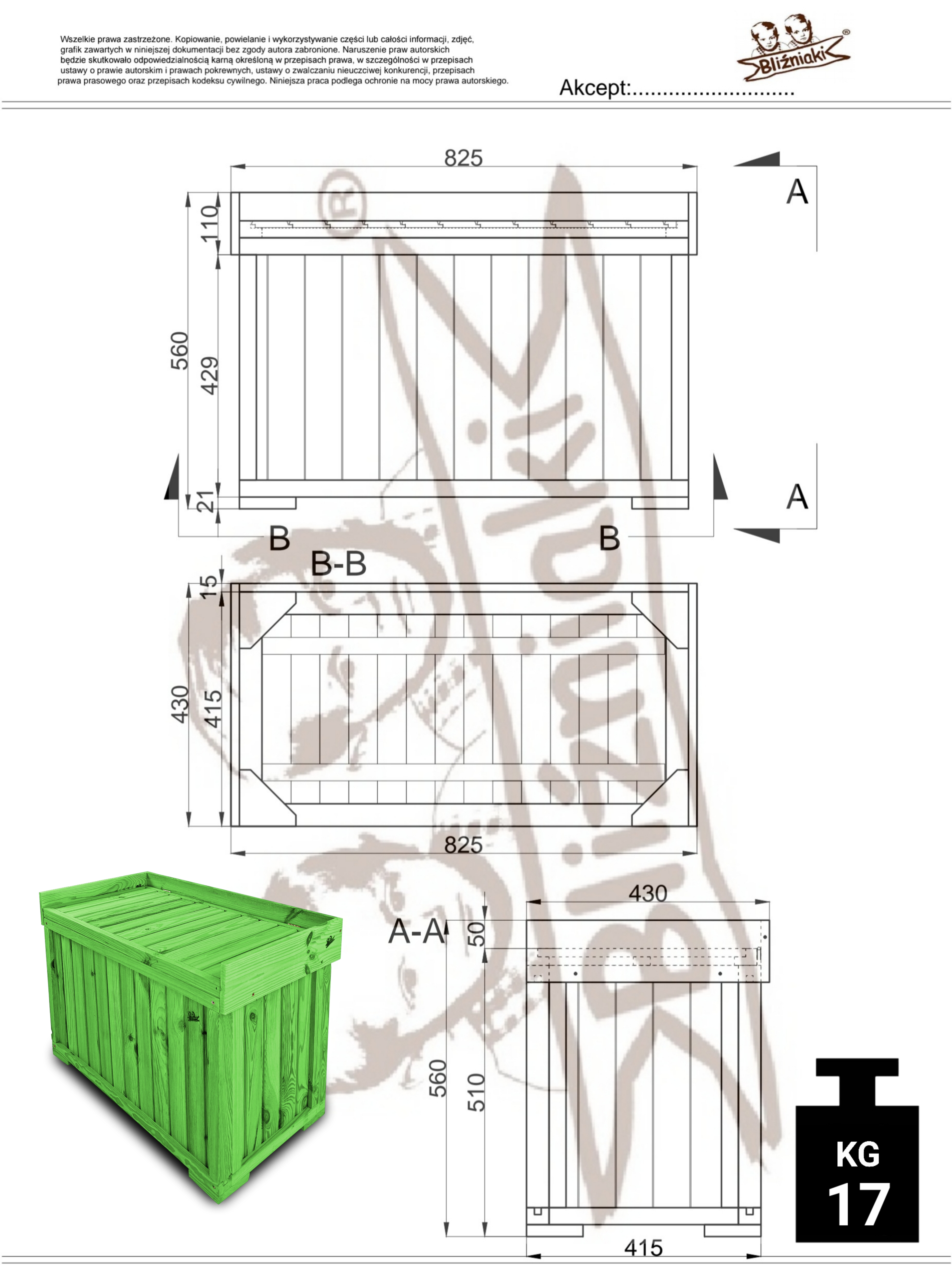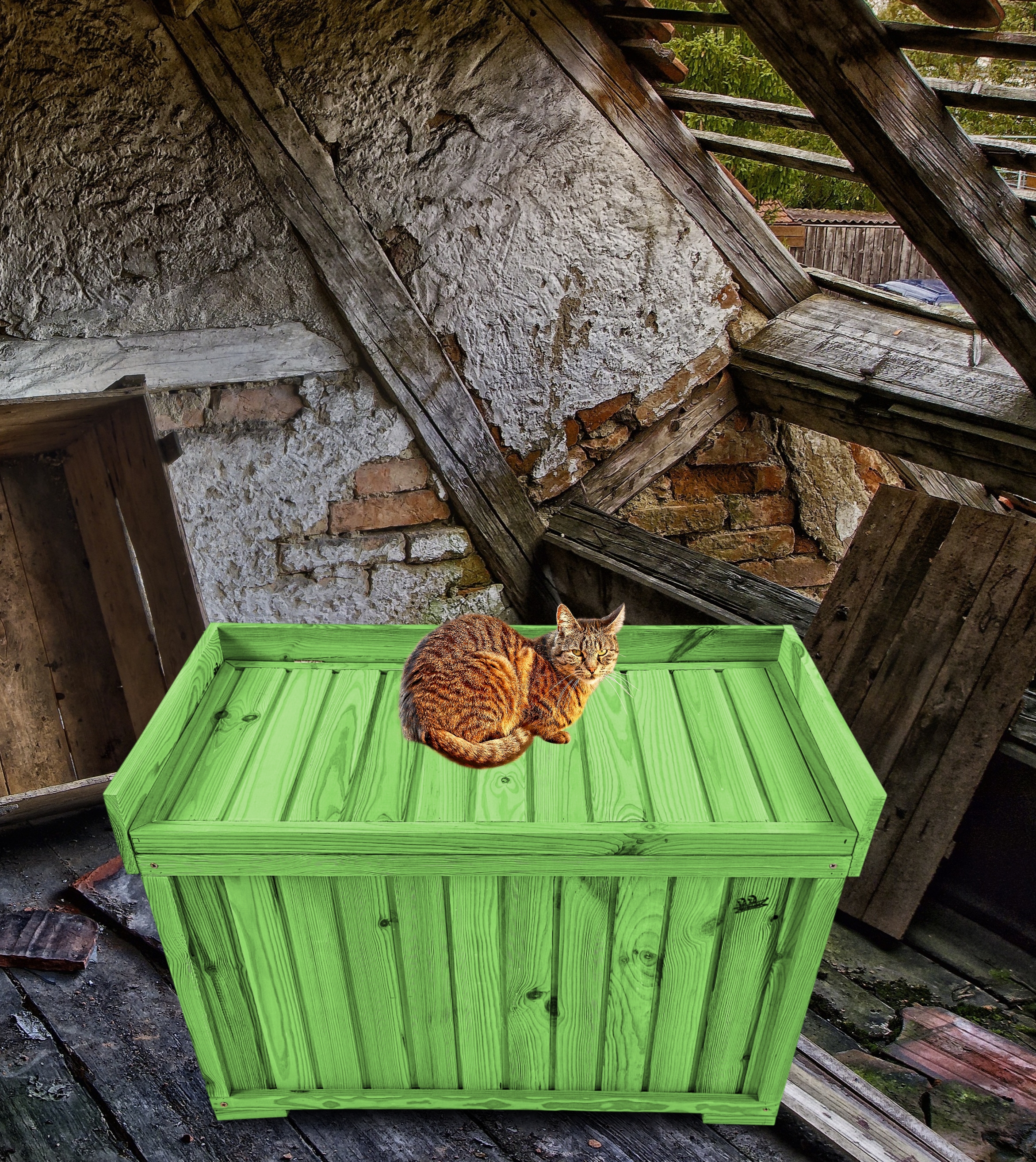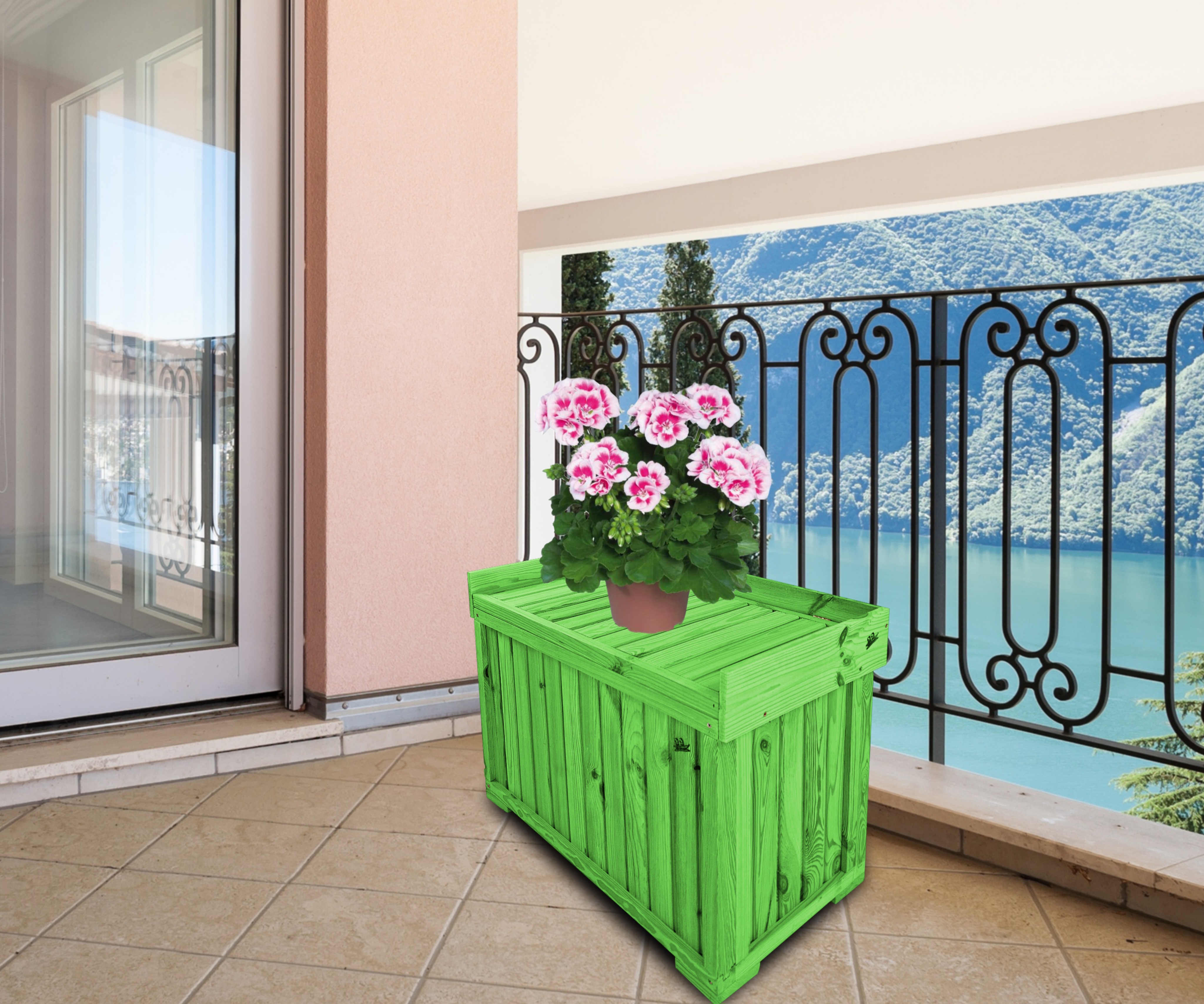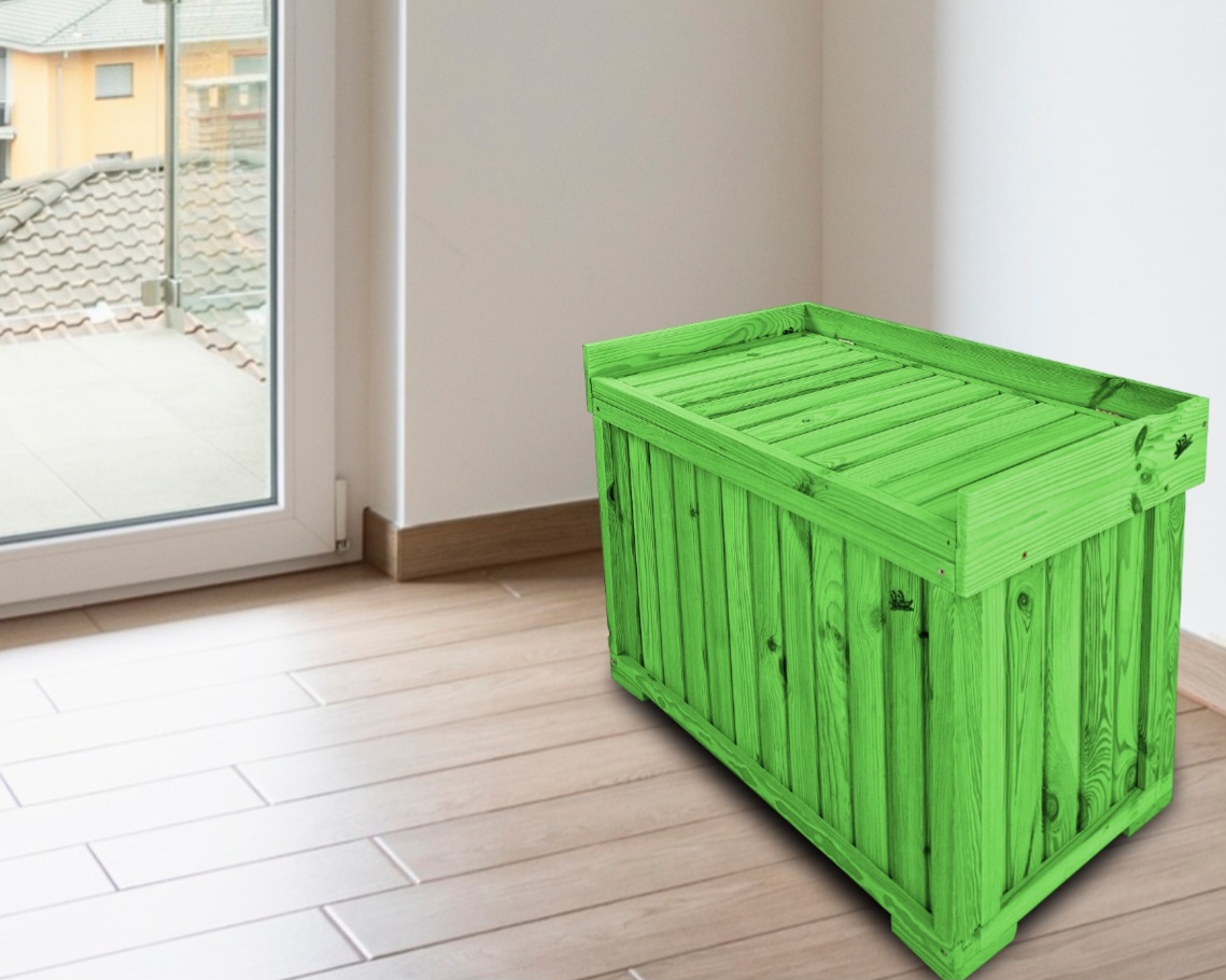 Kufer wykonany jest z solidnego drewna, co zapewnia trwałość oraz wyjątkowy wygląd. Produkt został pomalowany na elegancki kolor zielony, który wspaniale komponuje się z wnętrzami domów, tarasami oraz ogrodami.