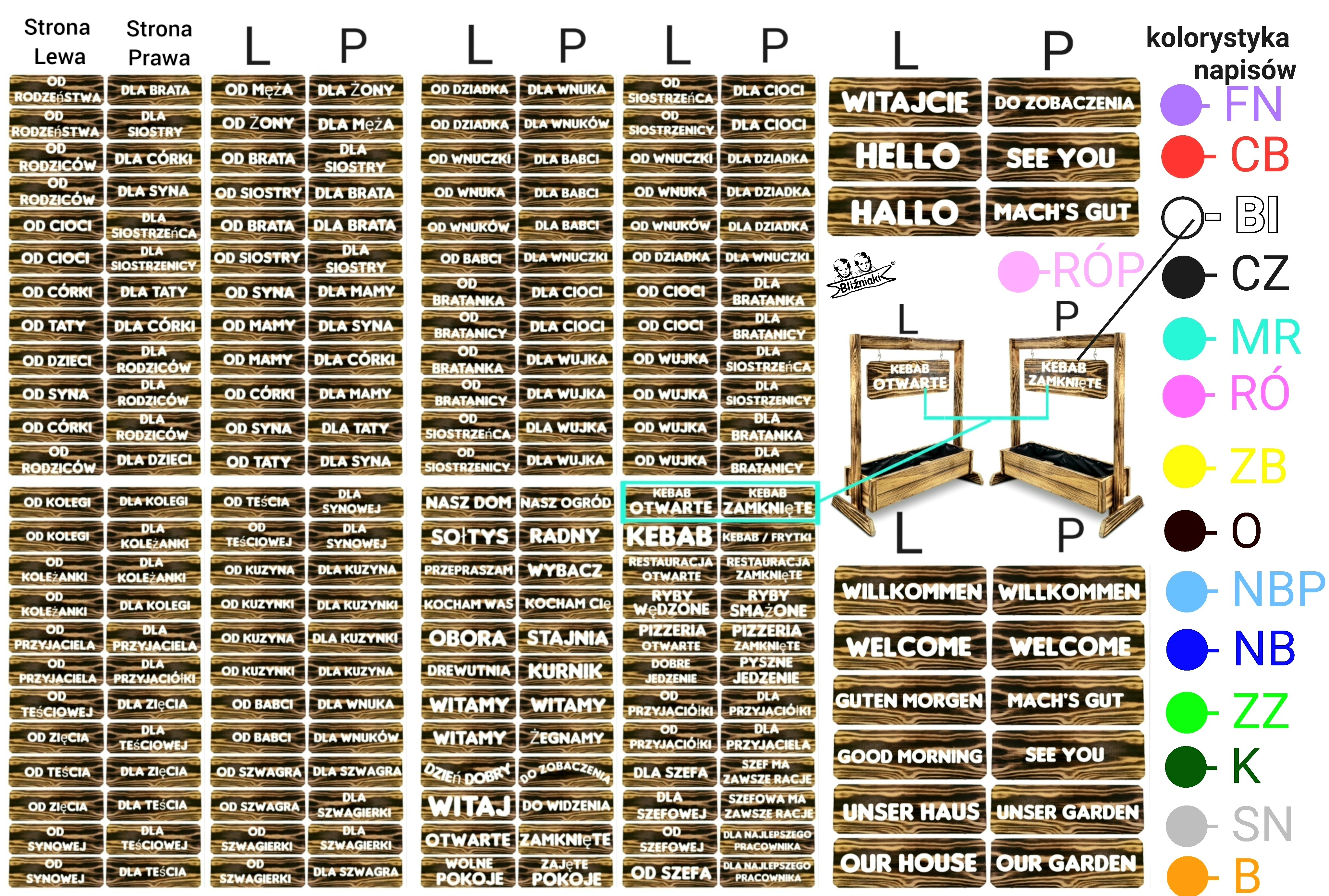 TABLICZKI SĄ PRAWO STRONNE I LEWO STRONNE MOŻNA JE ZAPISYWAĆ WEDŁUG CHARAKTERU PROWADZONEJ DZIAŁALNOŚC LUB CHĘCI OBDAROWANIA BLISKIEJ OSOBY OD DZIECI DLA RODZICÓW OD CÓRKI DLA MAMY ,KEBAB OTWARTE -KEBAB ZAMKNIĘTE , RYBY WĘDZONE RYBY SMAŻONE ,NASZ DOM-NASZ OGRÓD , OD MĘŻA DLA ŻONY -OD ŻONY DLA MĘŻA