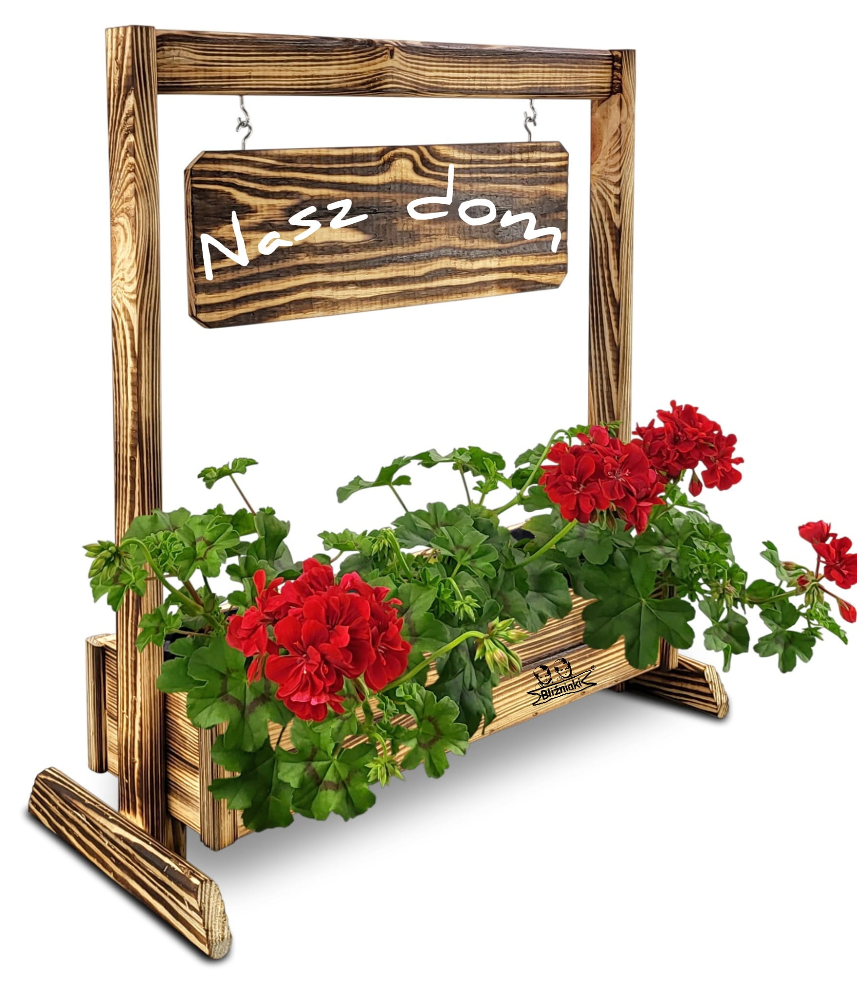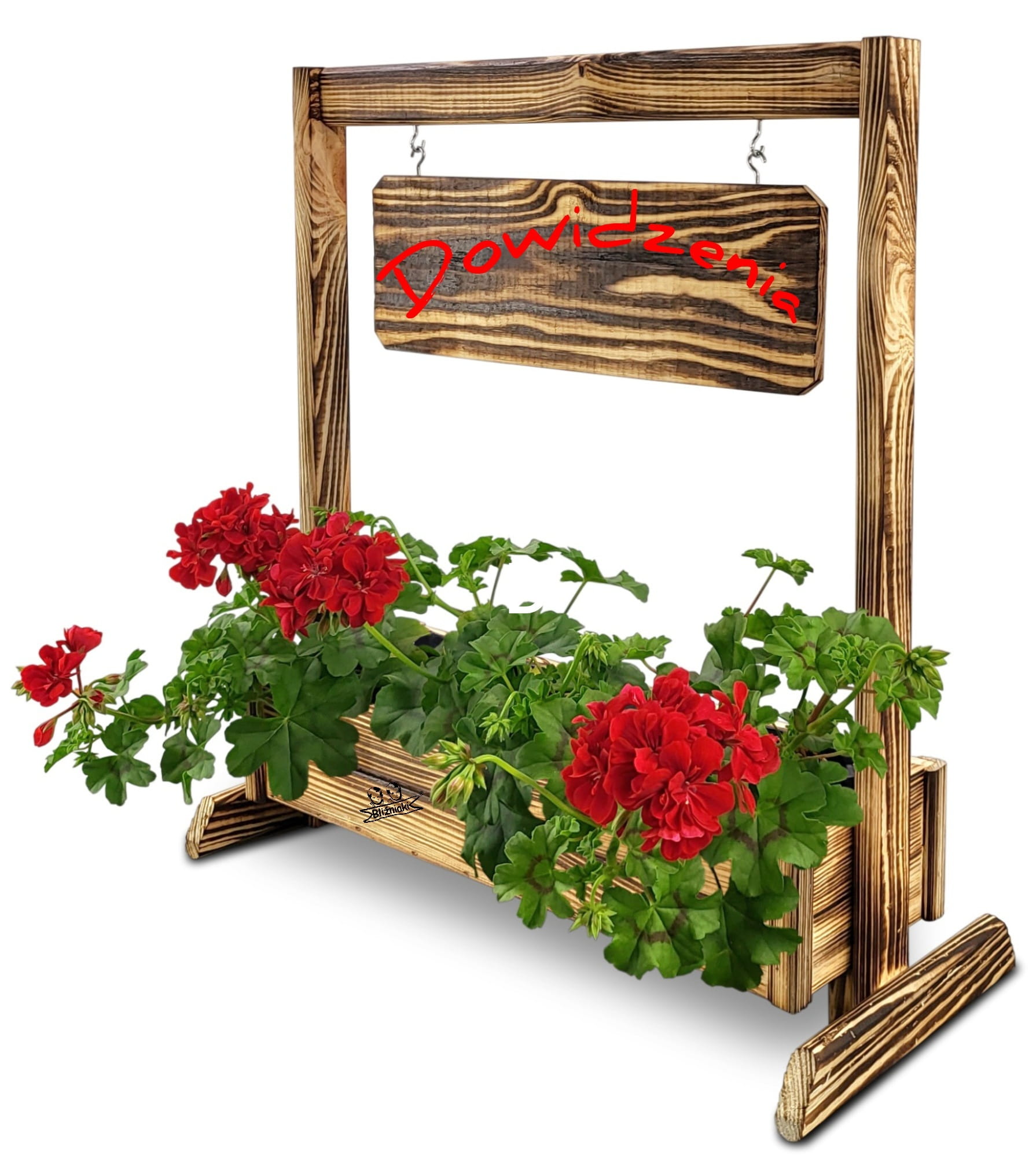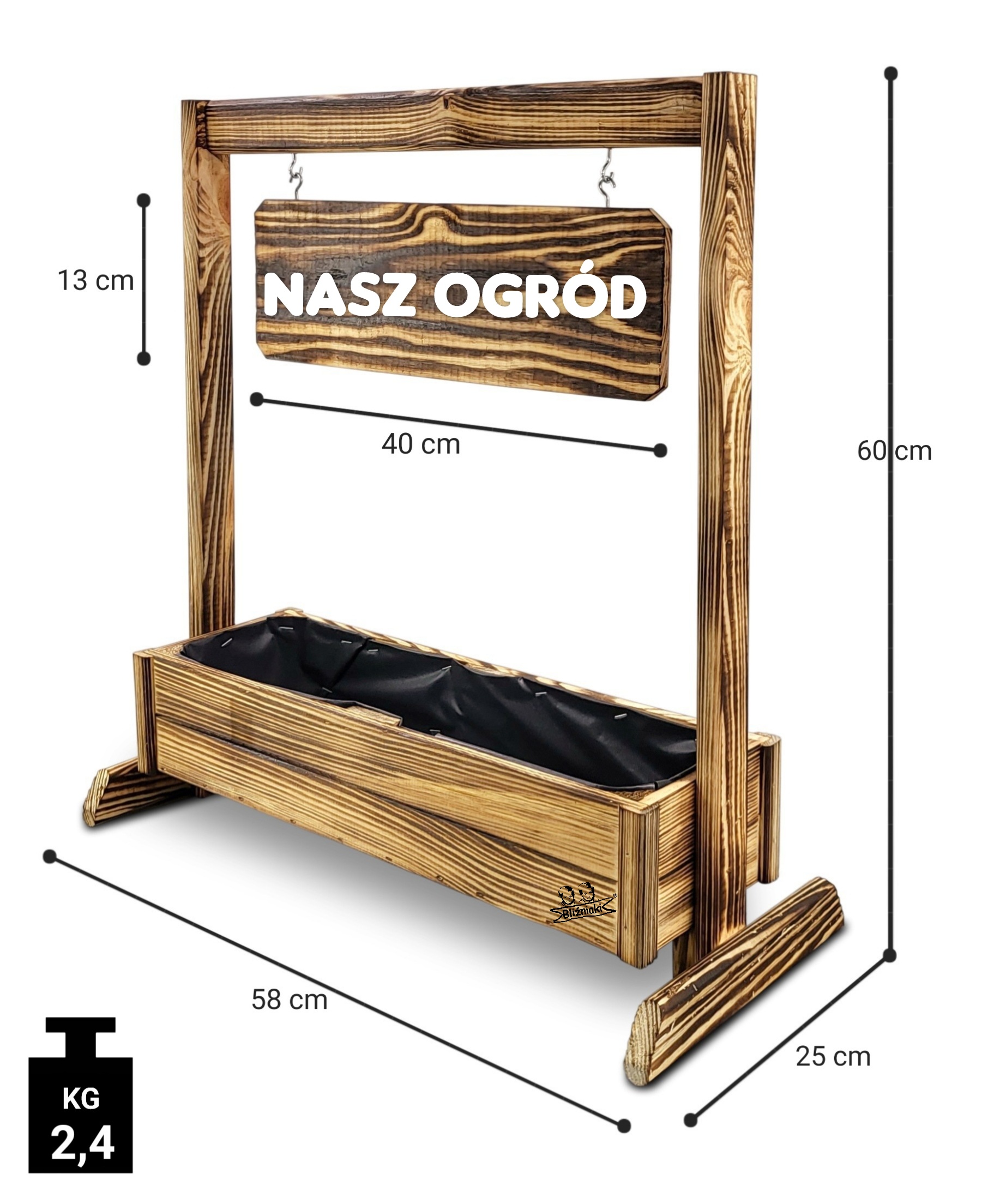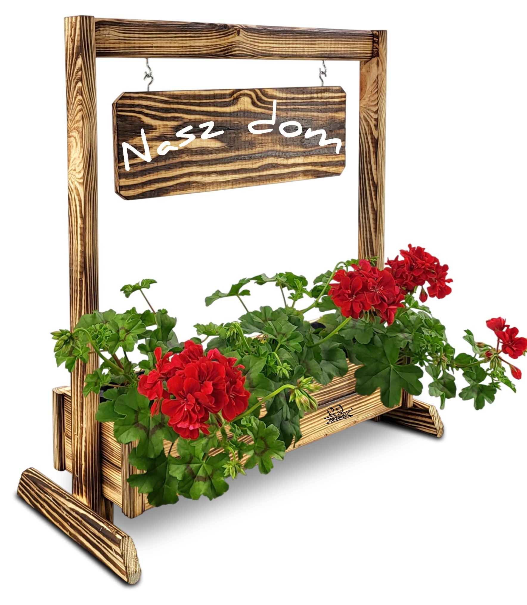 KWIETNIK TEXAS2 OPAL wykonany jest w całości z drewna. Składa się z doniczki na kwiaty, stojaka oraz zawieszanej poziomej tabliczki, która posiada gotowy napis .