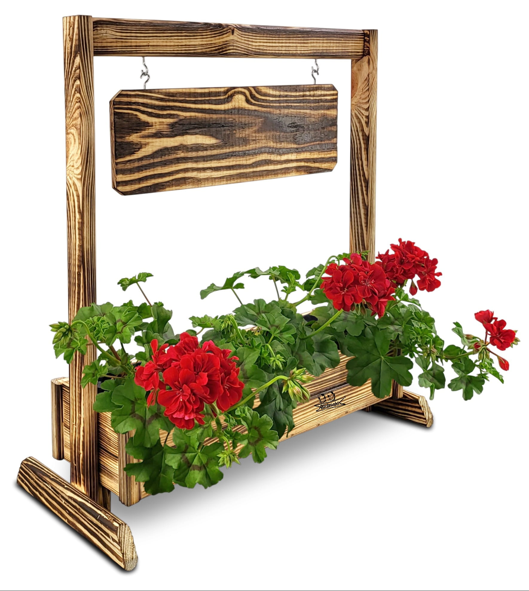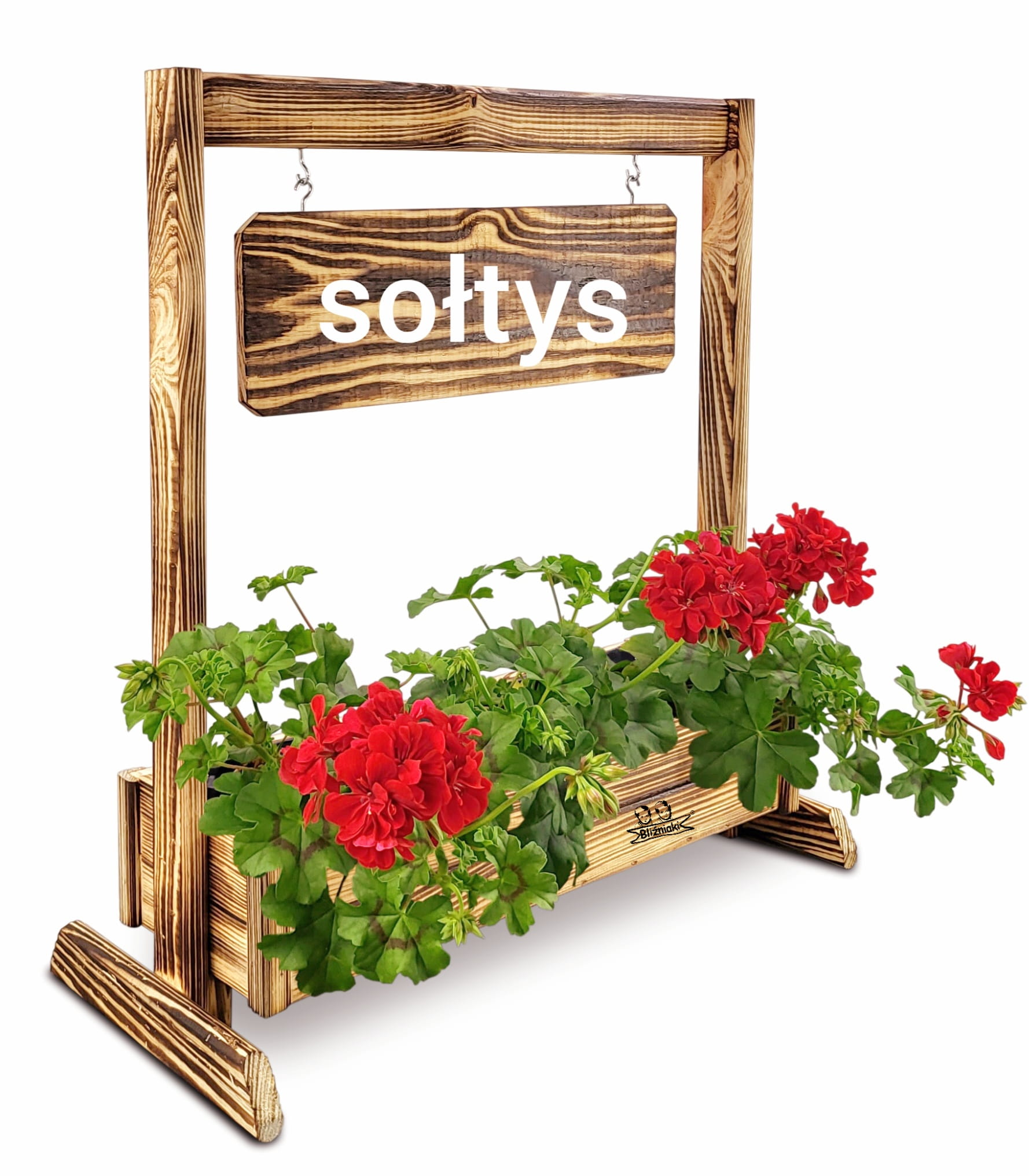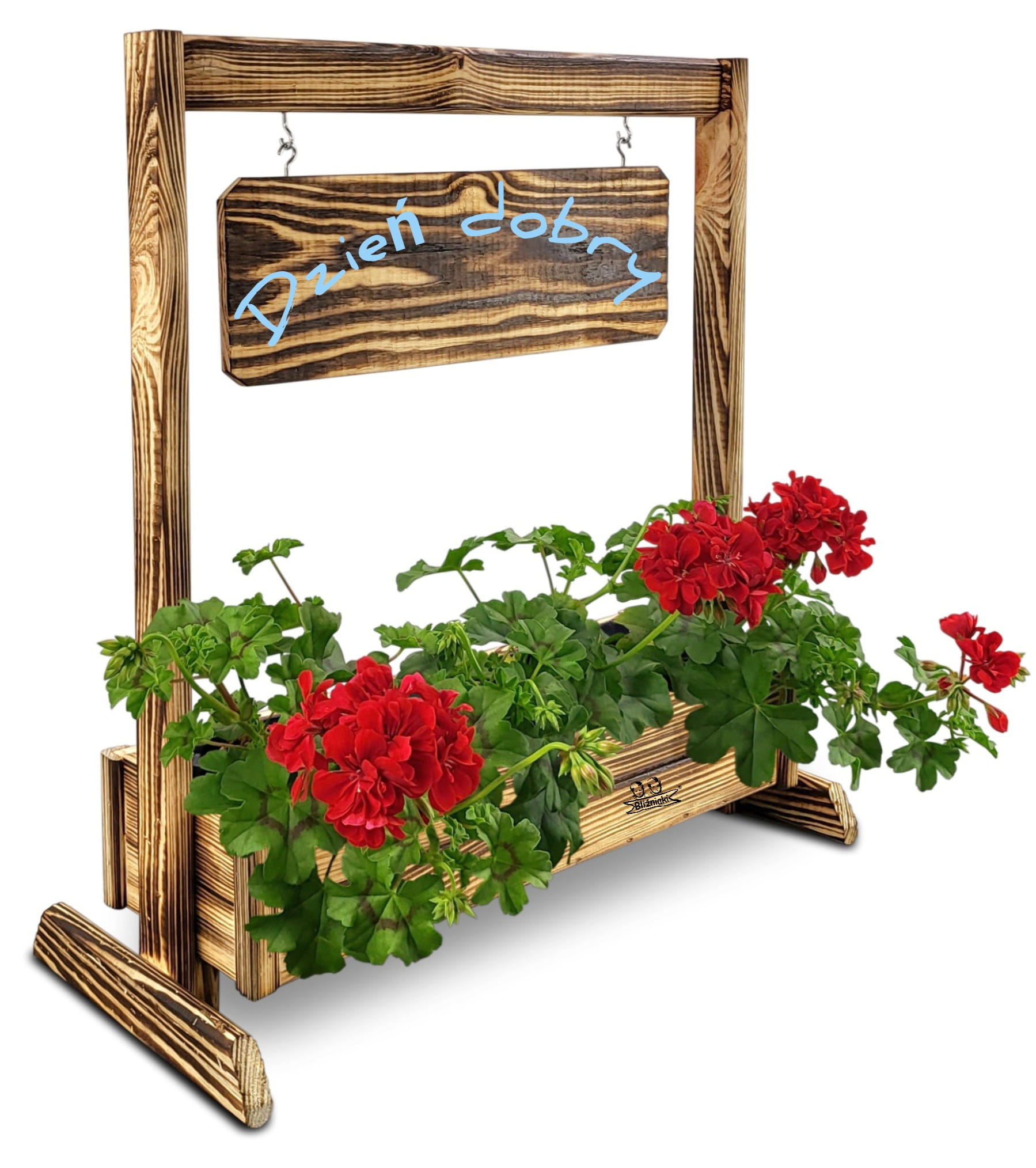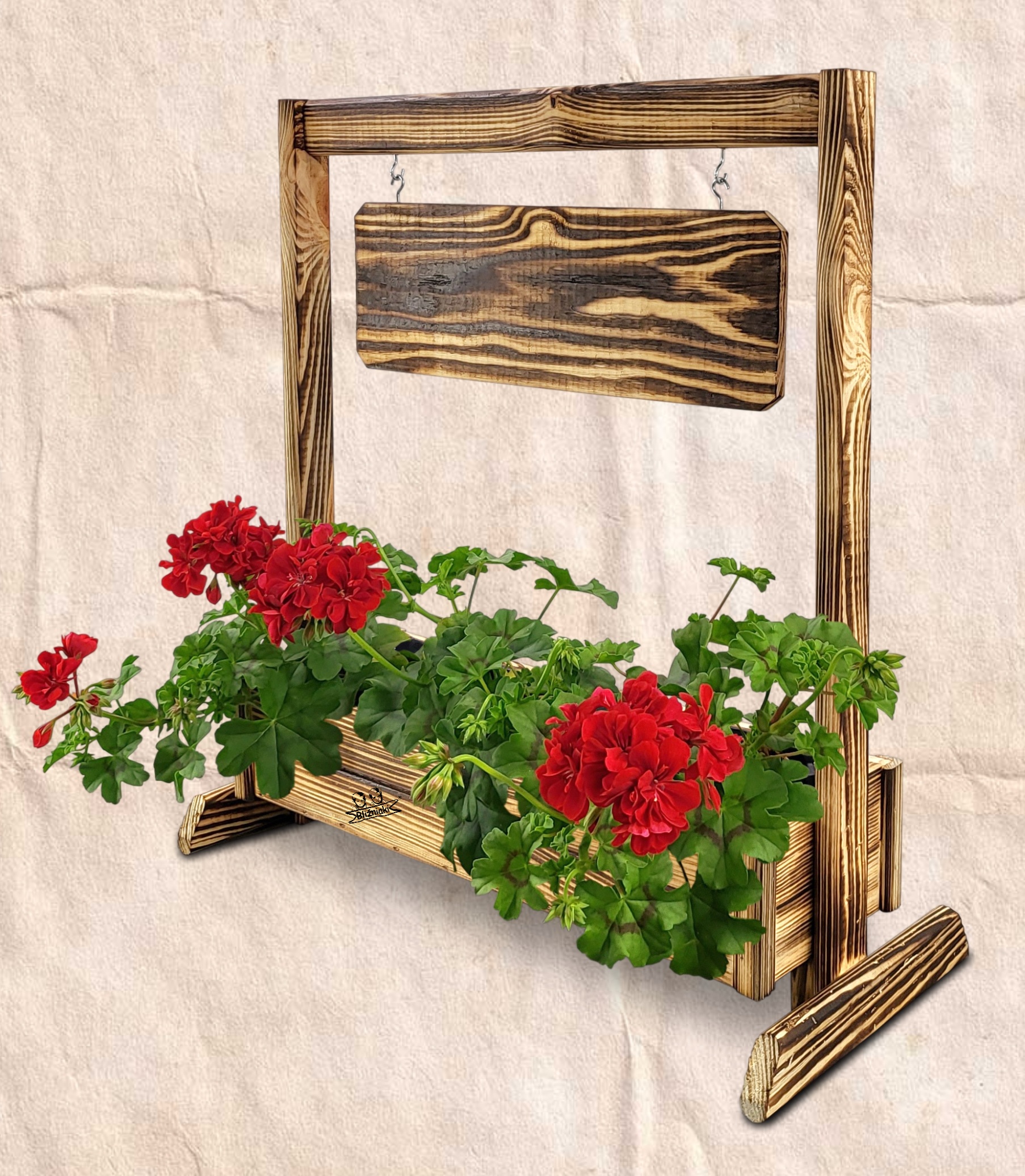 KWIETNIK TEXAS2 OPAL wykonany jest w całości z drewna. Składa się z doniczki na kwiaty, stojaka oraz zawieszanej poziomej tabliczki, która posiada gotowy napis .