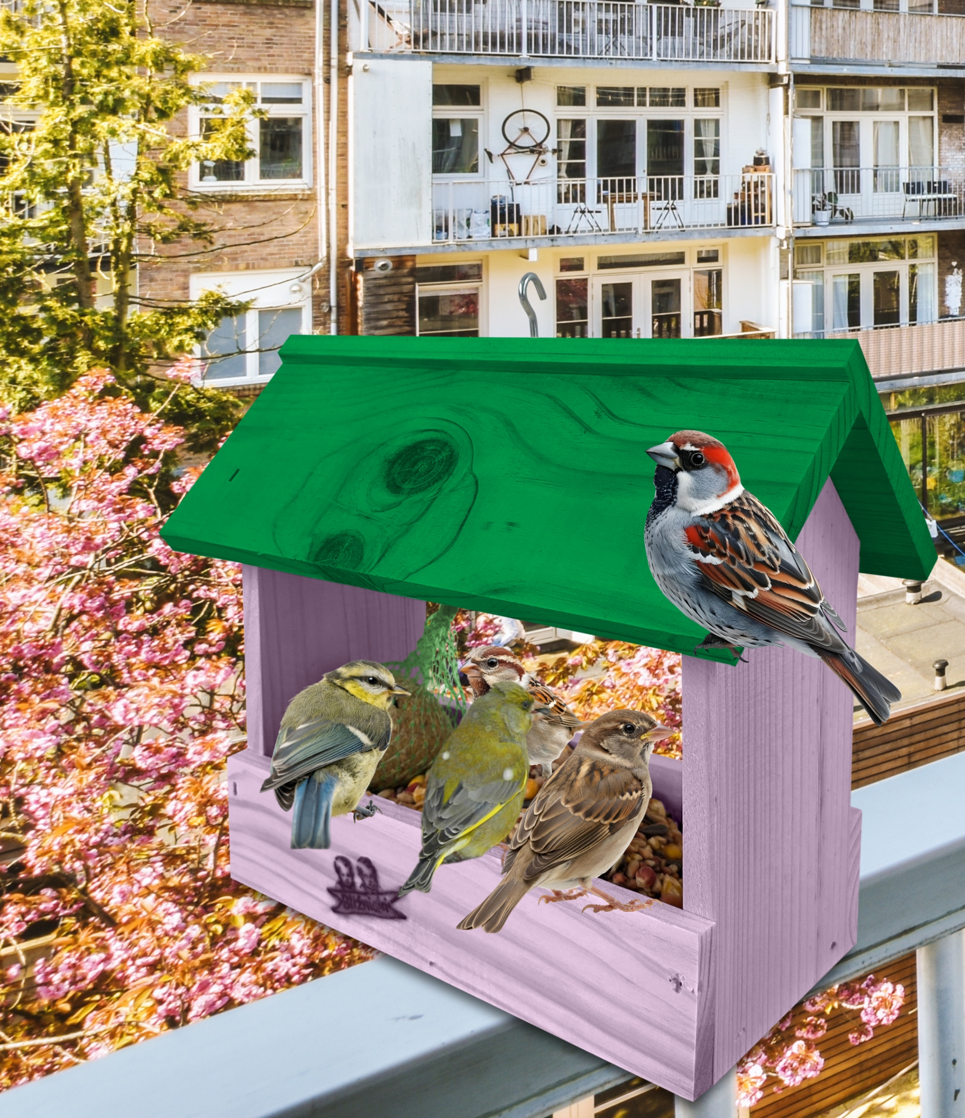 Przedmiotem sprzedaży jest ozdobny drewniany karmnik dla ptaków budka domek na balkon K204 FNP K kolor jasny fiolet z zielonym dachem
