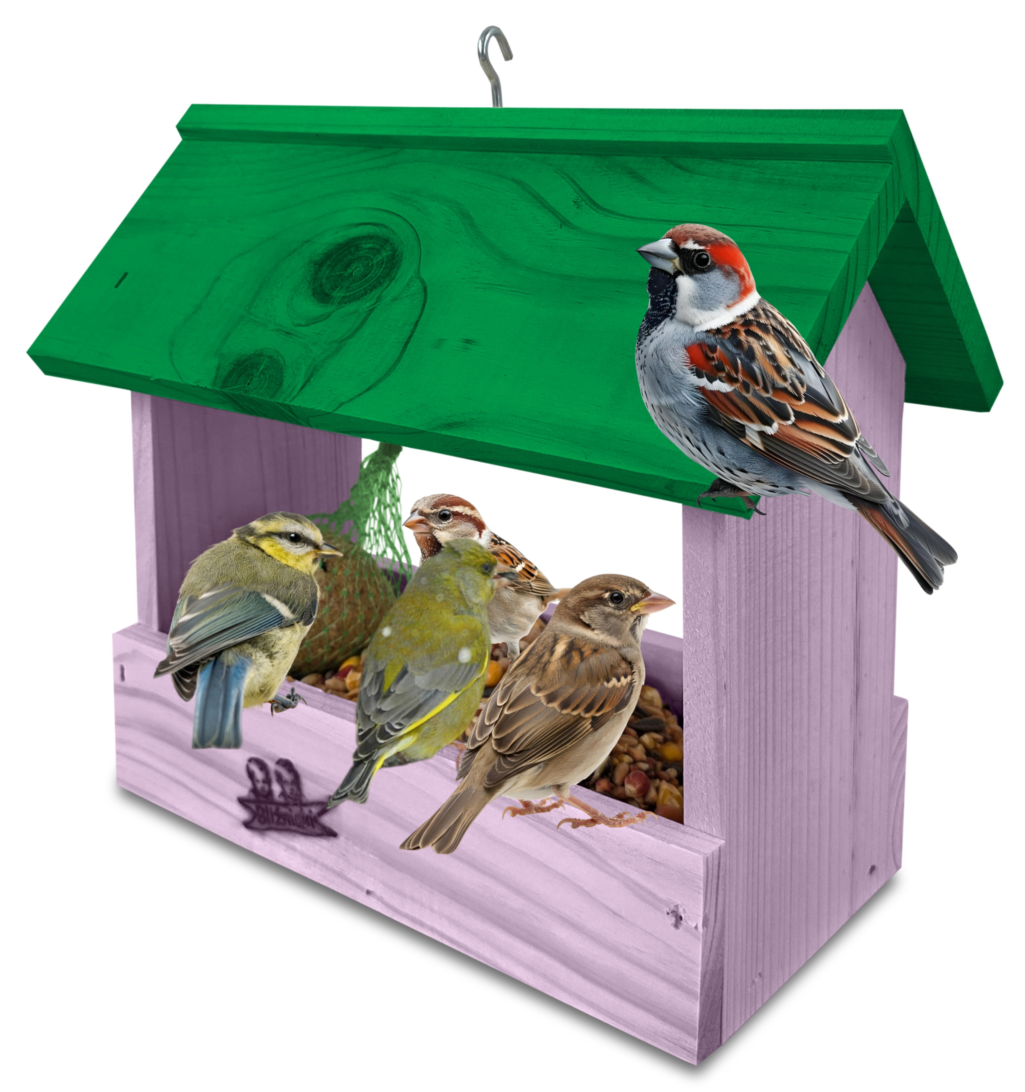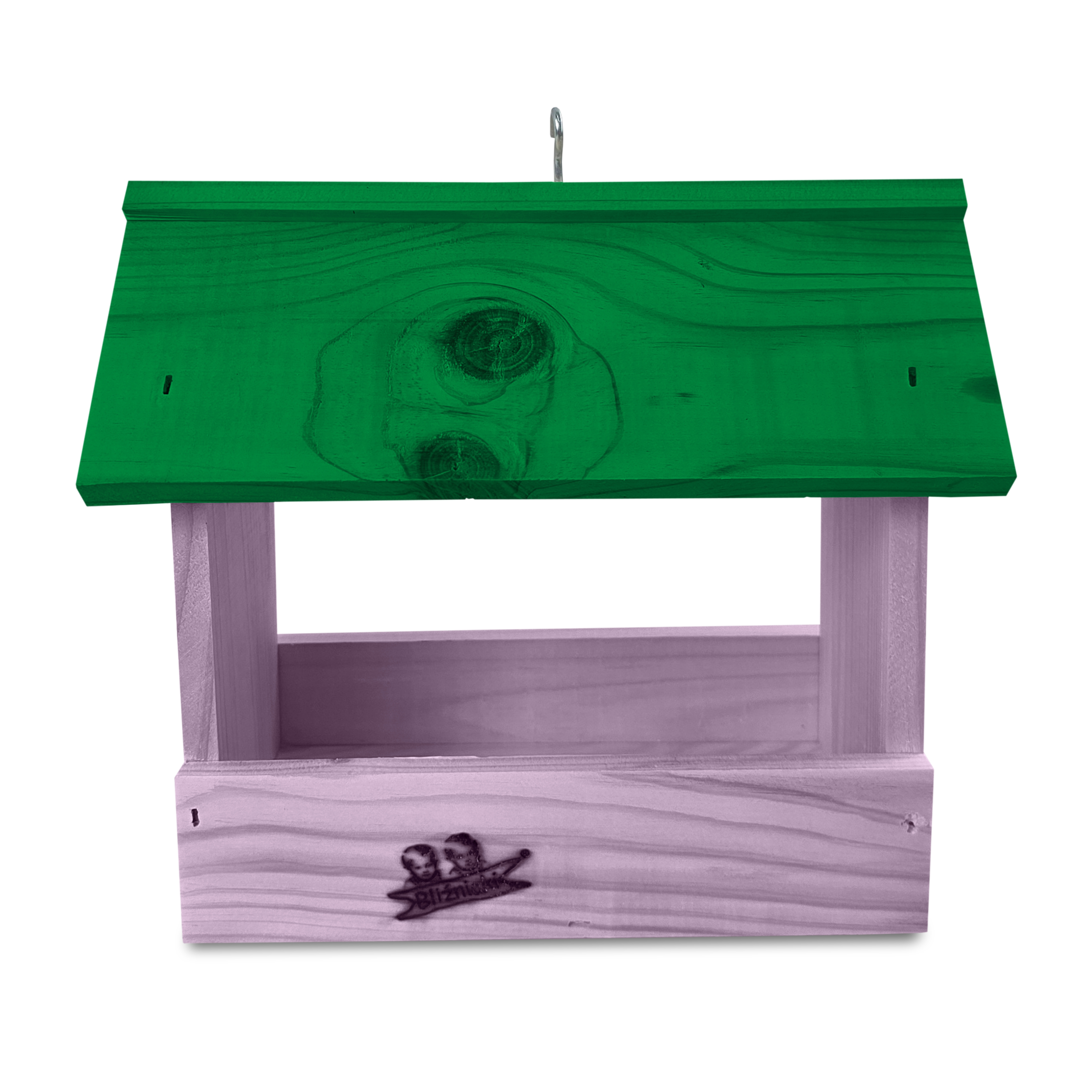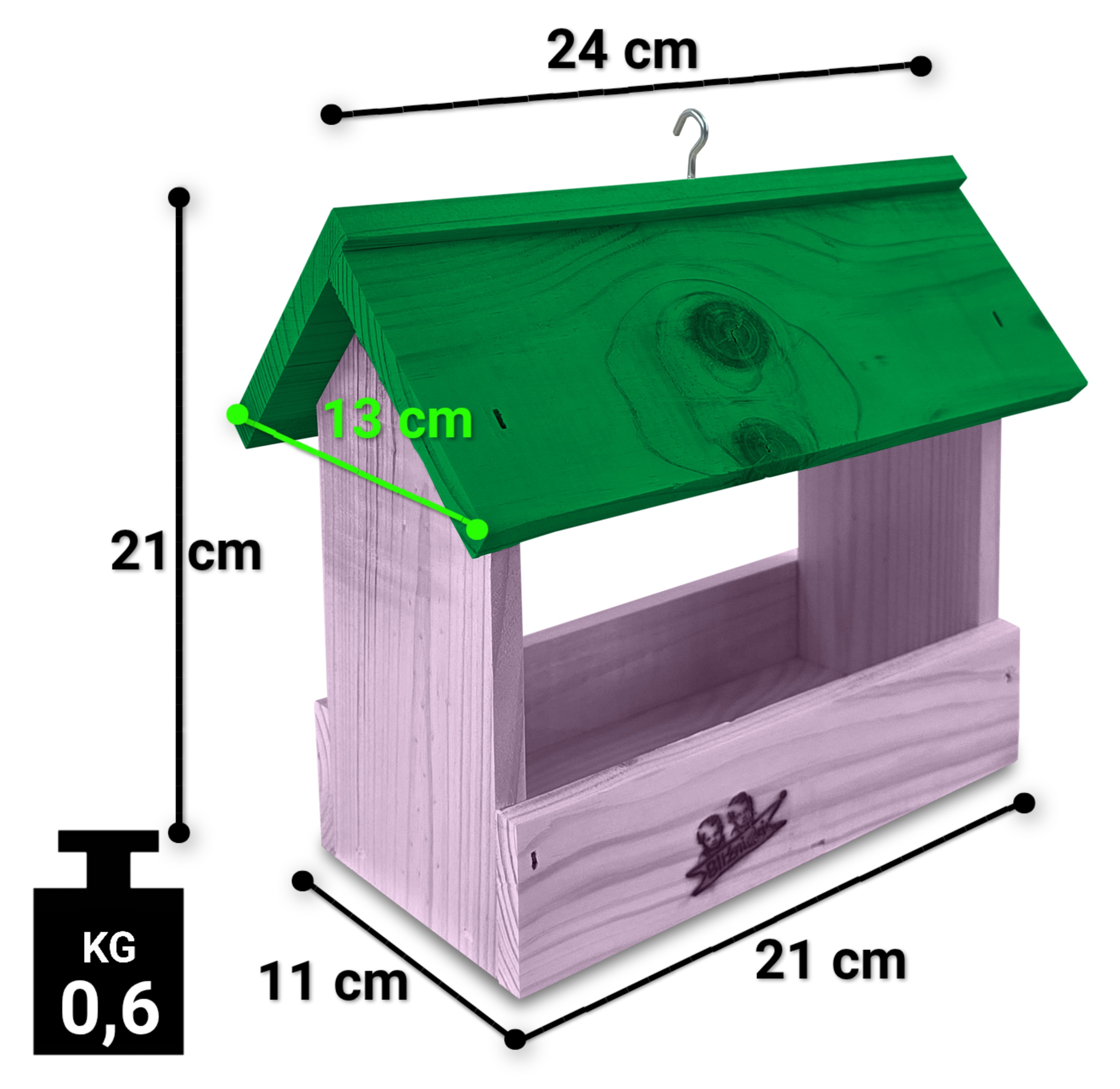 - Karmnik wykonany jest w całości z drewna iglastego, KOLOR JASNY FIOLET Z ZIELONYM DACHEM