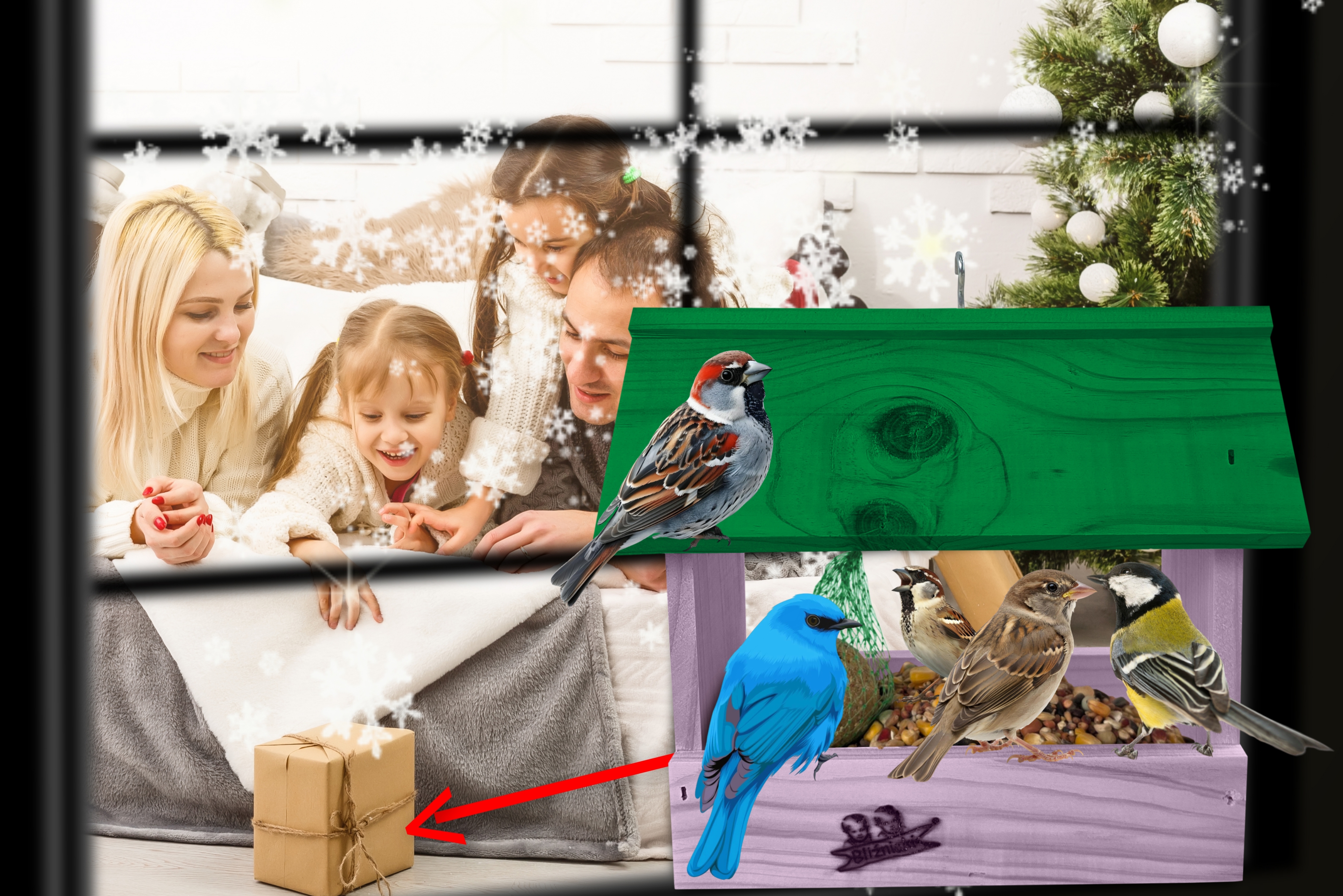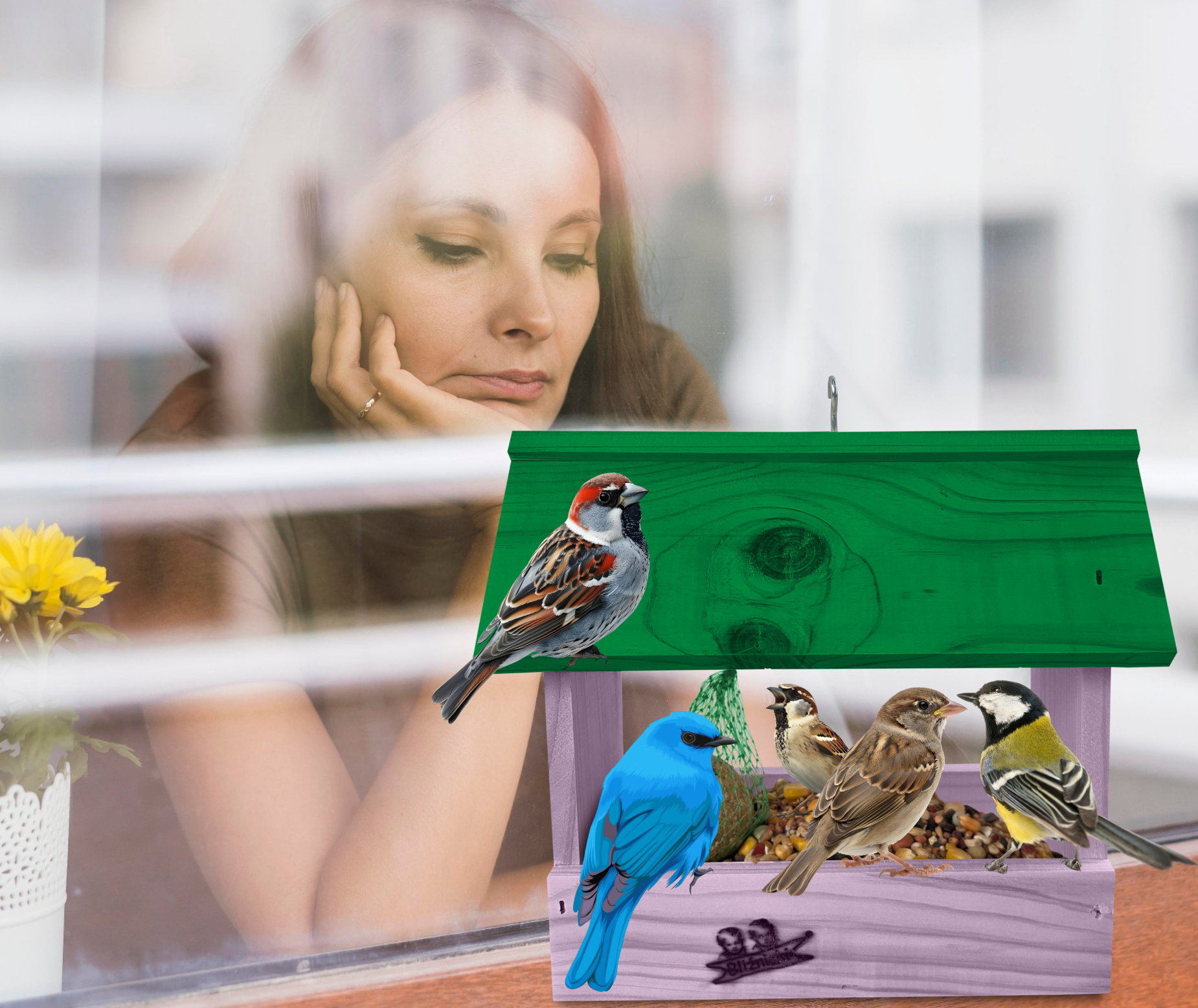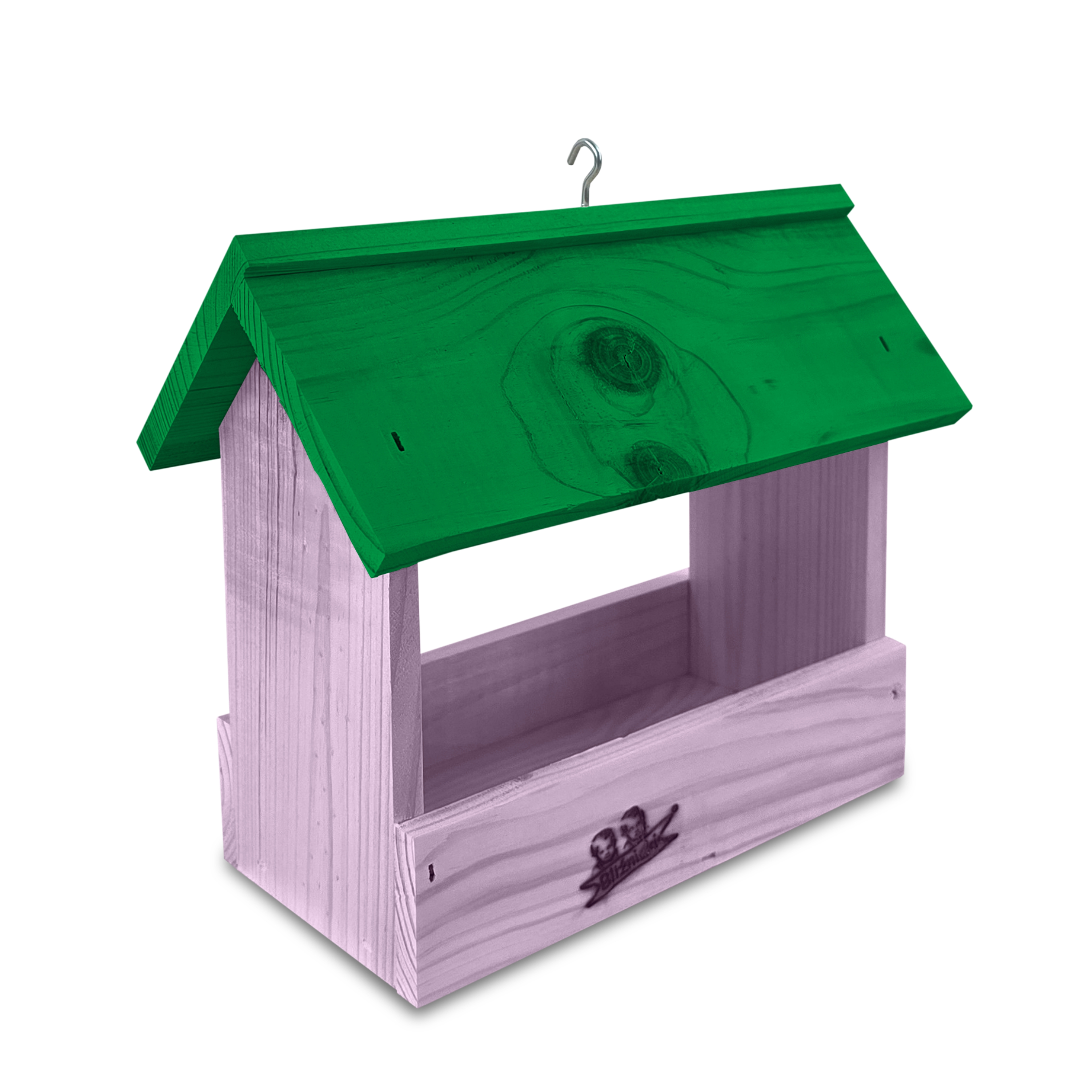 - Karmnik wykonany jest w całości z drewna iglastego, KOLOR JASNY FIOLET Z ZIELONYM DACHEM