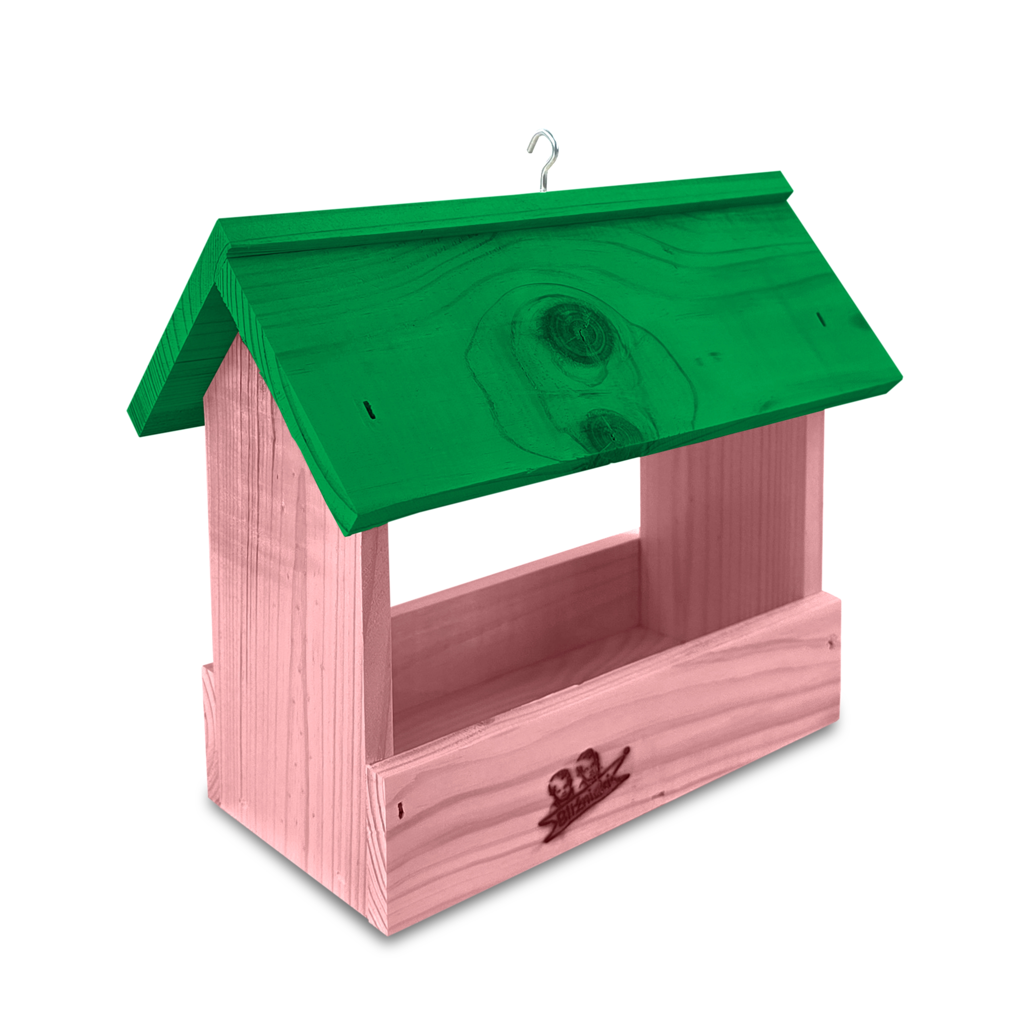 - Karmnik wykonany jest w całości z drewna iglastego, KOLOR PASTELOWY RÓŻ Z ZIELONYM DACHEM