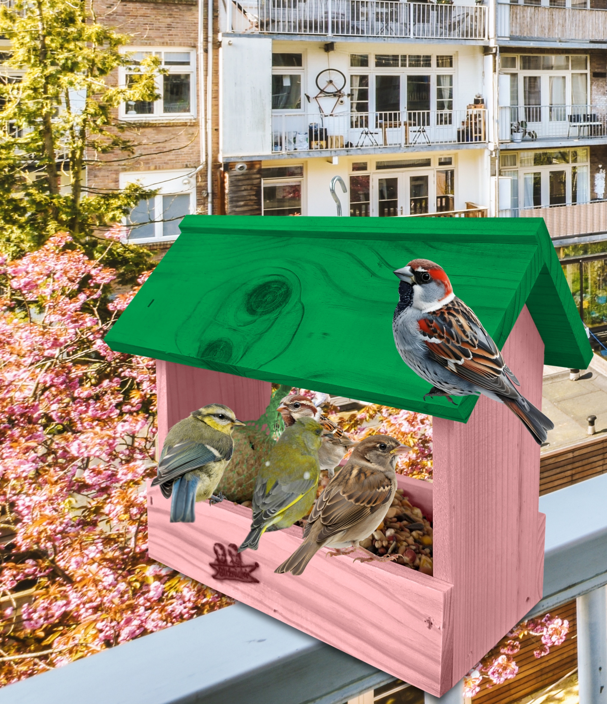 Przedmiotem sprzedaży jest ozdobny drewniany karmnik dla ptaków budka domek na balkon K204 RÓPP K kolor pastelowy róż z zielonym dachem