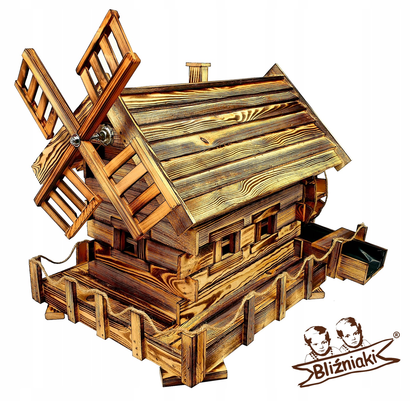Młyn wodny z fosą OPALANY OGNIEM z ekologicznego drewna sosnowego może pracować w dowolnym miejscu ogrodu napędzając koło obrotowe co nadaje ciekawy efekt wizualny.