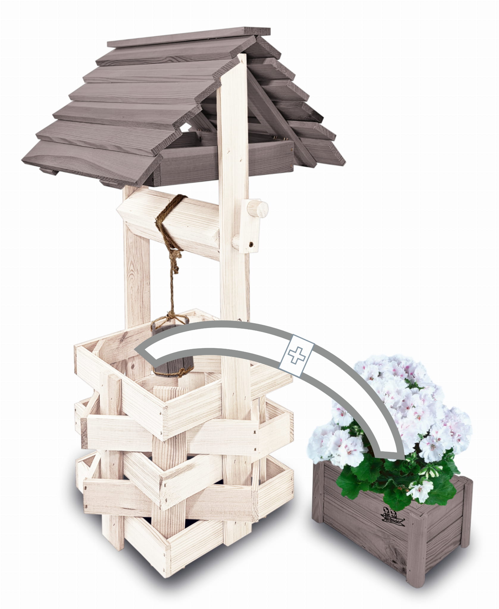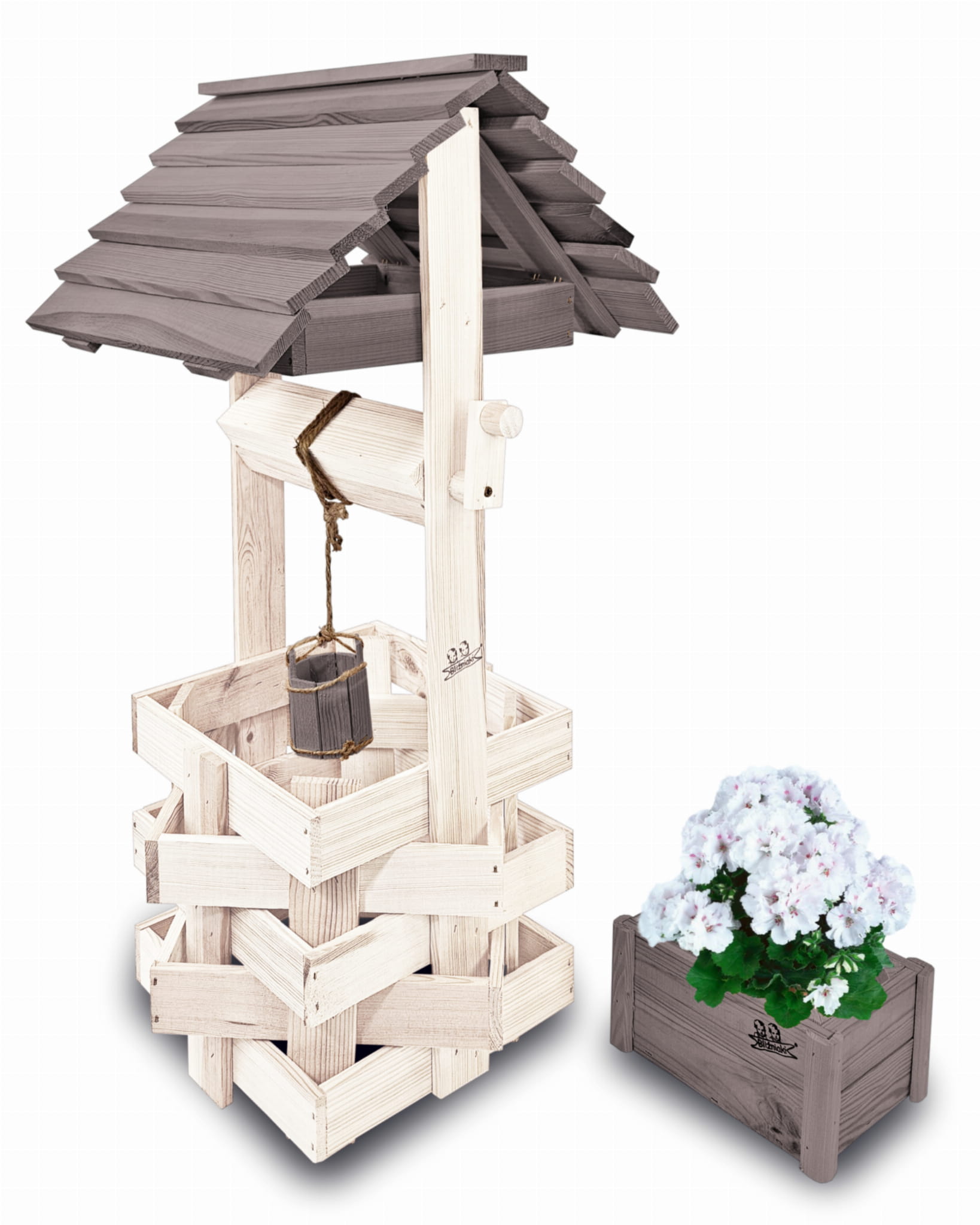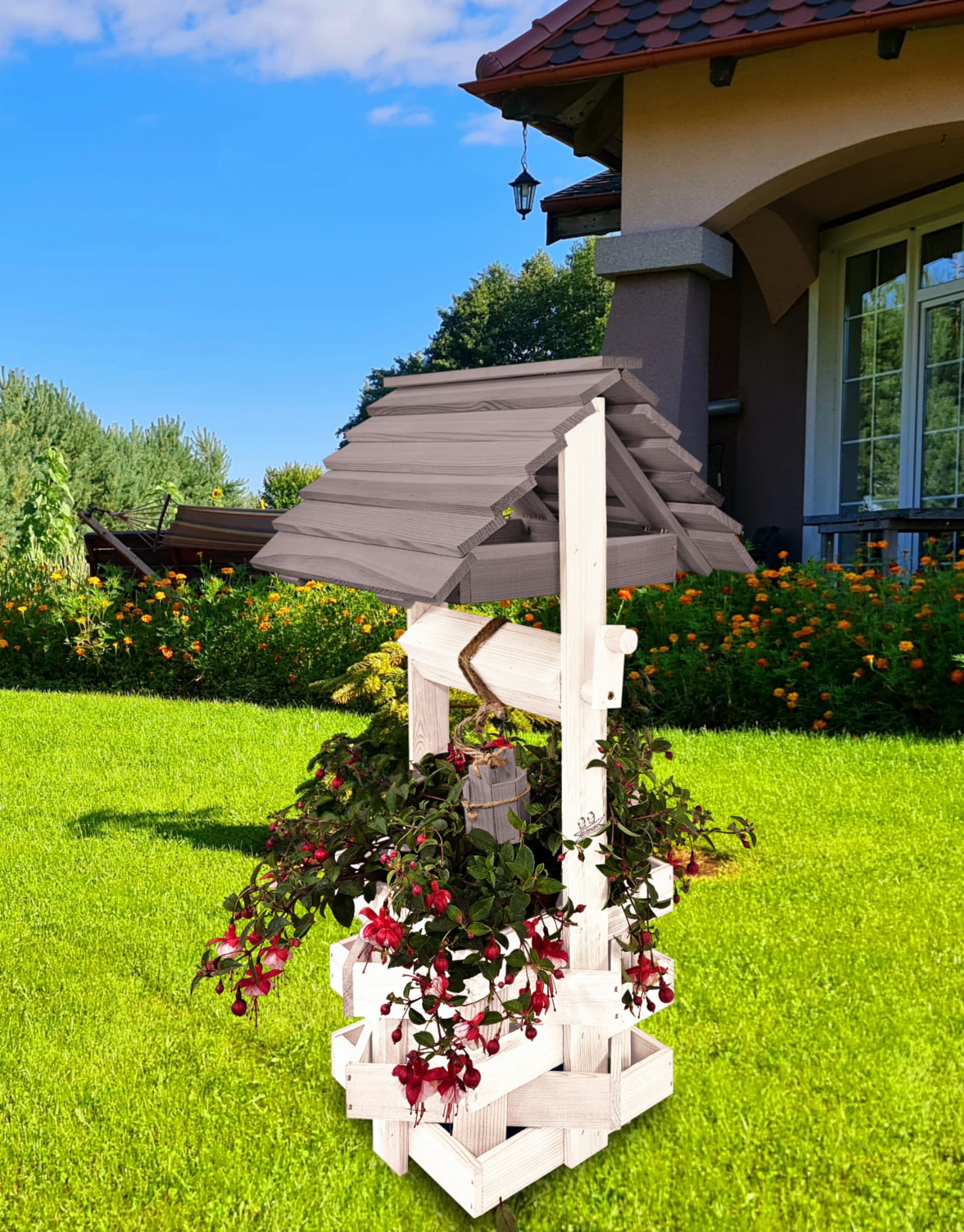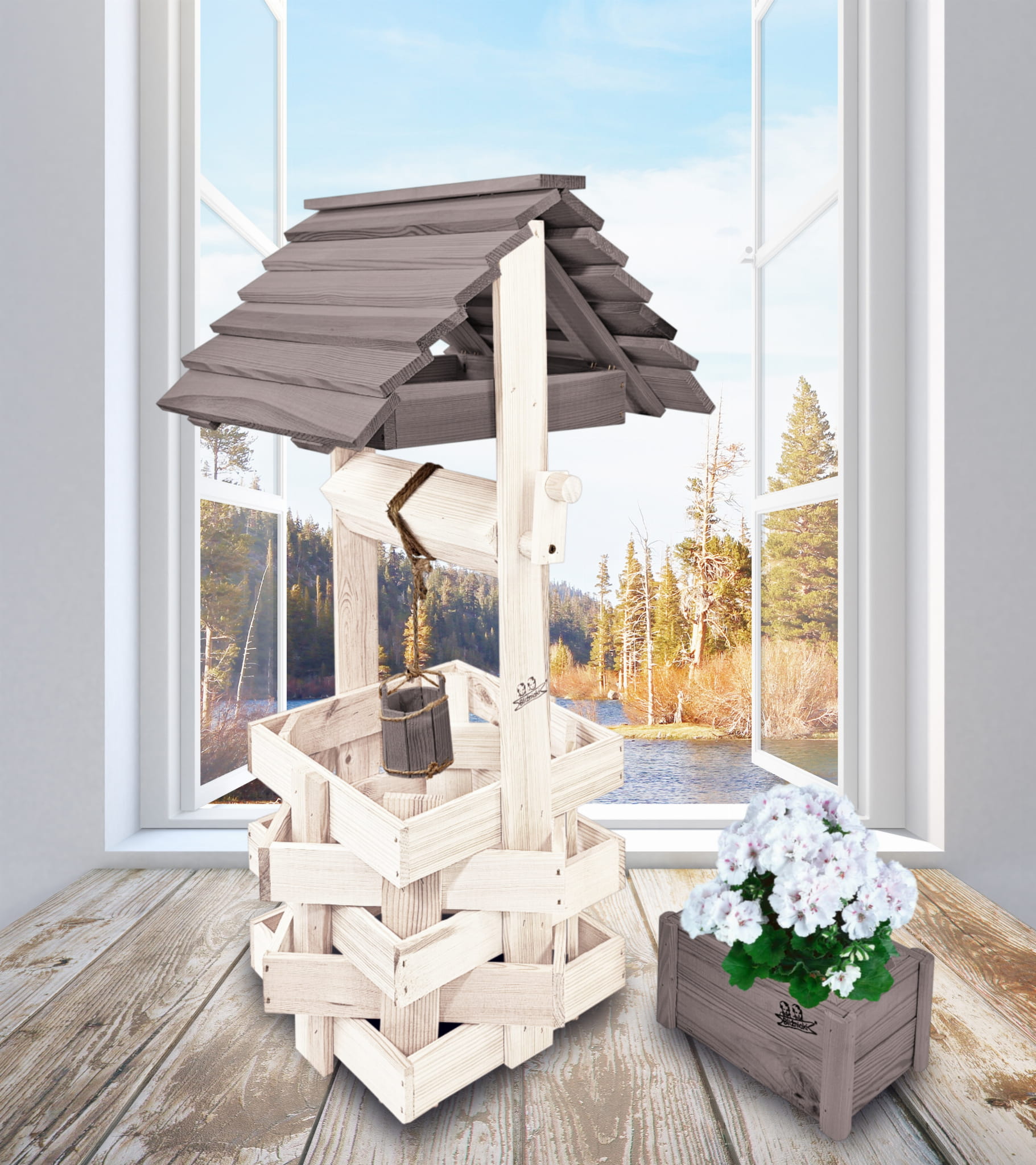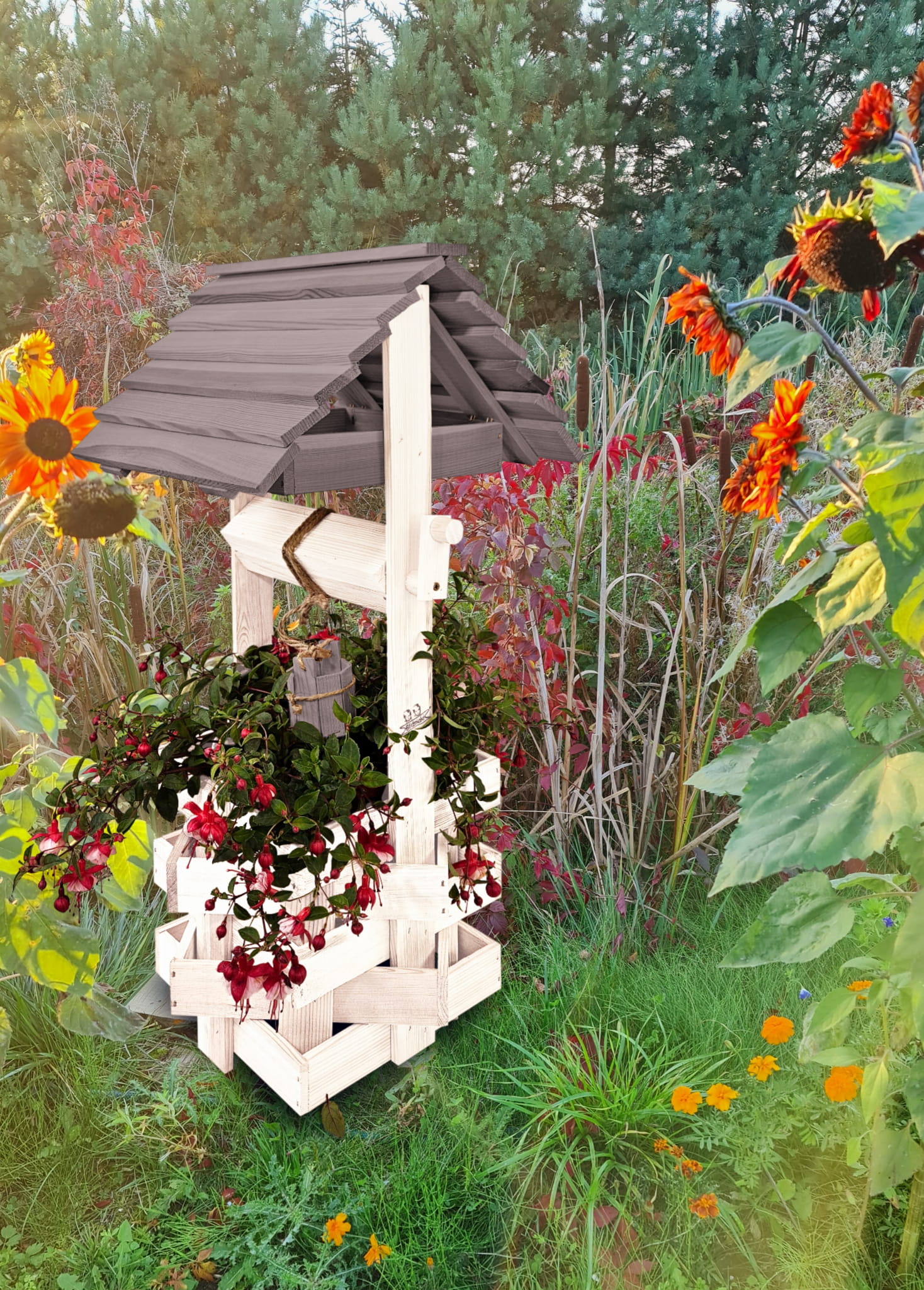 Do studni dołączona jest drewniana doniczka na kwiaty, utrzymana w tej samej estetyce, tworząc spójną i harmonijną całość.