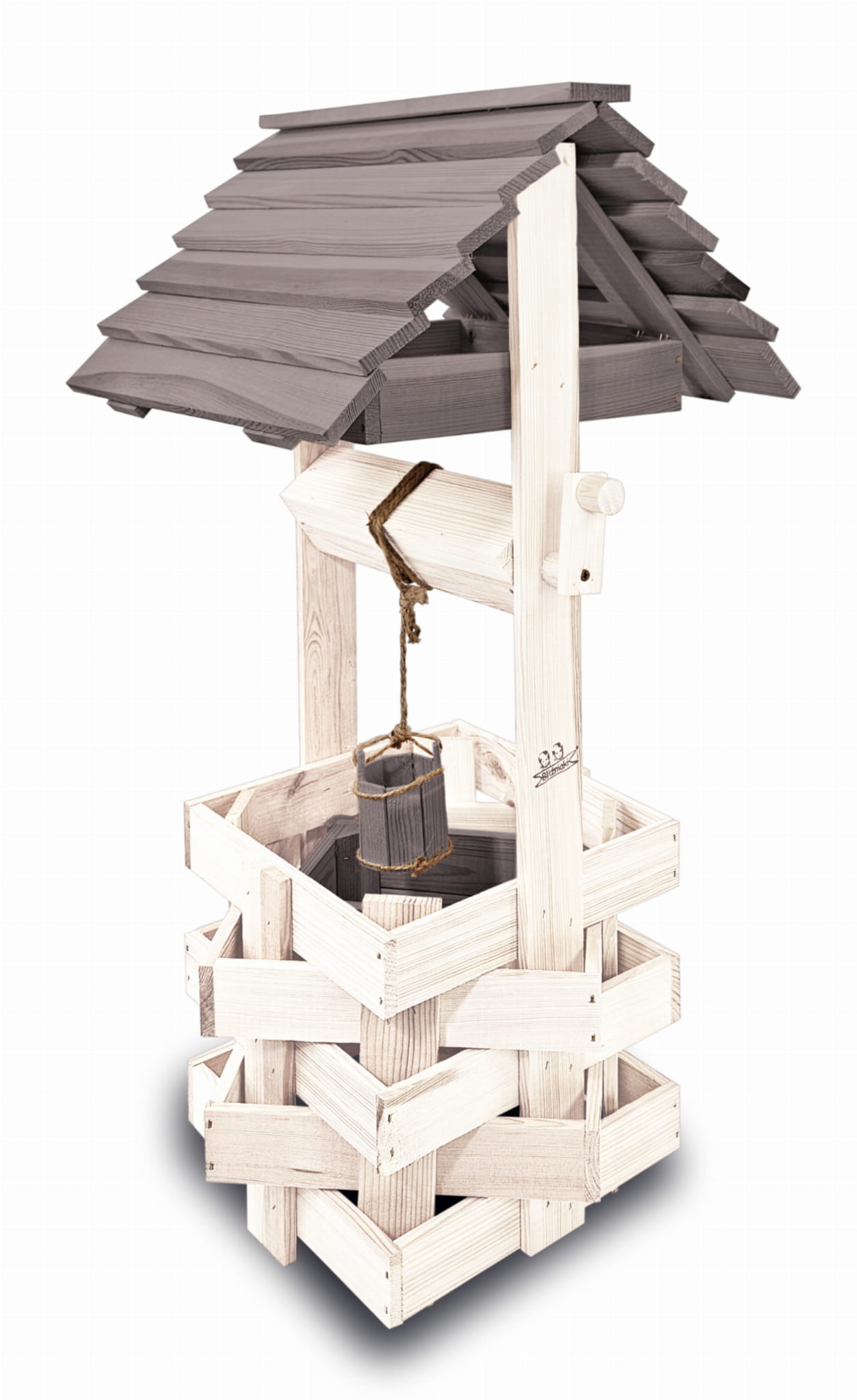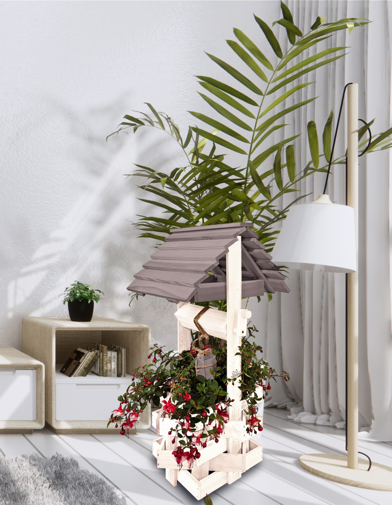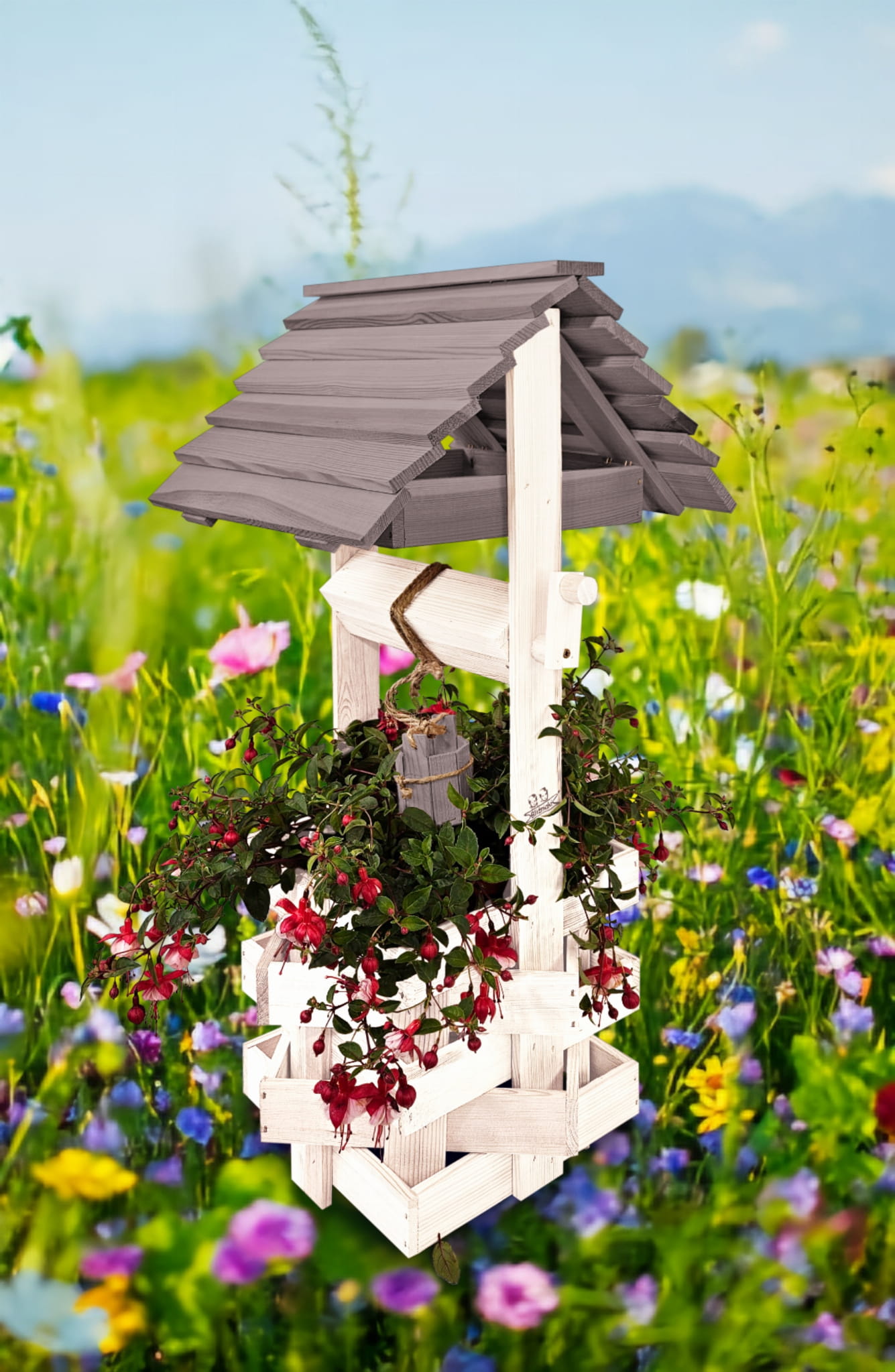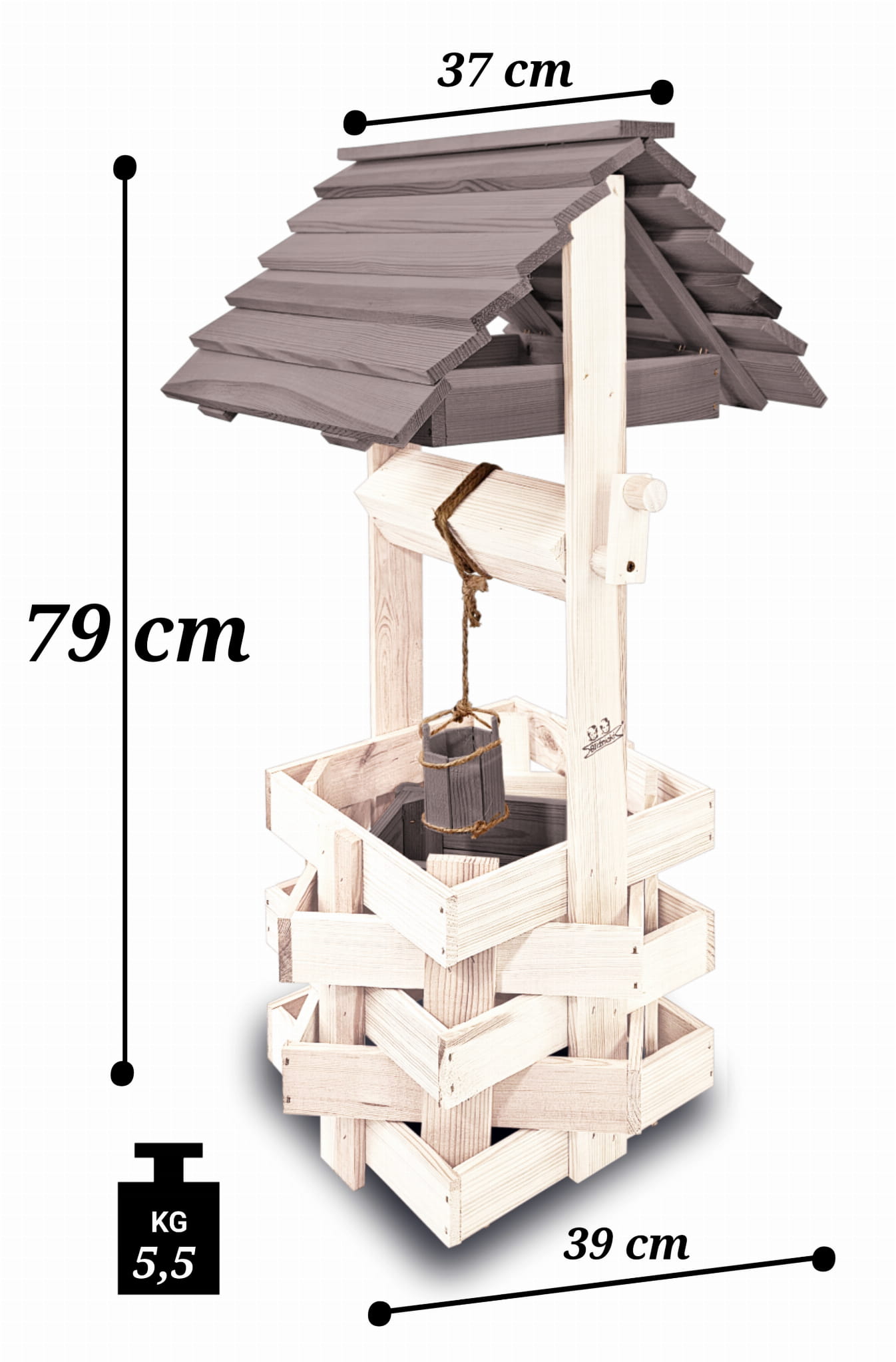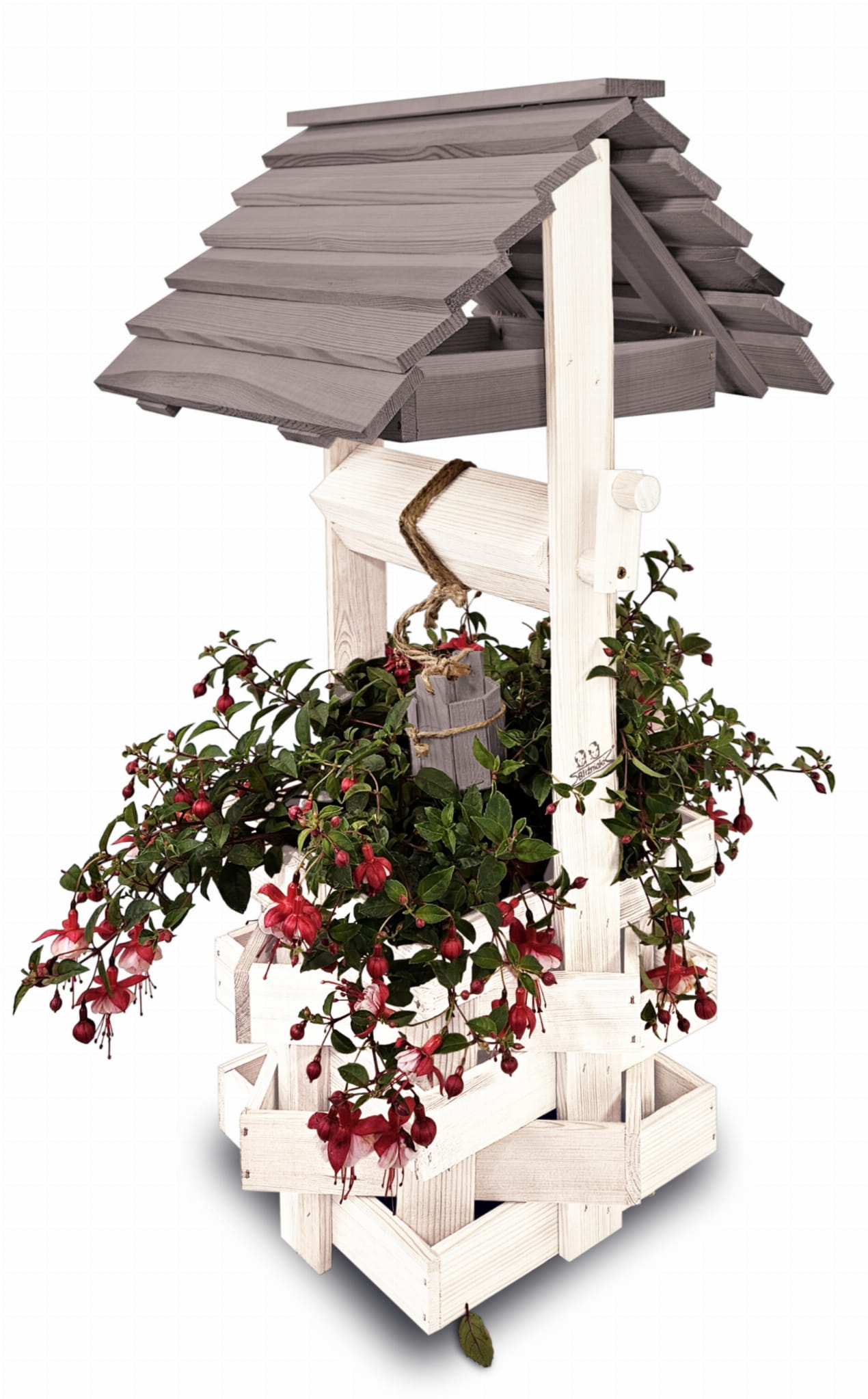 Do studni dołączona jest drewniana doniczka na kwiaty, utrzymana w tej samej estetyce, tworząc spójną i harmonijną całość.