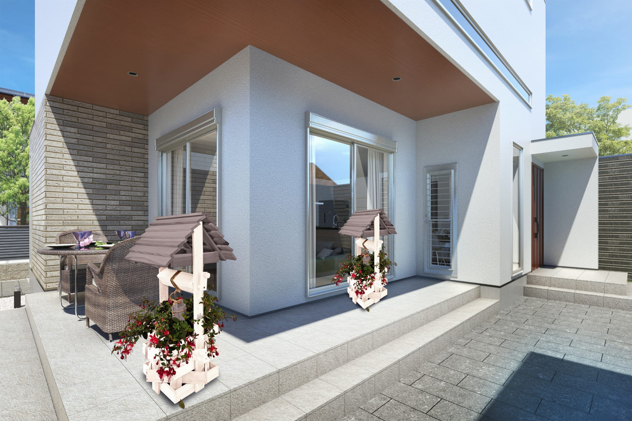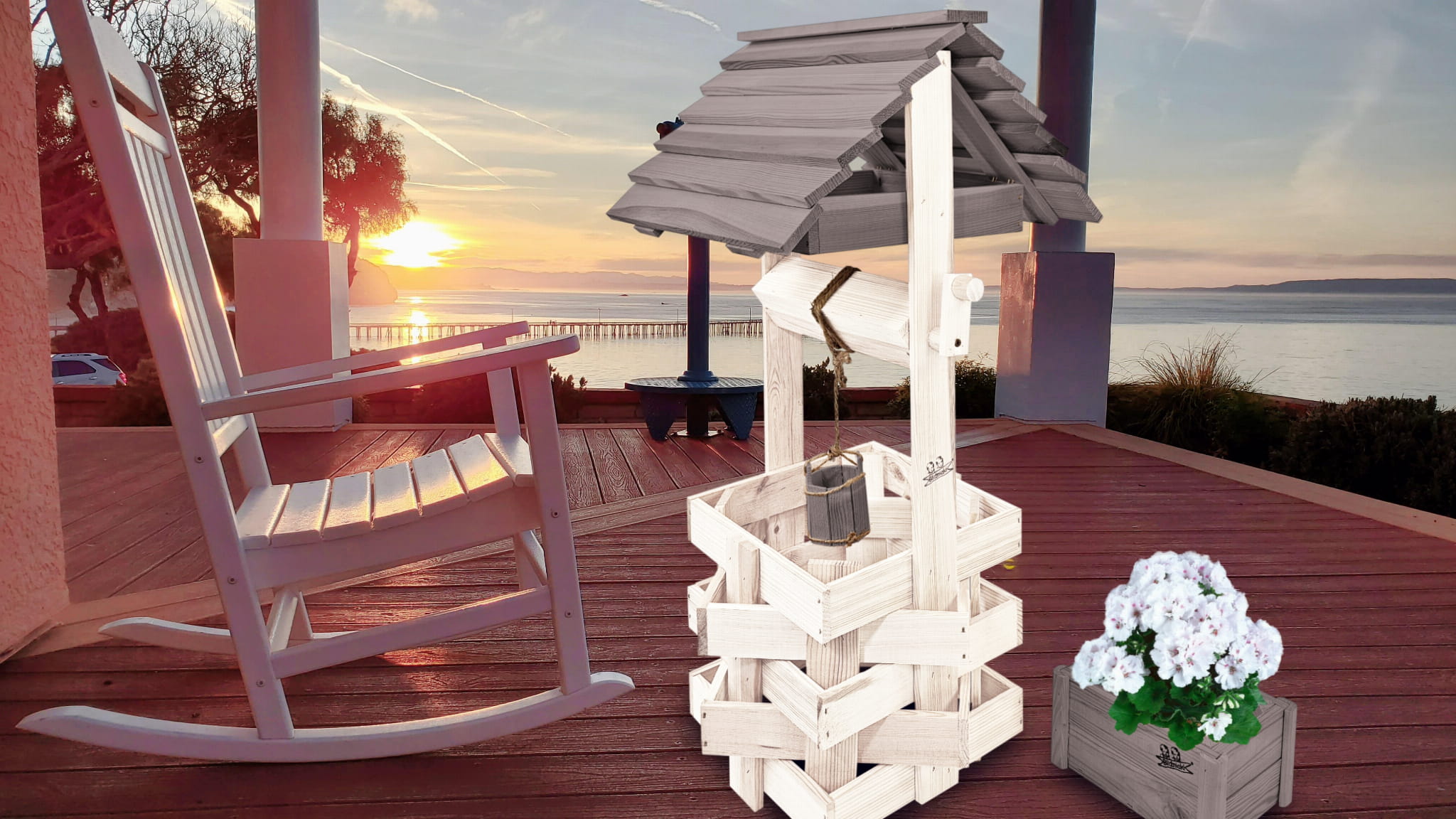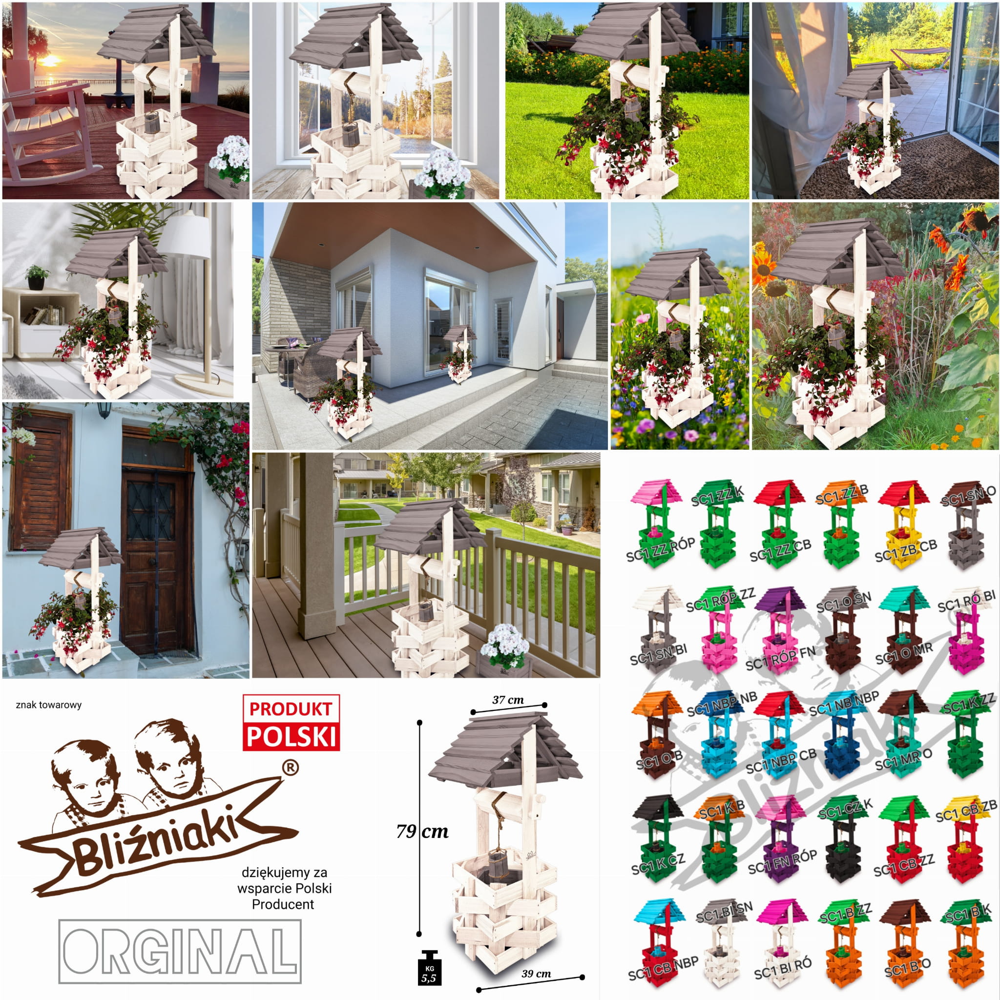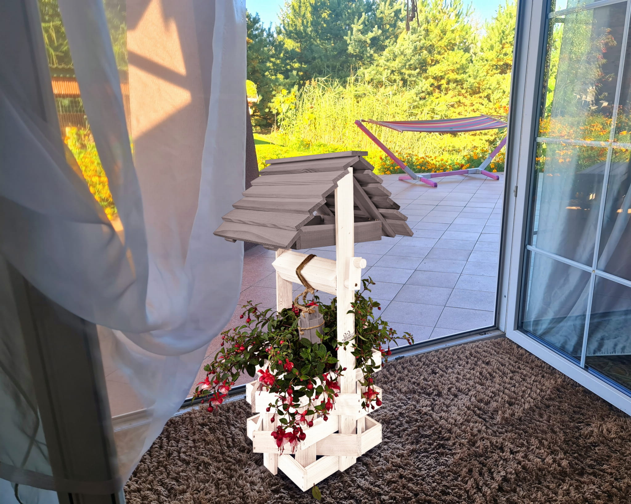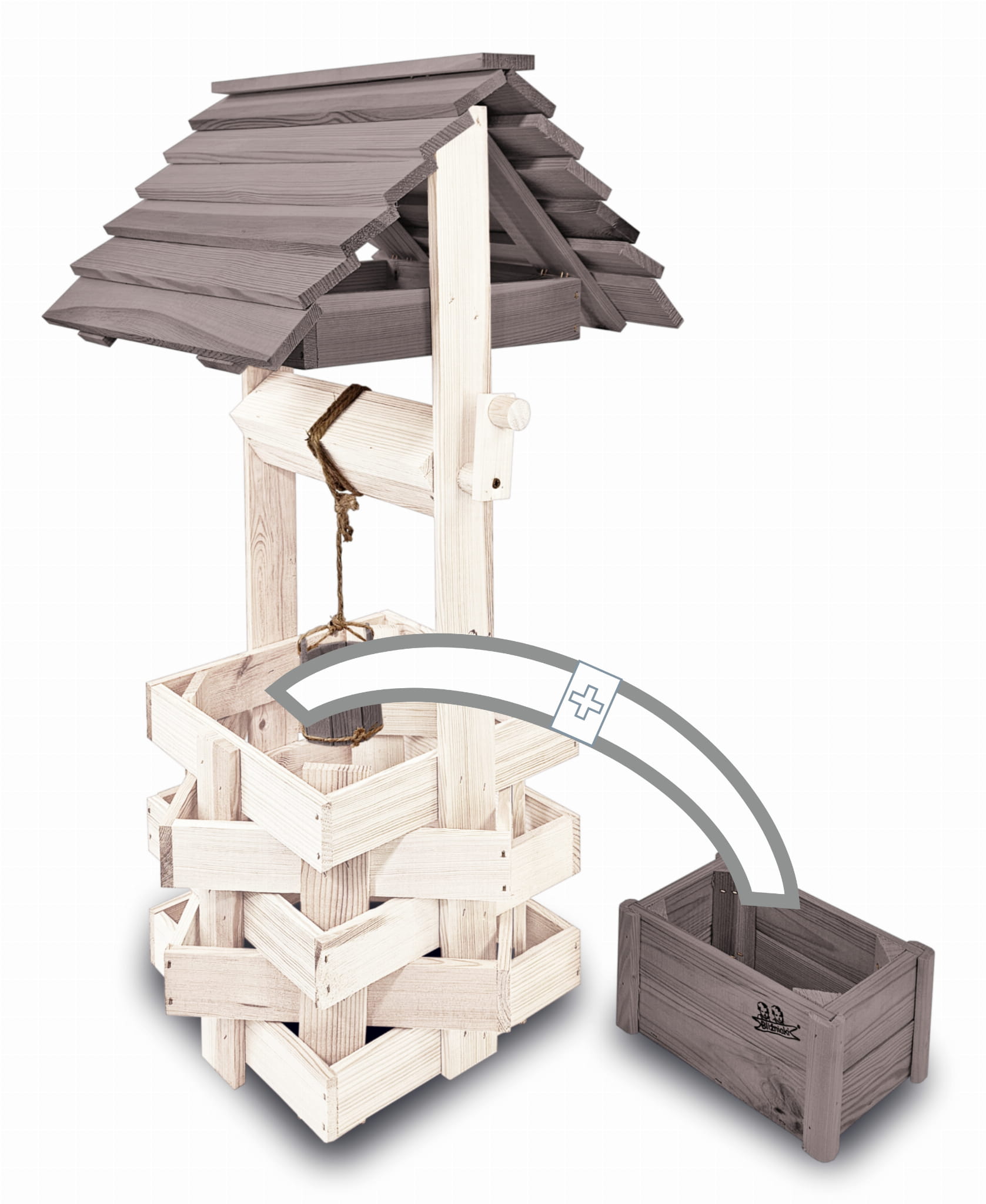 Do studni dołączona jest drewniana doniczka na kwiaty, utrzymana w tej samej estetyce, tworząc spójną i harmonijną całość.