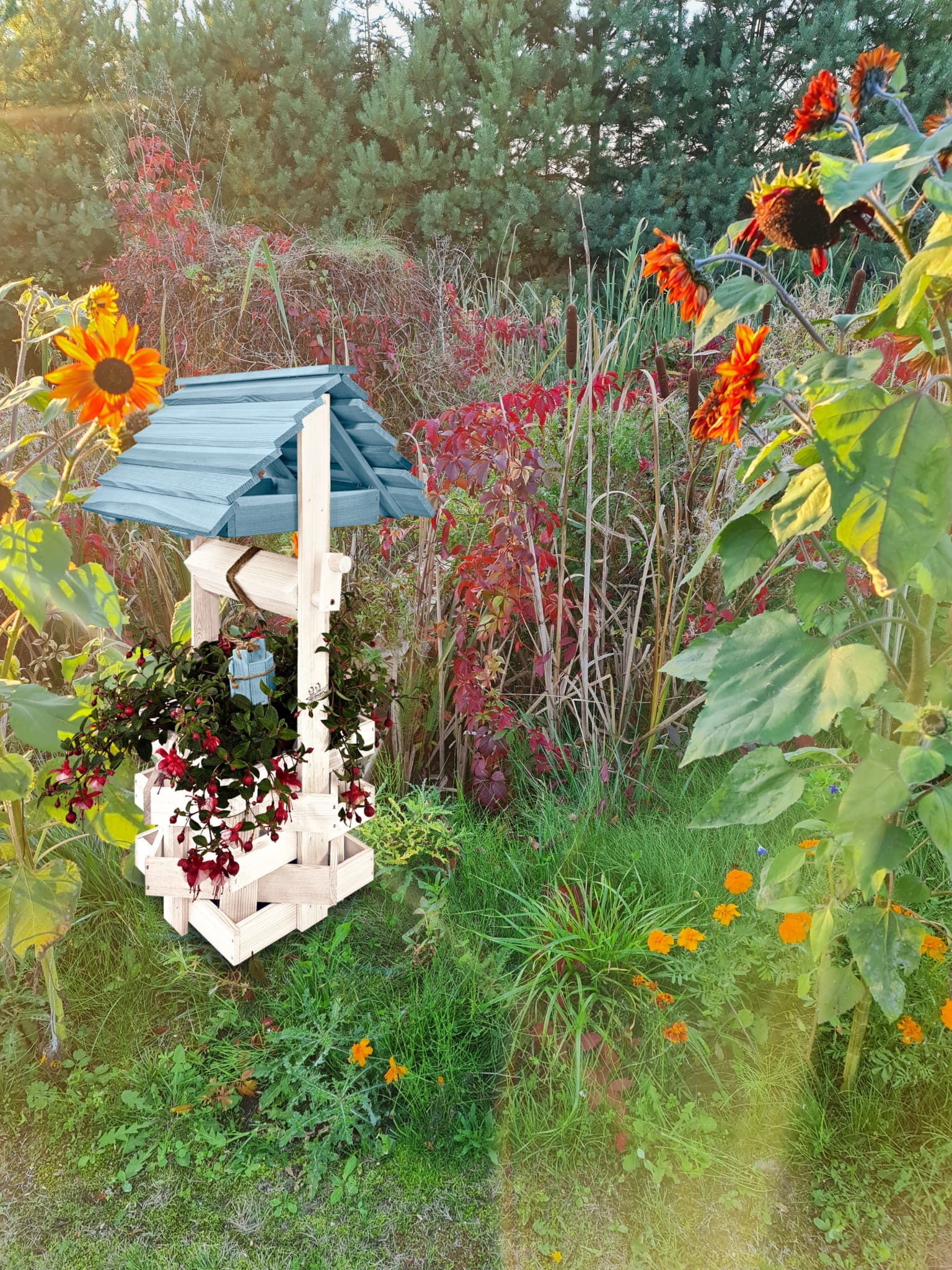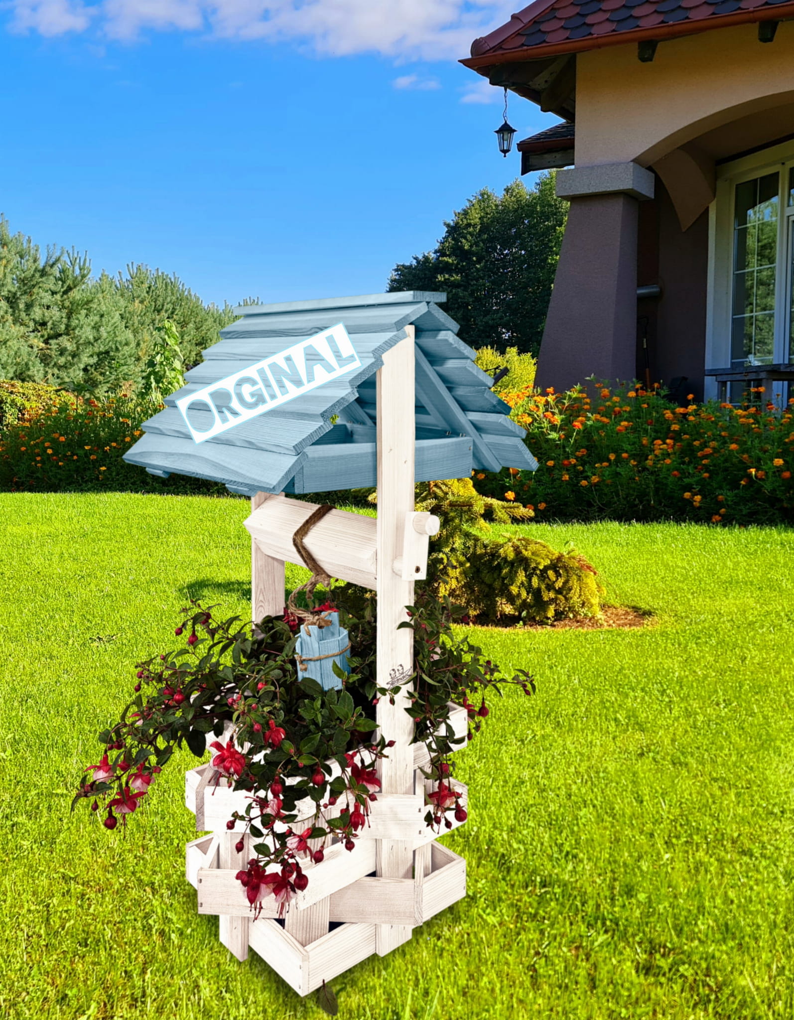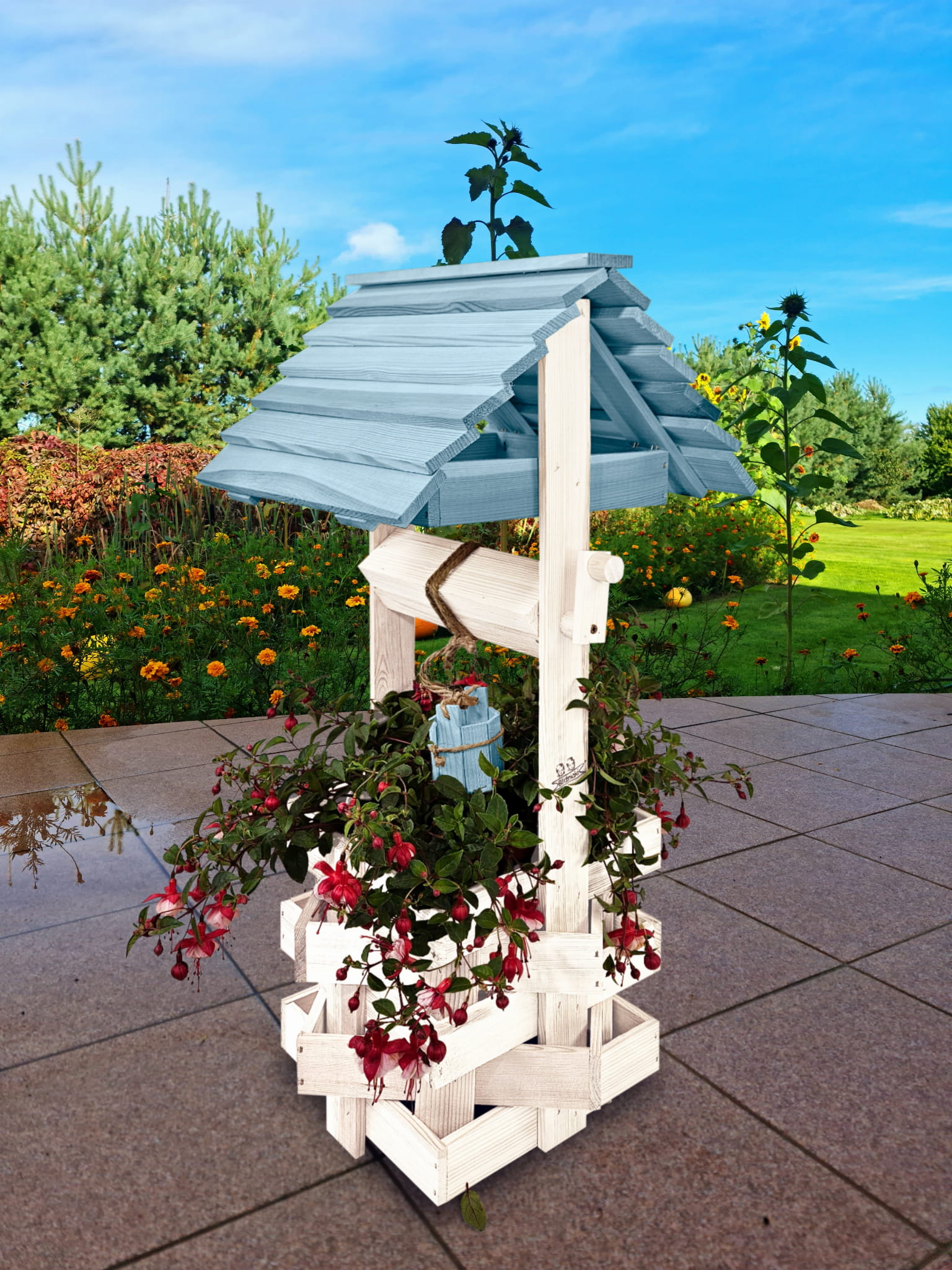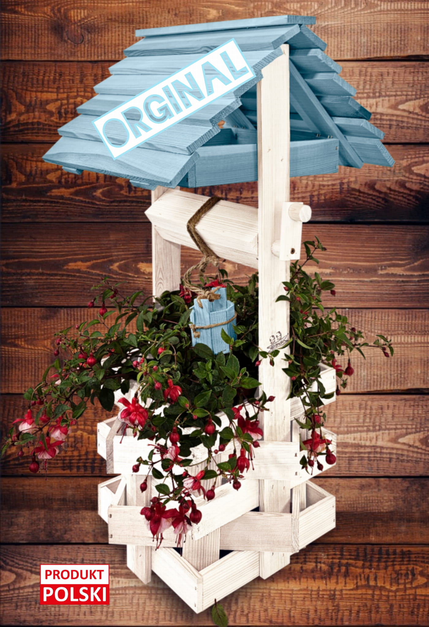 Do studni dołączona jest drewniana doniczka na kwiaty, utrzymana w tej samej estetyce, tworząc spójną i harmonijną całość.