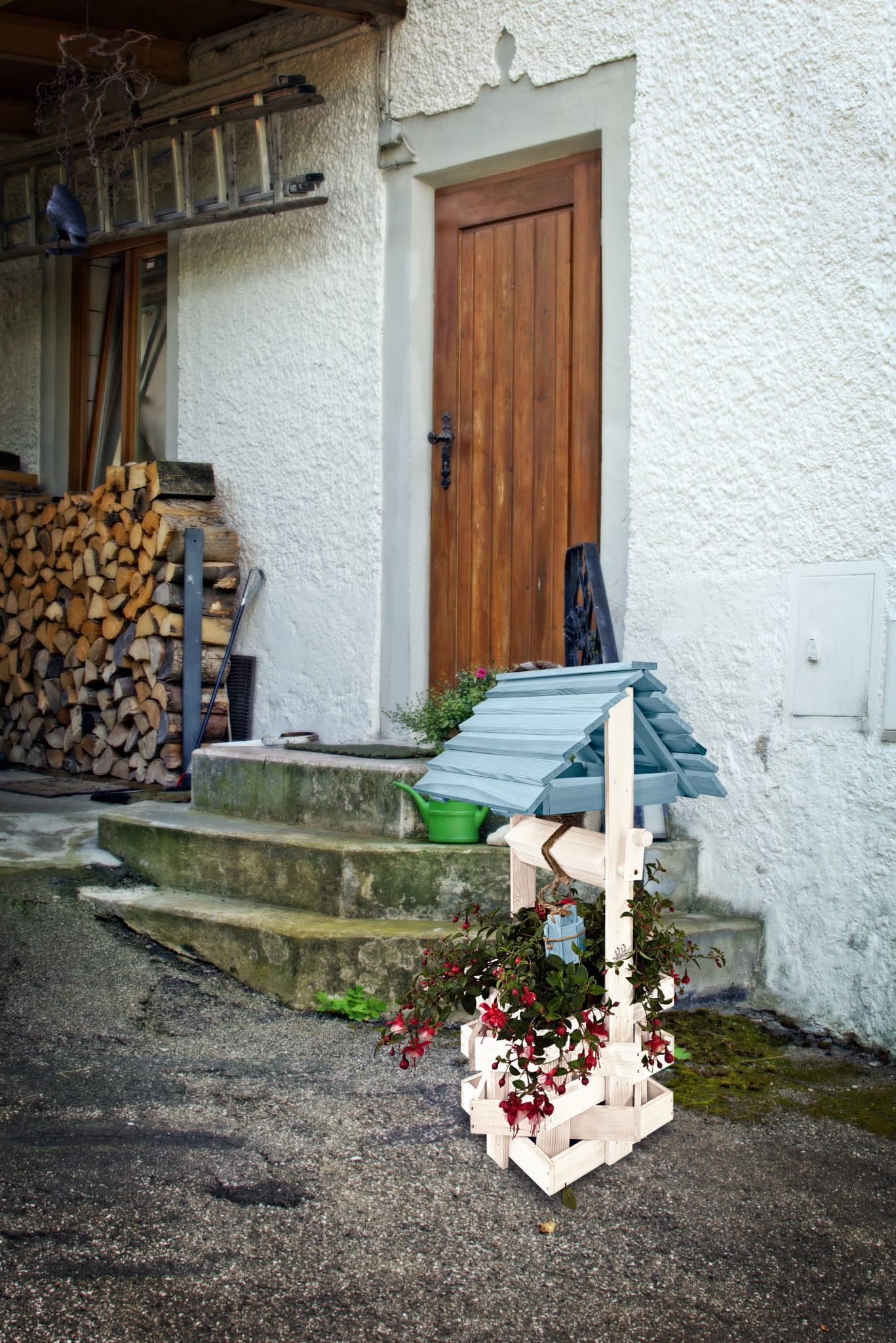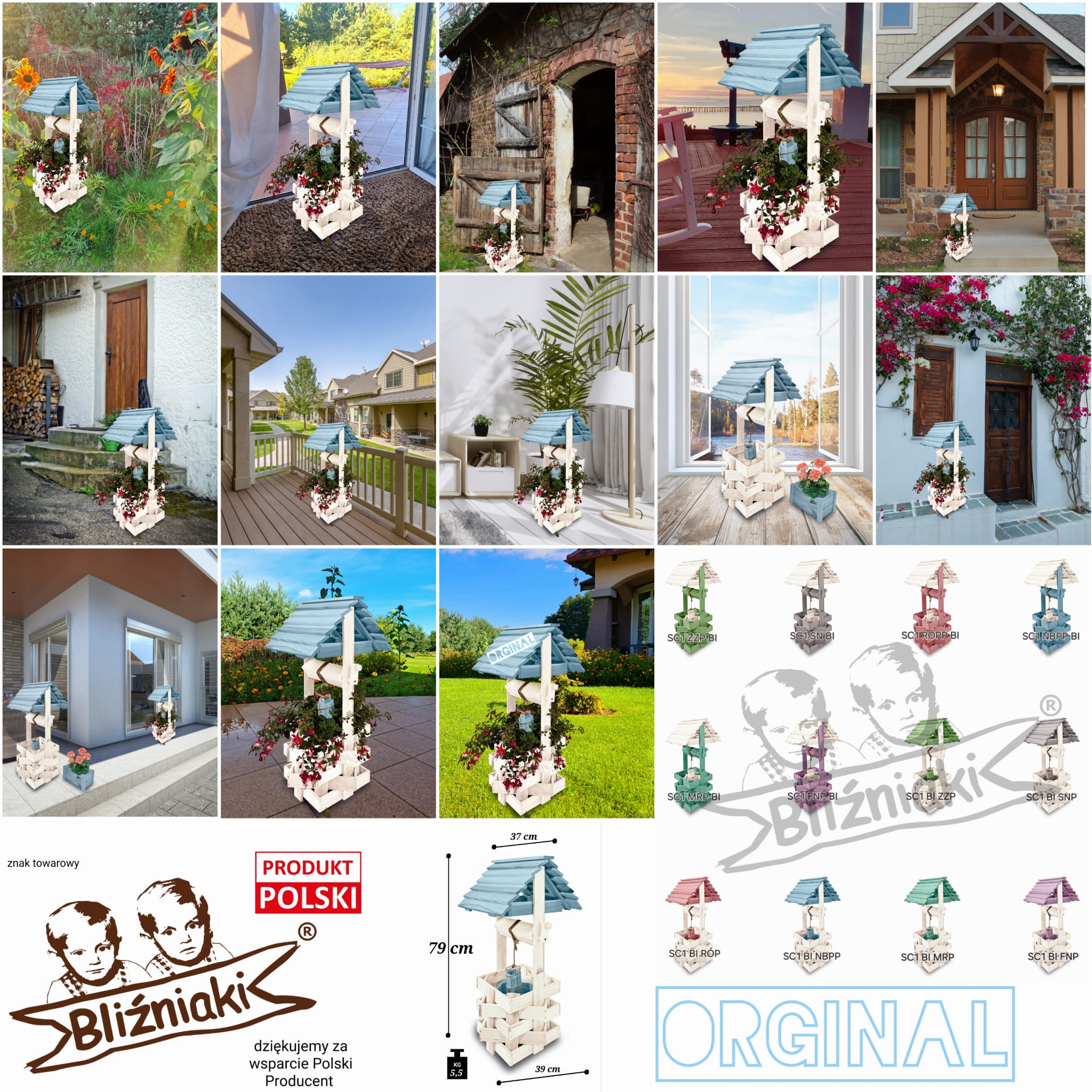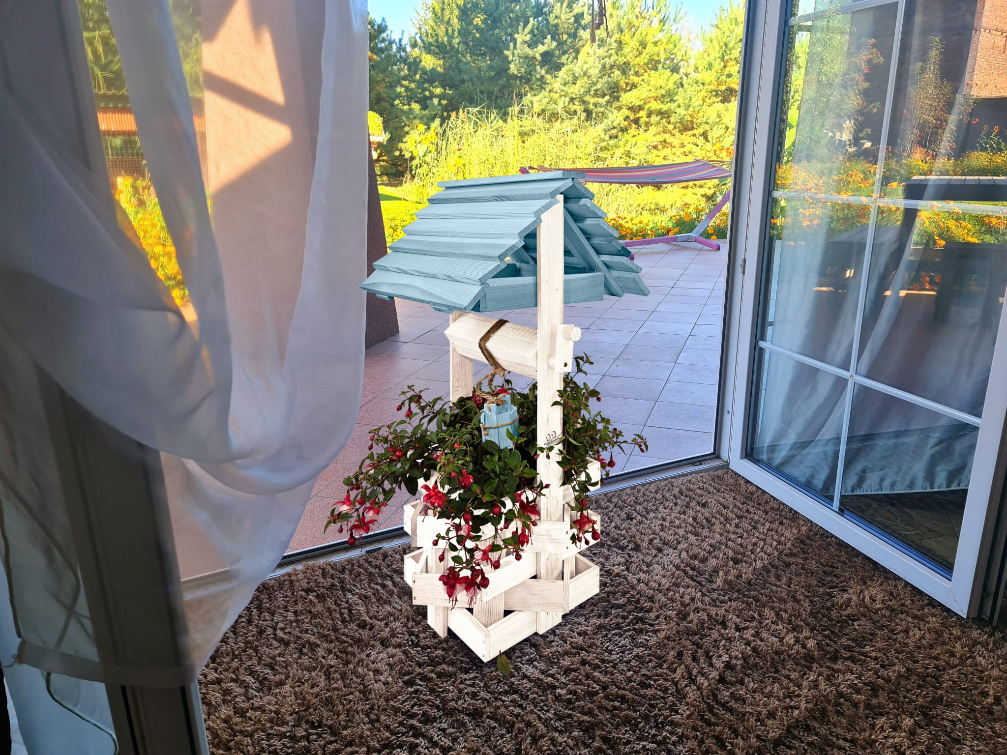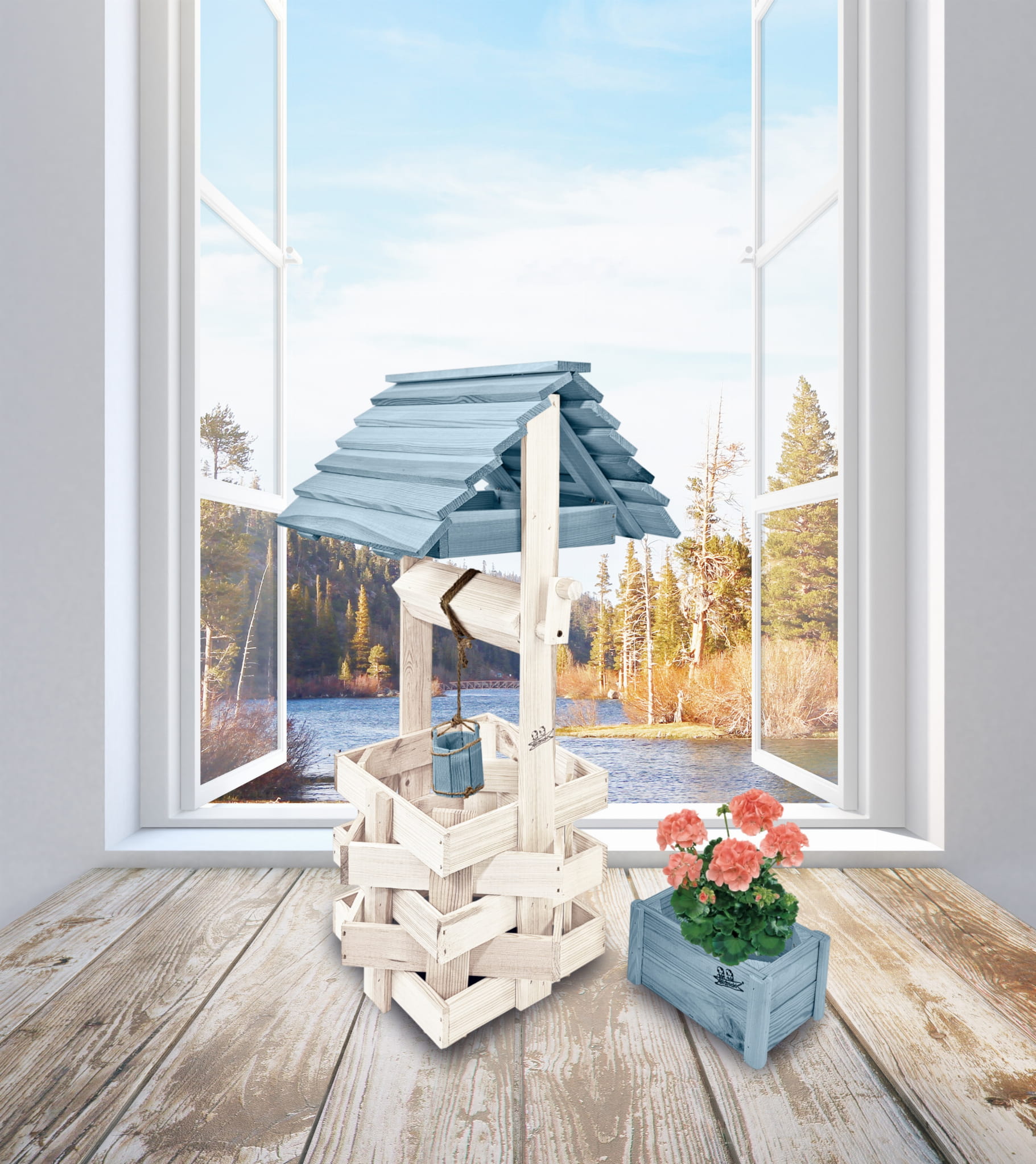 Do studni dołączona jest drewniana doniczka na kwiaty, utrzymana w tej samej estetyce, tworząc spójną i harmonijną całość.