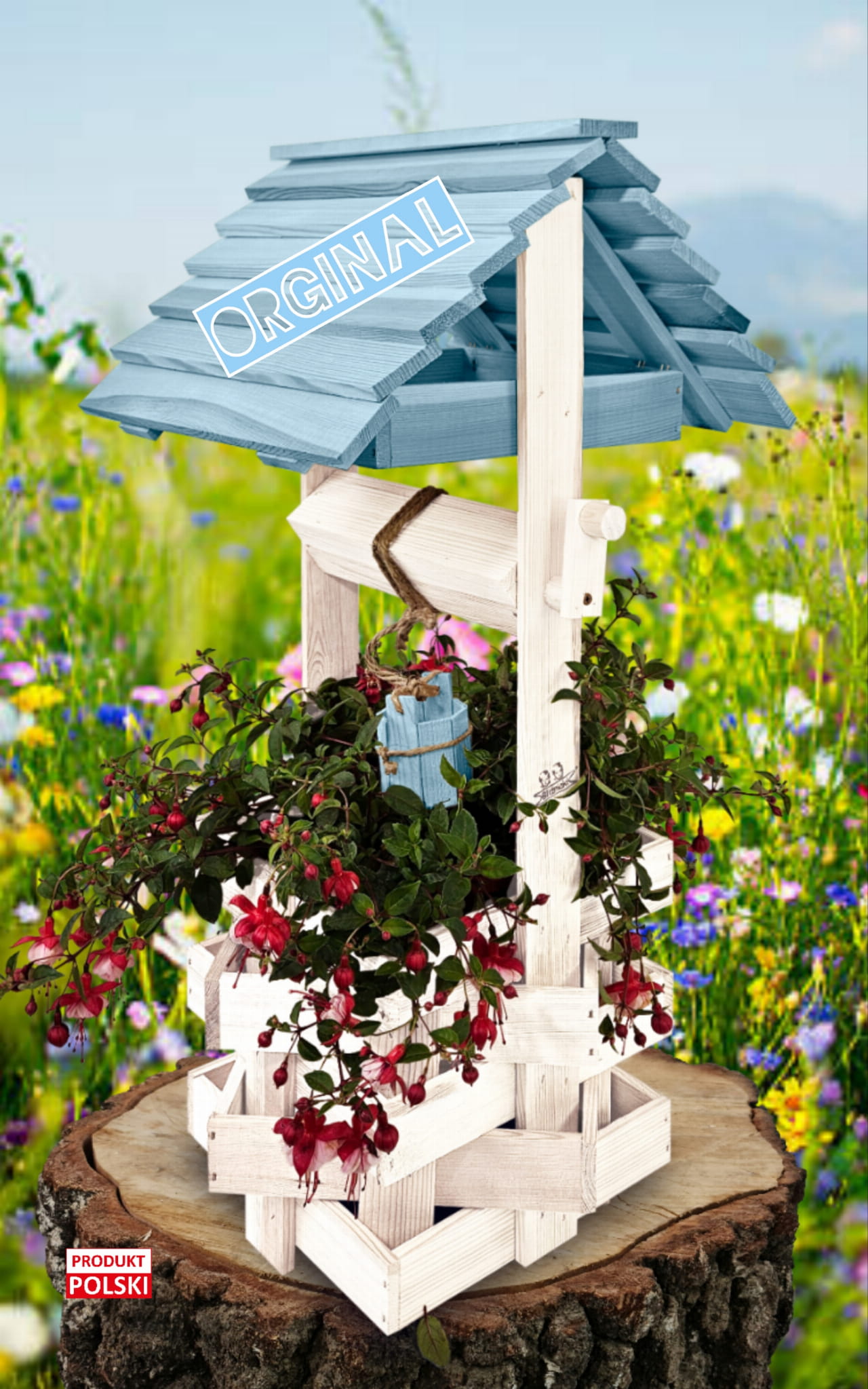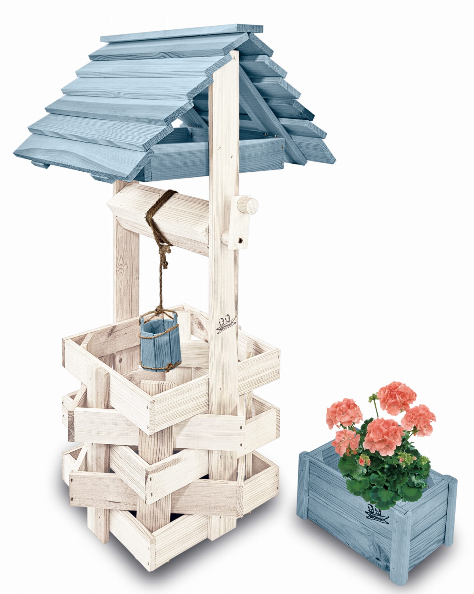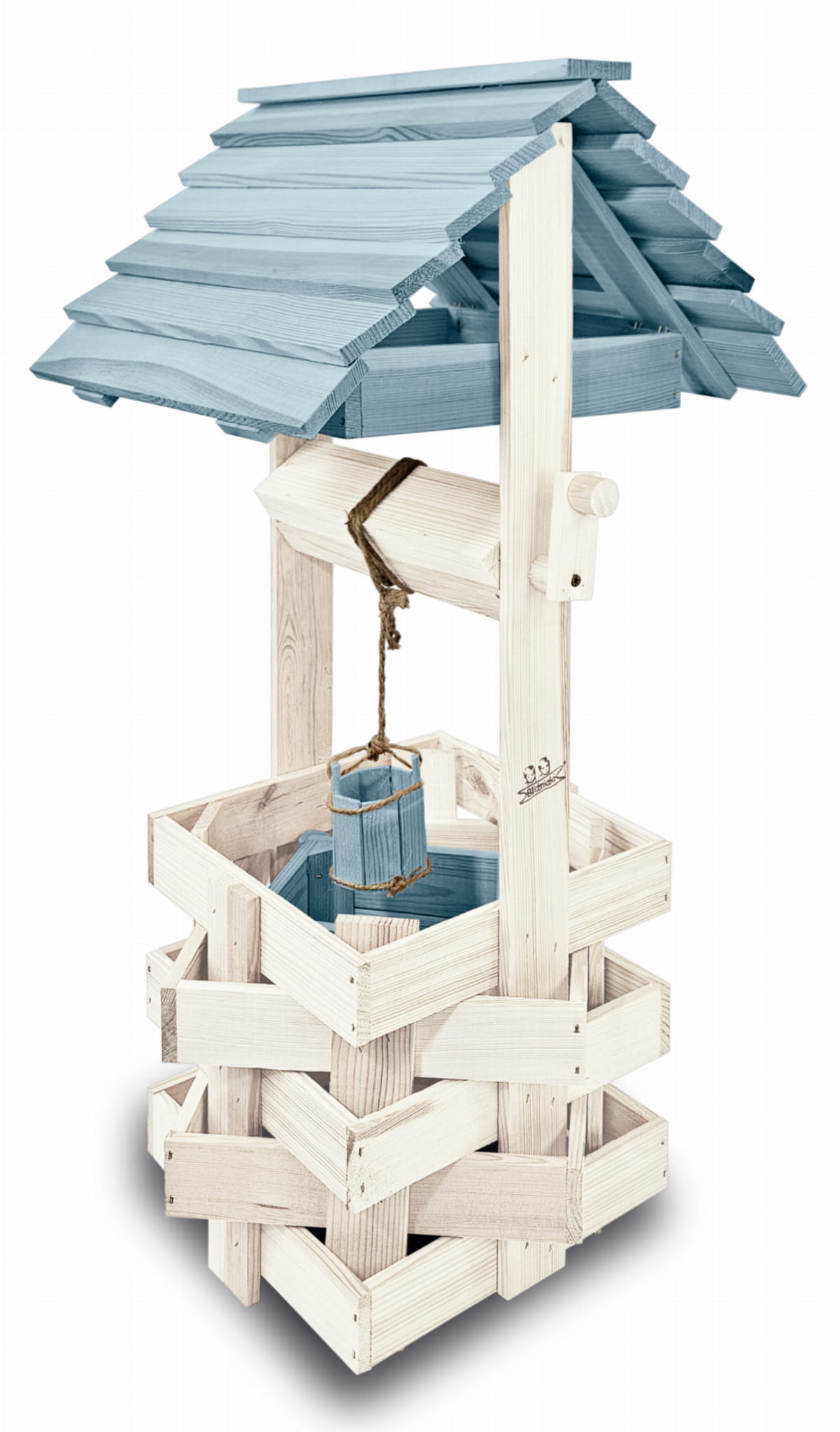 Ozdobna studnia drewniana do domu i ogrodu Studnia ogrodowa Studzienki ozdobne Doniczki Prezent Donica na kwiaty i pnącza Kolor Pastelowy Niebieski Studnie ogrodowe balkonowe Ozdoba Wnętrz i Ogrodu Studzienka na pelargonie Kwietnik SC1 BI NBPP
