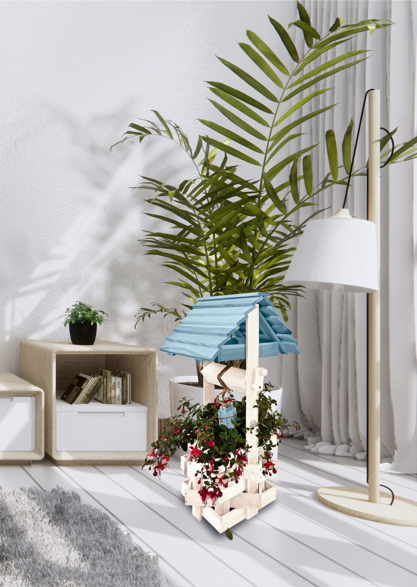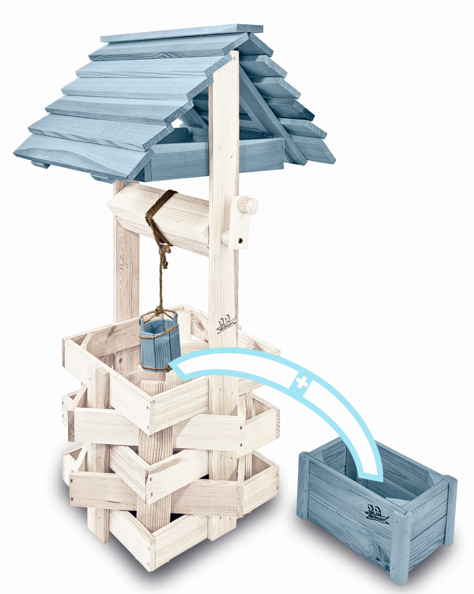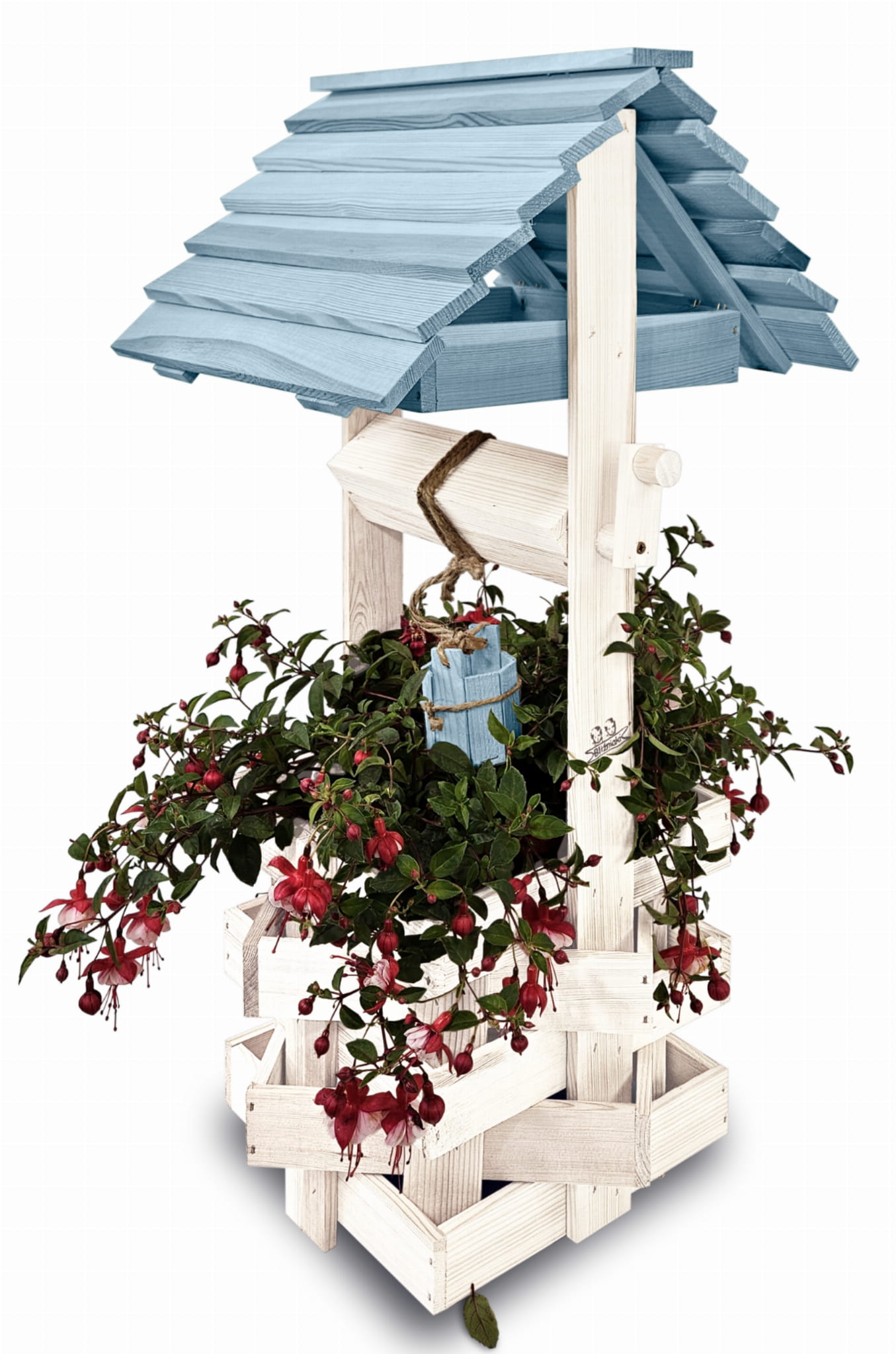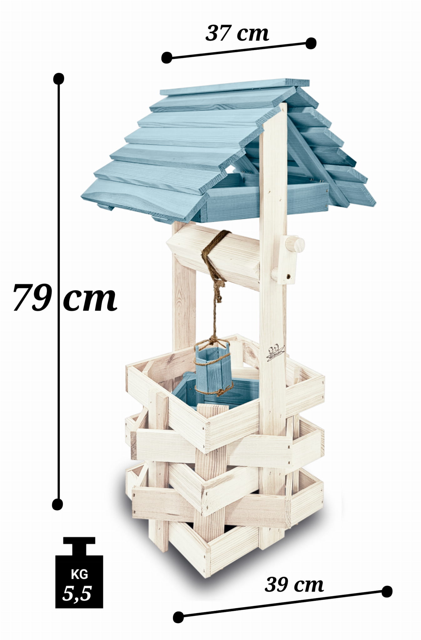 Ozdobna studnia drewniana do domu i ogrodu Studnia ogrodowa Studzienki ozdobne Doniczki Prezent Donica na kwiaty i pnącza Kolor Pastelowy Niebieski Studnie ogrodowe balkonowe Ozdoba Wnętrz i Ogrodu Studzienka na pelargonie Kwietnik SC1 BI NBPP