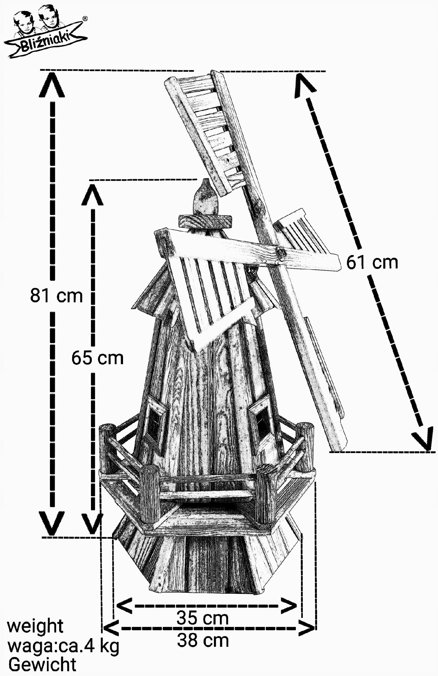 Przedmiotem sprzedaży jest dekoracyjny drewniany wiatrak ogrodowy w całości wykonany z drewna o wysokości 81cm w wielu wersjach kolorystycznych.