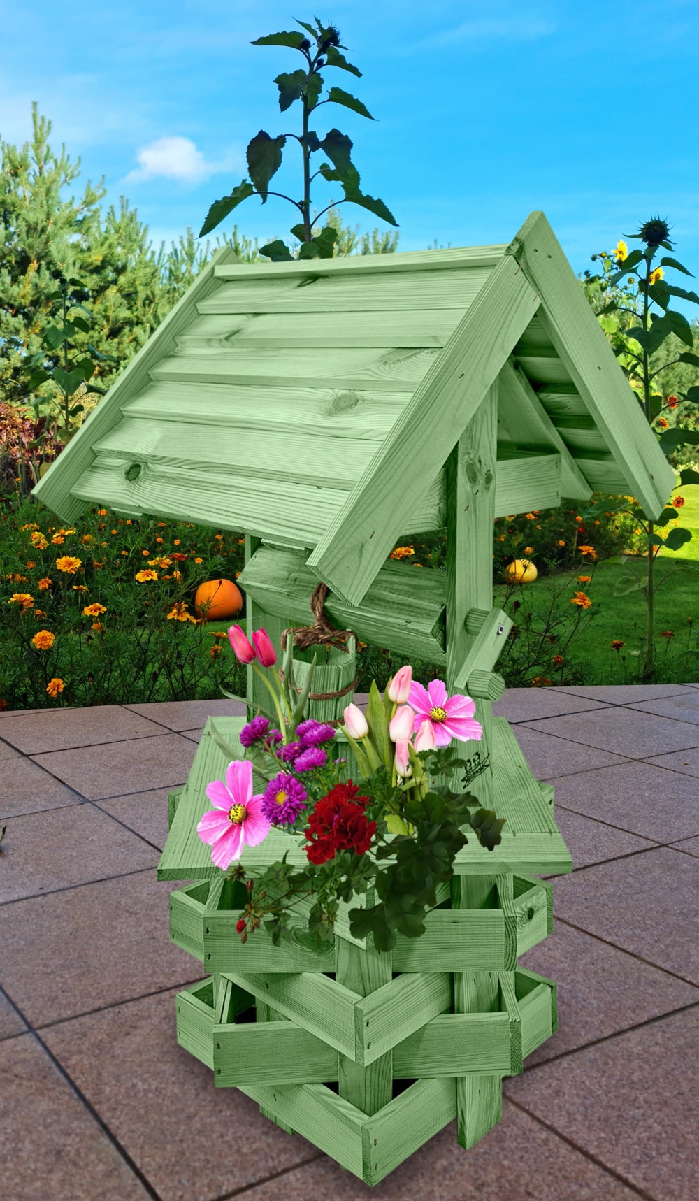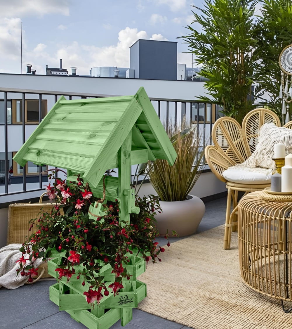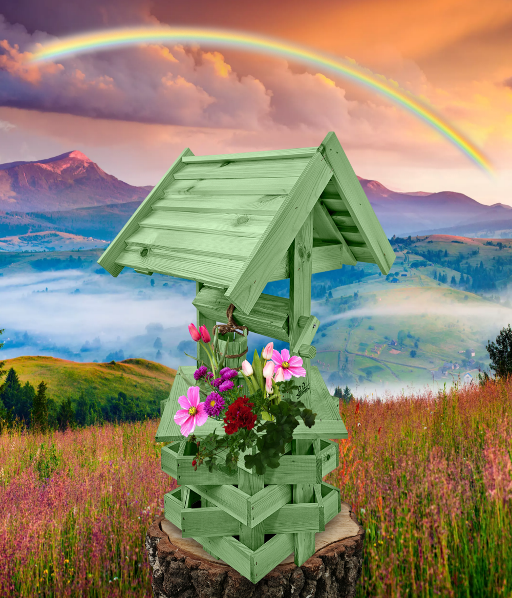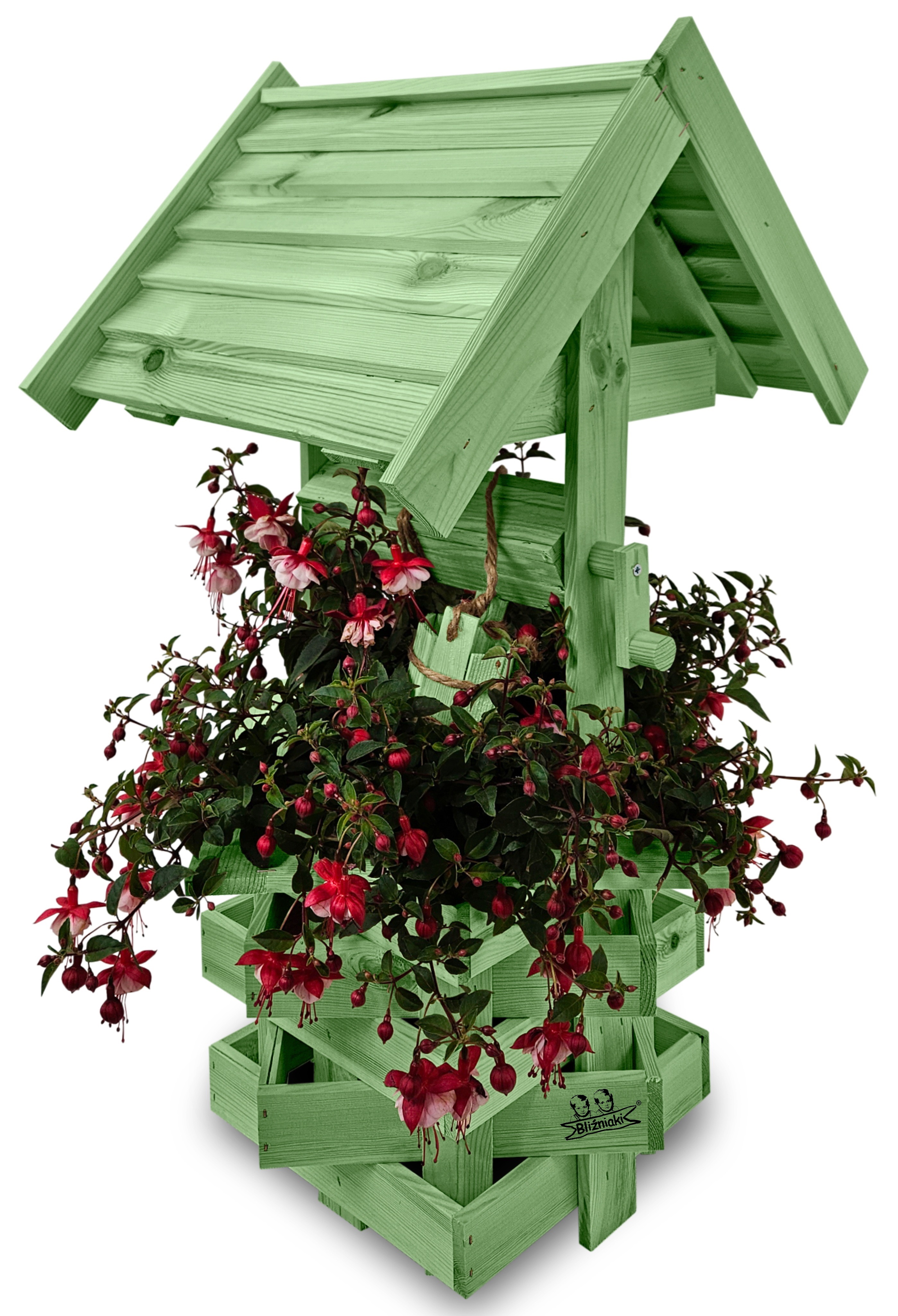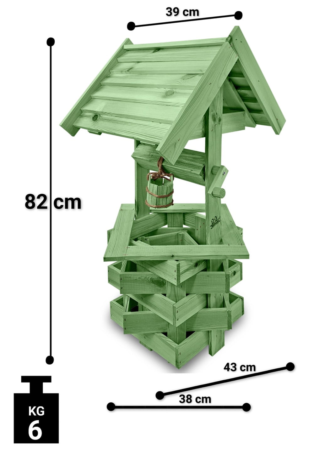 Nasza dekoracyjna studnia w kolorze jasnozielonym wykonana z suszonego drewna sosnowego to nie tylko piękny element dekoracyjny, ale również wyraz ekologicznego podejścia do projektowania ogrodów.