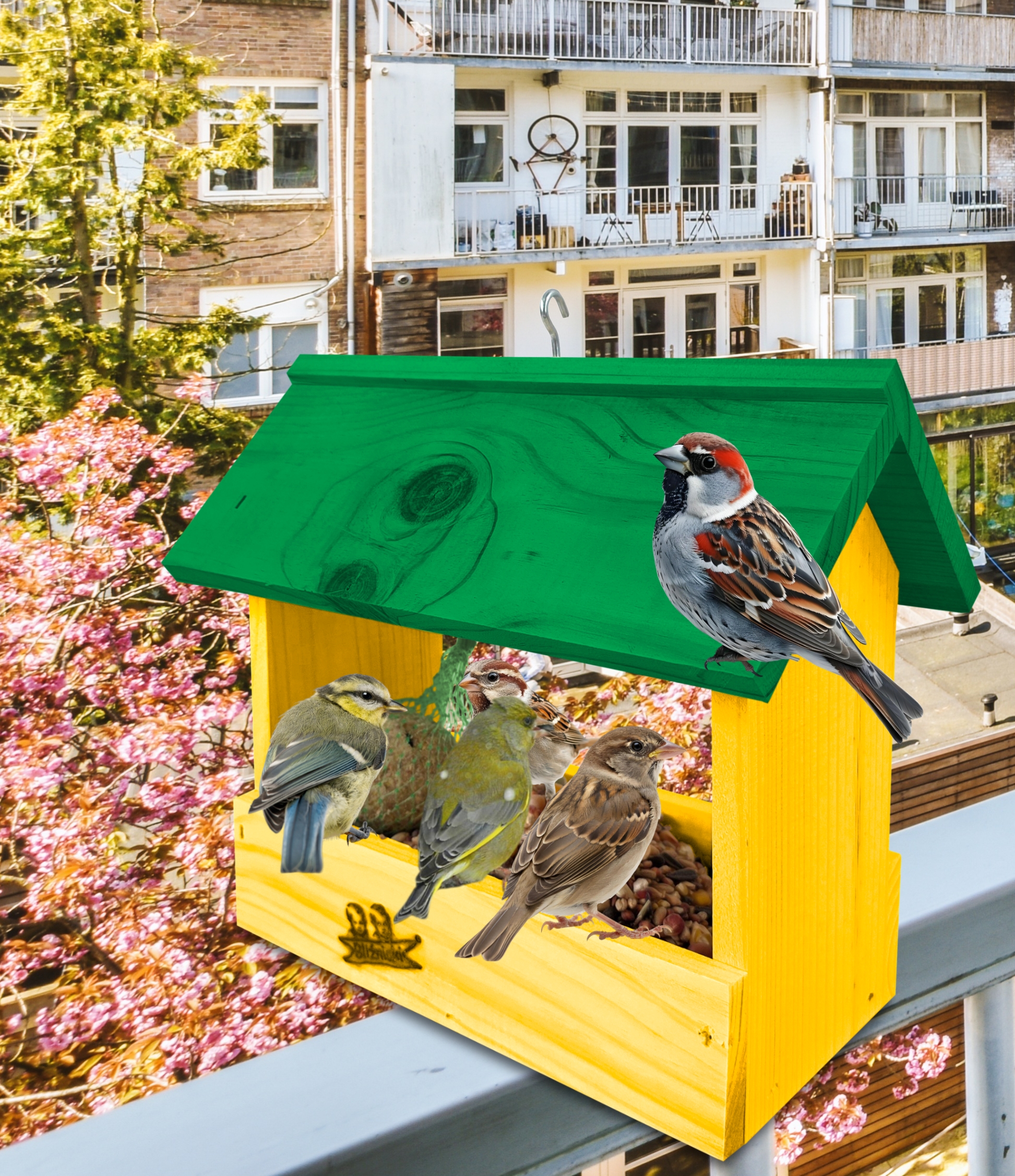 Przedmiotem sprzedaży jest ozdobny drewniany karmnik dla ptaków budka domek na balkon K204 ZB K kolor żółty z zielonym dachem