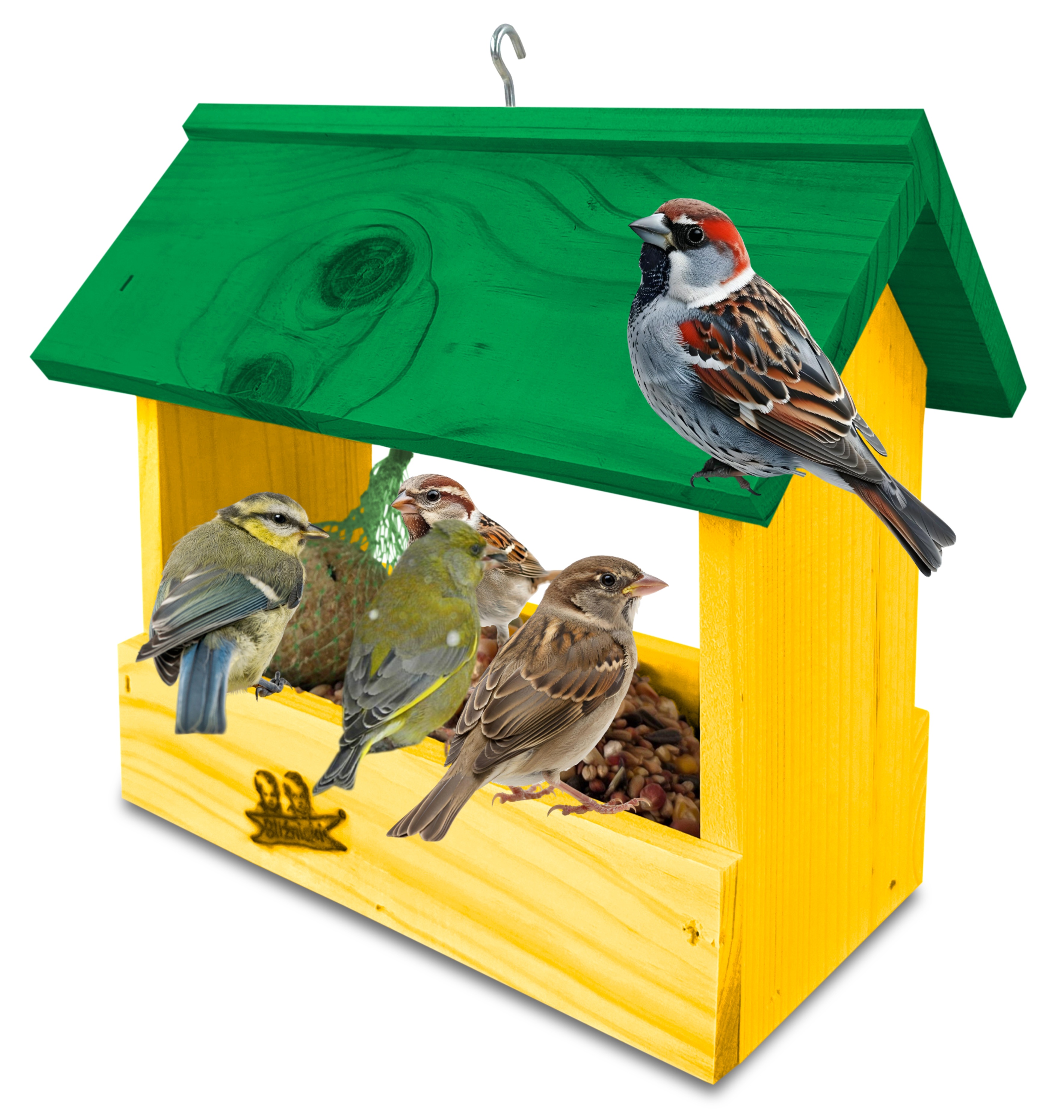 - Karmnik wykonany jest w całości z drewna iglastego, KOLOR ŻÓŁTY Z ZIELONYM DACHEM