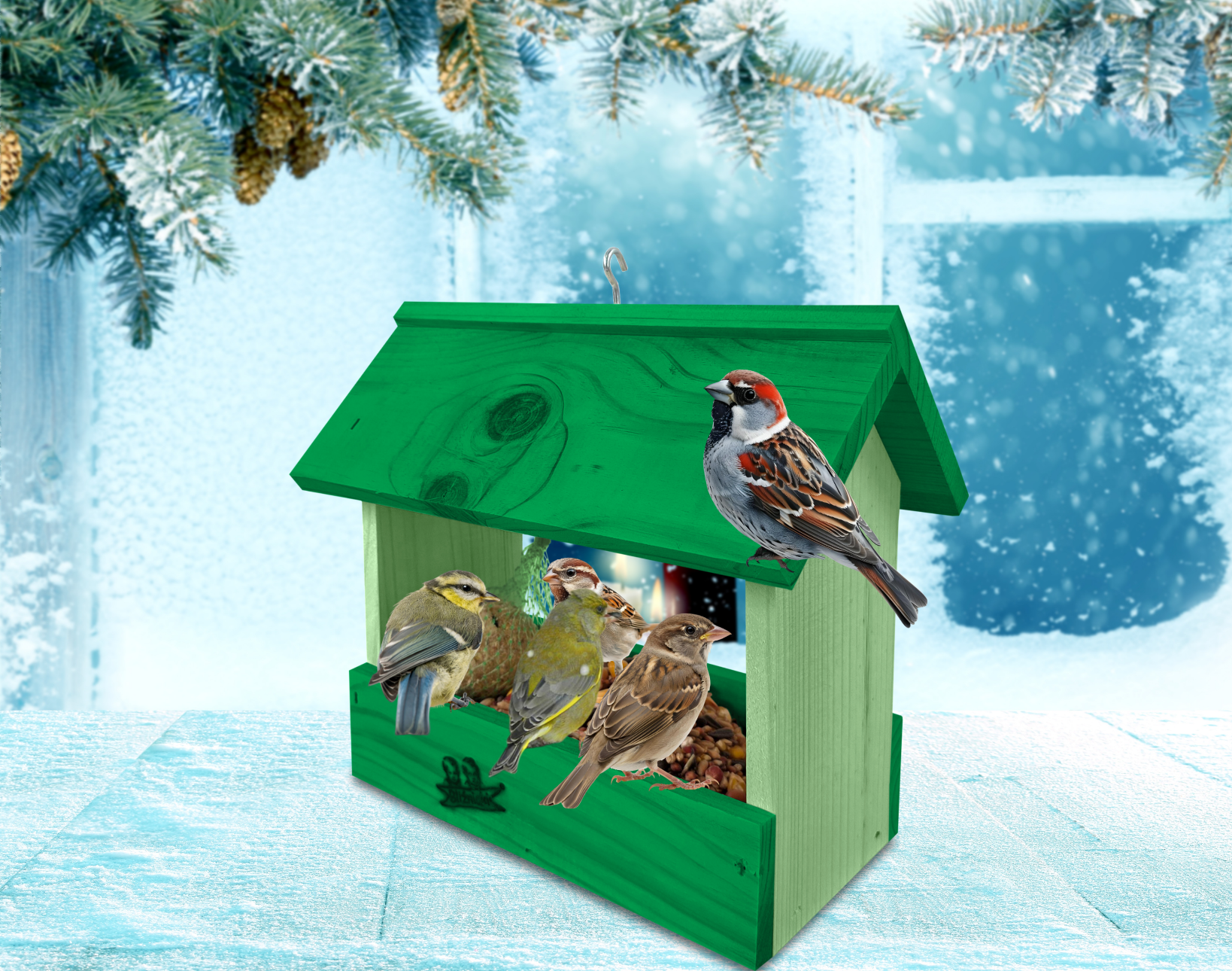 - U góry widoczny jest haczyk umożliwiający zawieszenie karmnika w dowolnym miejscu, możliwe jest również jego postawienie