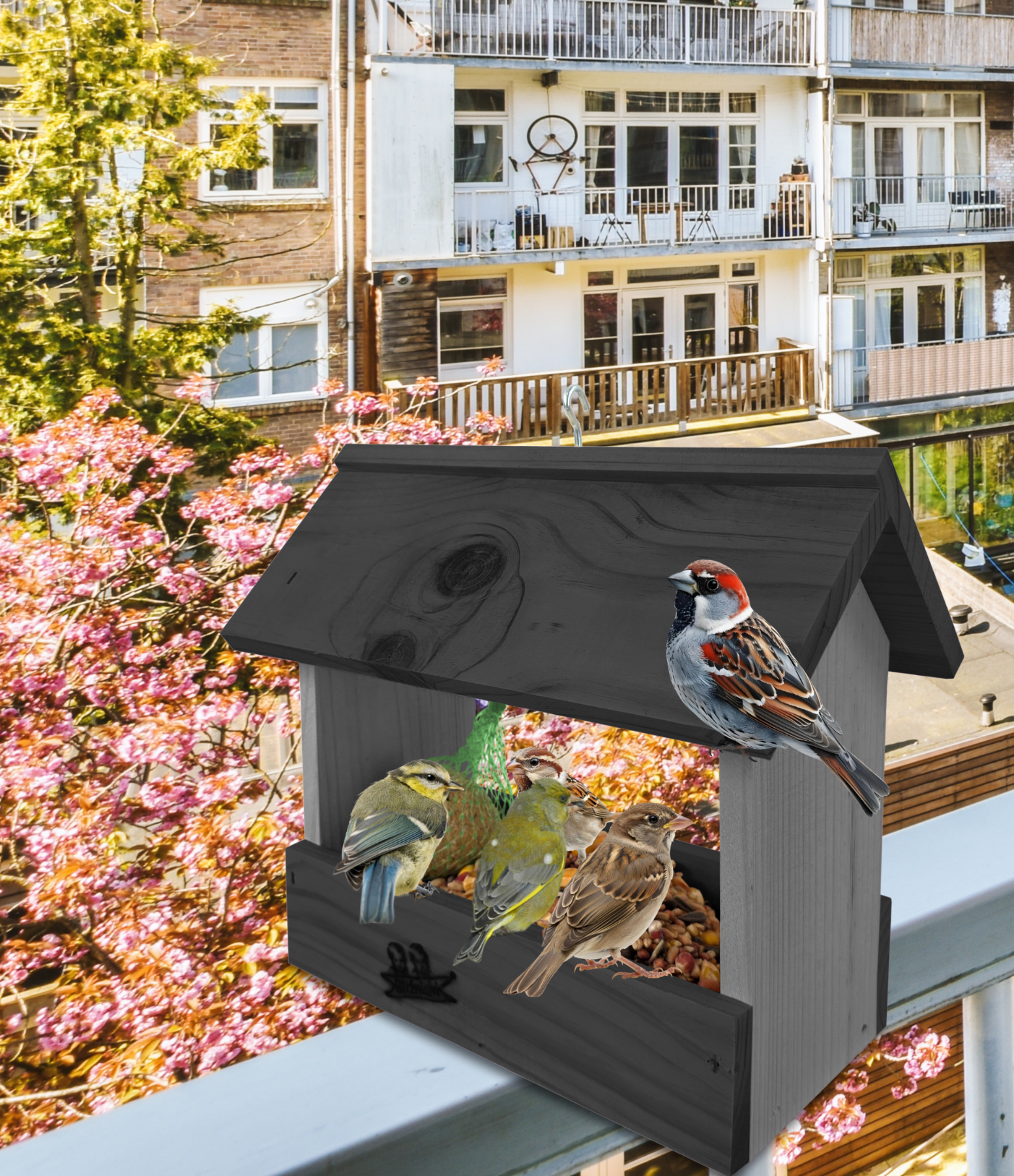 Przedmiotem sprzedaży jest ozdobny drewniany karmnik dla ptaków budka domek na balkon K204a SN CZ w dwóch kolorach - szary i czarny
