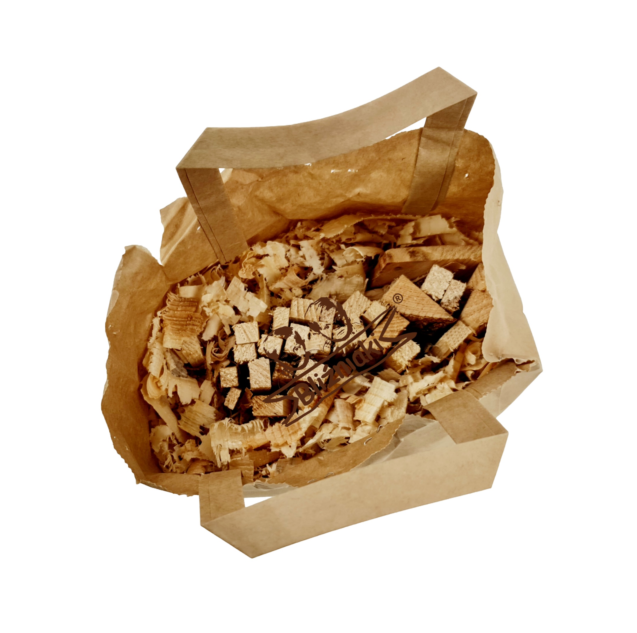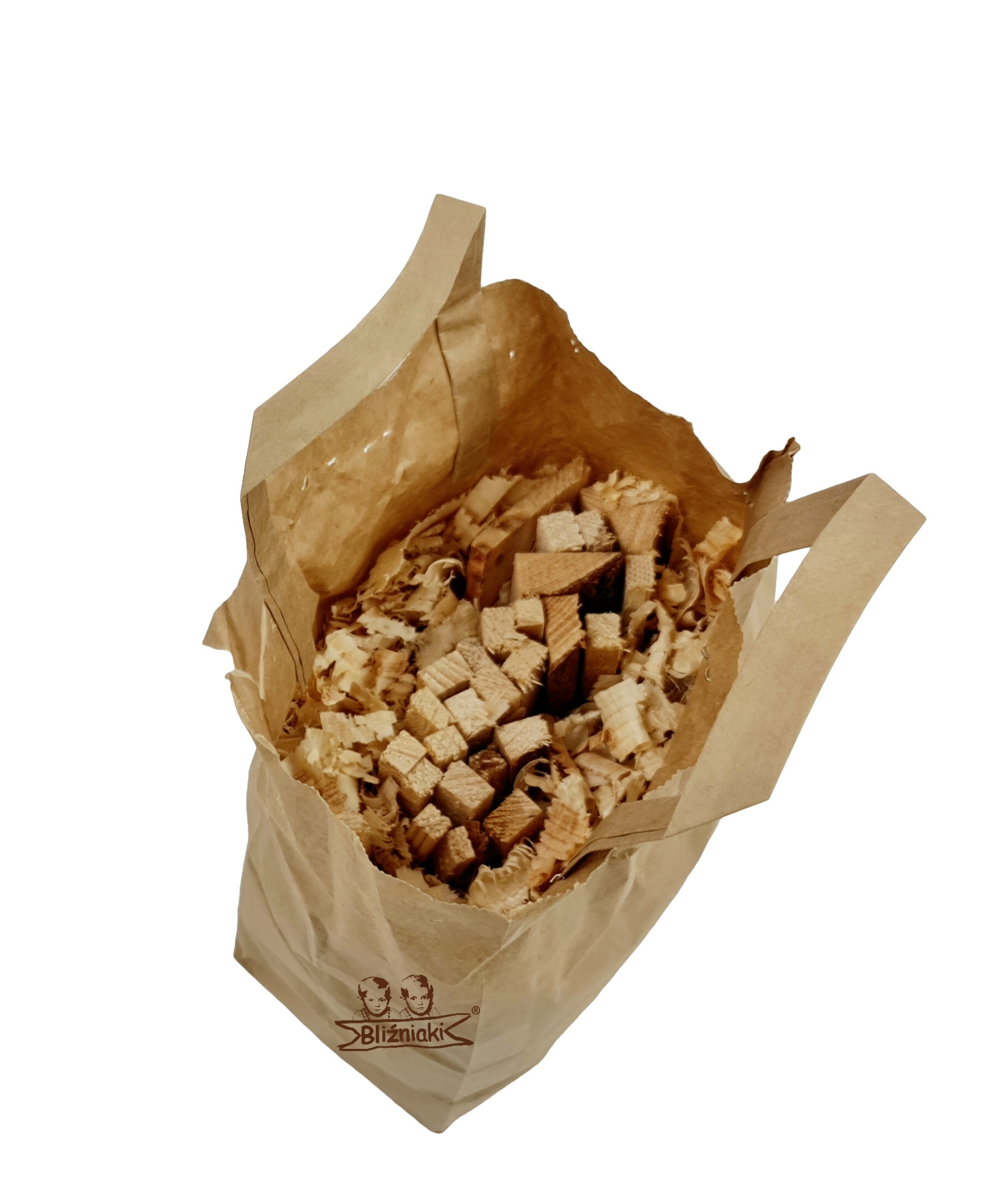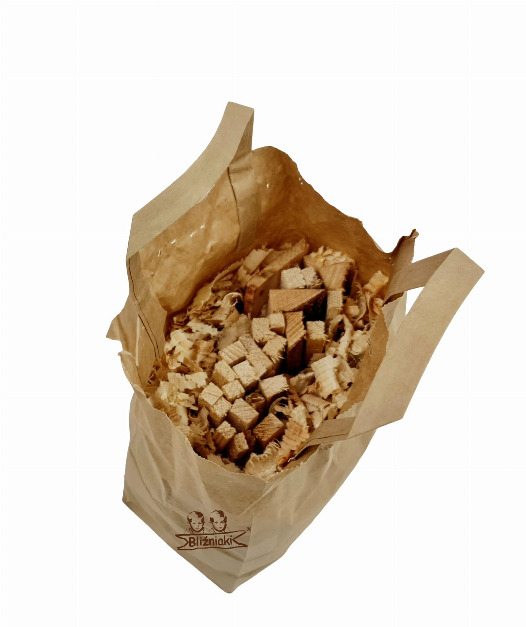 - Zawartość to mieszanka trocin, drobnych rozpałek, kawałków drewnianych oraz kory