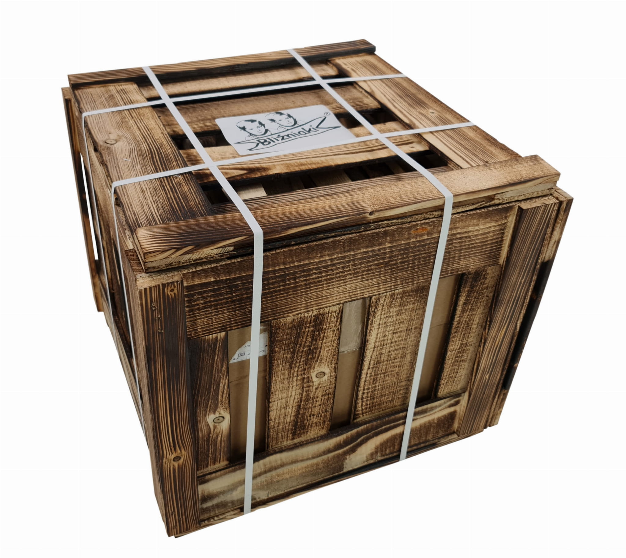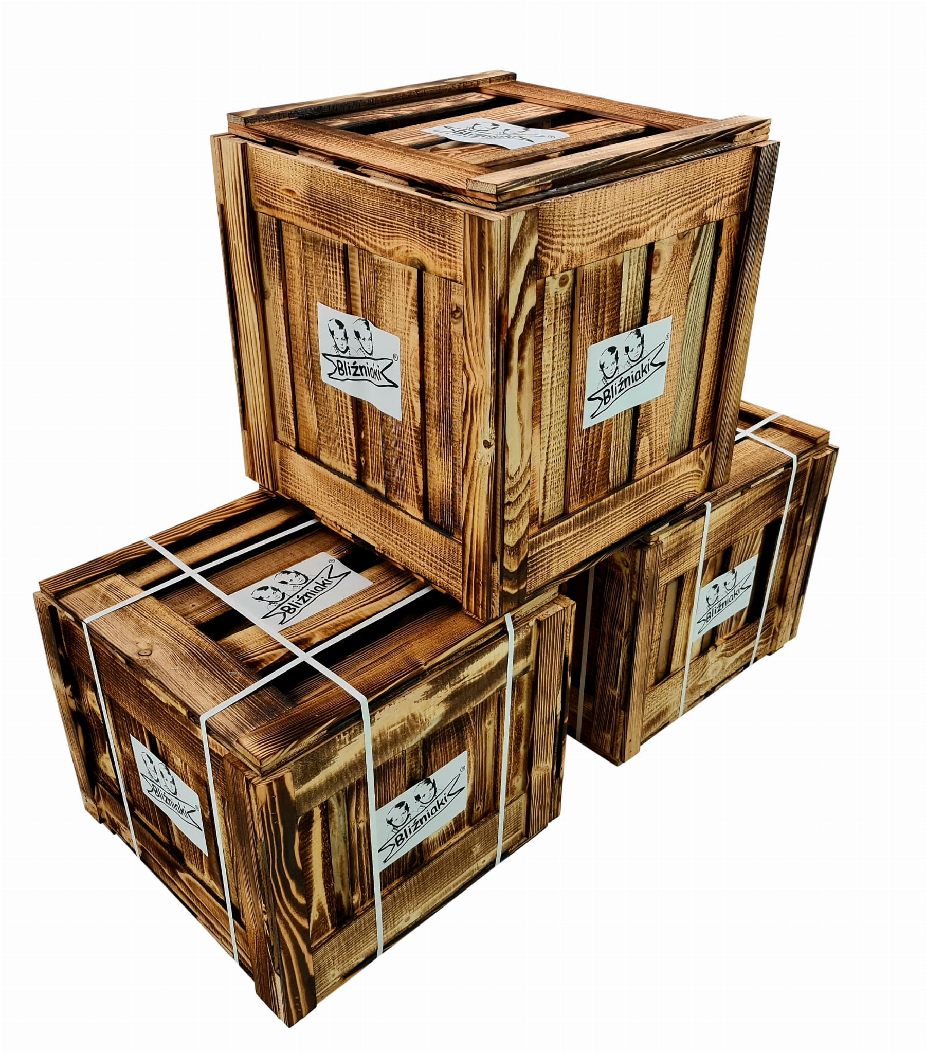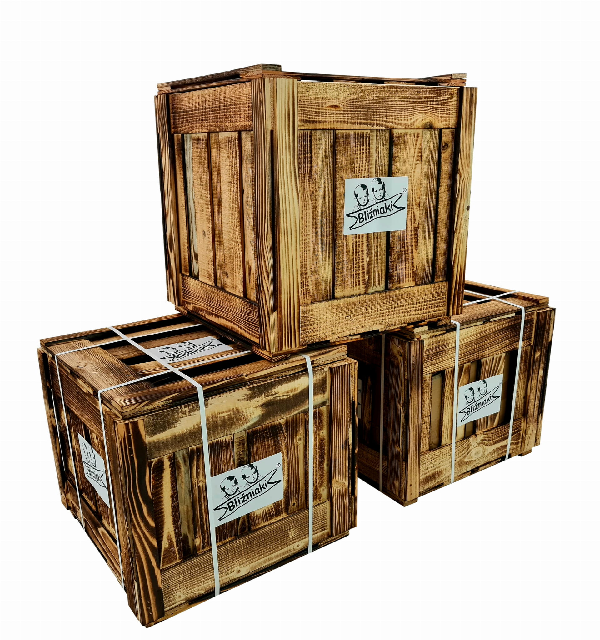 Skrzynia wykonana została w całości drewna. Zabezpieczona metodą opalania ogniem. Jej elegancki wygląd i wytrzymałość sprawia iż może być ona wykorzystywana wielokrotnie.