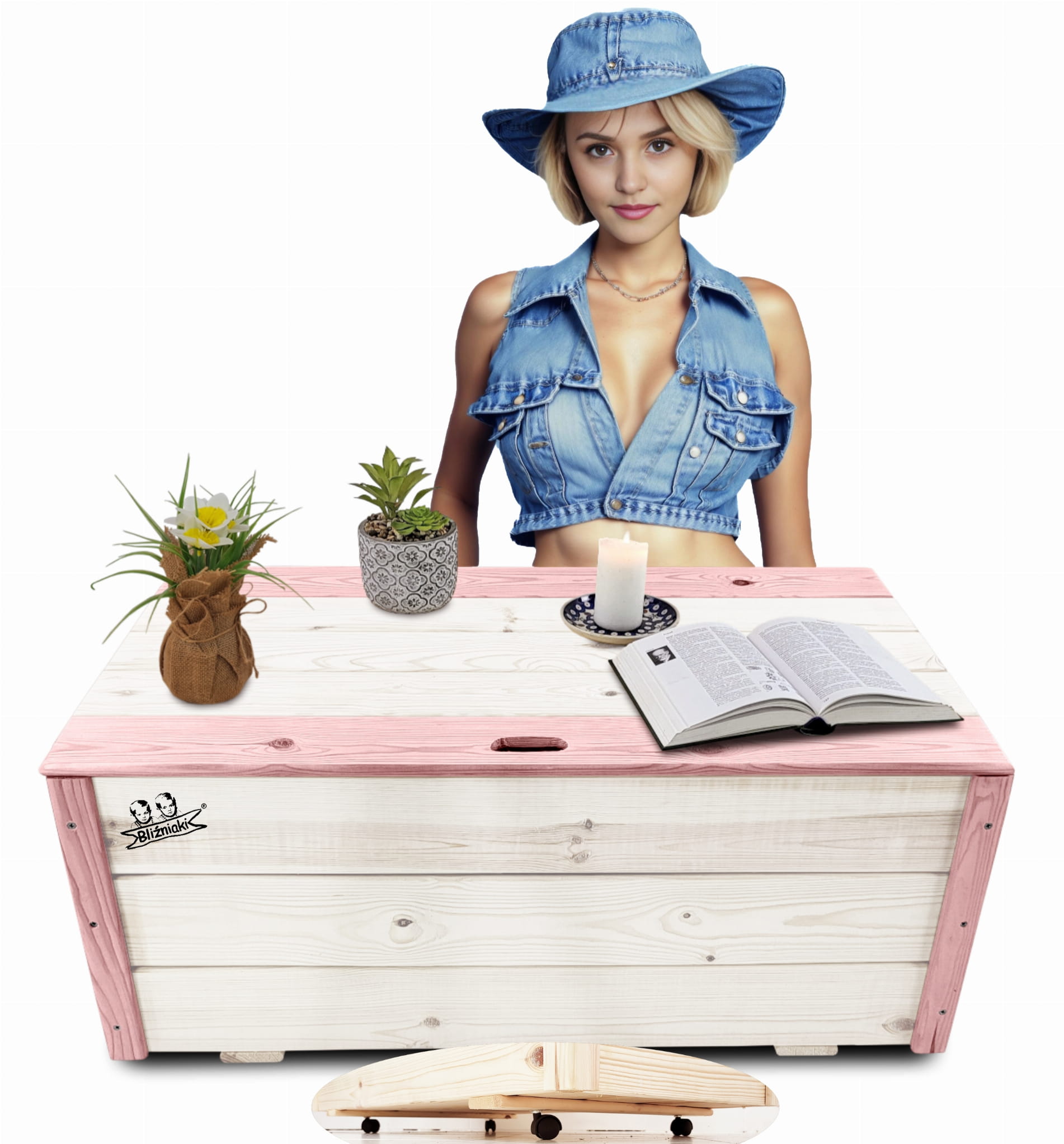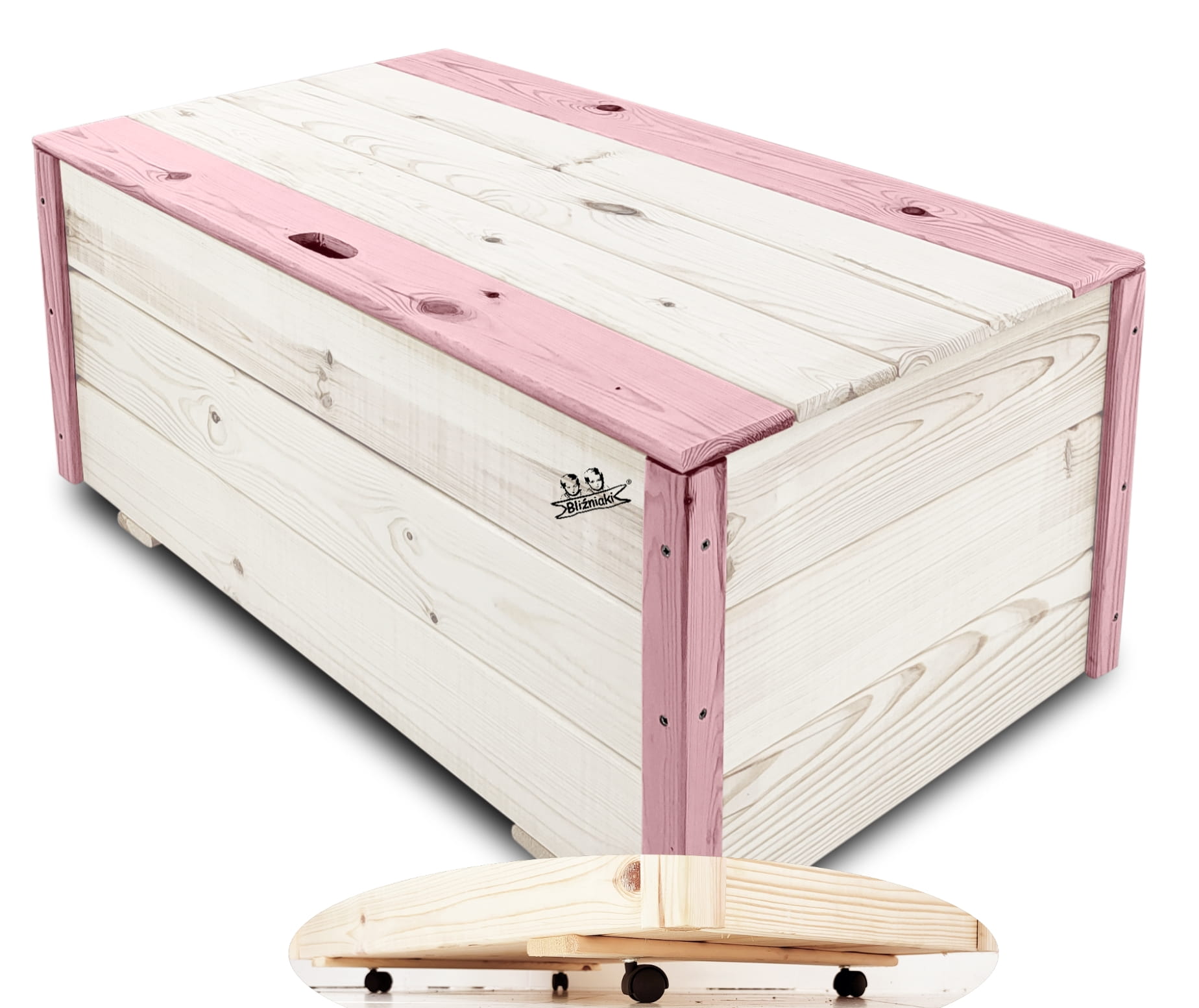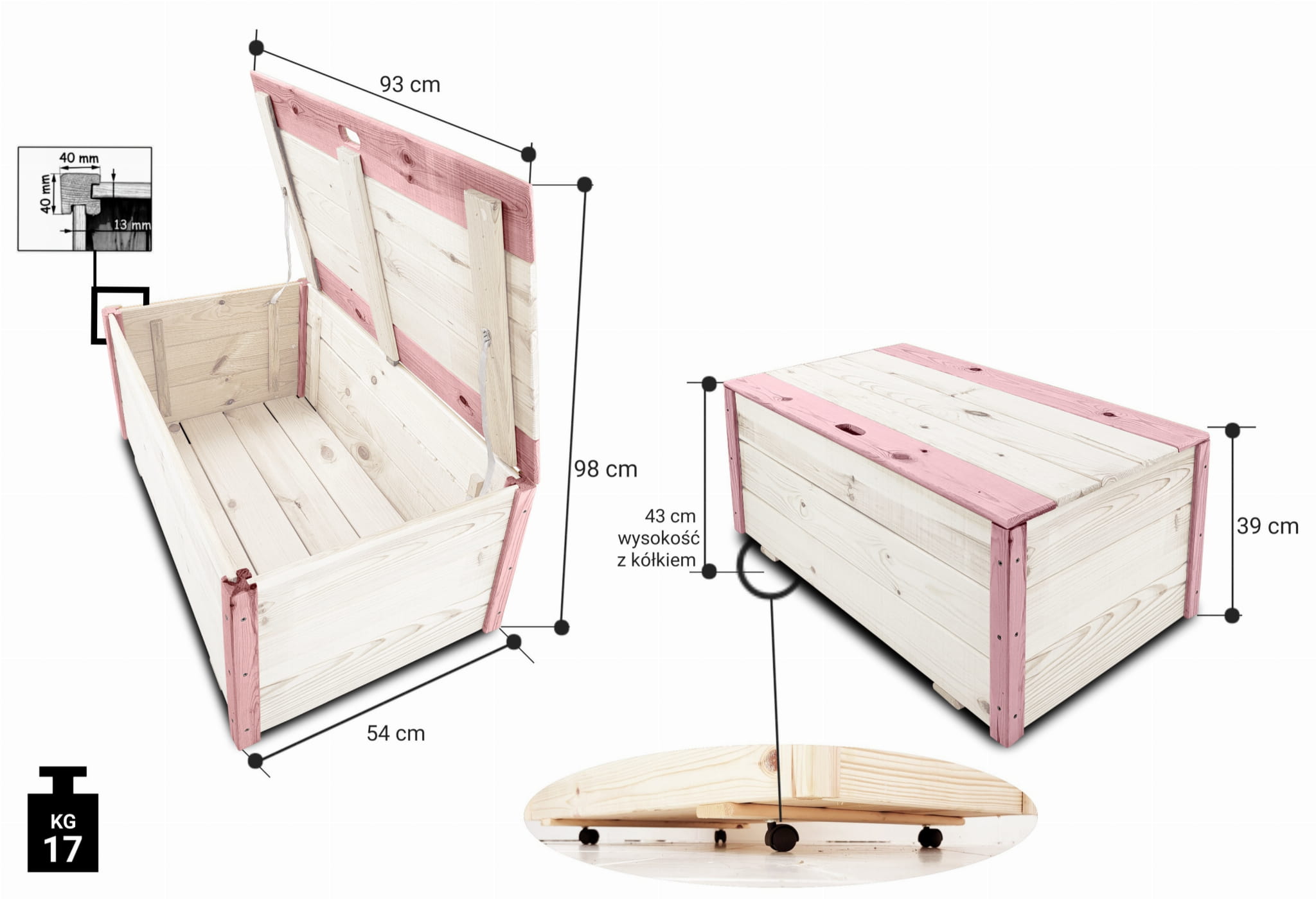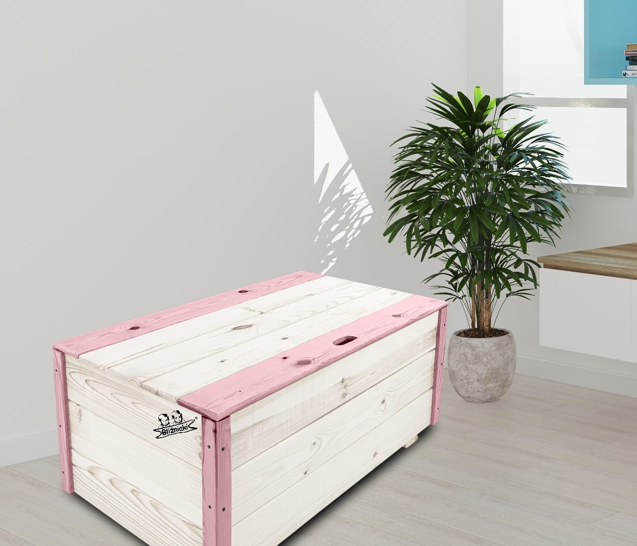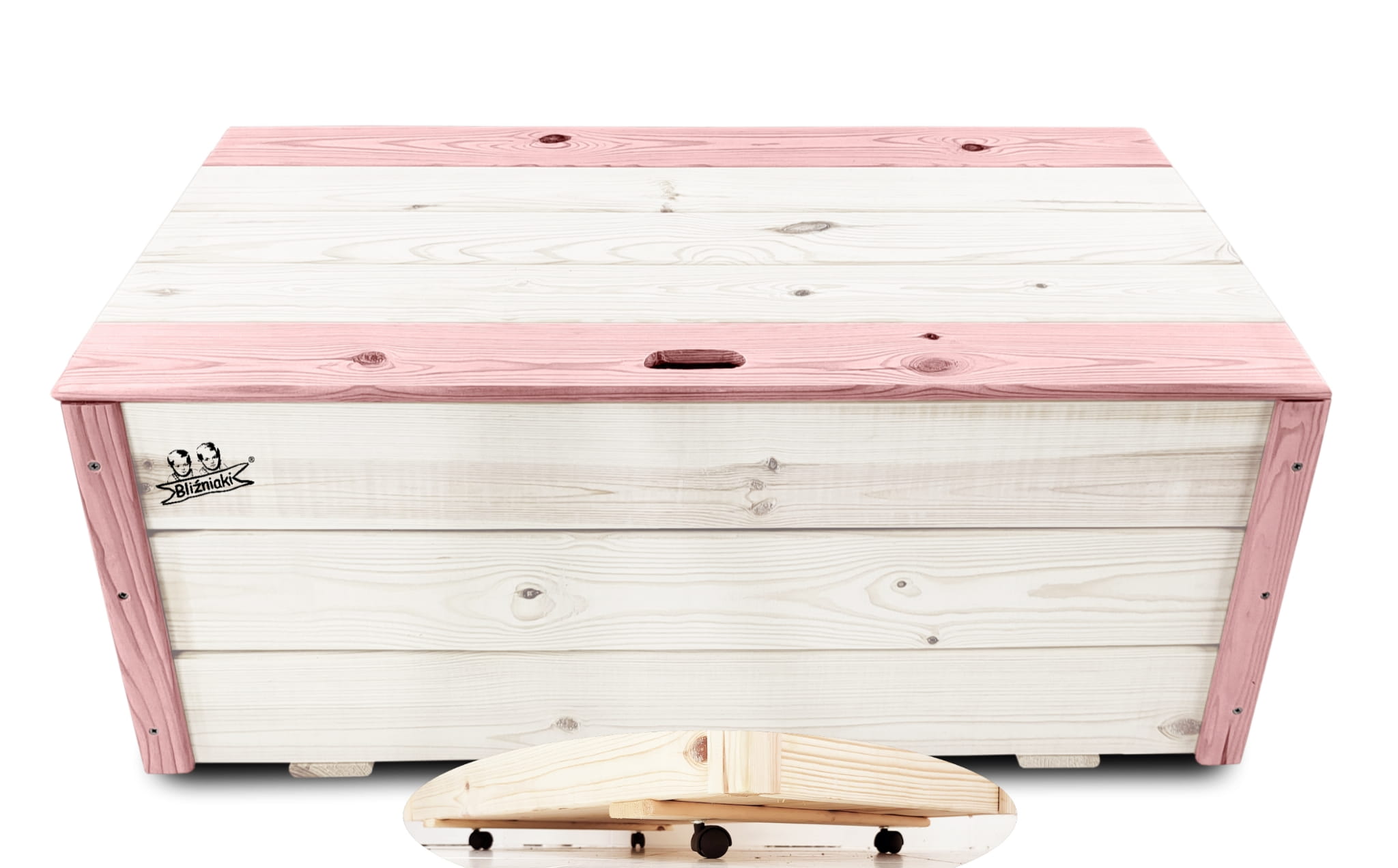 Produkt wykonany został z suszonego drewna sosnowego. Zabezpieczony metodą impregnowania. Środek na bazie wody użyty do impregnacji jest w pełni ekologiczny i bezpieczny dla ludzi i zwierząt. Zabezpieczone w taki sposób drewno sprawia, że skrzynia jest odporna na szkodliwe działanie wody oraz wilgoci, promieni UV, a także grzybów i pleśni, może być więc przechowywana przez cały rok na zewnątrz. Produkt dwukolorowy, w podstawowej przeważającej części w kolorze BIAŁYM, został wykończony w kątownikach i listwach kolorem PASTELOWYM RÓŻOWYM.