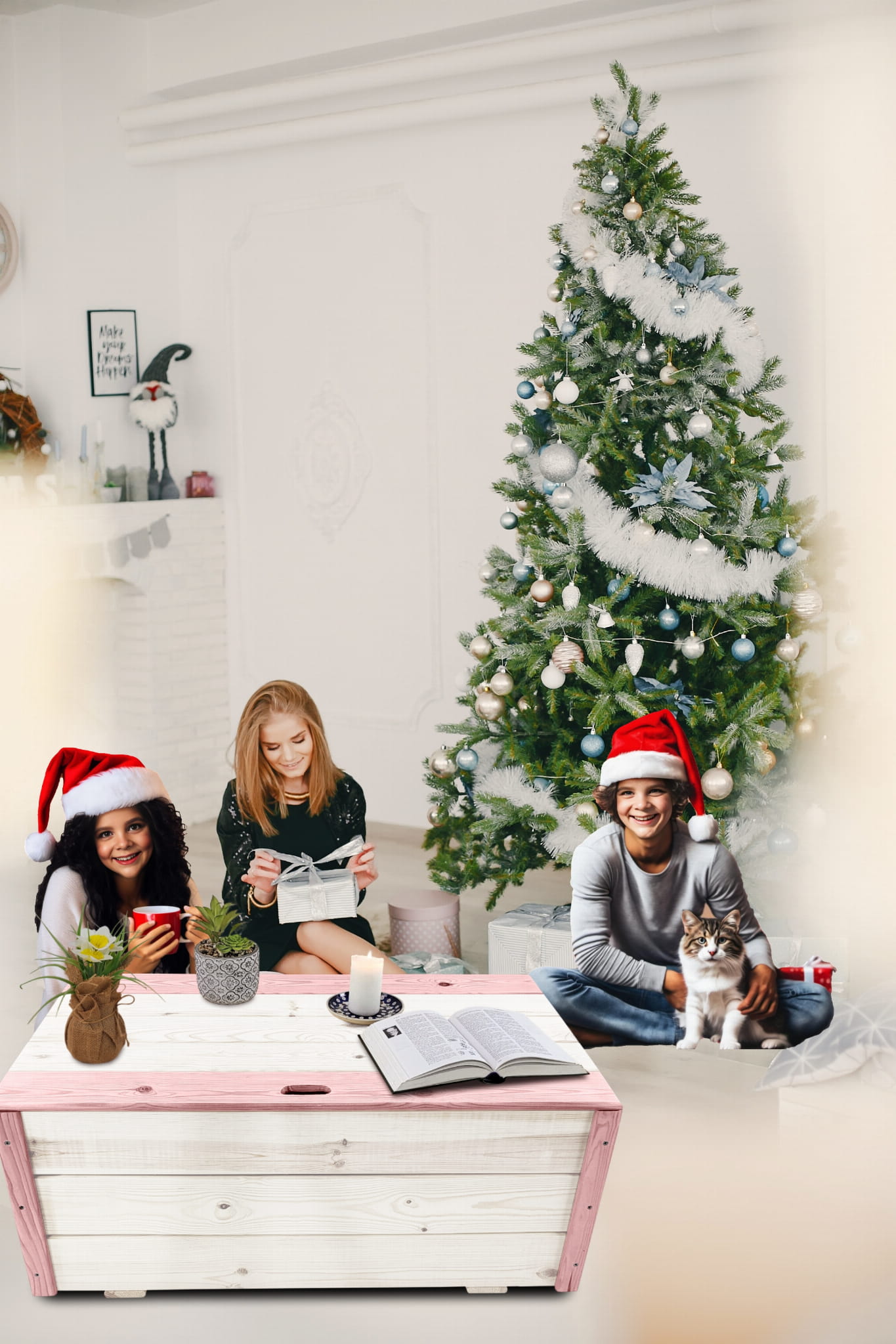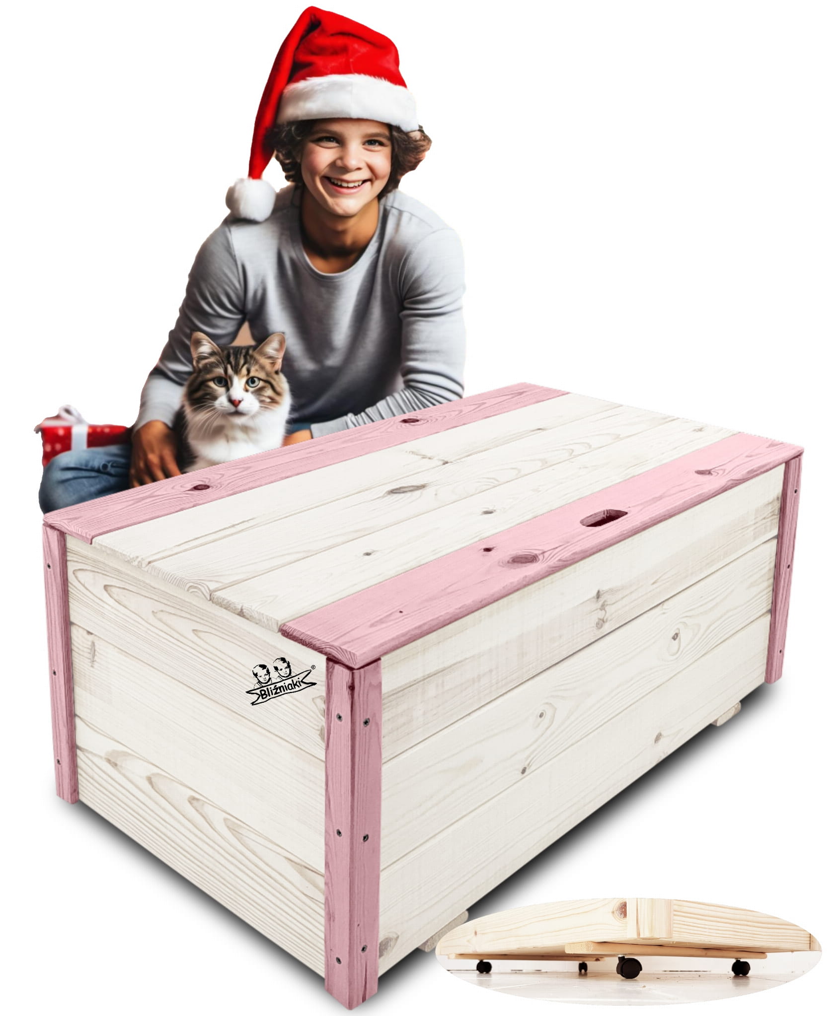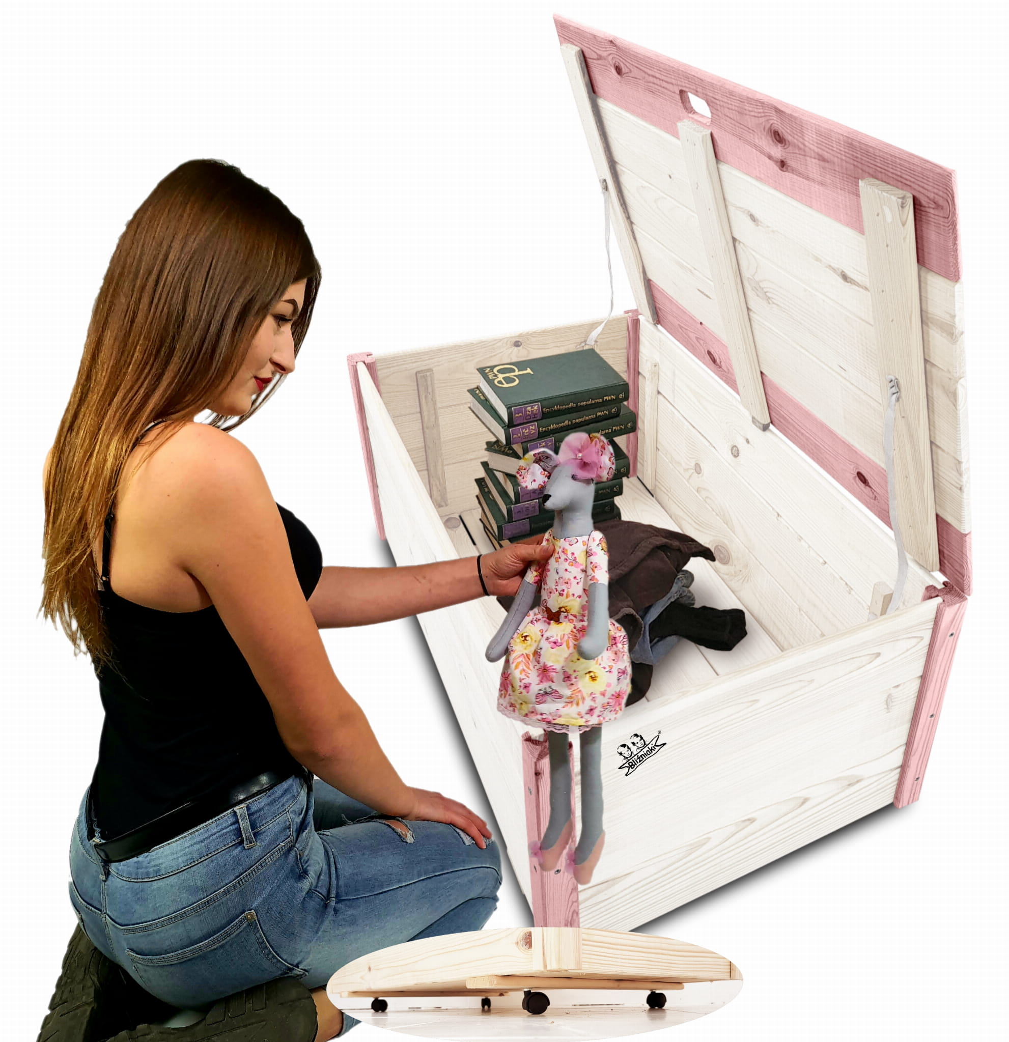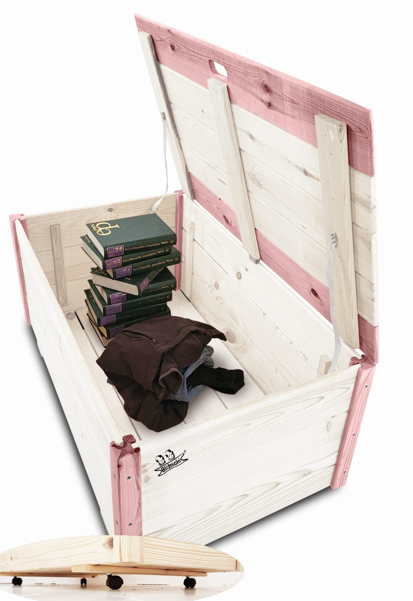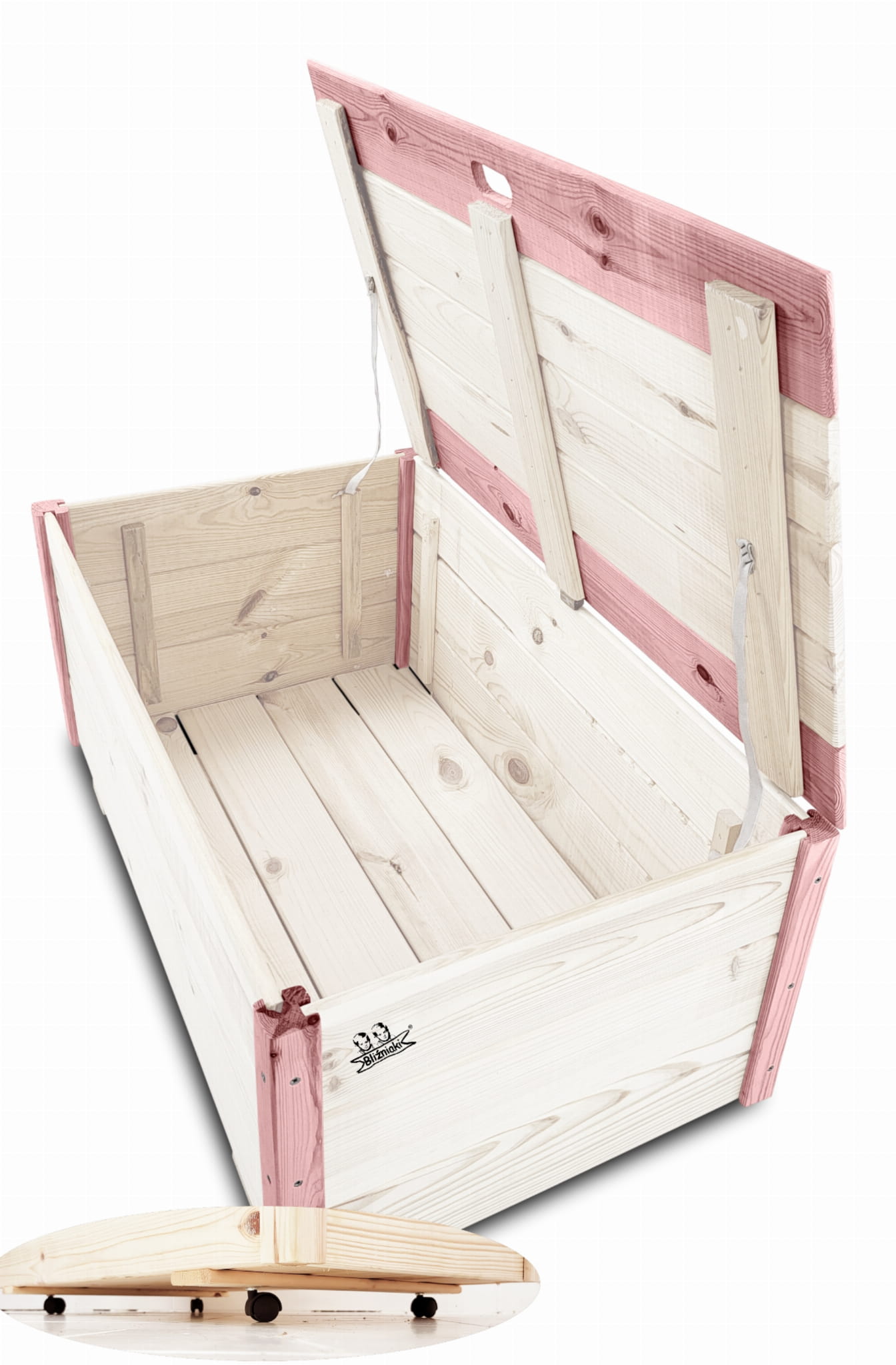 Produkt wykonany został z suszonego drewna sosnowego. Zabezpieczony metodą impregnowania. Środek na bazie wody użyty do impregnacji jest w pełni ekologiczny i bezpieczny dla ludzi i zwierząt. Zabezpieczone w taki sposób drewno sprawia, że skrzynia jest odporna na szkodliwe działanie wody oraz wilgoci, promieni UV, a także grzybów i pleśni, może być więc przechowywana przez cały rok na zewnątrz. Produkt dwukolorowy, w podstawowej przeważającej części w kolorze BIAŁYM, został wykończony w kątownikach i listwach kolorem PASTELOWYM RÓŻOWYM.