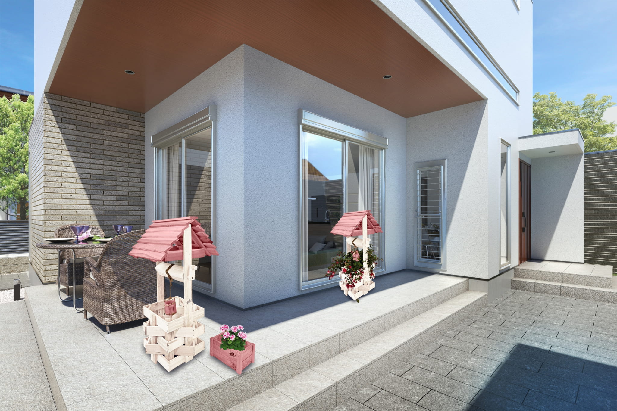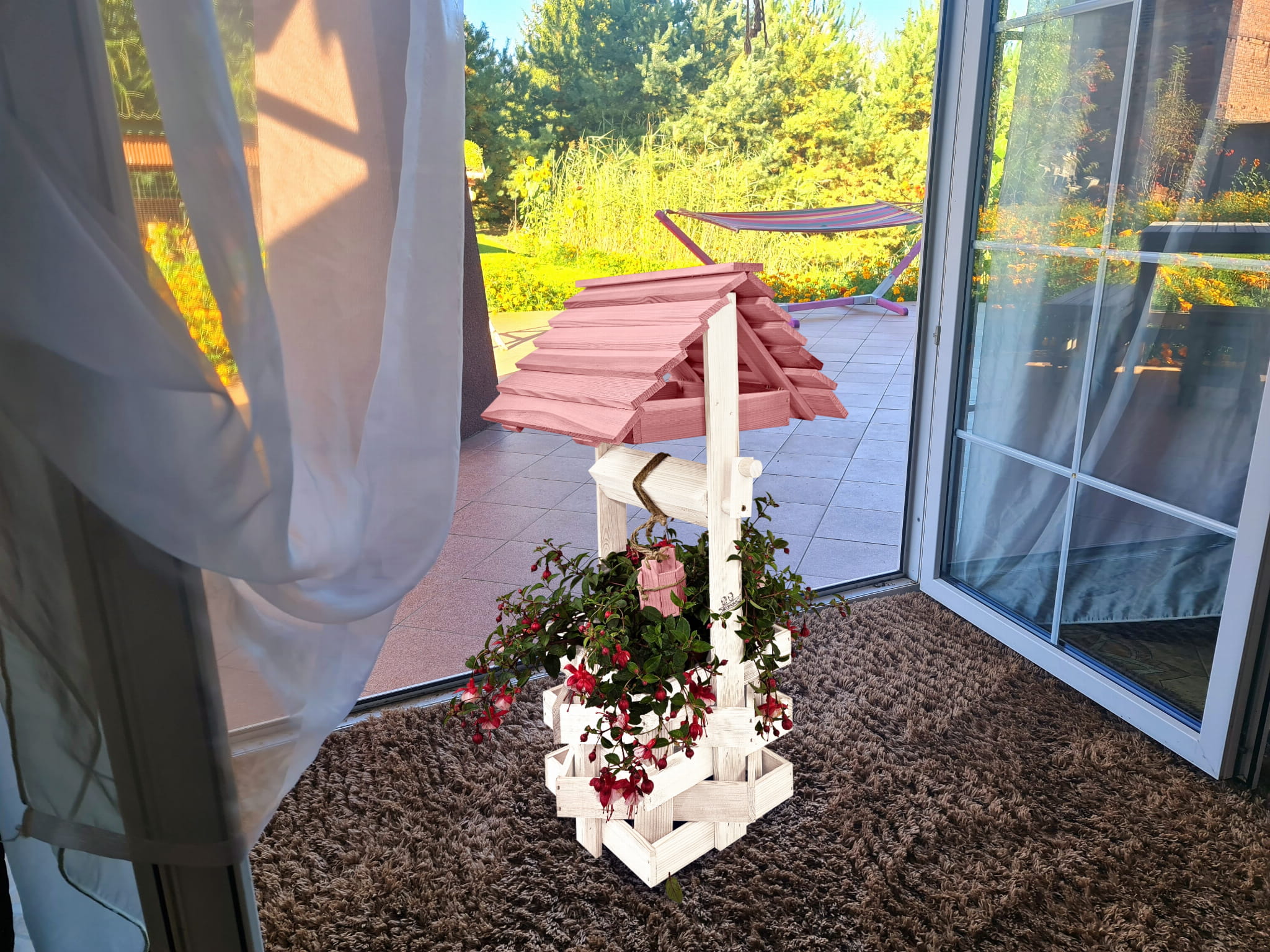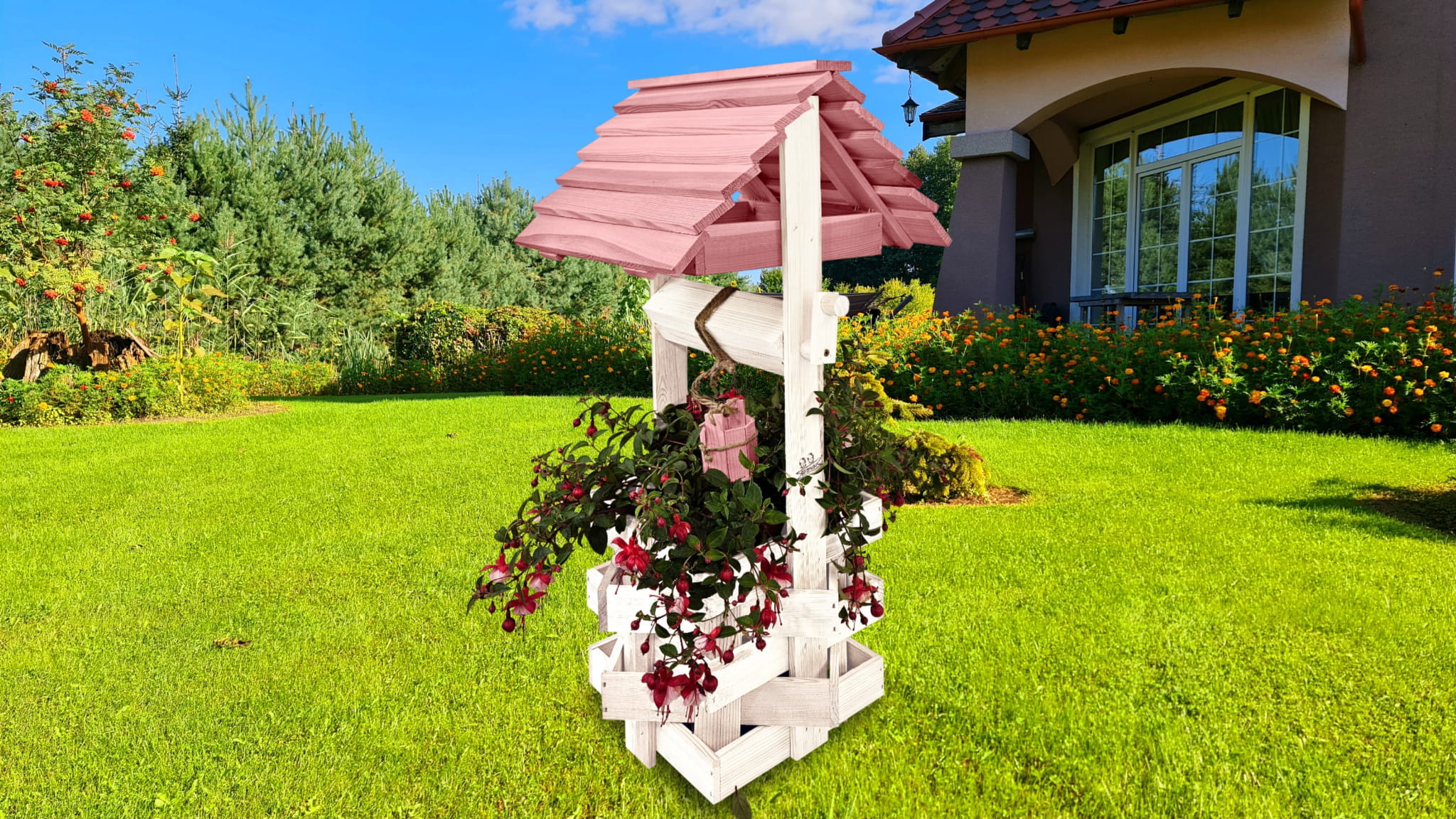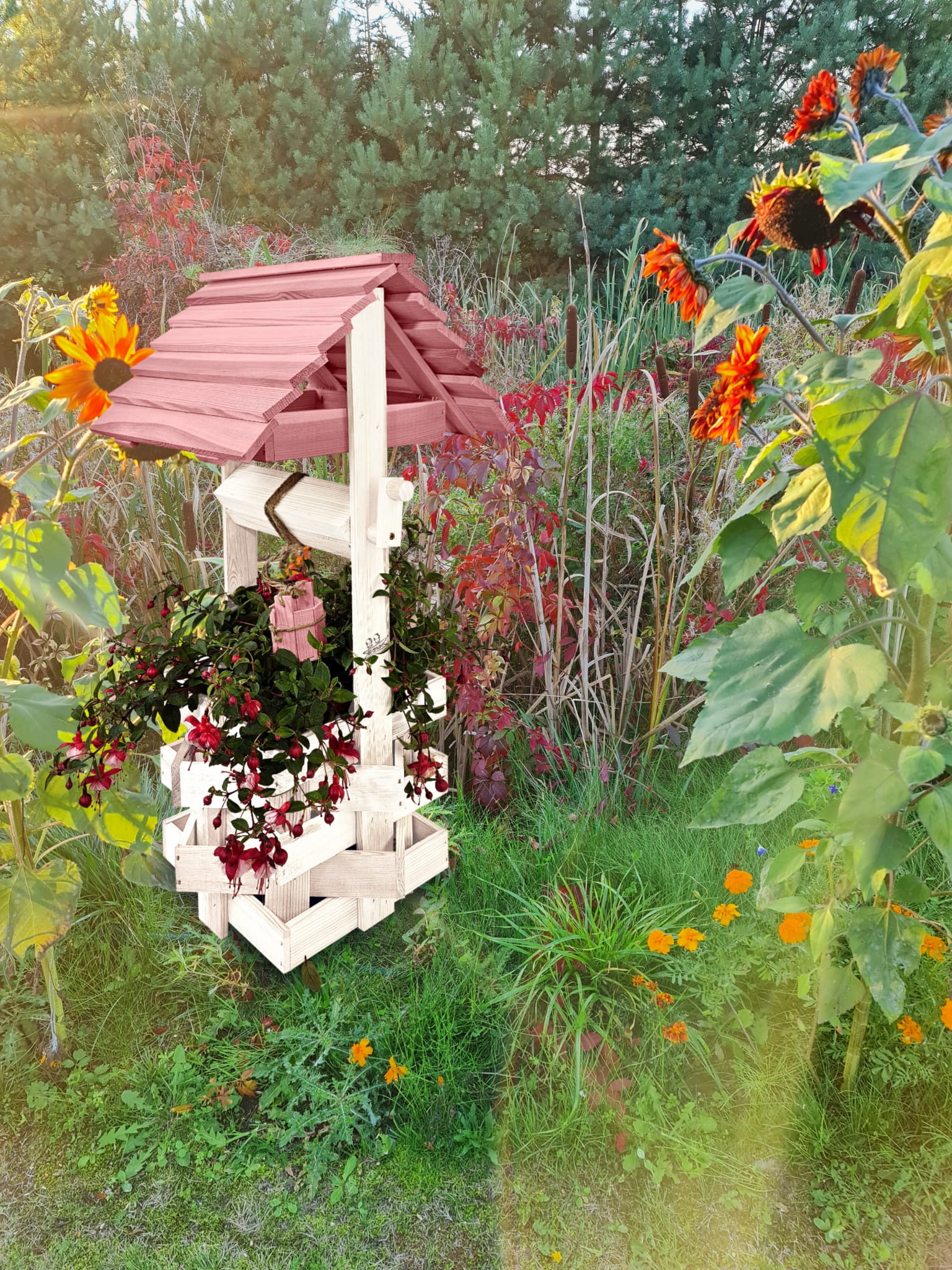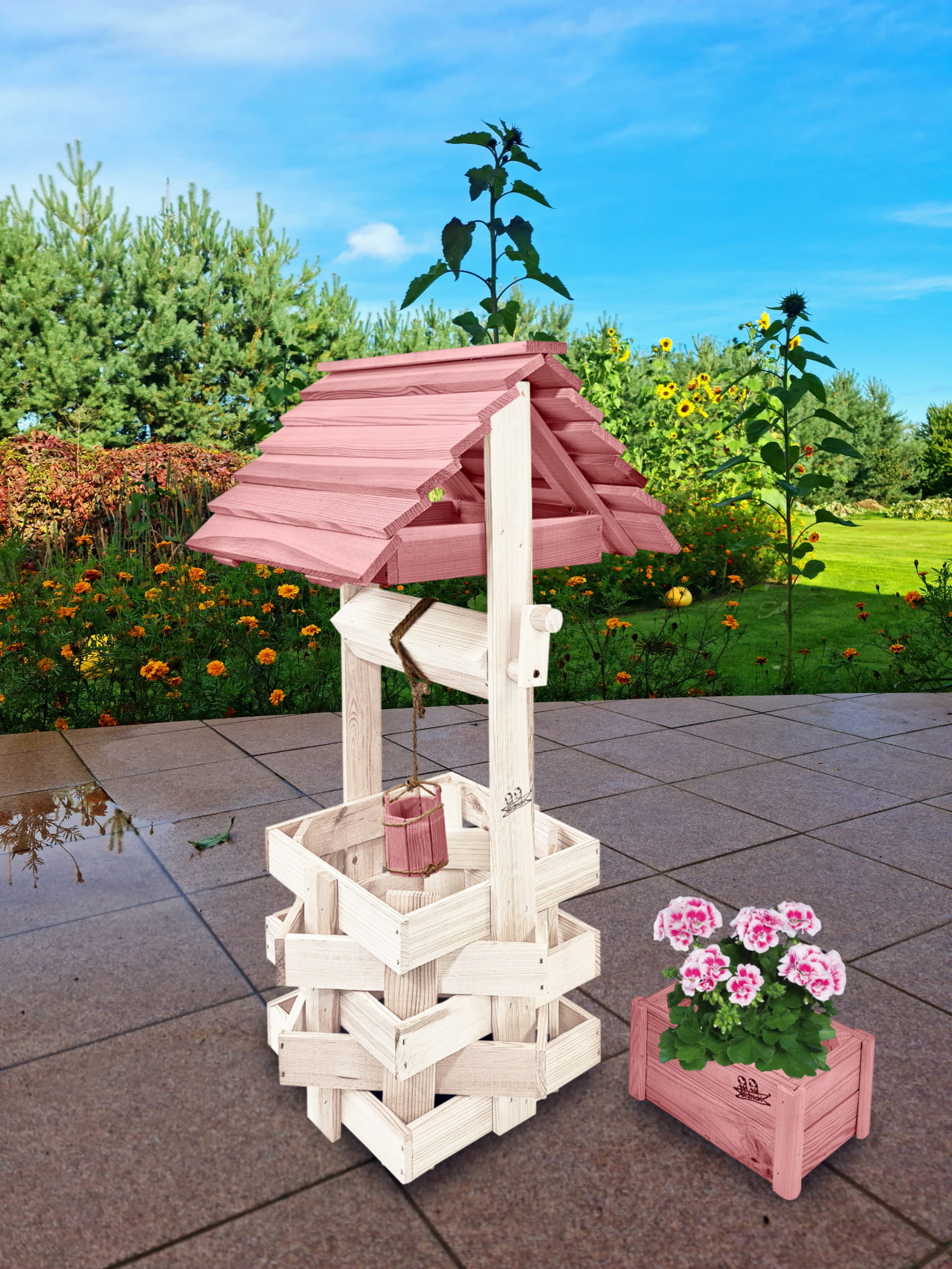 Do studni dołączona jest drewniana doniczka na kwiaty, utrzymana w tej samej estetyce, tworząc spójną i harmonijną całość.