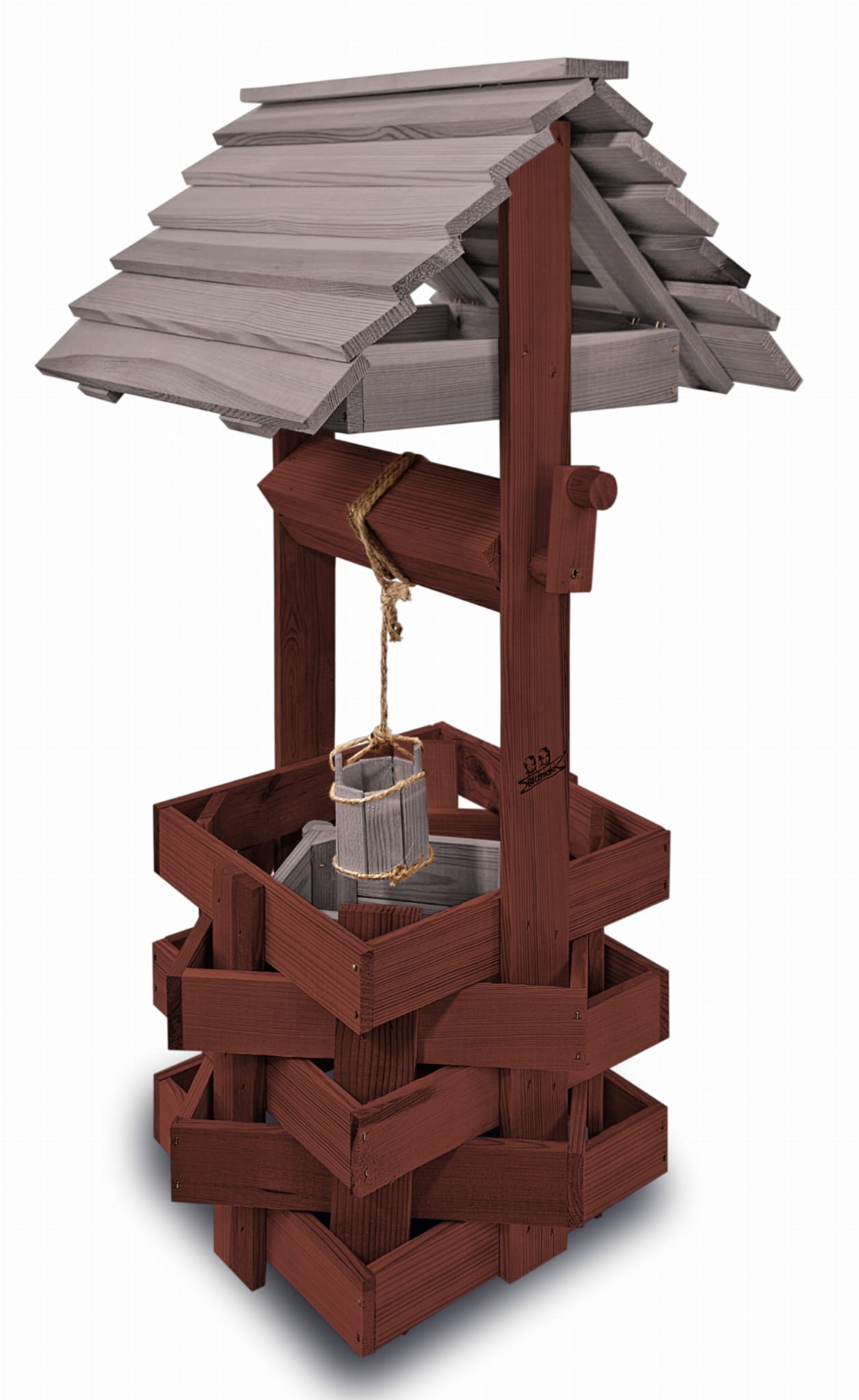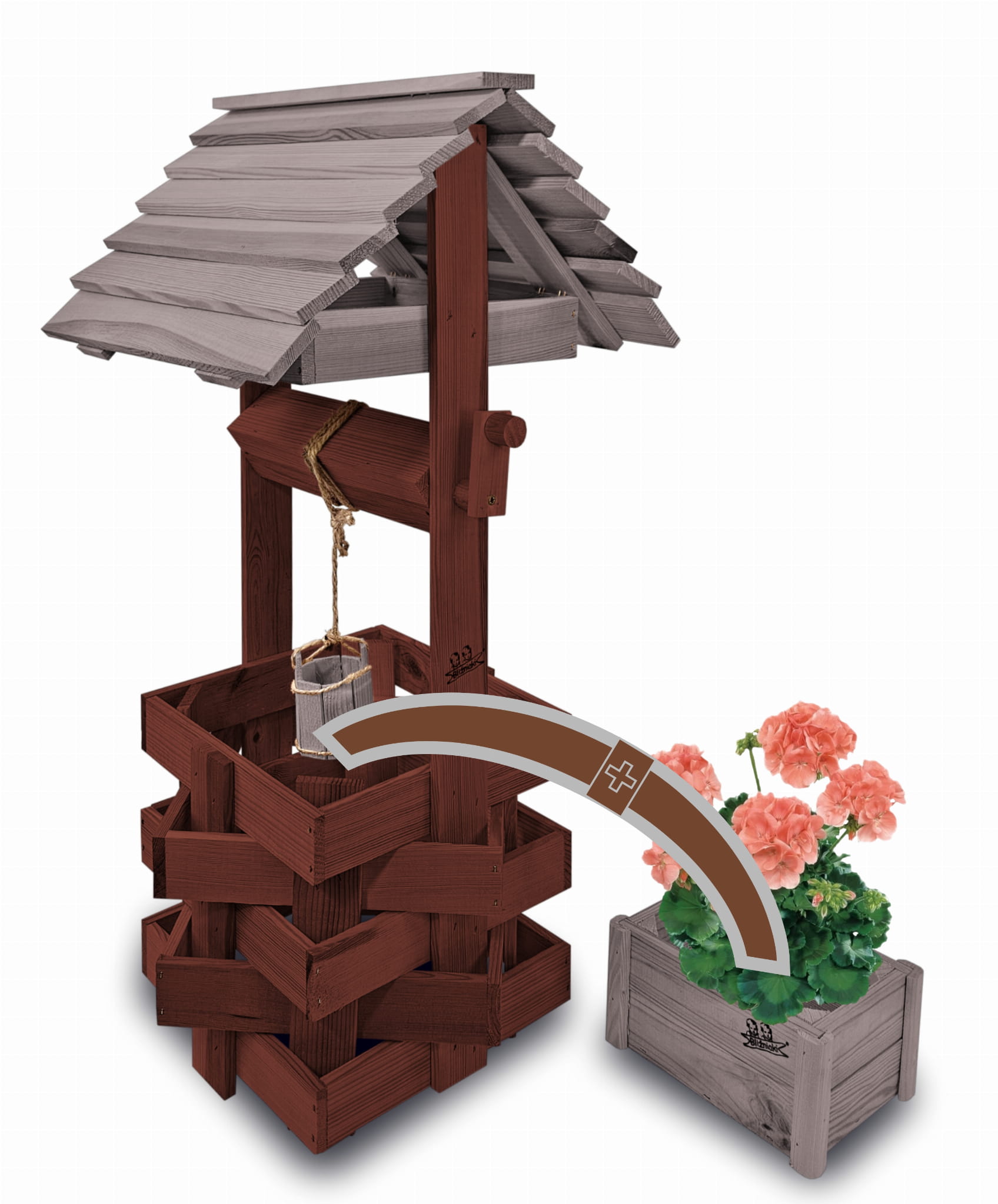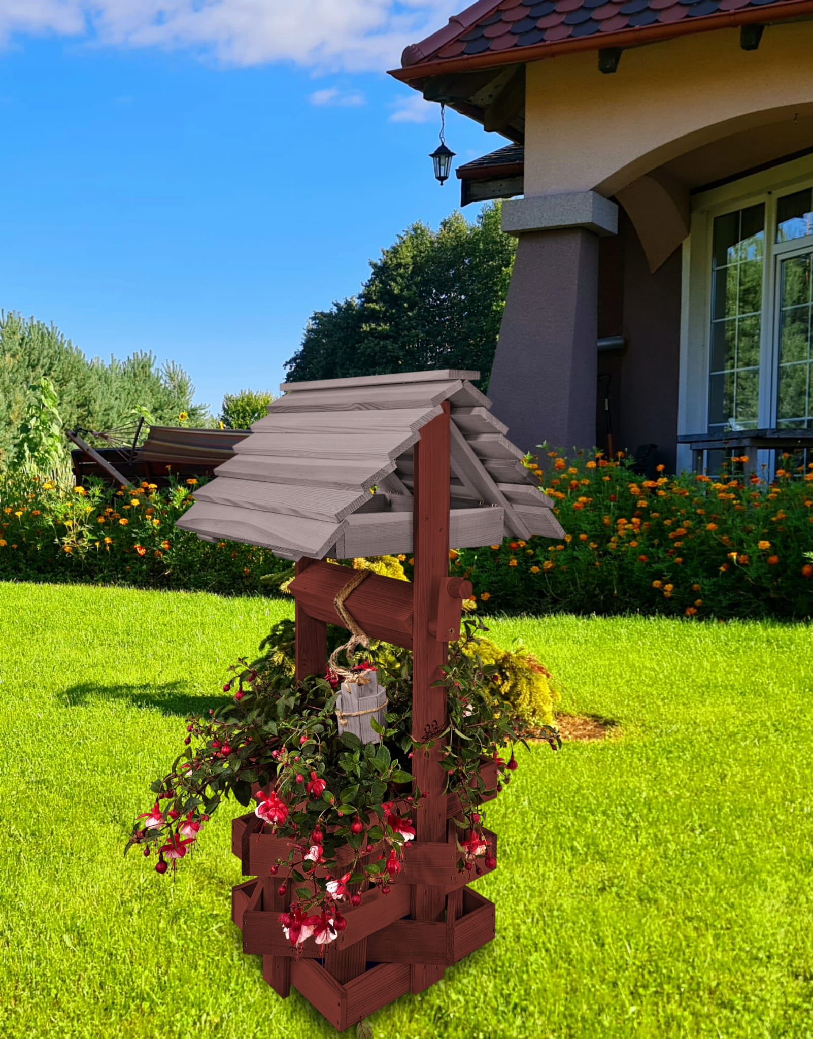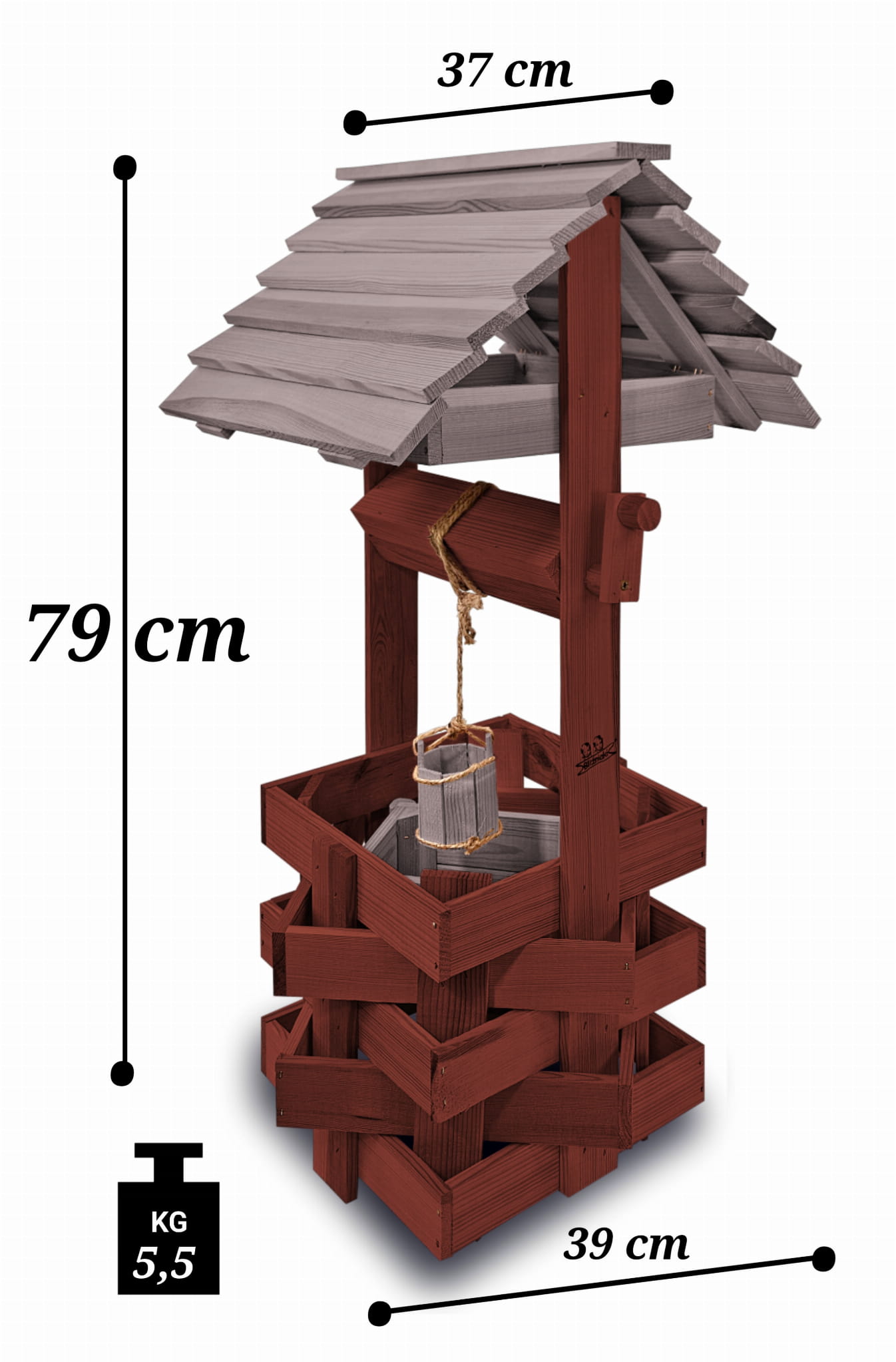 Do studni dołączona jest drewniana doniczka na kwiaty, utrzymana w tej samej estetyce, tworząc spójną i harmonijną całość.