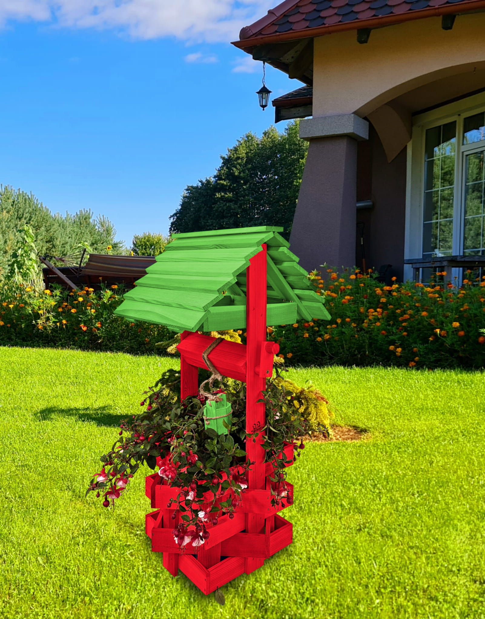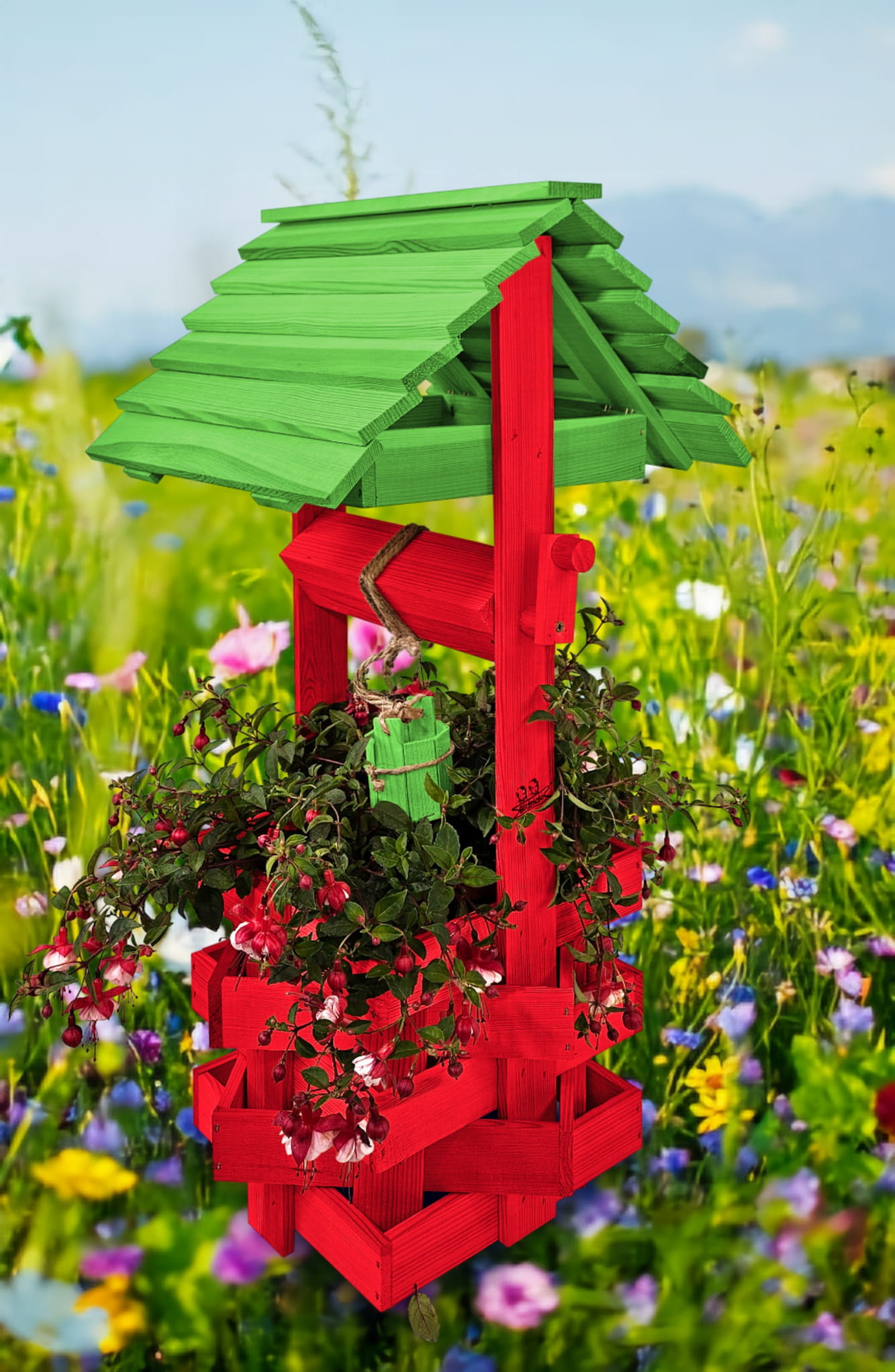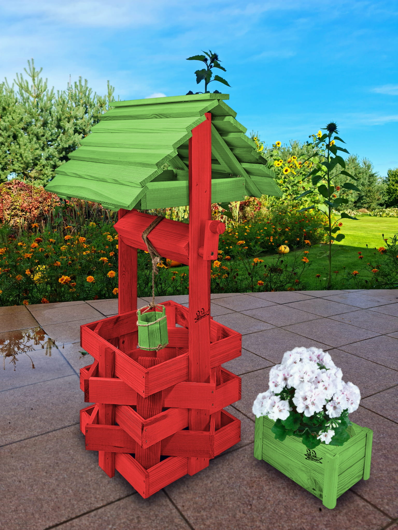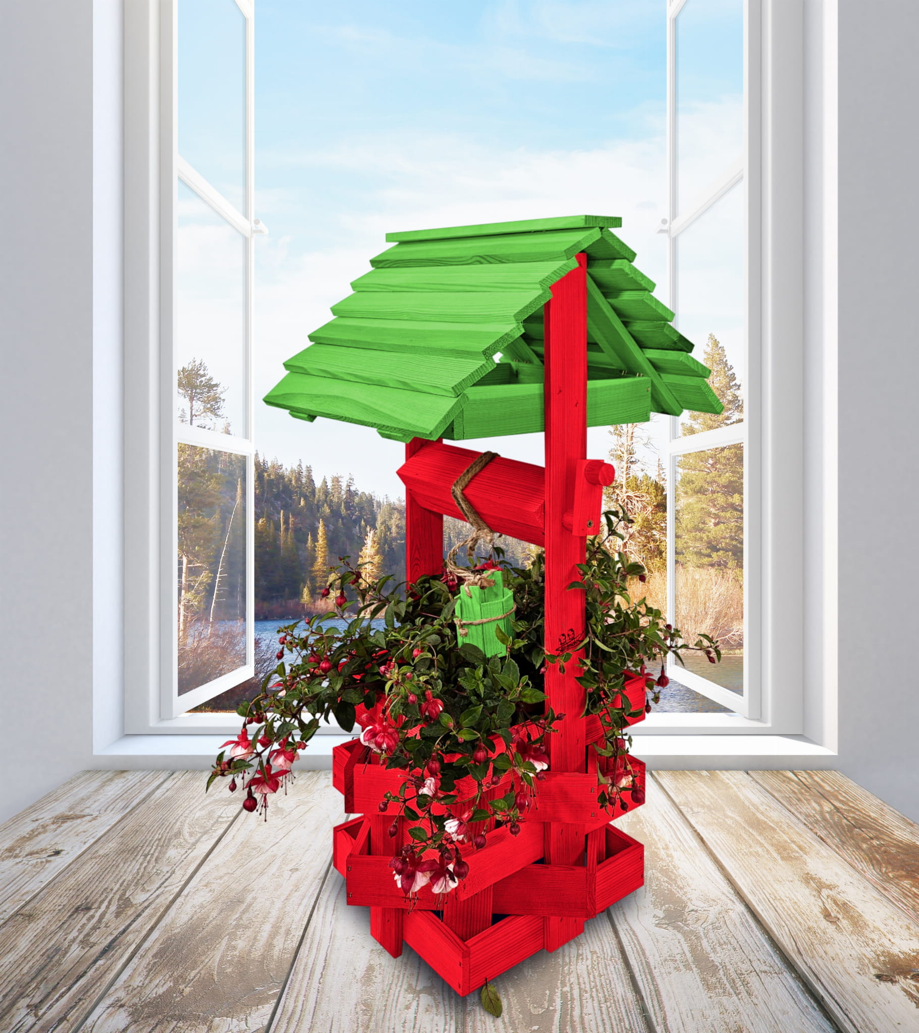 Studzienka na kwiaty do Domu i Ogrodu Donice Balkonowe Tarasowe Studzienka na peralgonie Studnia Drewniana Ozdobna ogrodowa Kolor Czerwony i zielony Ozdoba Wnętrz Figura Ogrodowa Studzienki ozdobne Kwietnik doniczki Prezent SC1 CB ZZ
