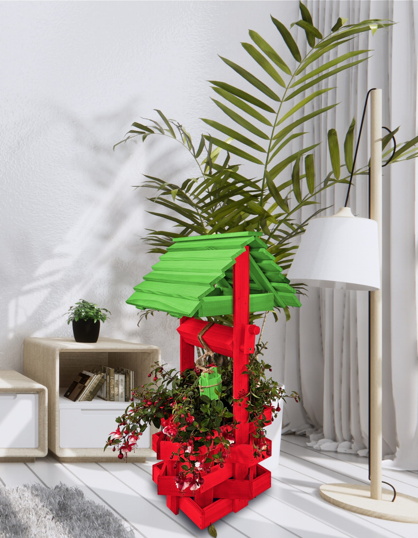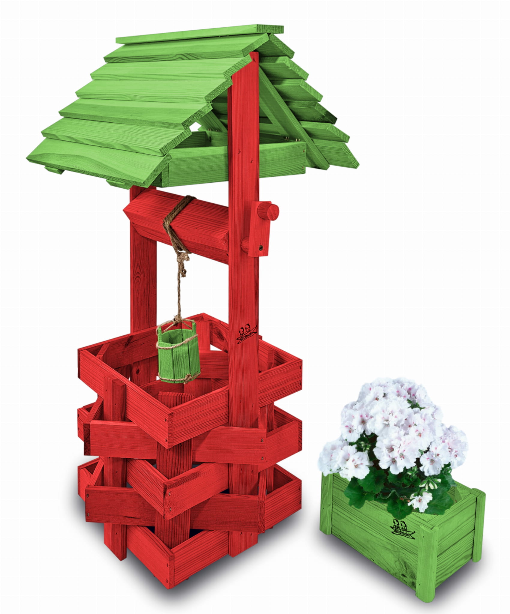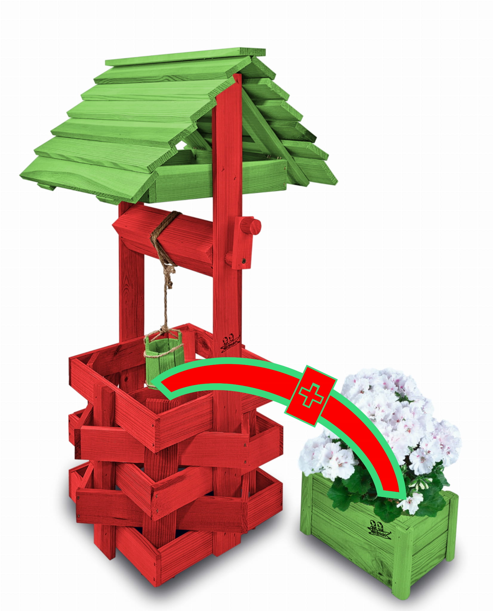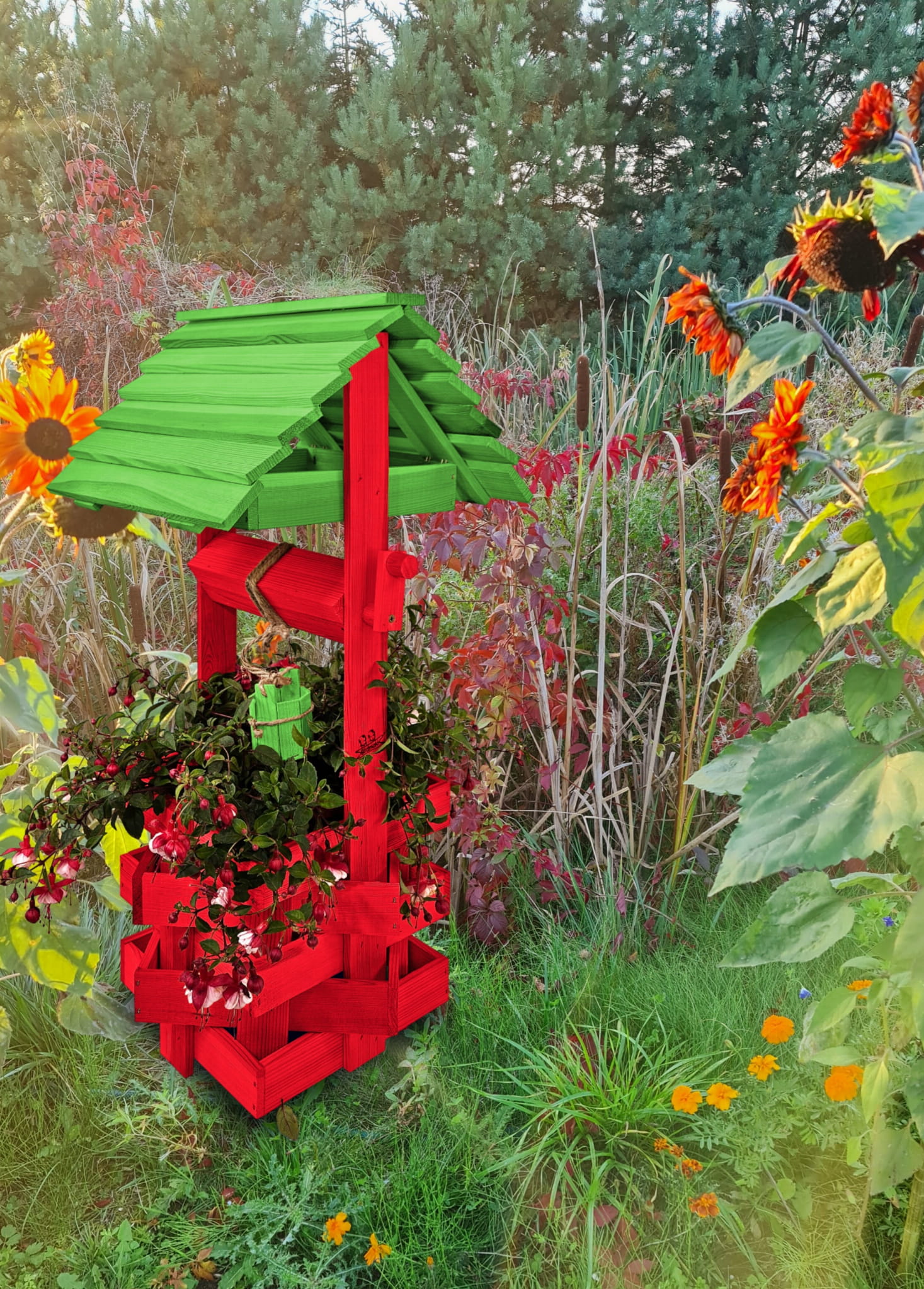 Studzienka na kwiaty do Domu i Ogrodu Donice Balkonowe Tarasowe Studzienka na peralgonie Studnia Drewniana Ozdobna ogrodowa Kolor Czerwony i zielony Ozdoba Wnętrz Figura Ogrodowa Studzienki ozdobne Kwietnik doniczki Prezent SC1 CB ZZ