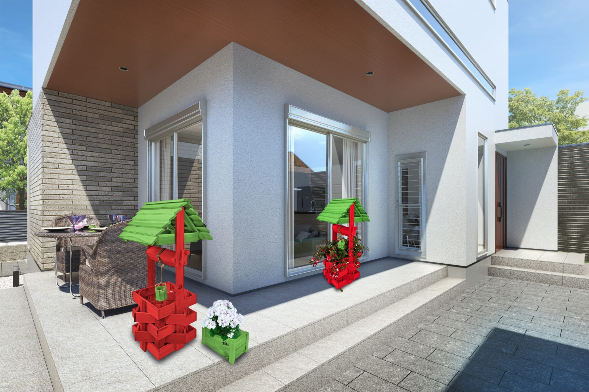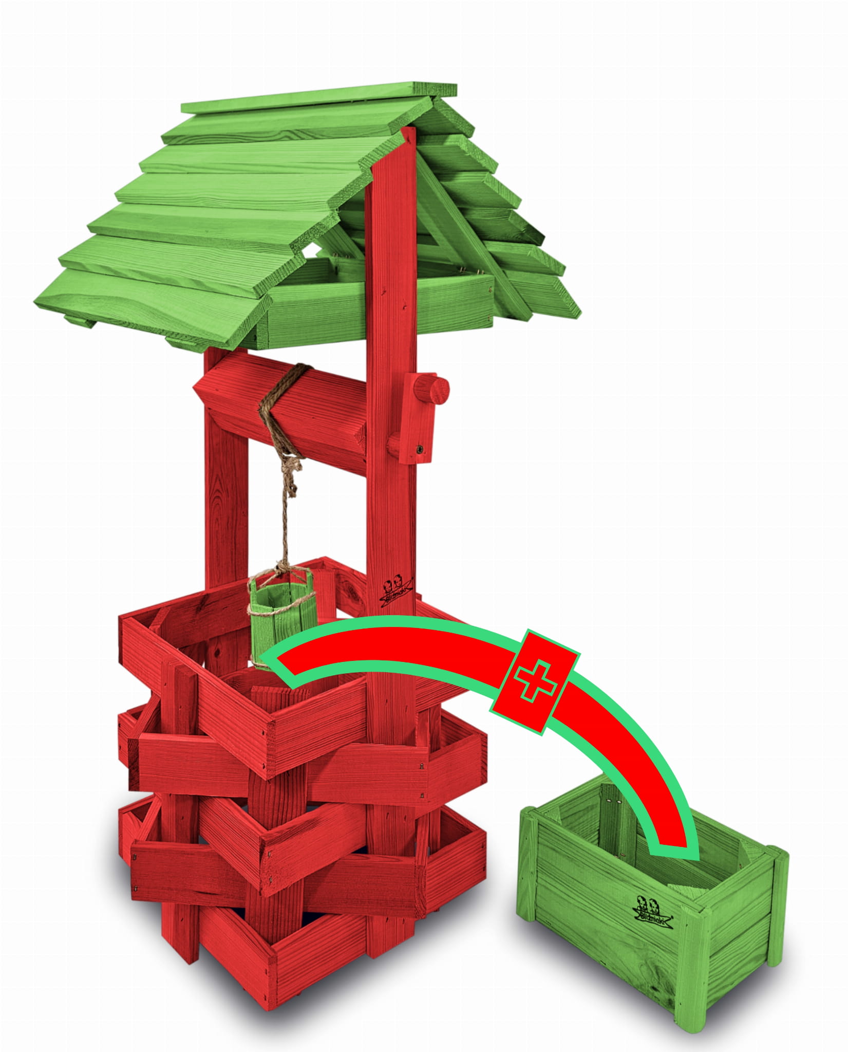Do studni dołączona jest drewniana doniczka na kwiaty, utrzymana w tej samej estetyce, tworząc spójną i harmonijną całość.